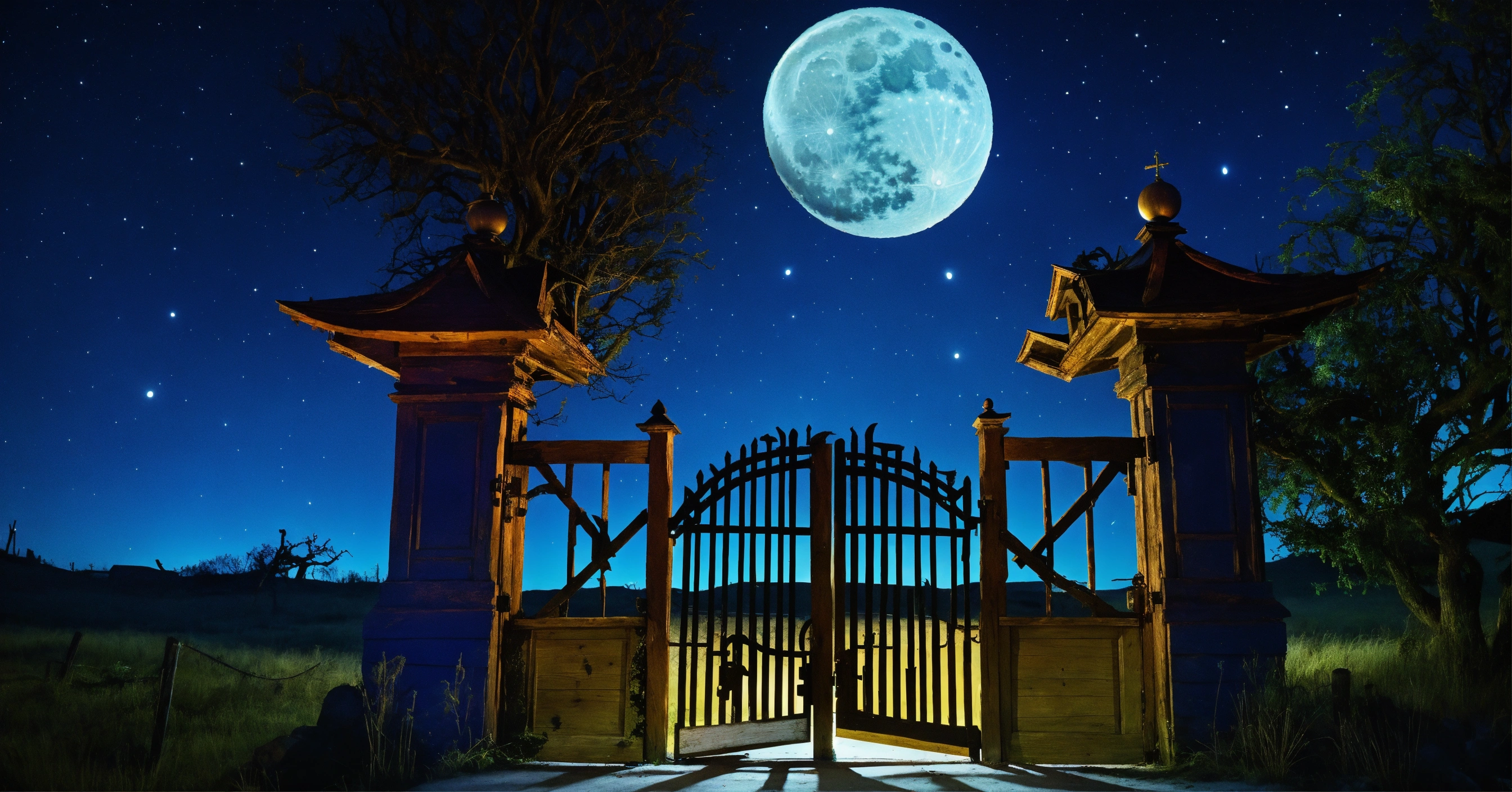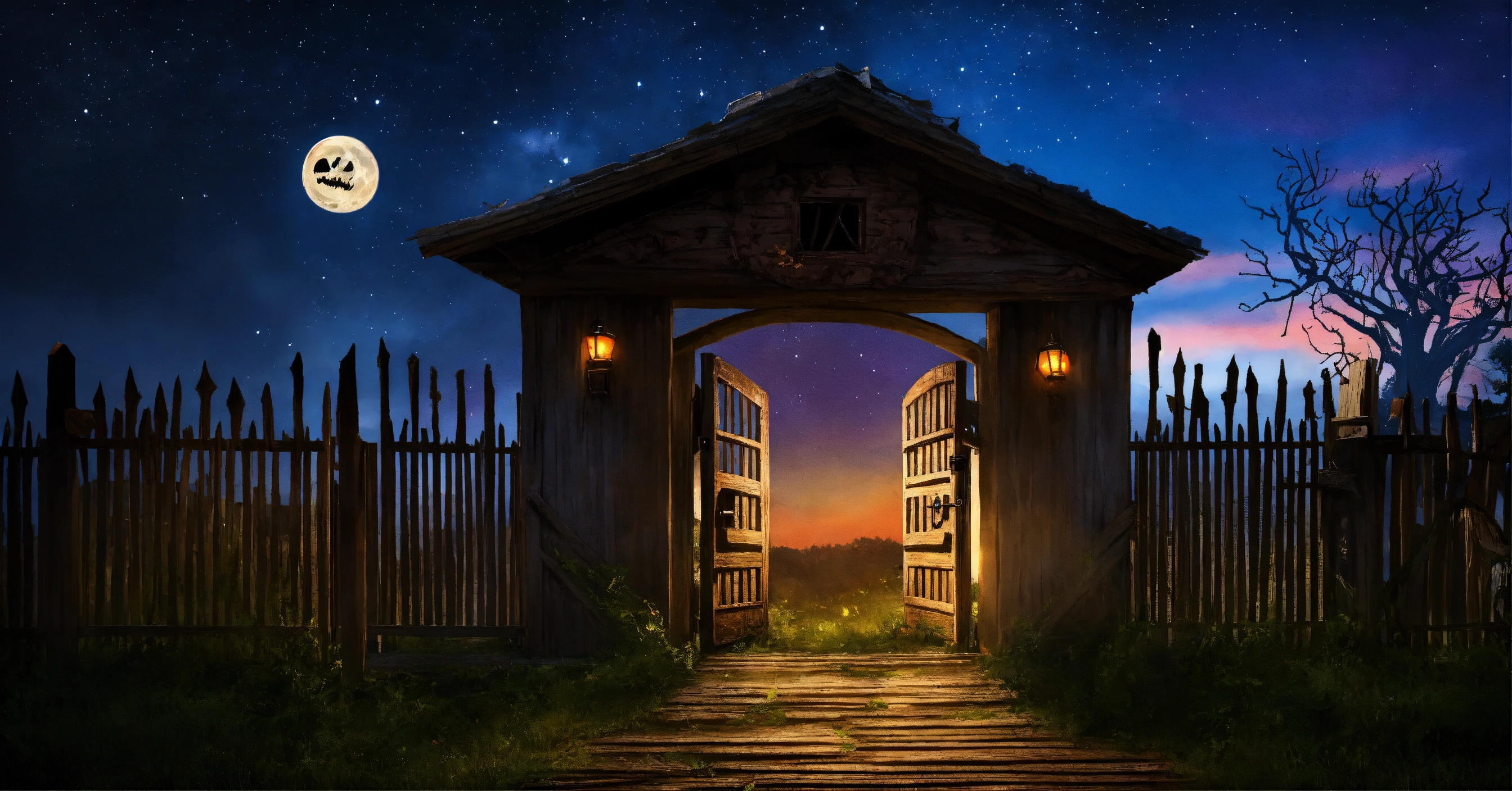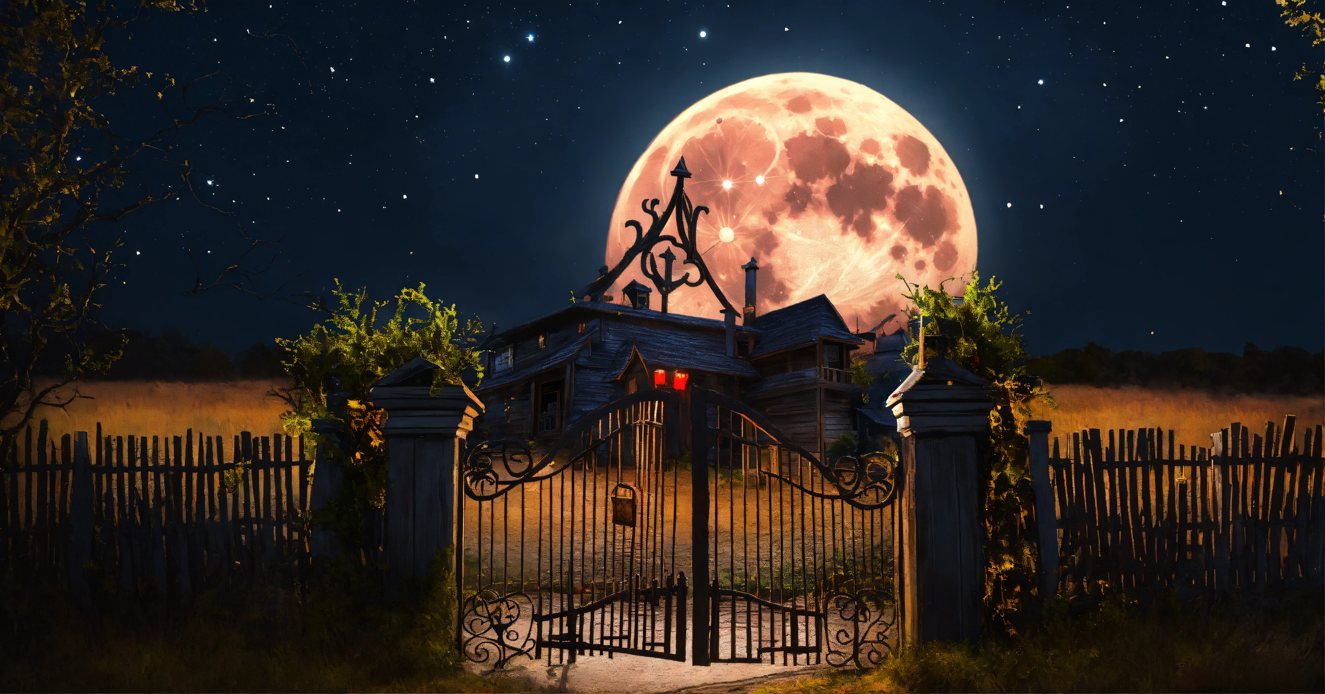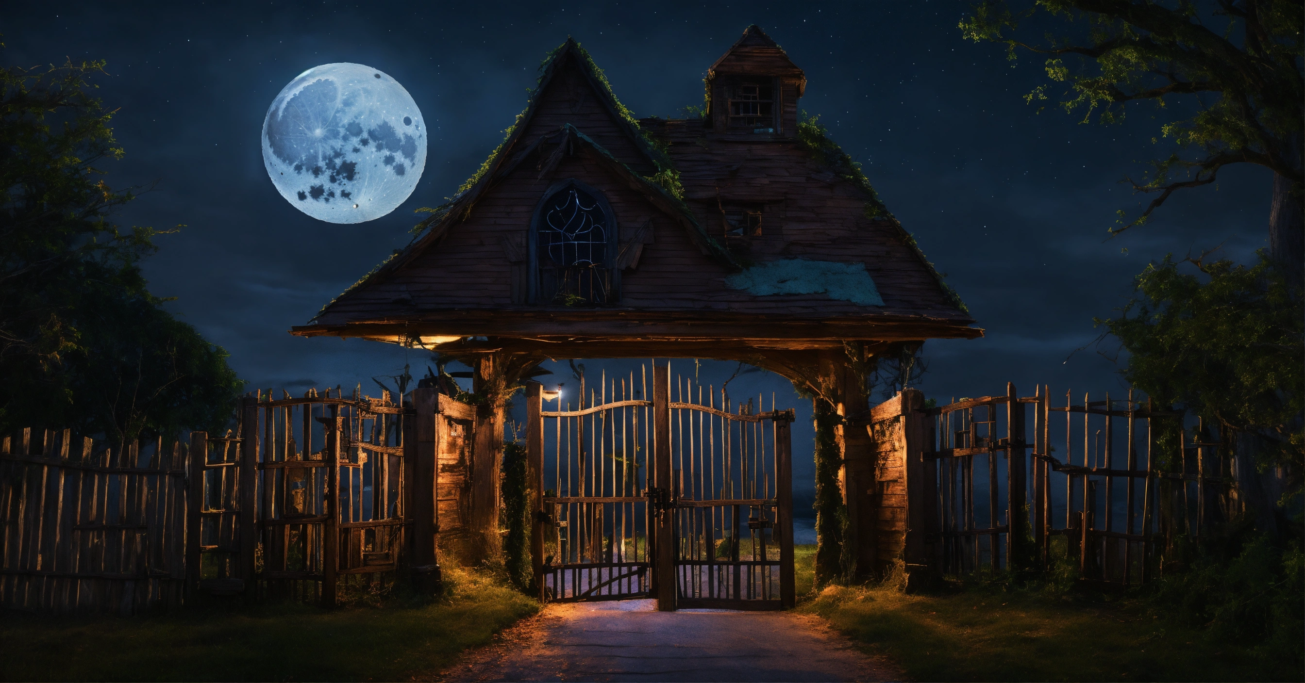 Haunted house, night sky stars, full moon, abandoned wood gate, nightmare before christmas, do not enter
