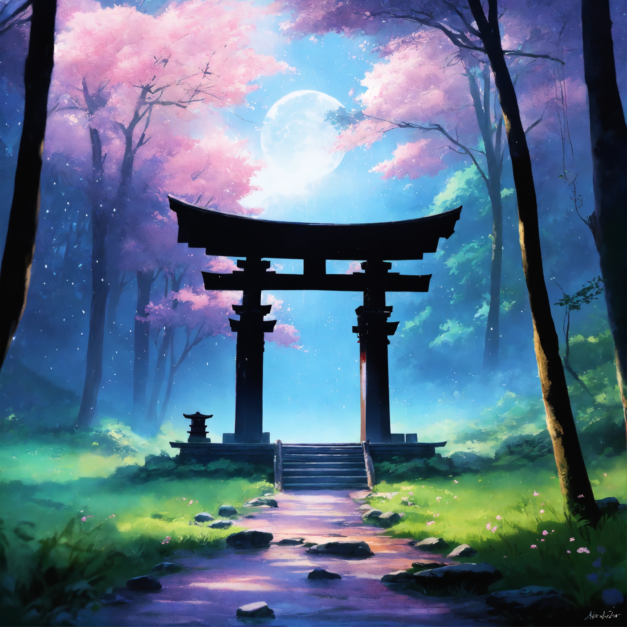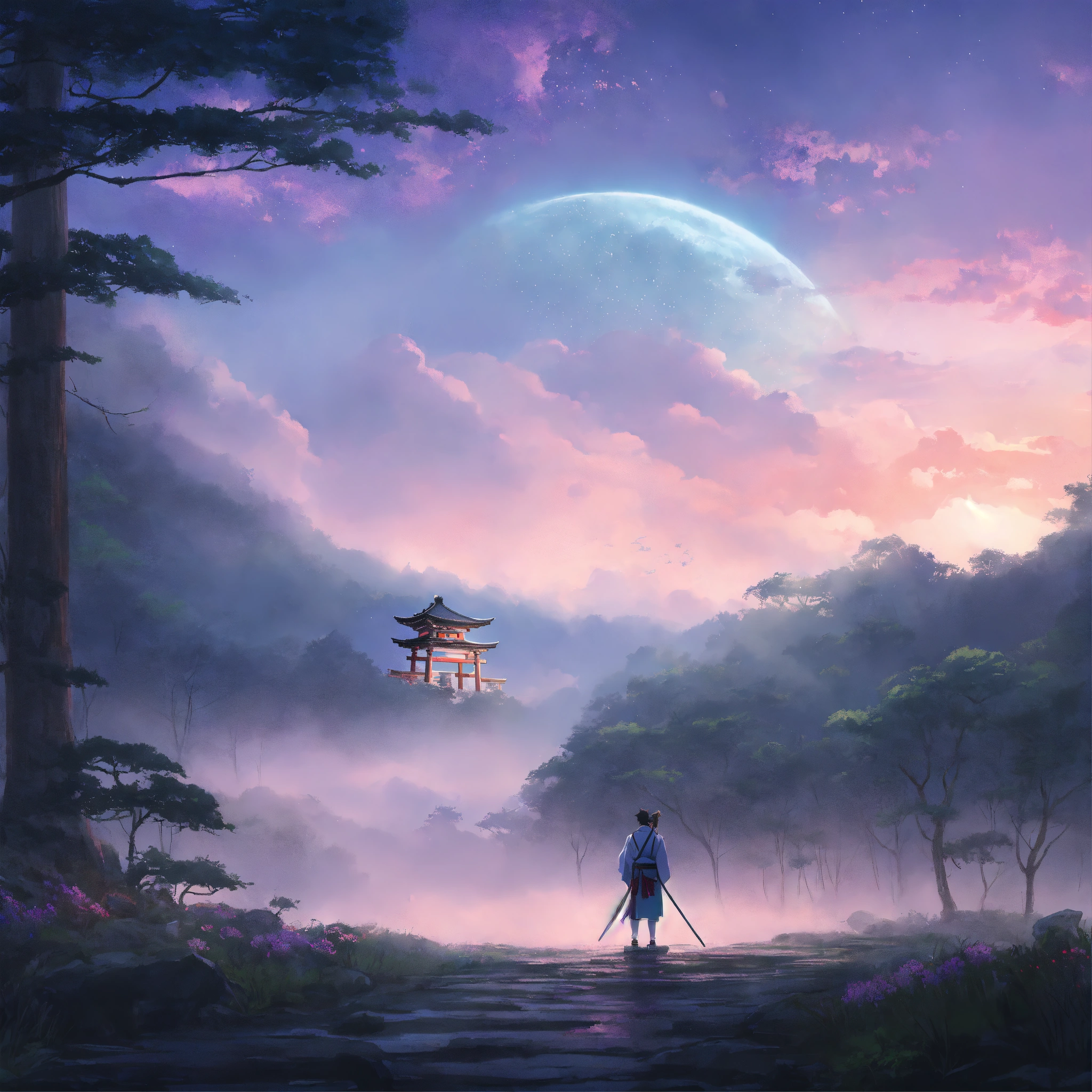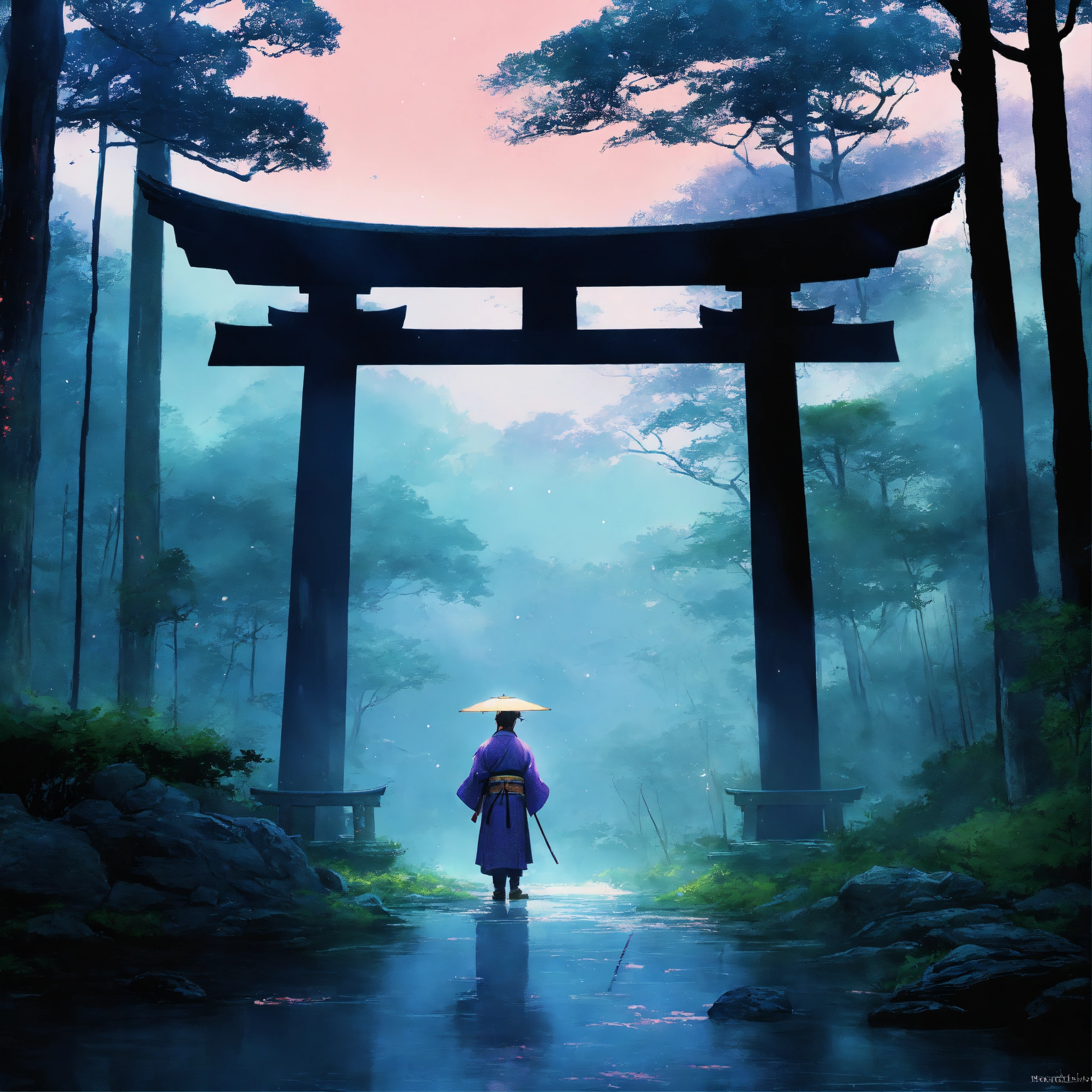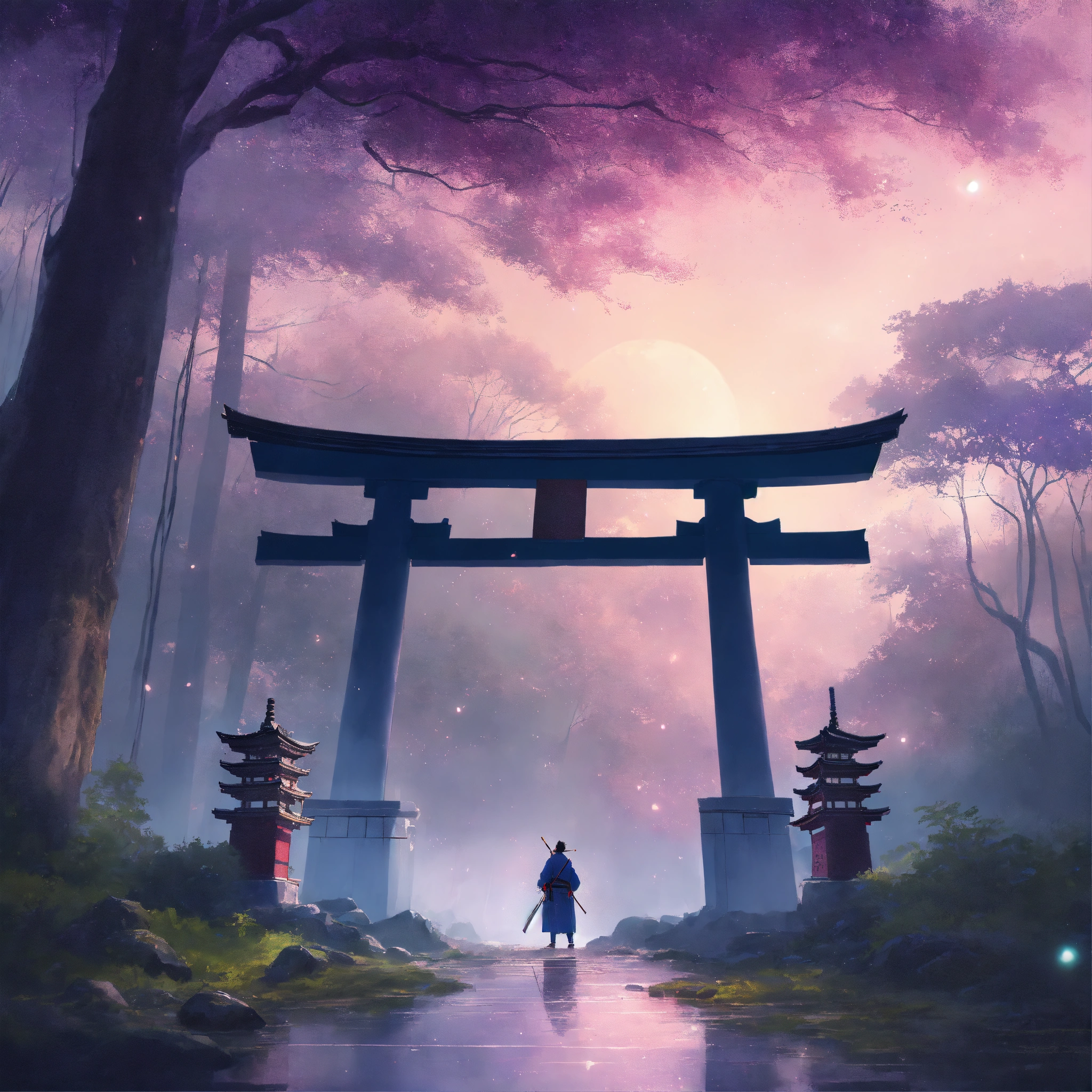 Place an ancient, large weathered stone face of a samurai warrior and torii gate in the middle of a forest, partially covered by mist, surrounded by a dreamy, pastel-colored backdrop. the scene exudes a sense of peace and contentment despite the rain. digital art painting by makoto shinkai and ghibli studio, diffuse lighting, cinematic, lighting, highly detailed, incredible quality gazing up at a starry night sky. soft hues of blues and purples dominate the color palette, creating a dreamy atmosphere.