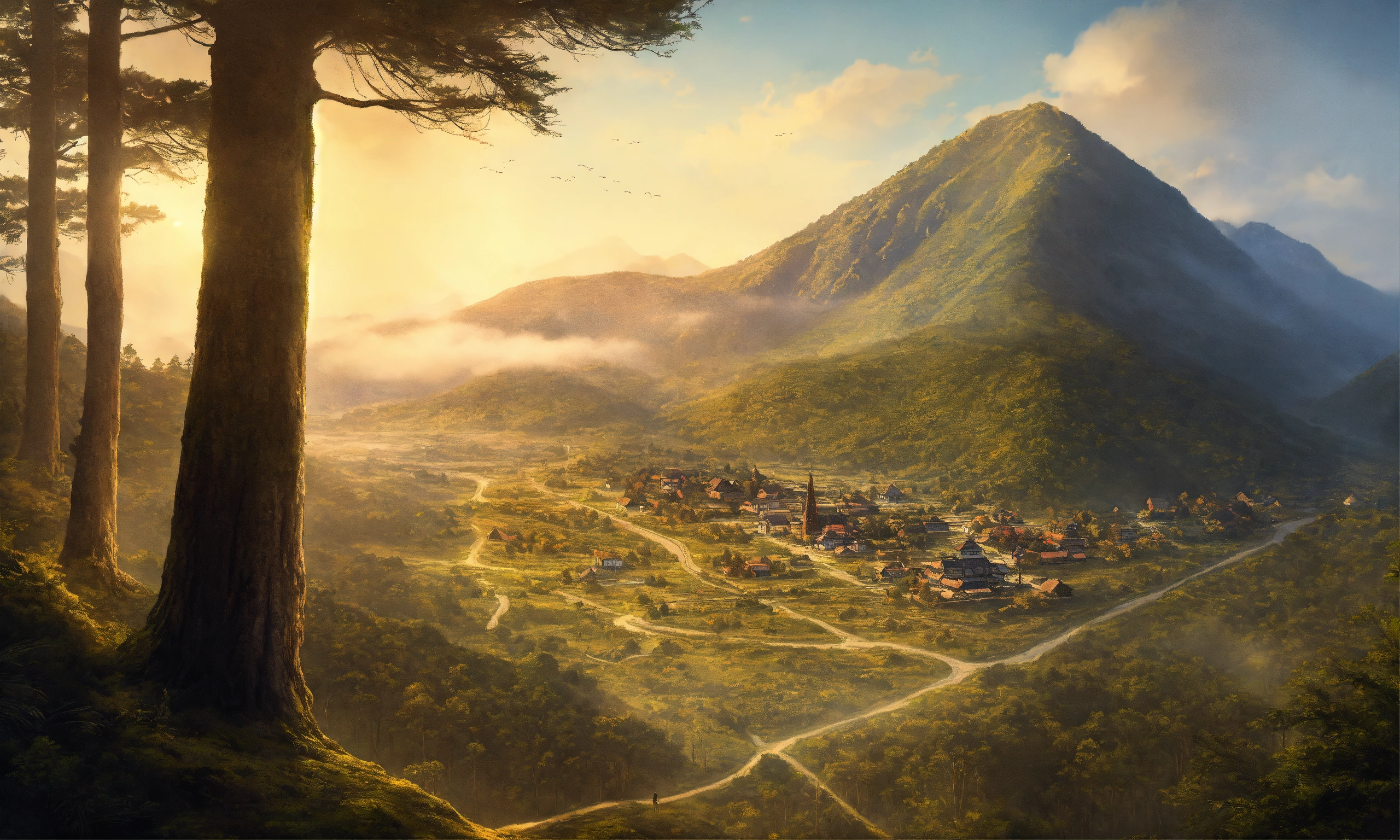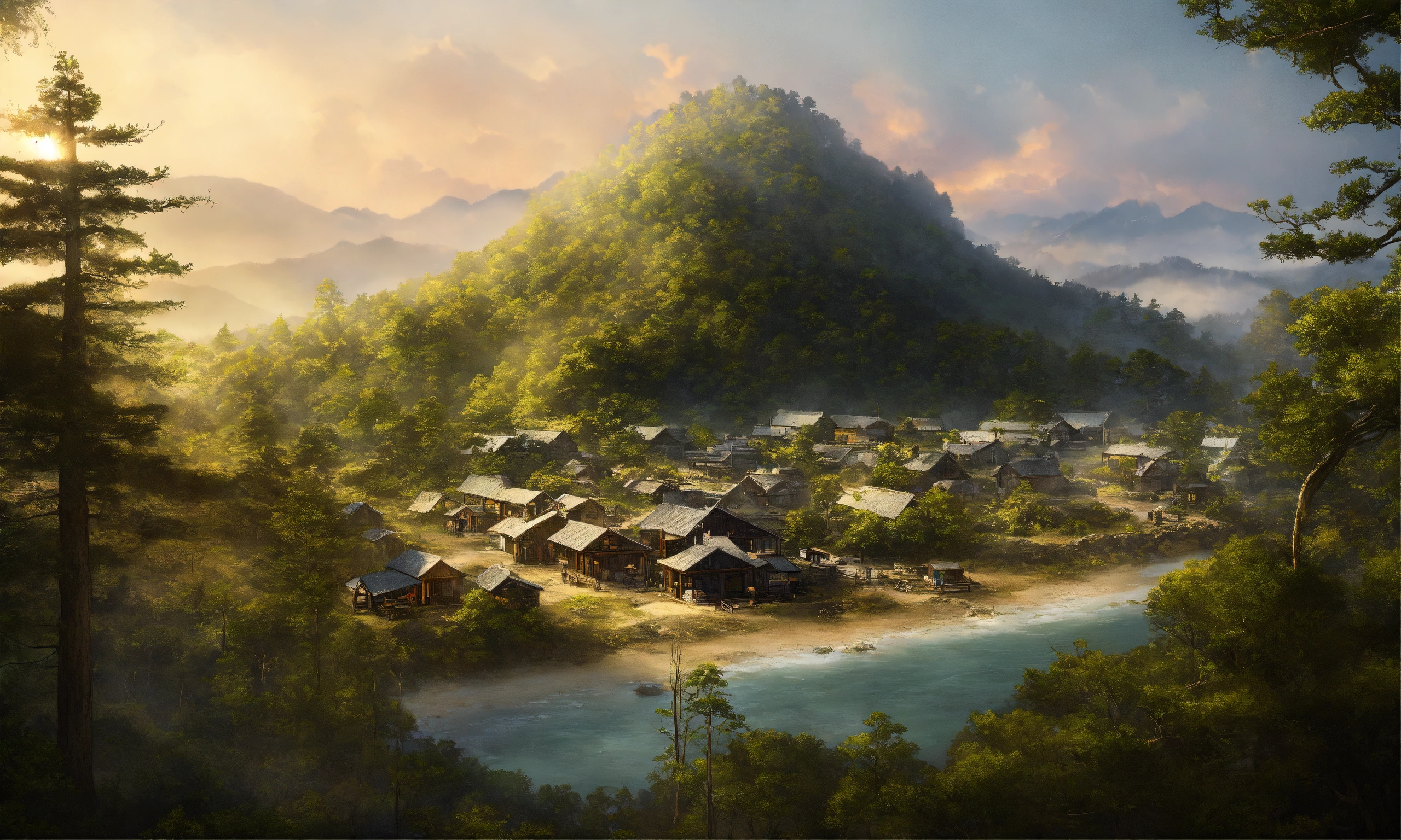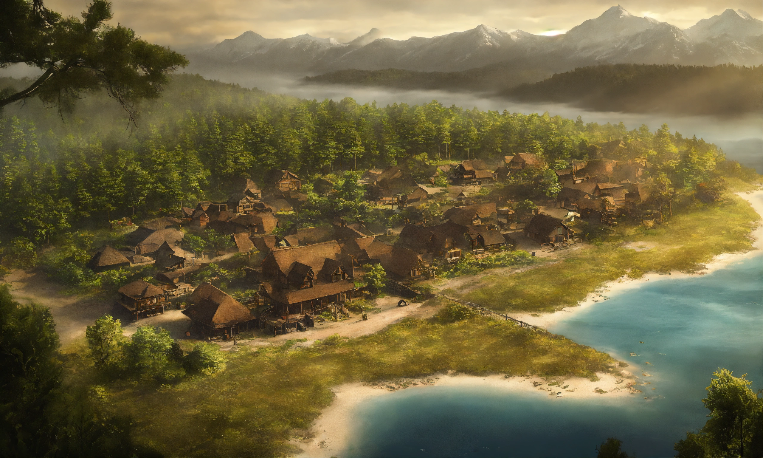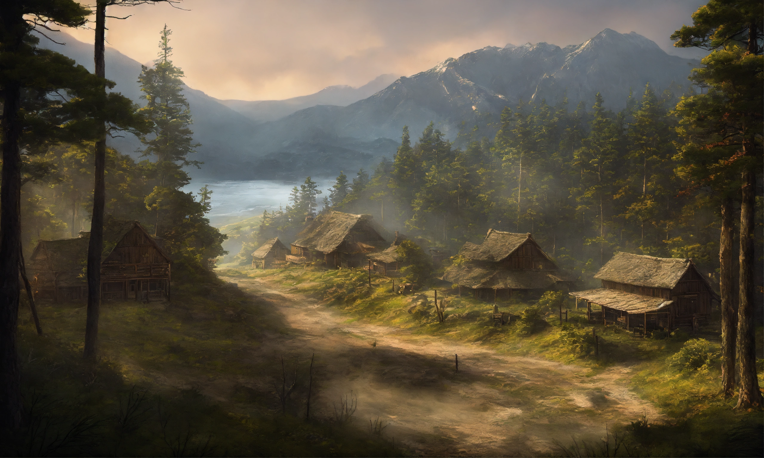 Street map of coastal colonial frontier settlement pine forest with mountain in background, highly detailed, atmospheric lighting, smooth, sharp focus, art by daniel joeddeman and markus holzum