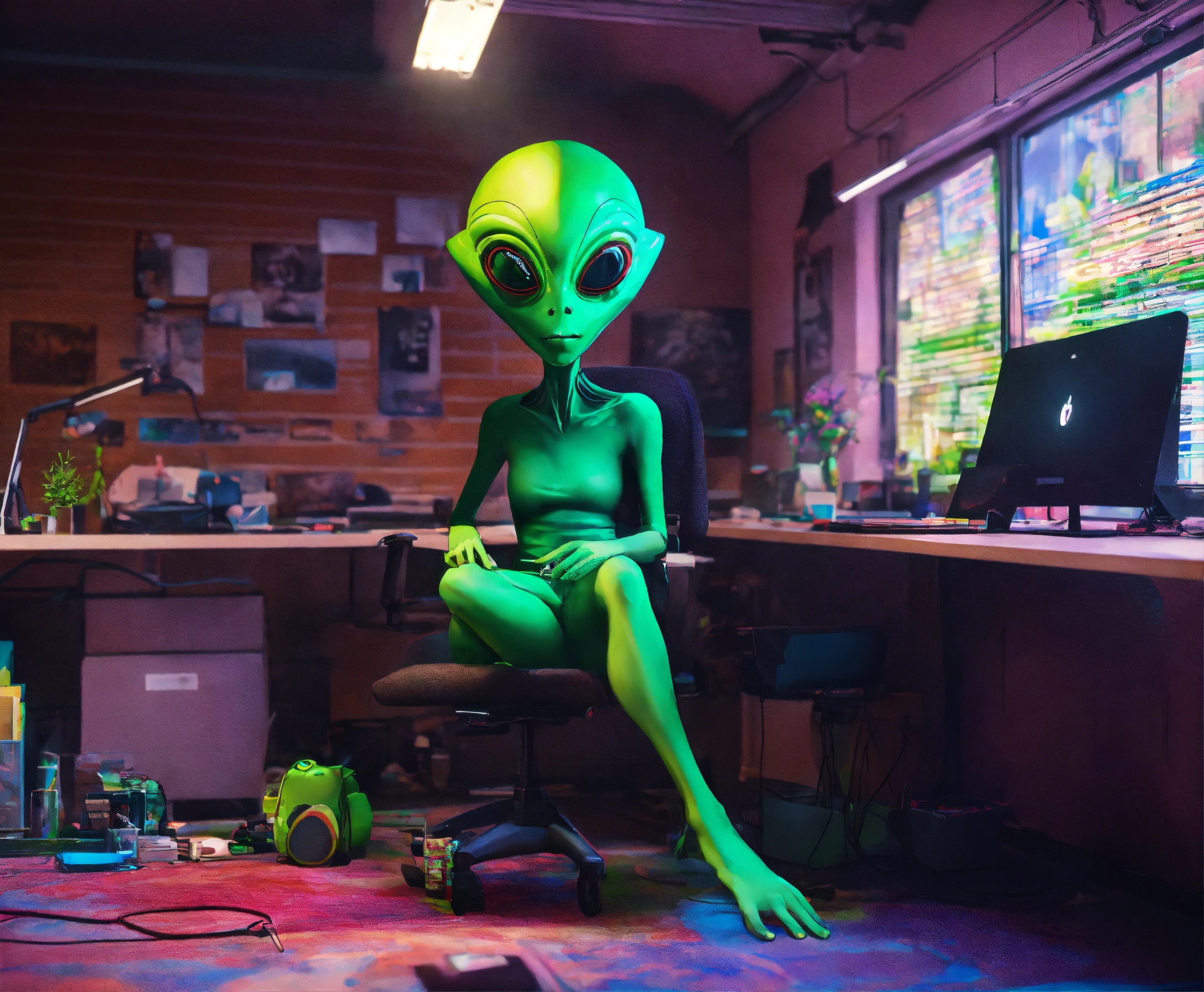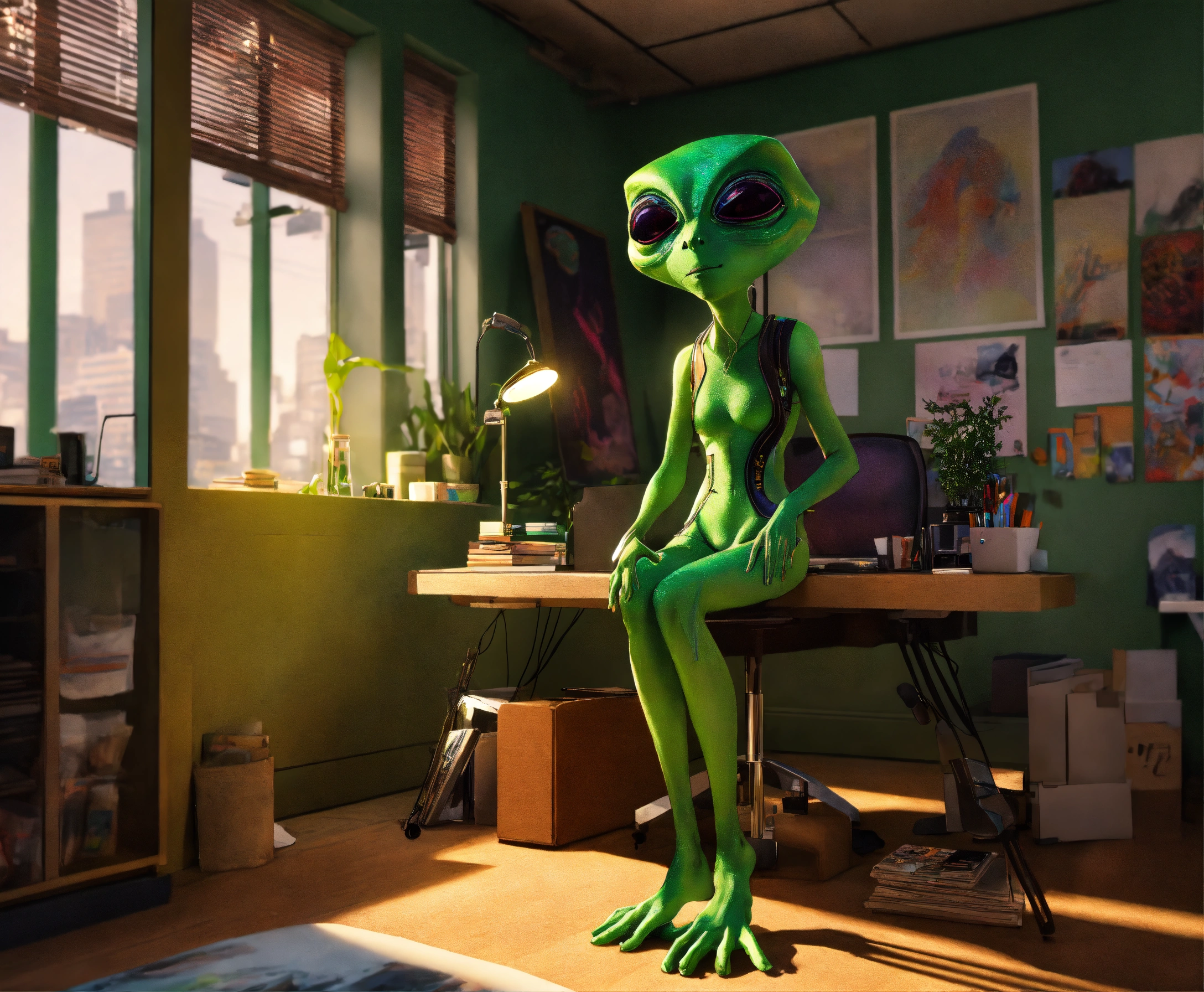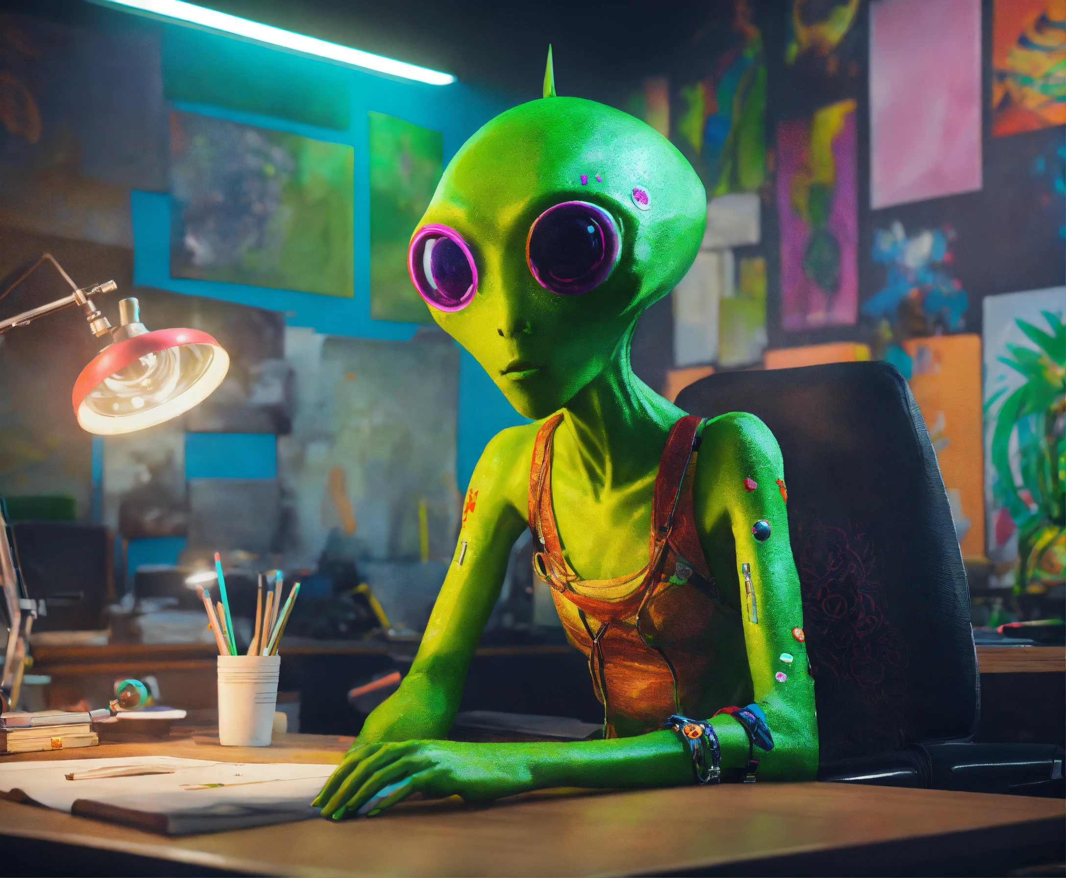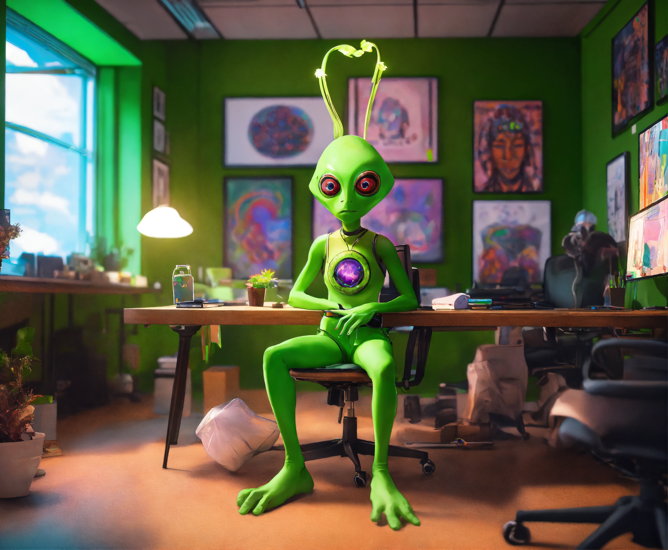 Orion, a green alien with human features, sitting in a mundane office with, adhd, corporate, hippy, hipster, millennial girl, psychedelic, artist, co-workers, nyc, punk visual art, unreal engine