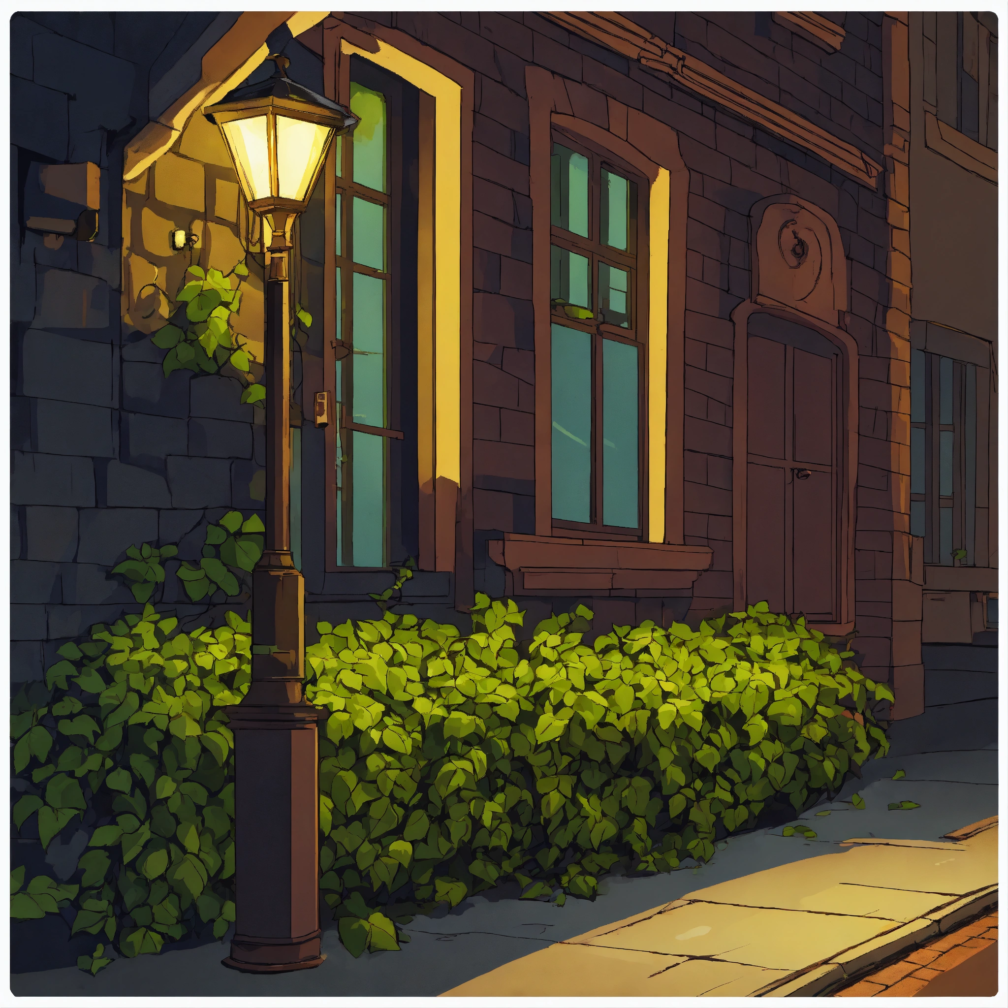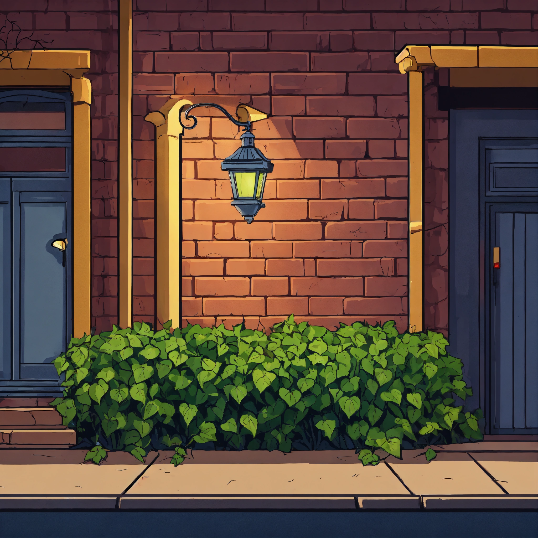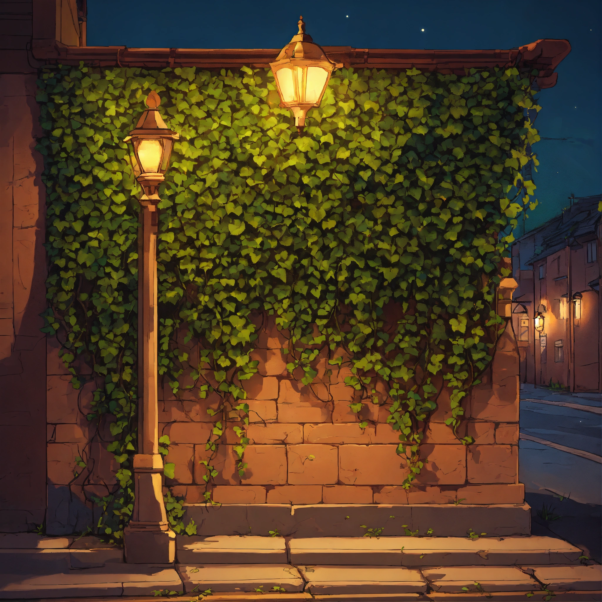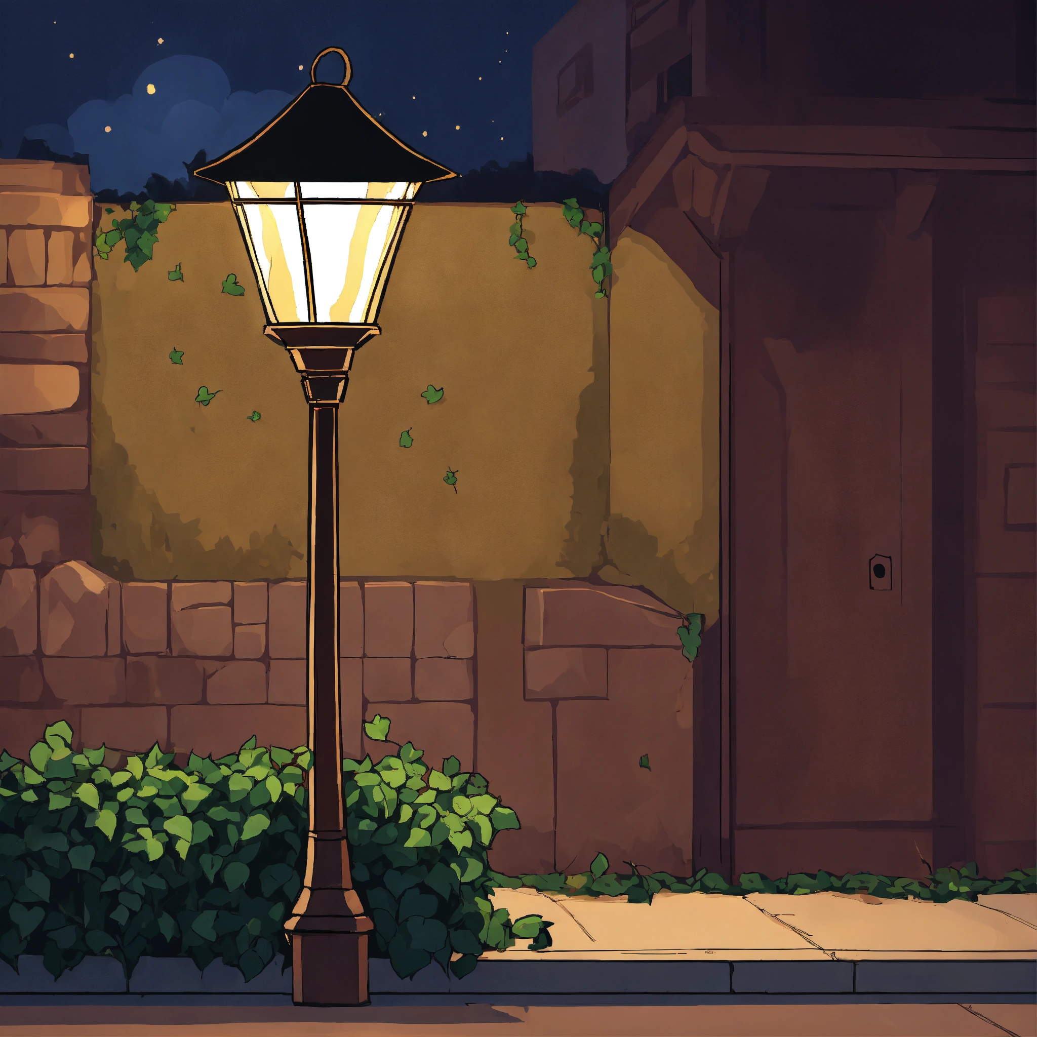 Low wall with ivy on it under a street lamp at night in a cartoon style