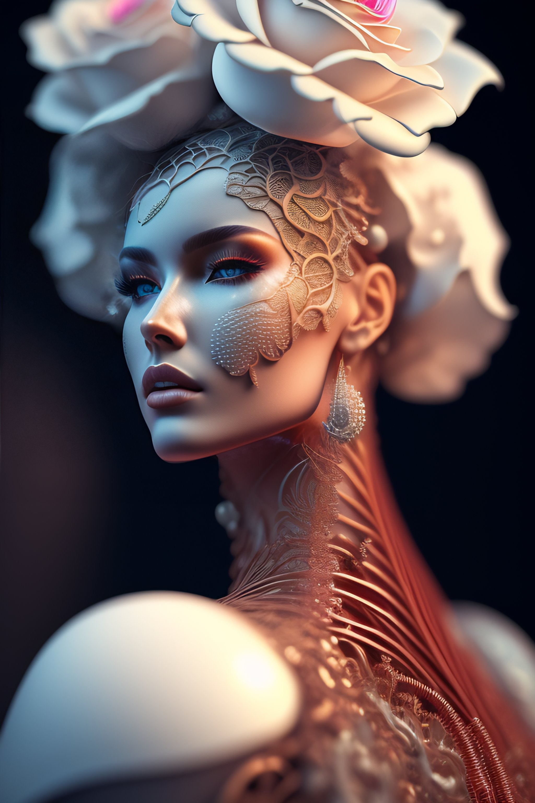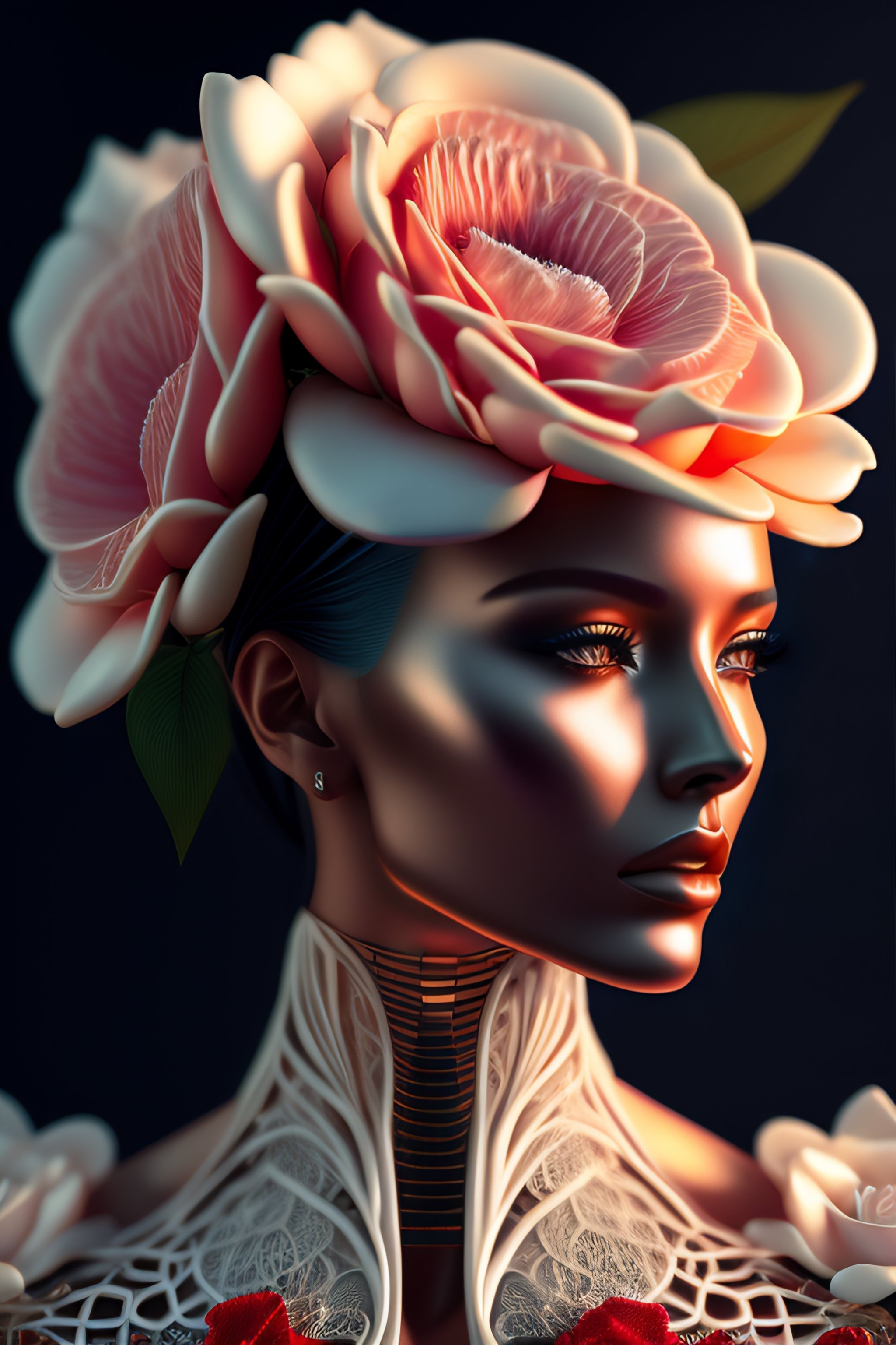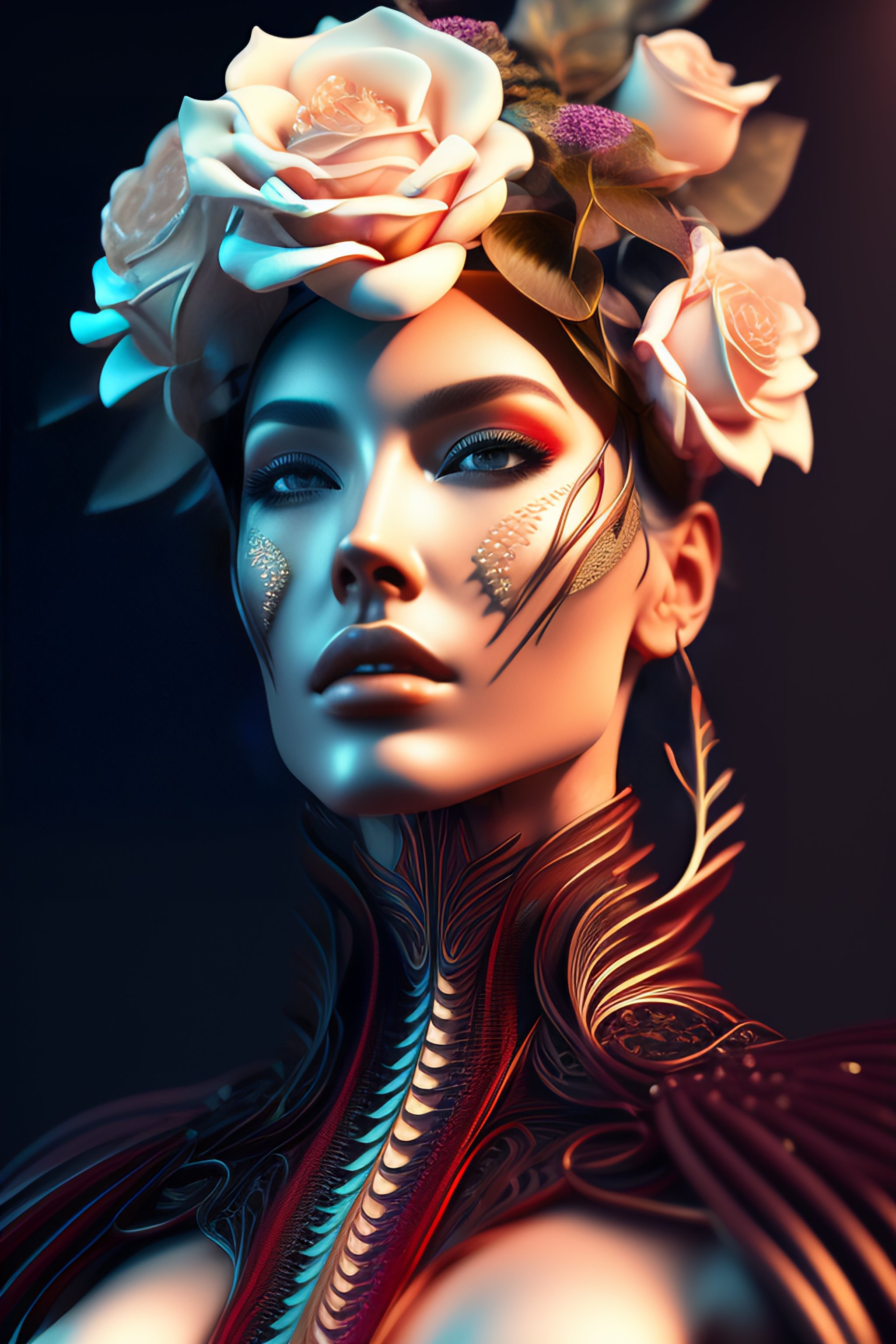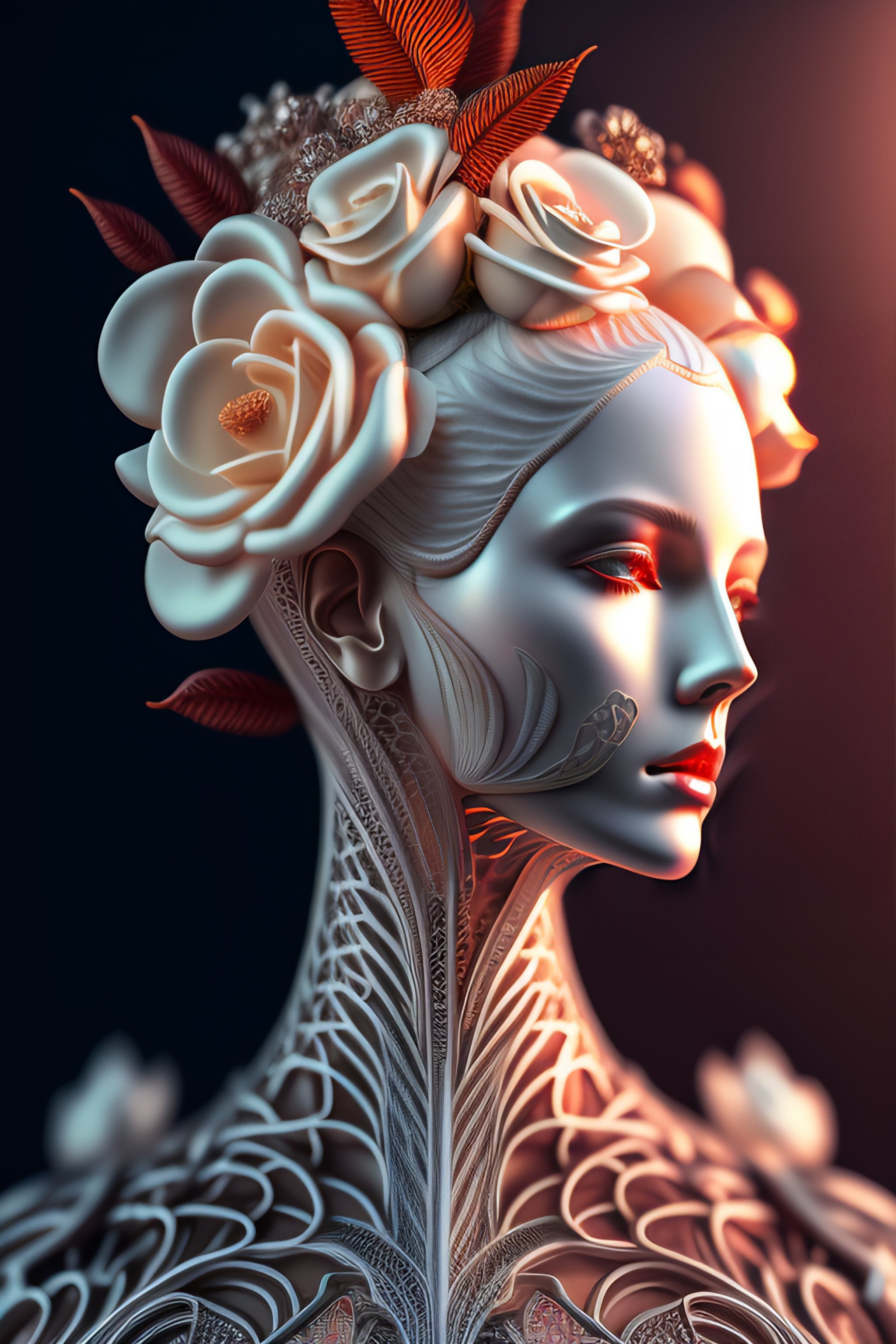 Complex 3d render ultra detailed of a beautiful death angel front portrait, biomechanical cyborg, analog, 150 mm lens, beautiful natural soft rim light, big leaves and stems, roots, fine foliage lace, colorful details, samourai, boris bidjan saberi outfit, pearl earring, piercing, art nouveau fashion embroidered, intricate details, mesh wire, mandelbrot fractal, anatomical, facial muscles, cable wires, microchip, badass, hyper realistic, ultra detailed, octane render, volumetric lighting, 8k post-production, red and white with a bit of black, detailled metalic bones, semi human, iridescent colors, glenn brown style, white room, power of the god, complex body poses, wide shot, white roses