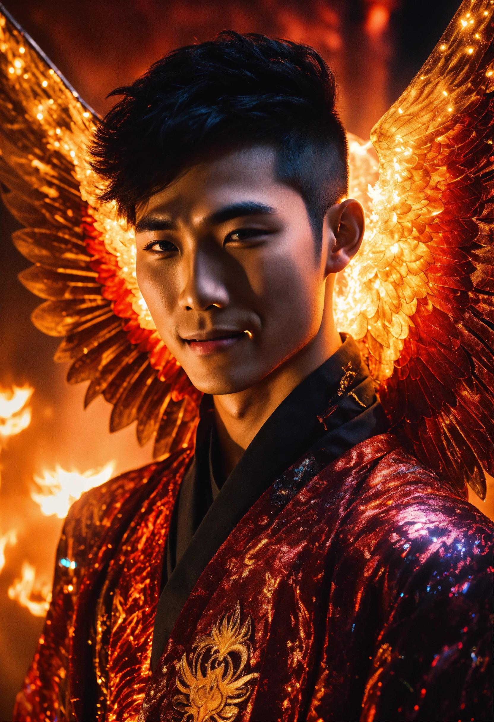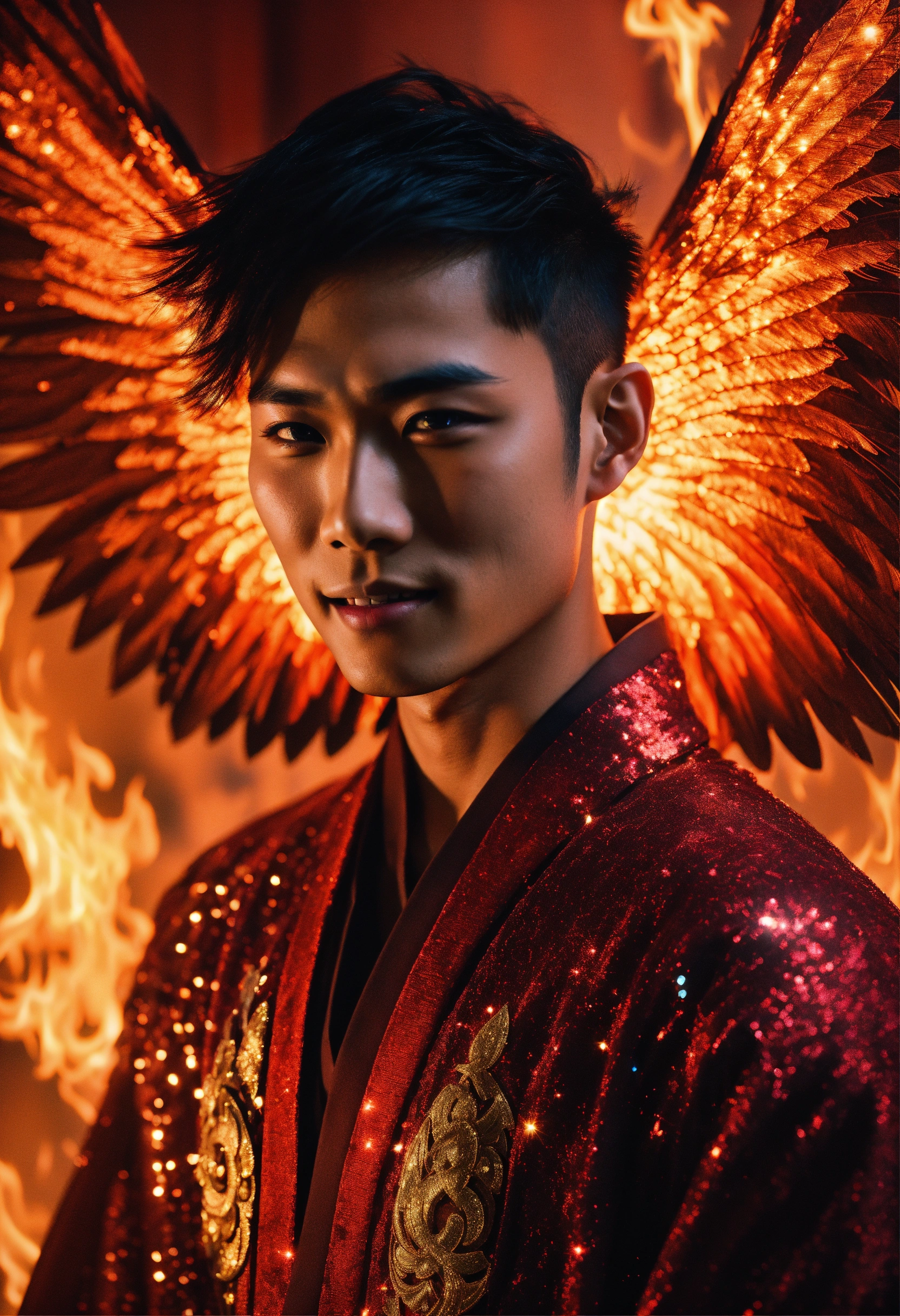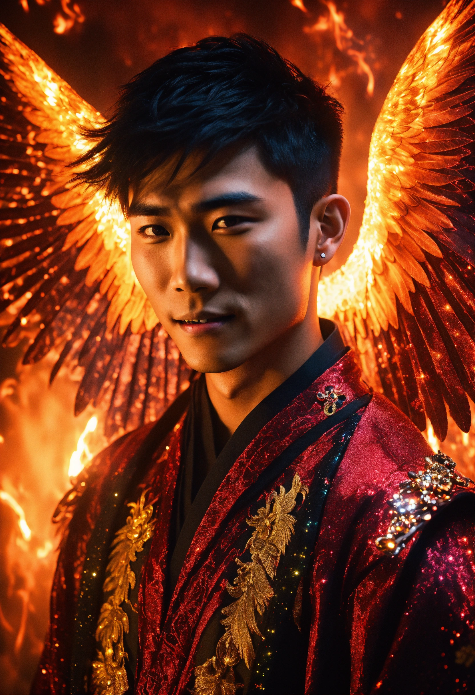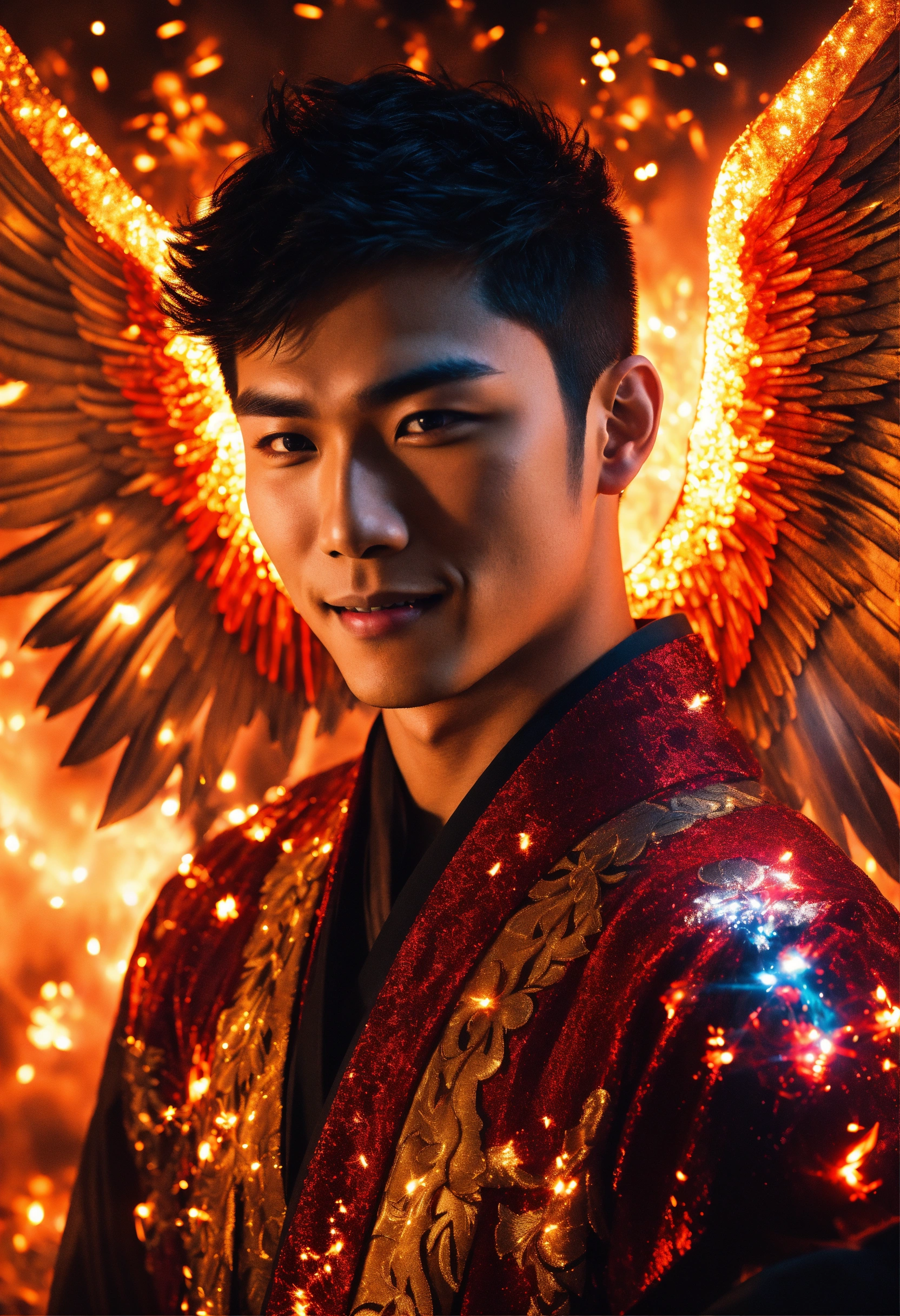 Magazine photoshoot, photograph 8k photo kodak 400 happy modern supernatural 3/4 photographic portrait in silhouette style of shockingly edgy male archangel with massive wings, edgy modern style with evocative environmental elements, staring directly into camera lens intently with loving black eyes as if speaking only to me, background is massive explosion of of fiery sparks, robust masculine supermodel ruggedly handsome 25-year-old asian male, glowing with holy spirit magic sparkles, beaming with joyful smile with perfect white teeth that lights up his face, angel of fire, forgiveness, short black hair, wearing sparkling futuristic fantastical edgy and regal themed glittering black and red phoenix-detailed kimono designed by gucci.