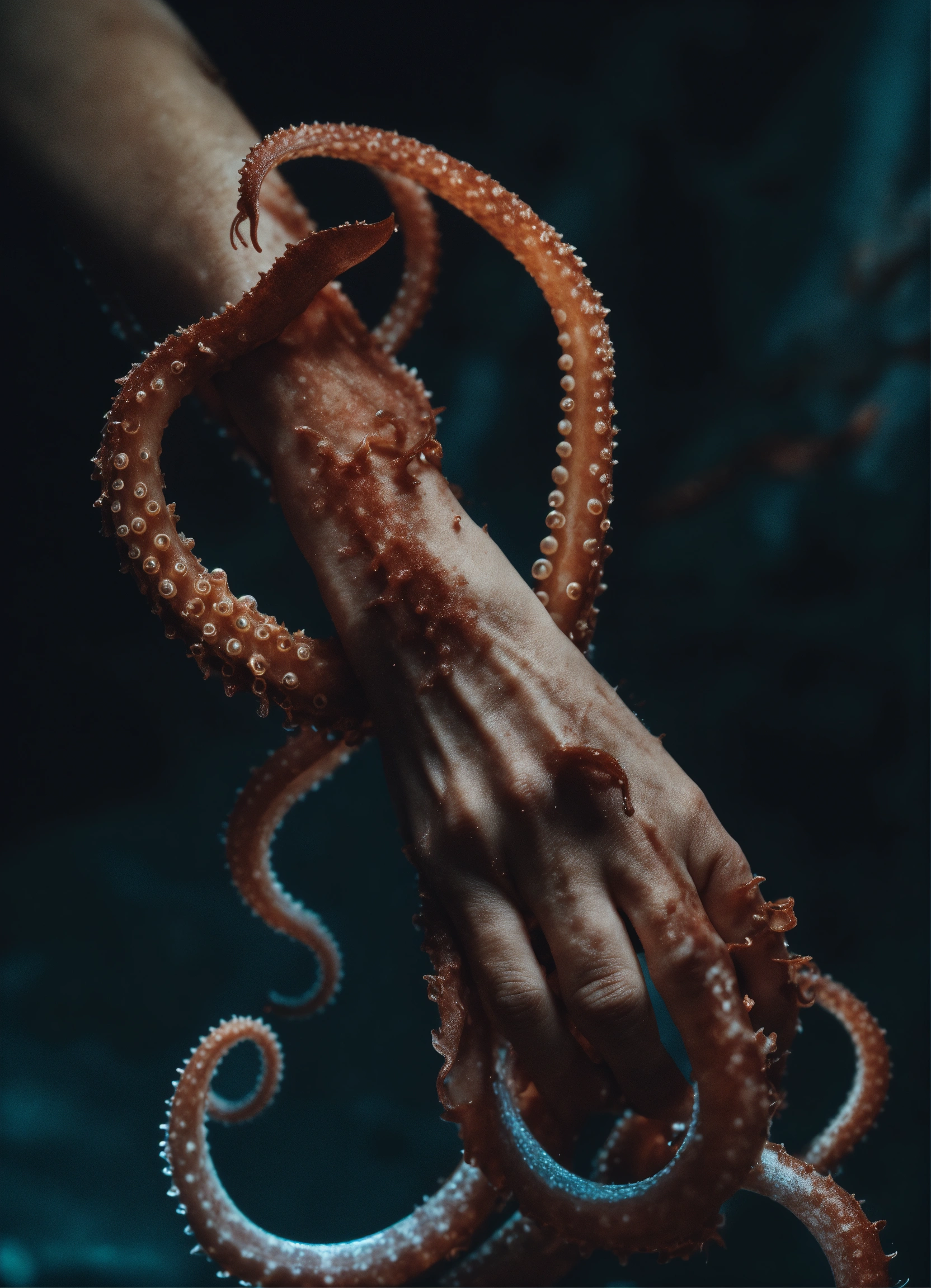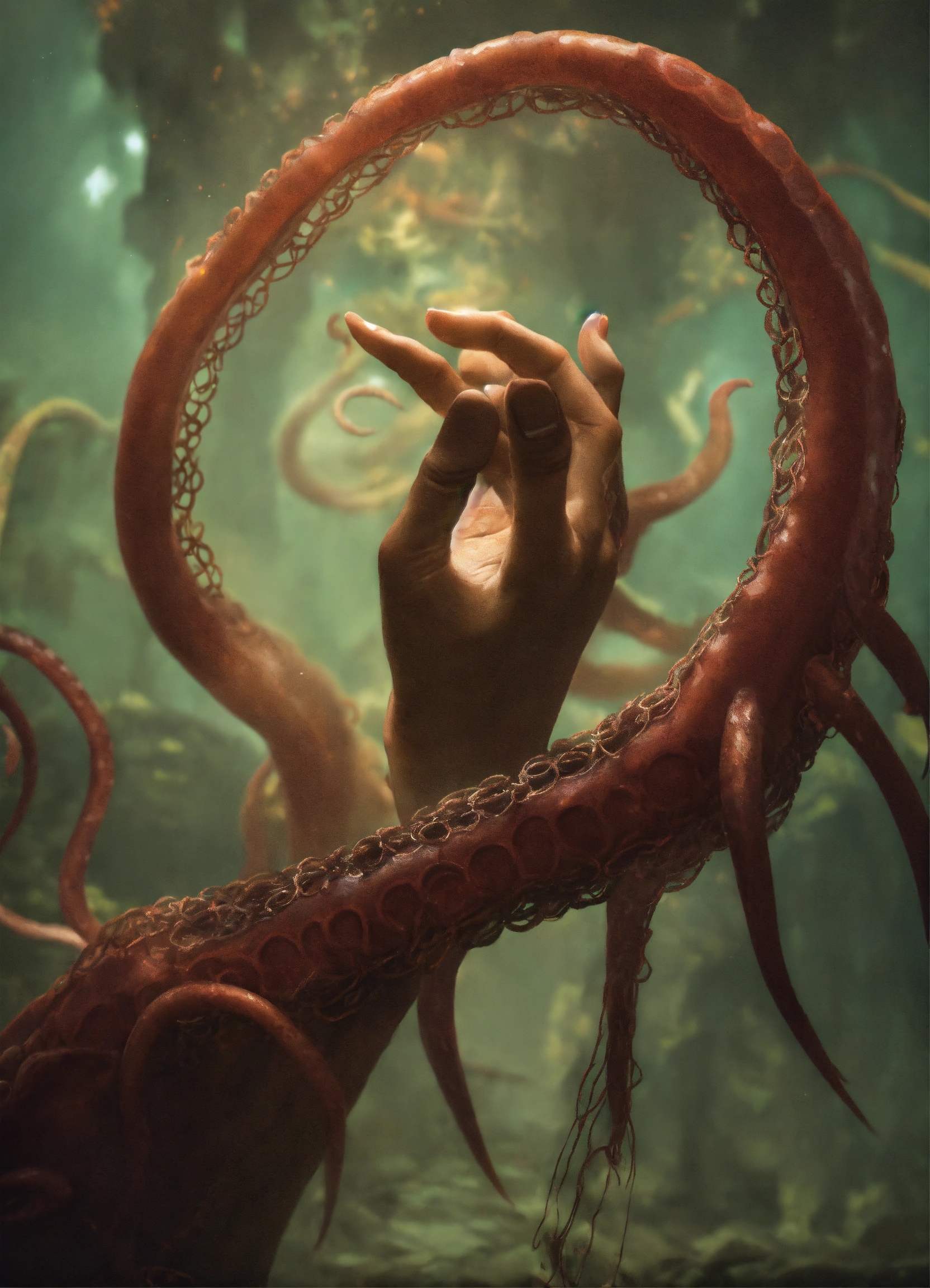 Clawed hand reaching up with tentacles wrapping around its wrist