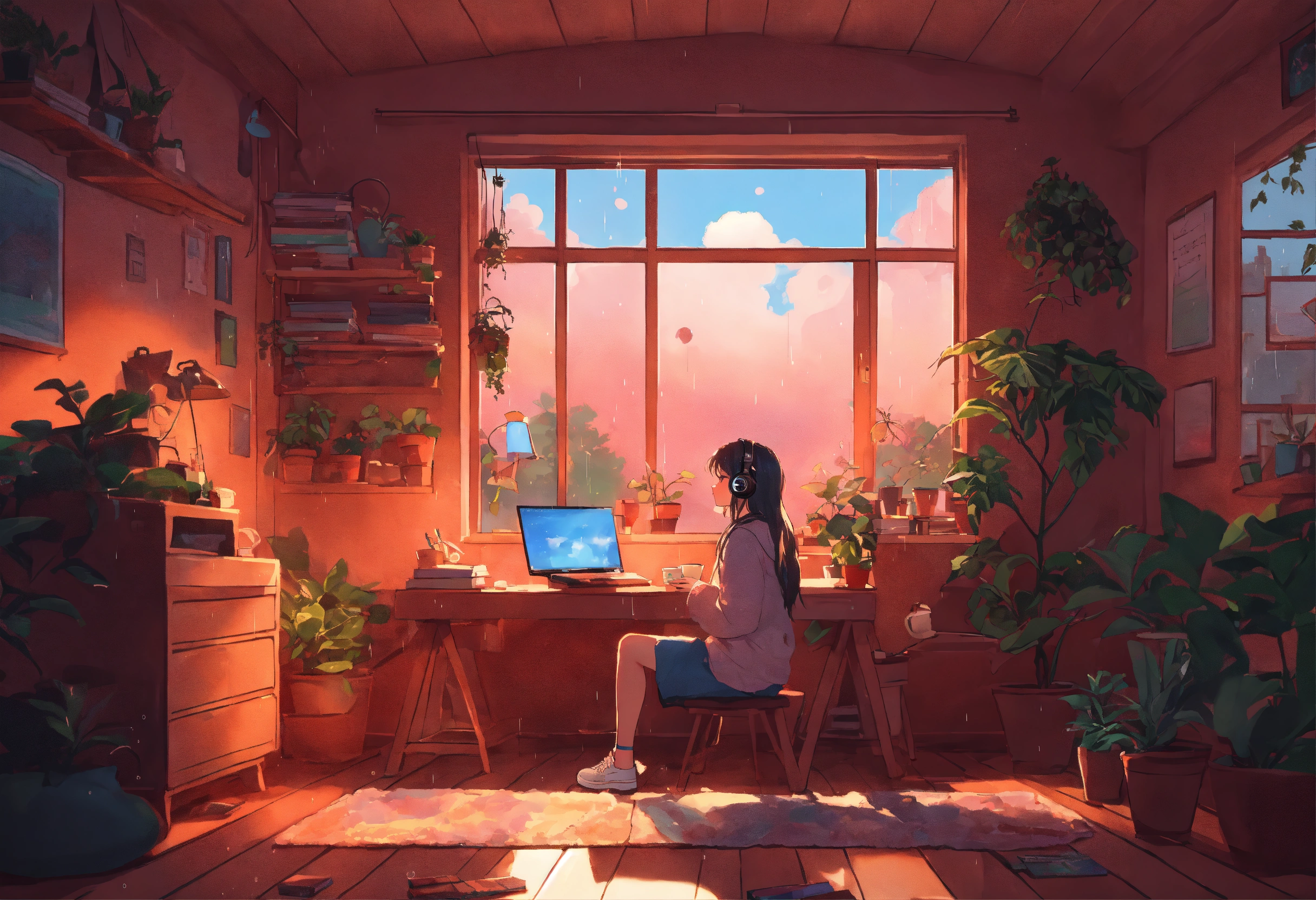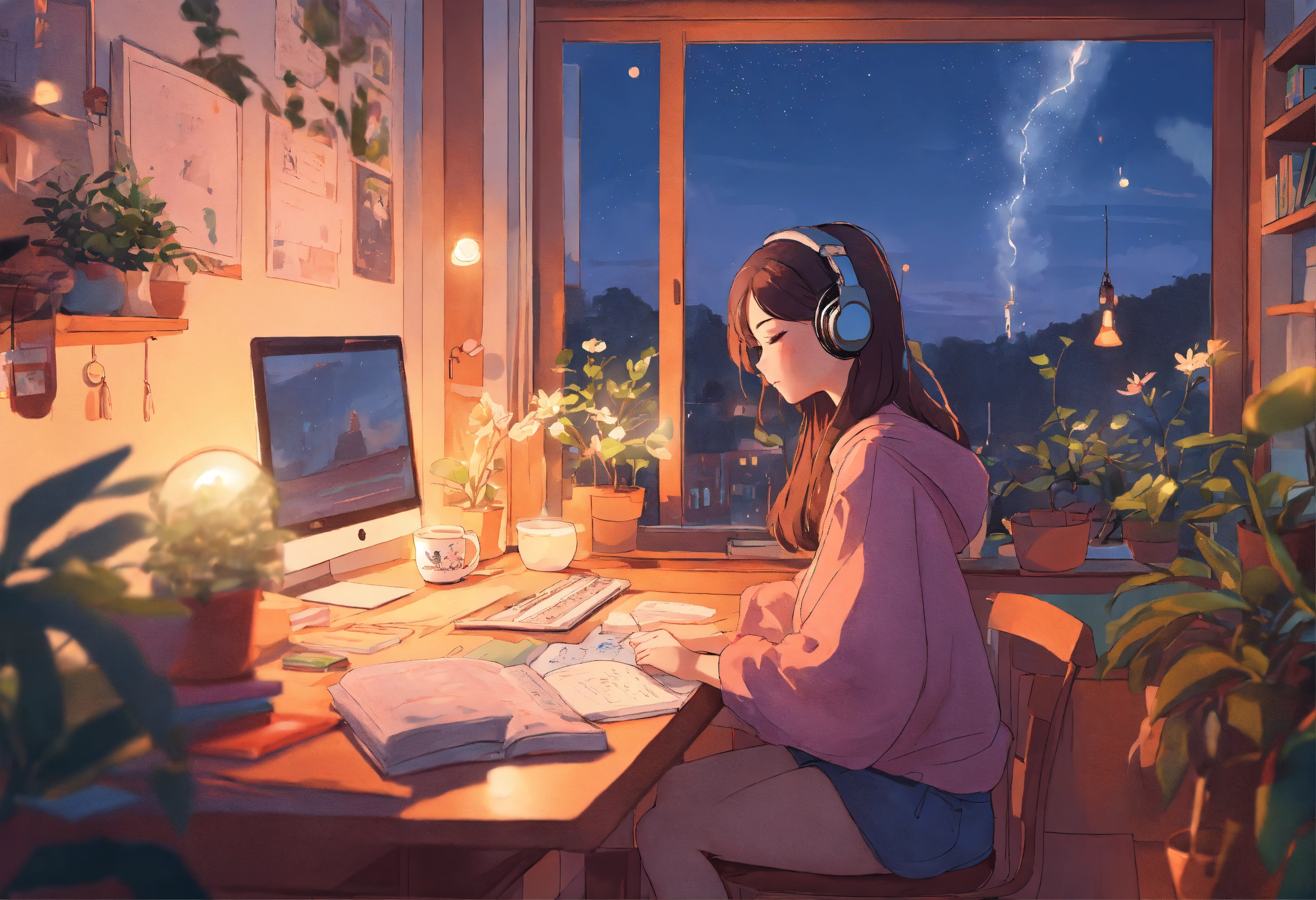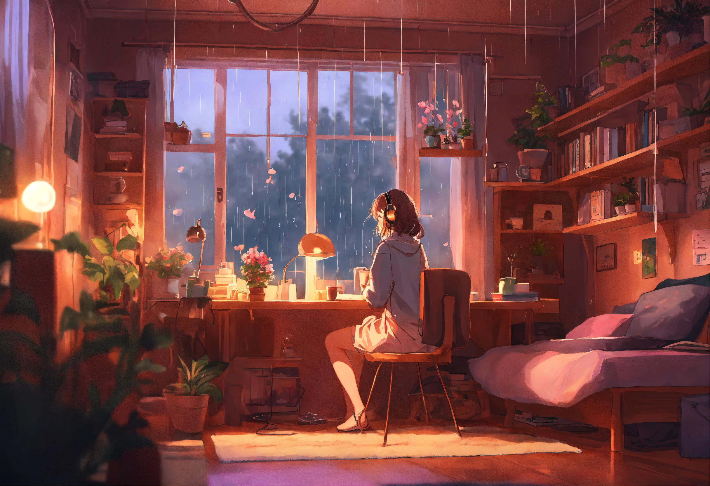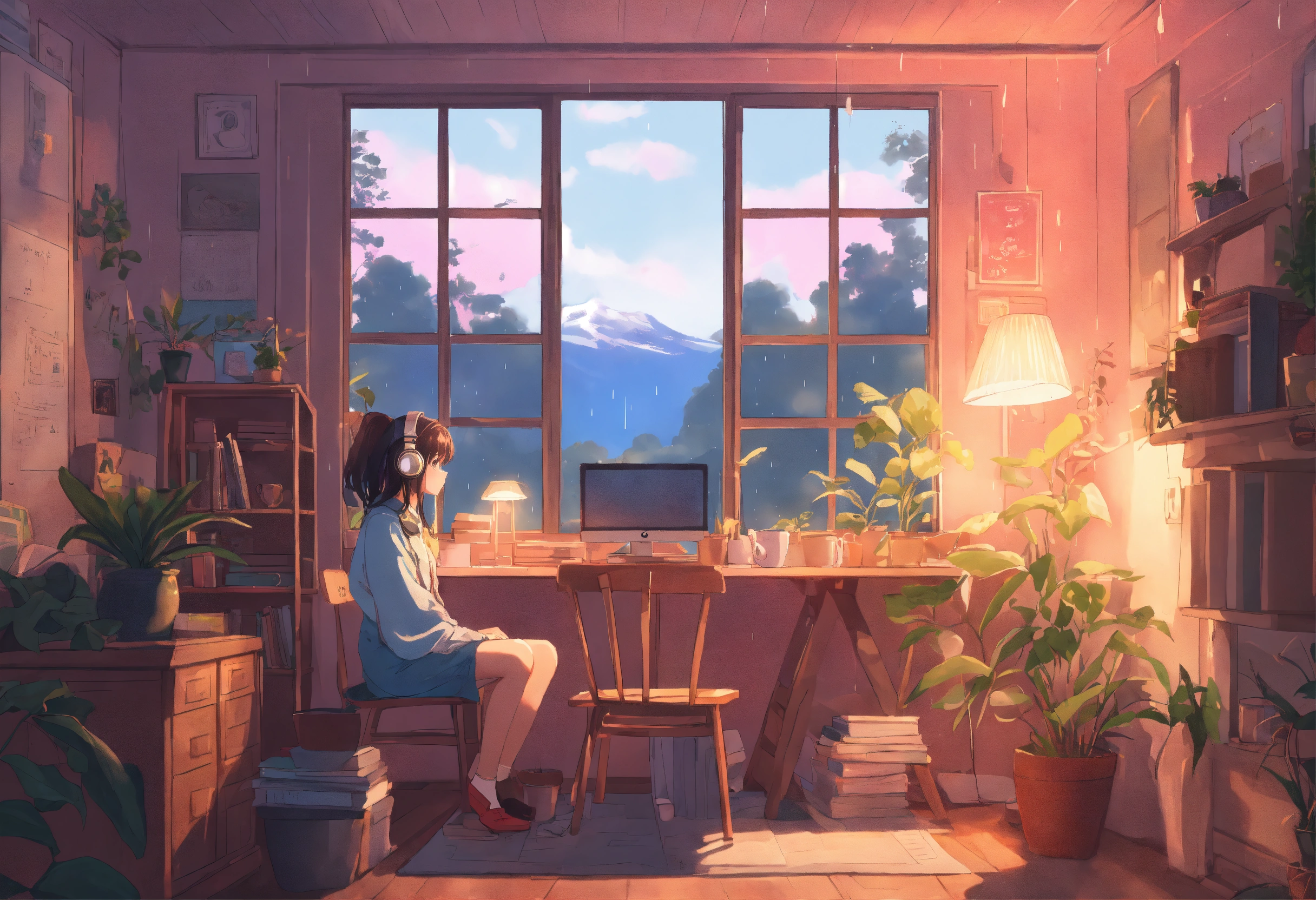 "generate an image reminiscent of the 'lofi girl' aesthetic on youtube. picture a cozy dorm room with pastel hues, soft lighting, and a girl sitting at her desk. the girl should be wearing headphones, immersed in her study, with open textbooks and notes. surround her with elements that enhance the serene atmosphere, such as potted plants, a steaming cup of tea, and perhaps a view of the outside with rain gently falling. the image should convey a sense of focus, relaxation, and the ideal ambiance for a lofi music video. capture the nostalgic and calming essence of 'lofi girl' in this scene."