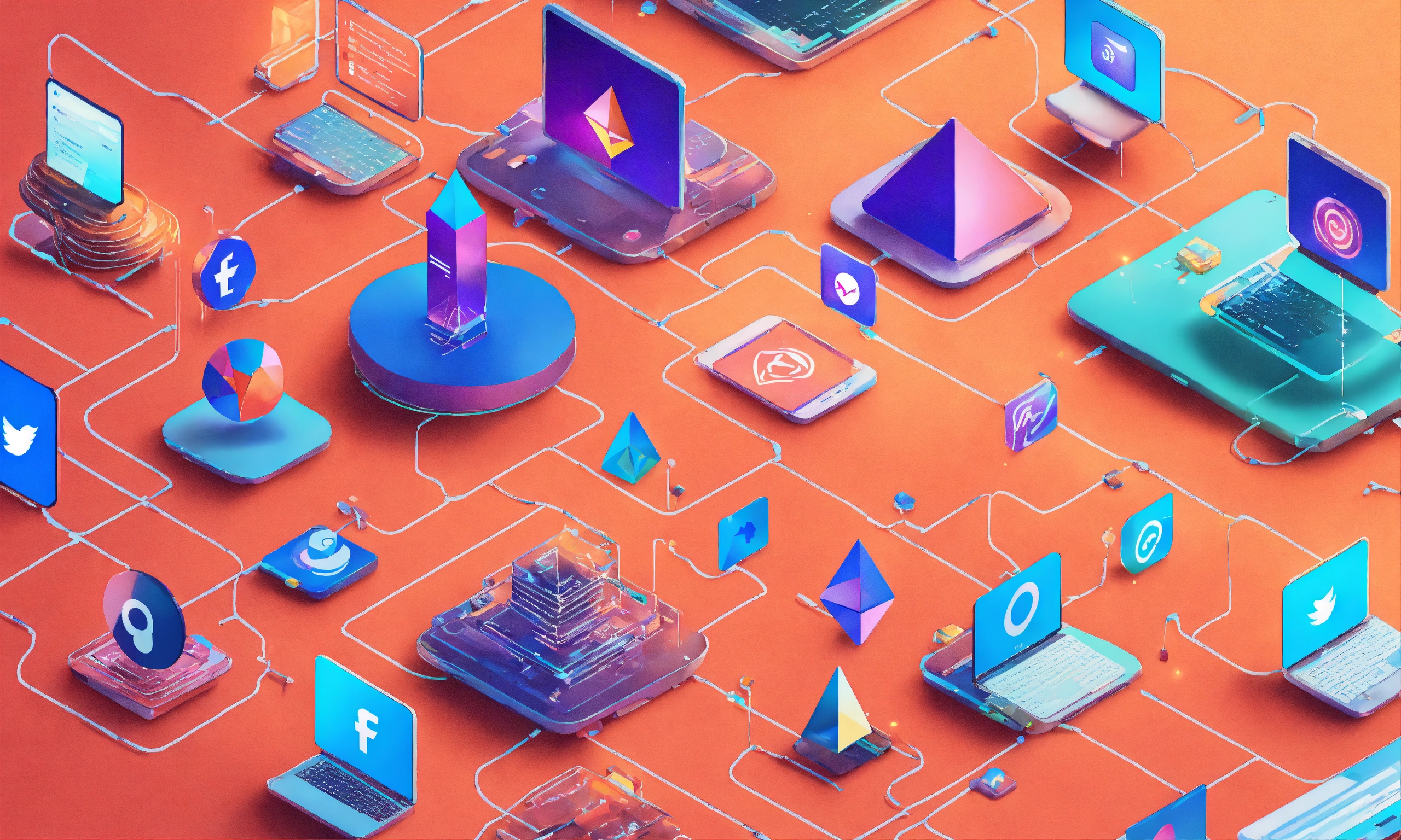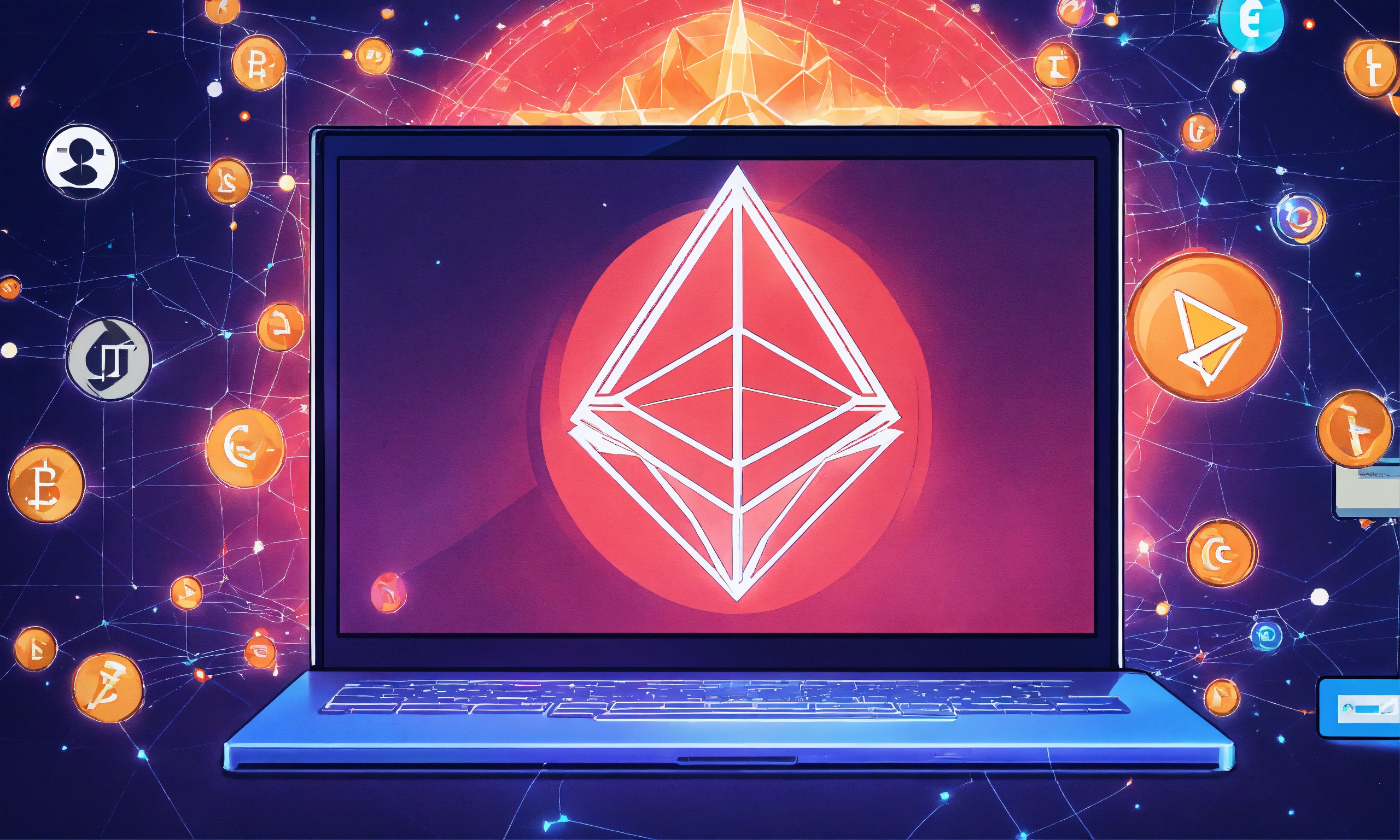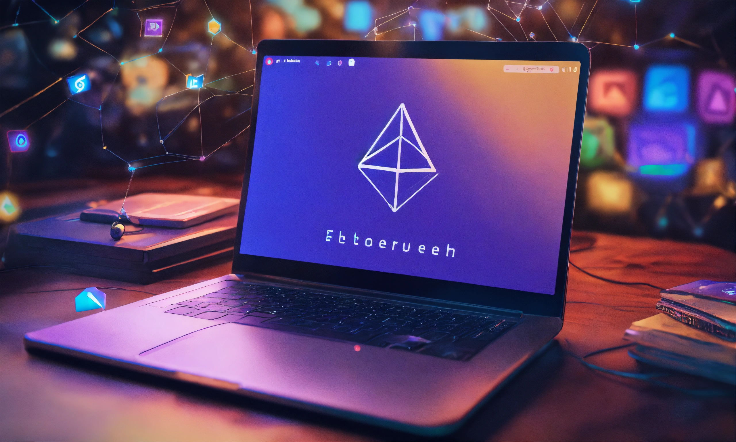 Decentralized social media networks on ethereum, highly detailed ethereum logo, interact with friends, monetize content, cryptocurrencies and nfts, depict a user using at a laptop