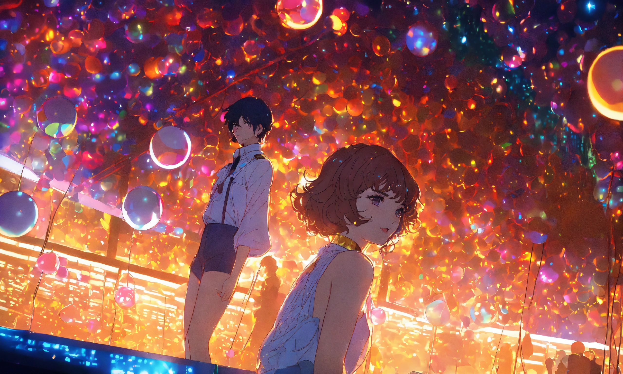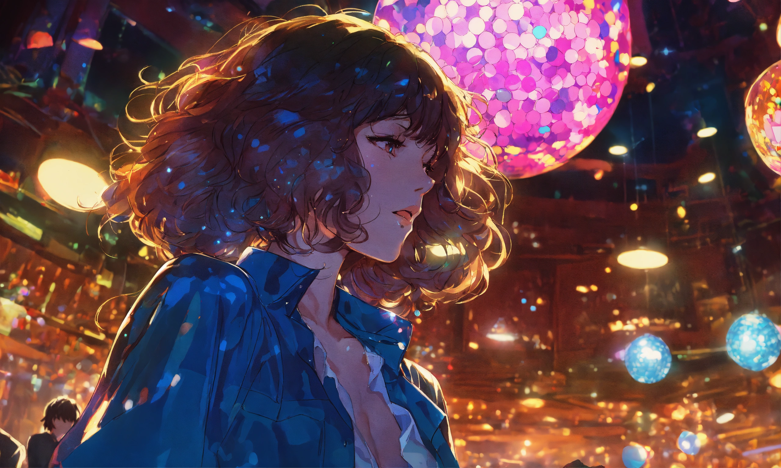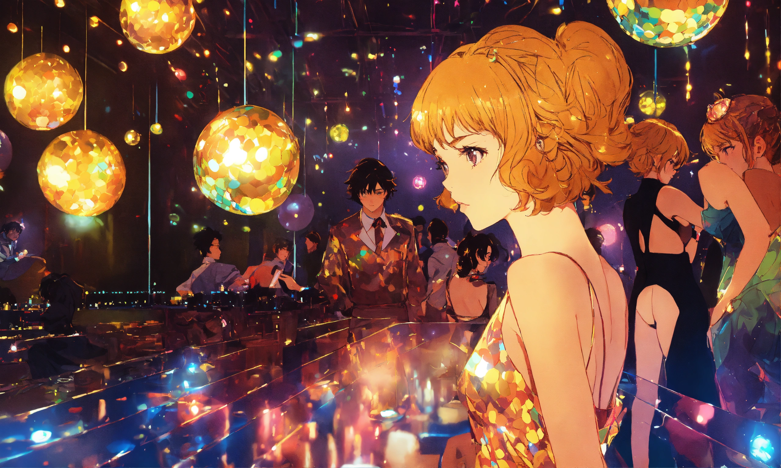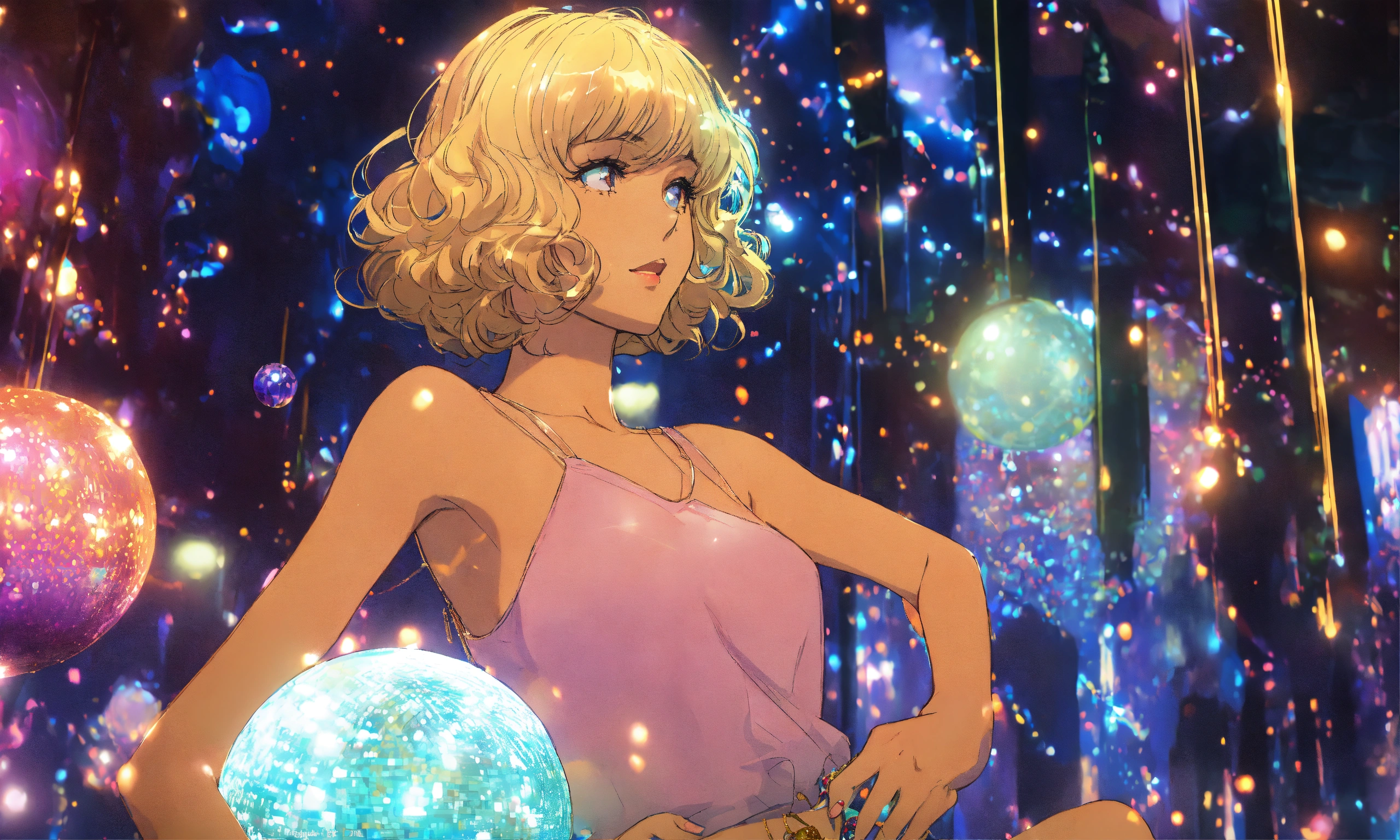 Cel anime, beautiful, lady, 18 years old, shy, wavy hair, sparkling costumes, city pop, dancing under a small glitter ball in an underground disco club, retro lighting; by shinkai makoto, kaethe butcher, hajime sorayama, greg tocchini, virgil finlay, 4k, film grain, long shot.