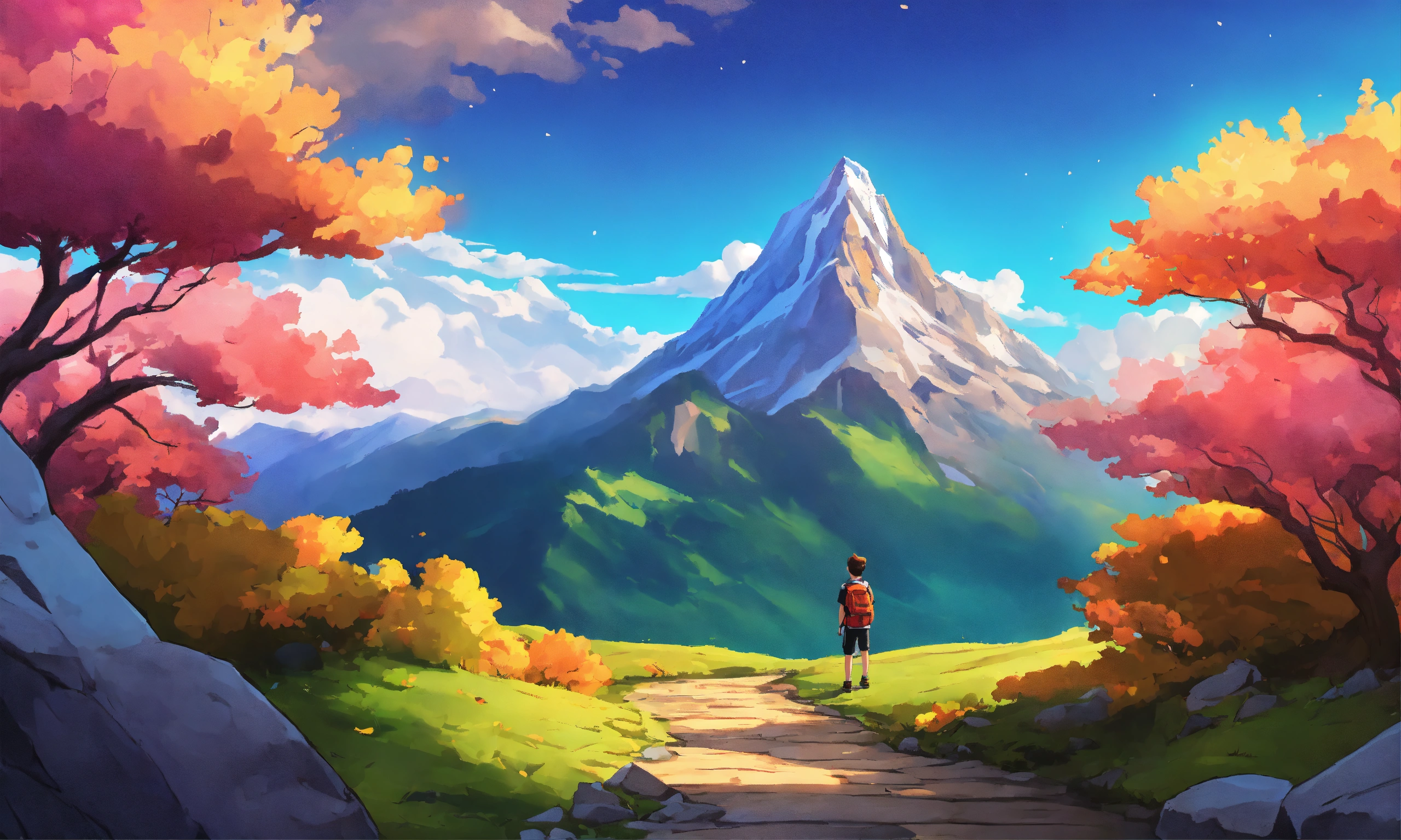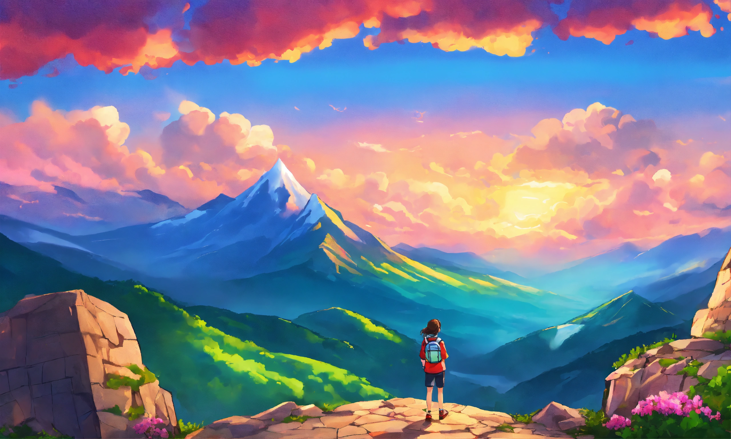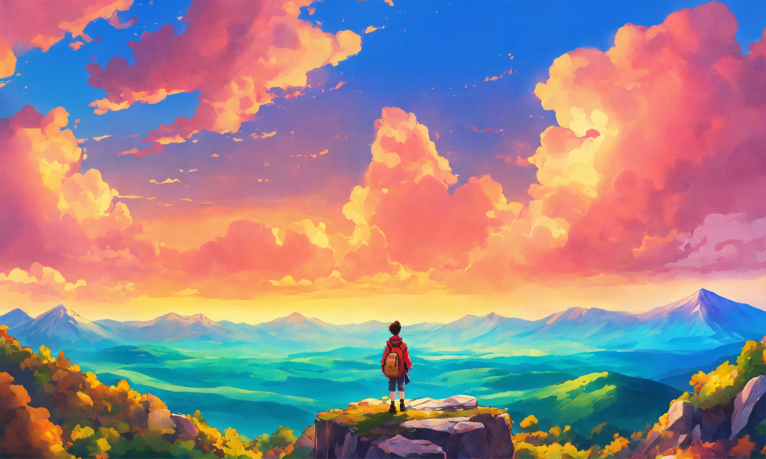Cartoon looking towards beautiful vibrant sky standing on the peak of the mountain