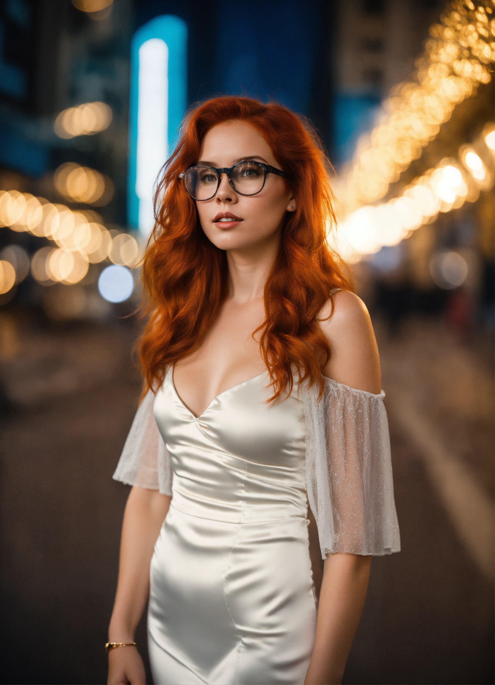 A real photo of a cute 28 year old hot redhead girl wearing a white silk tight dress and hot glasses standing in a city, in the sky we see the milky-way