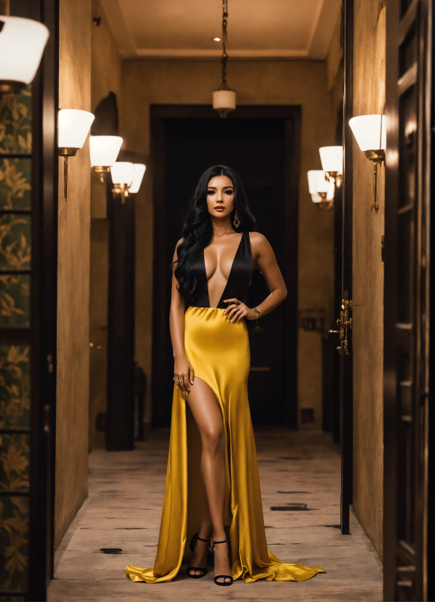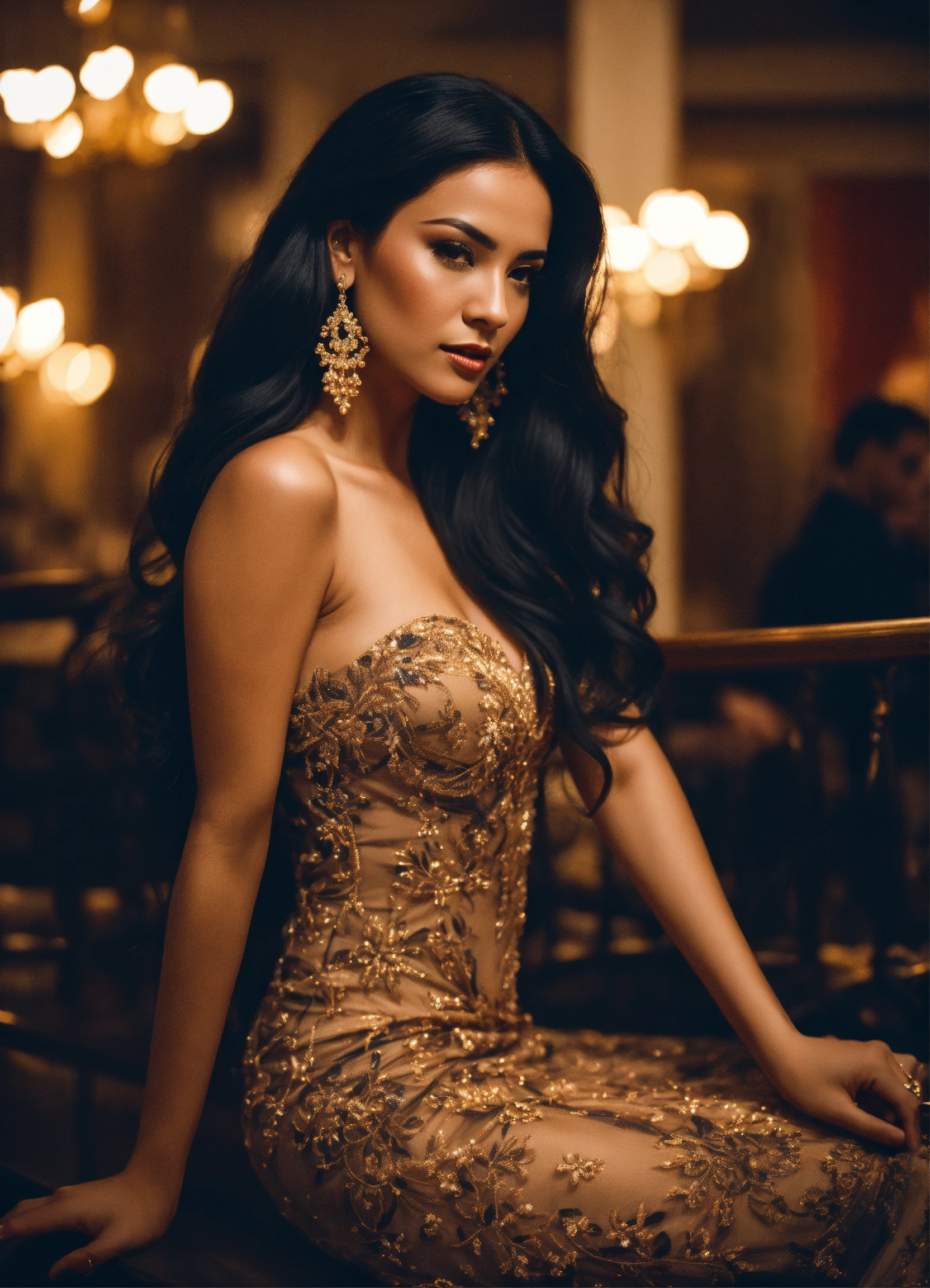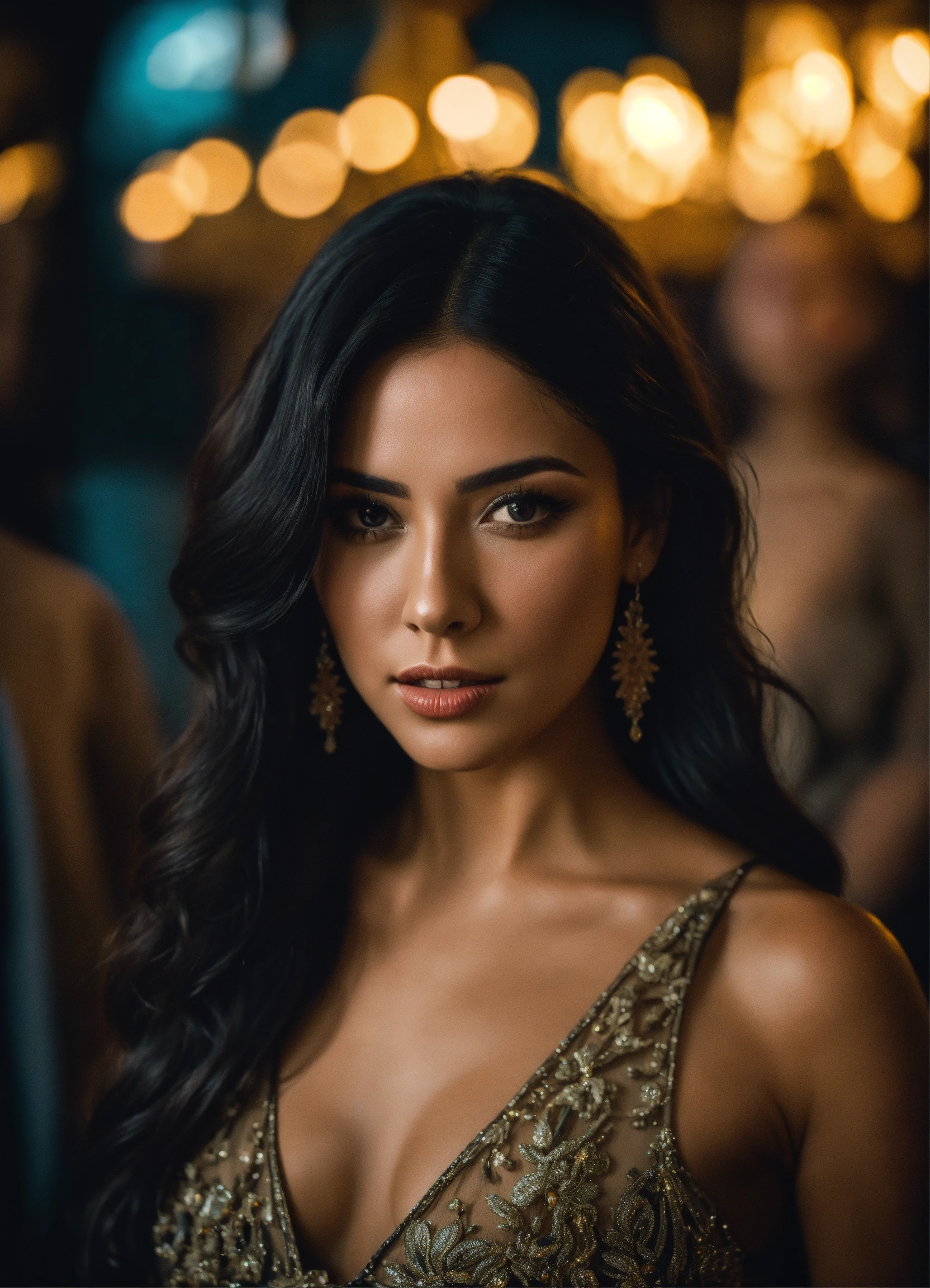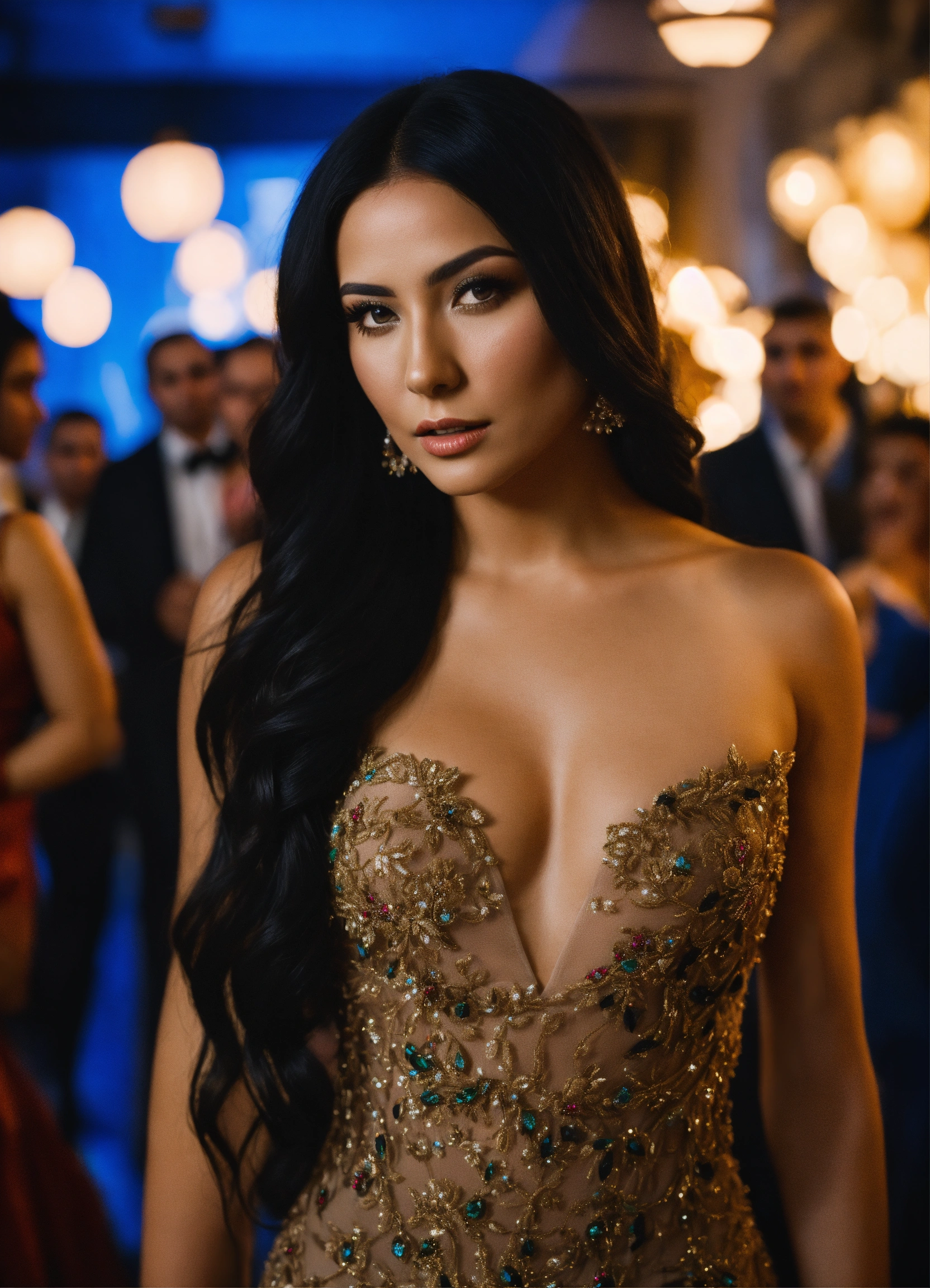 Cinematic photo beautiful latina woman with long black hair in evening dress center of attention surrounded my men, ultra 8k
