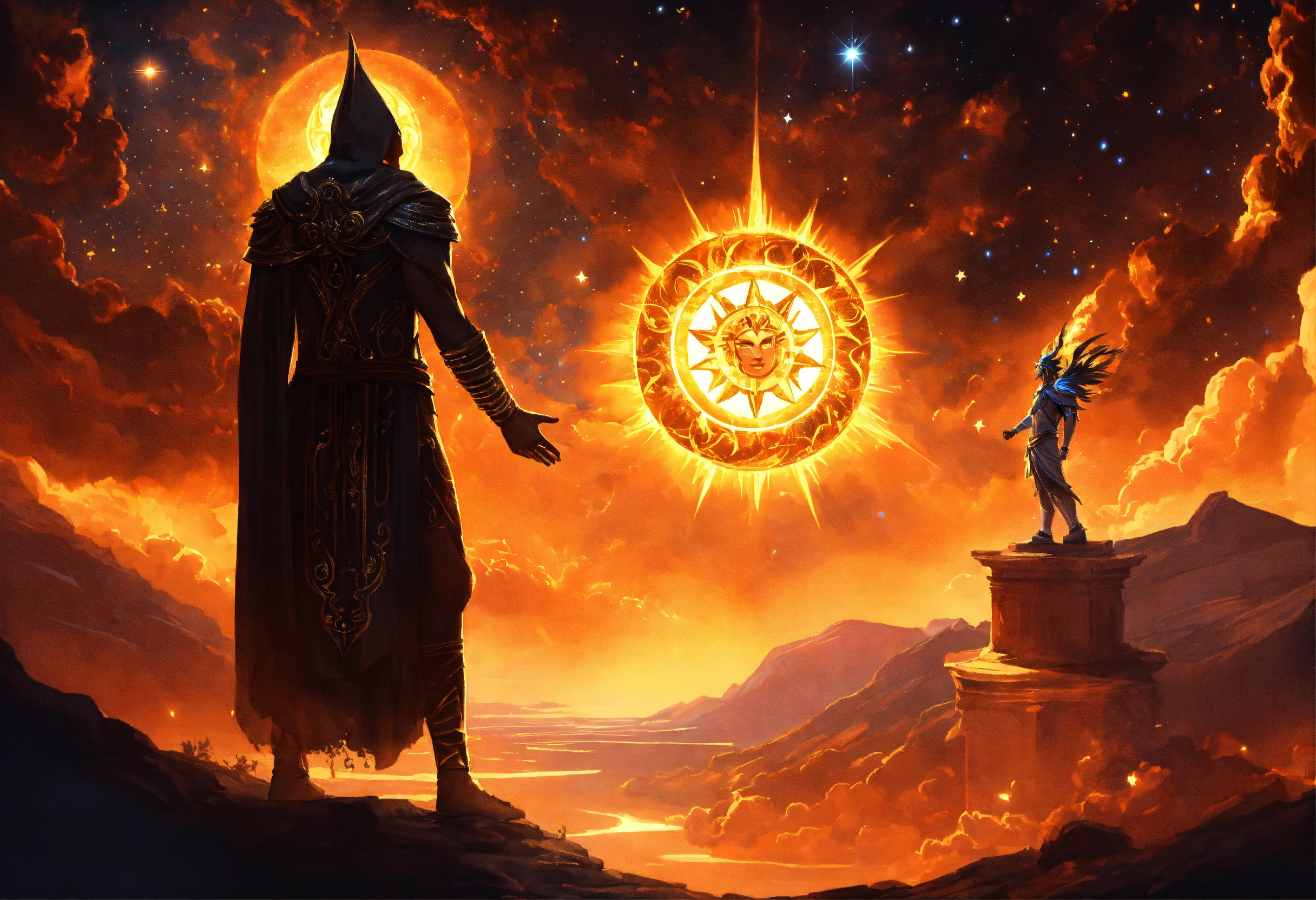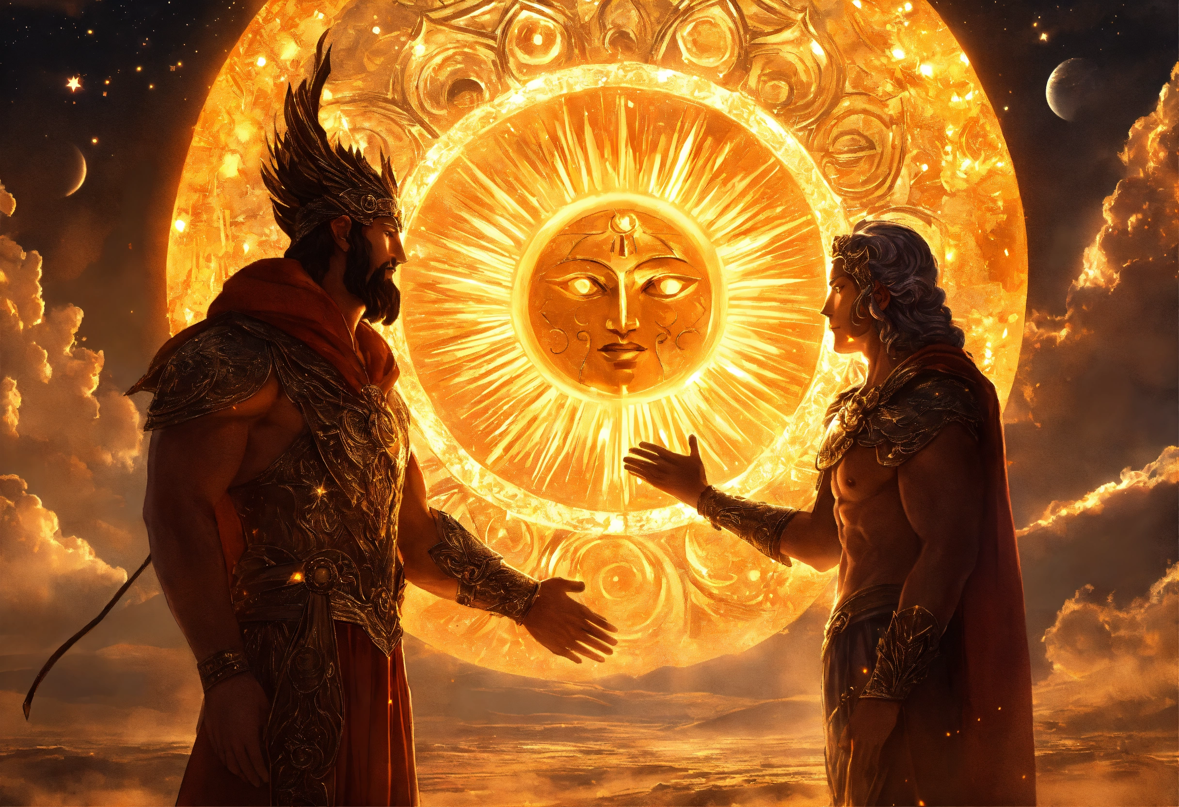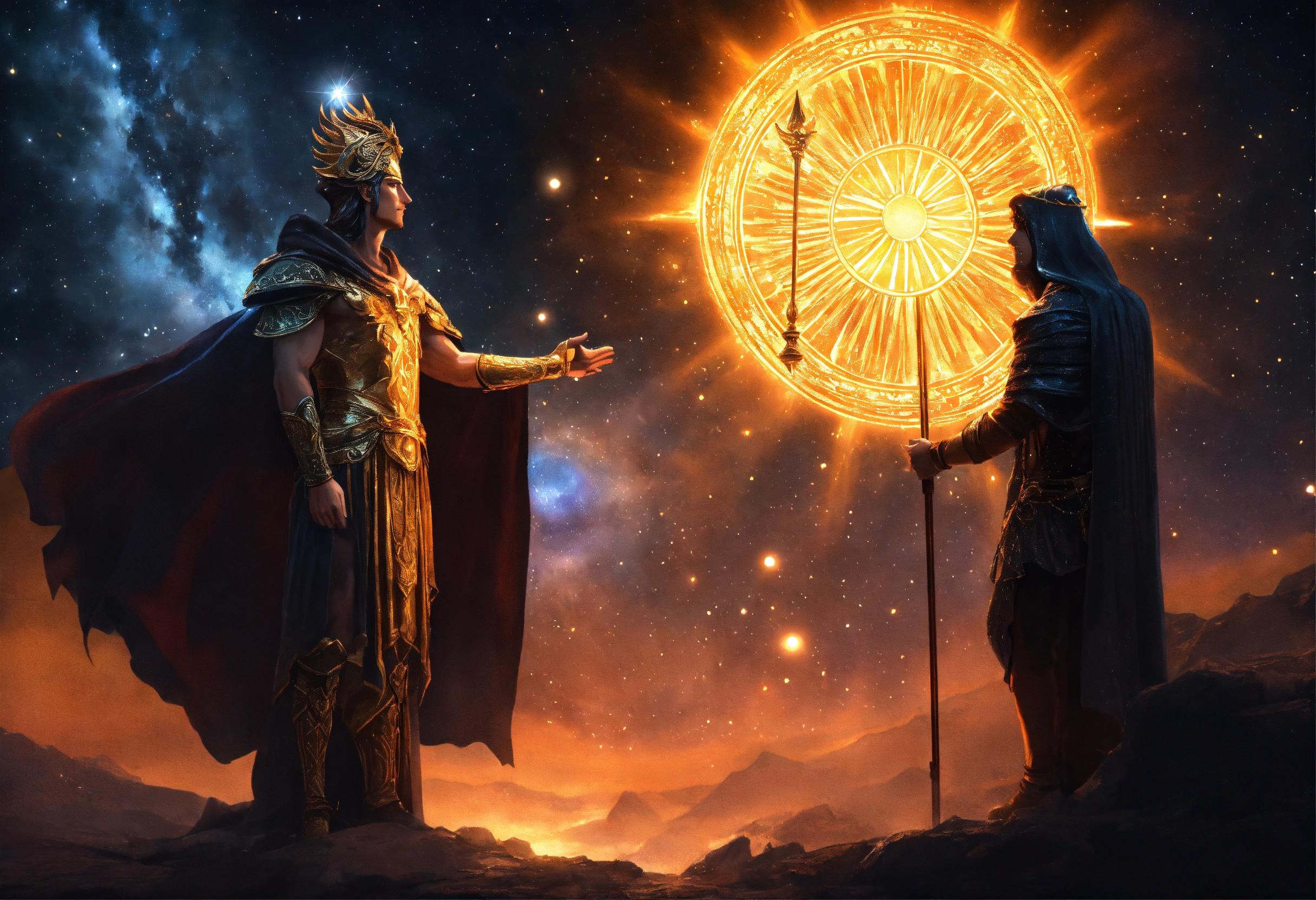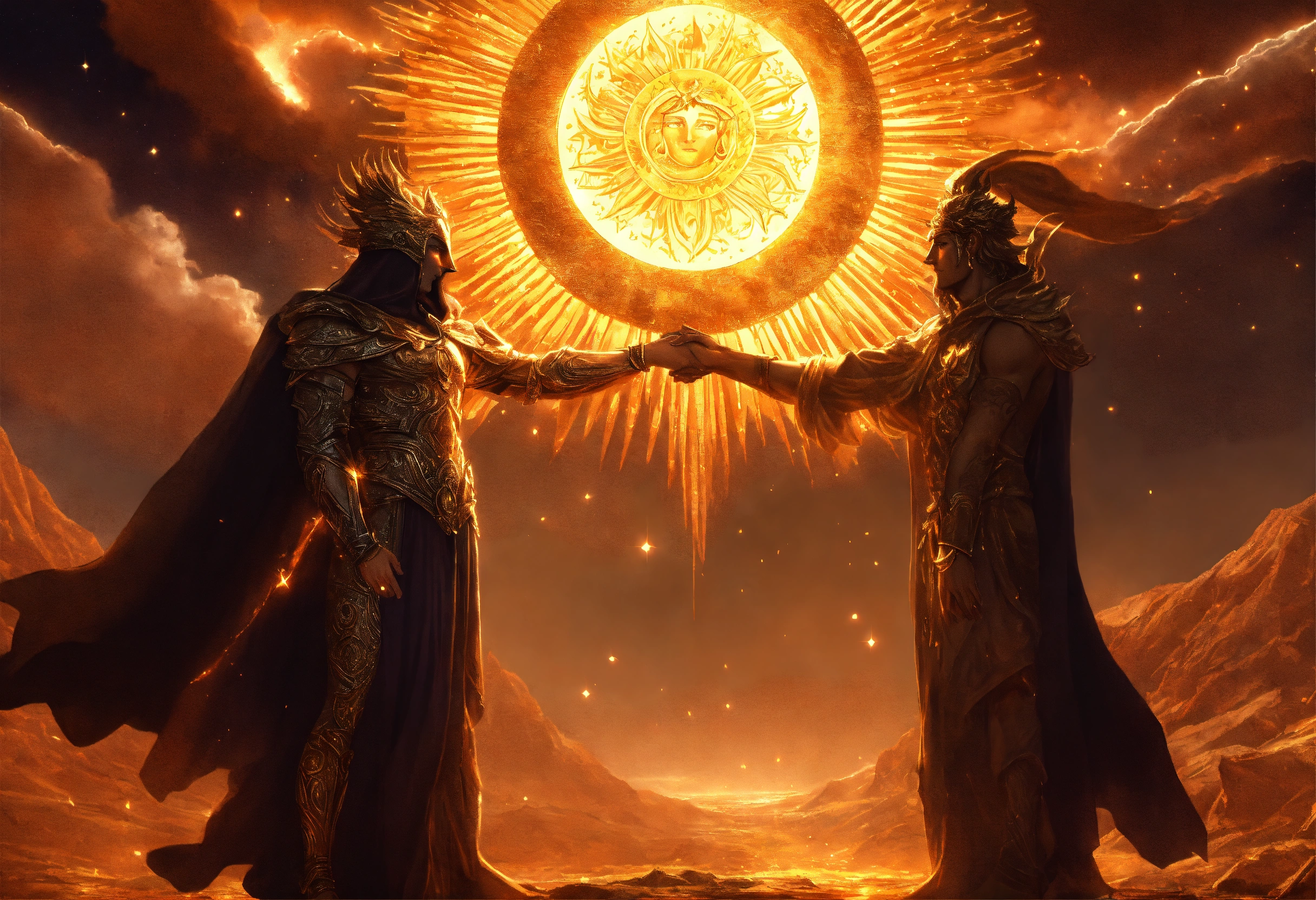 In a background of stars, a hooded hades (god of darkness), shakes hands with the brilliant figure of helios (god of the sun) who illuminates the scene