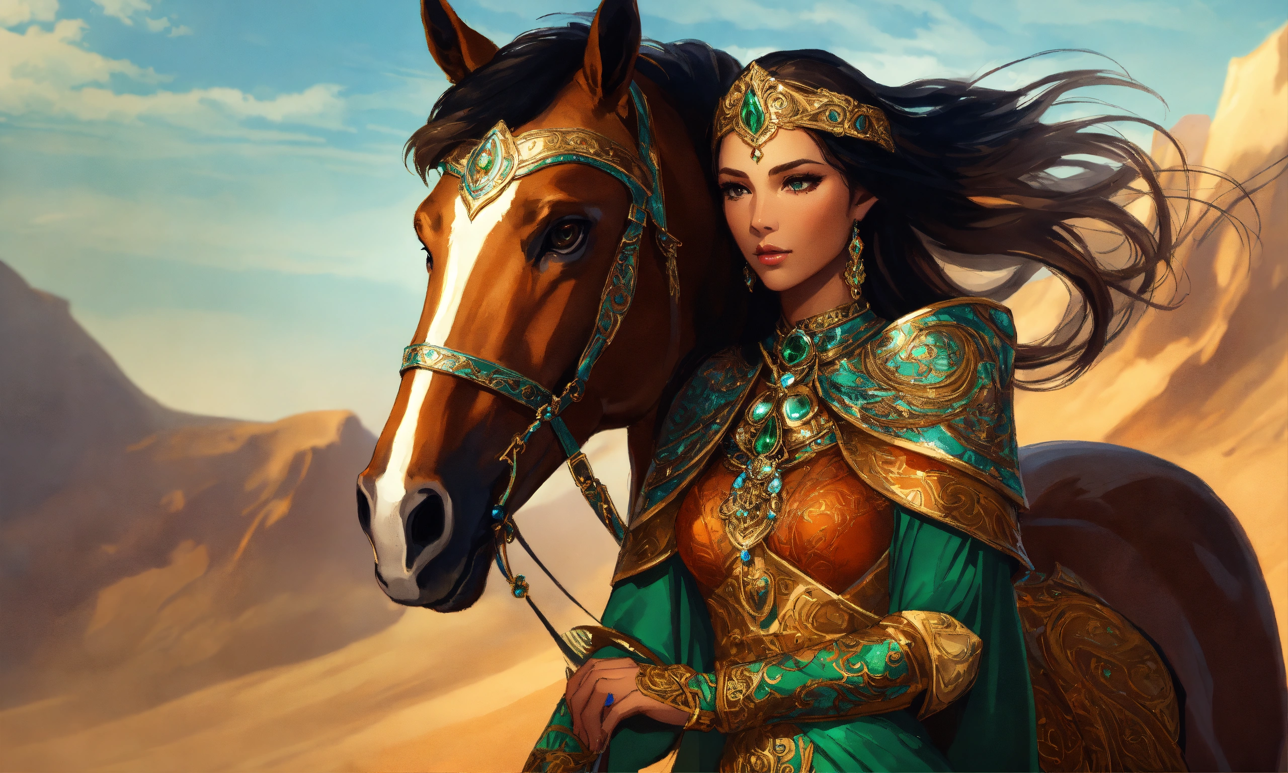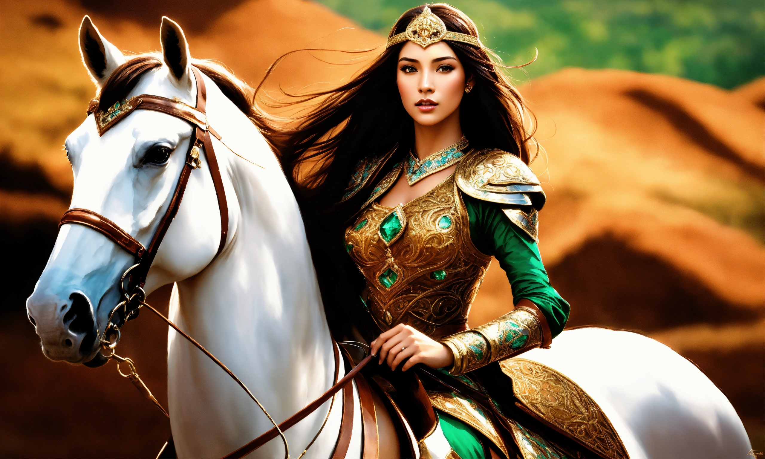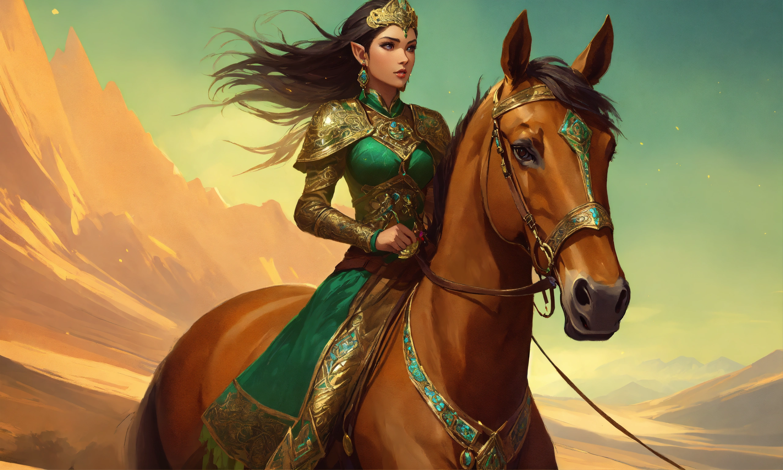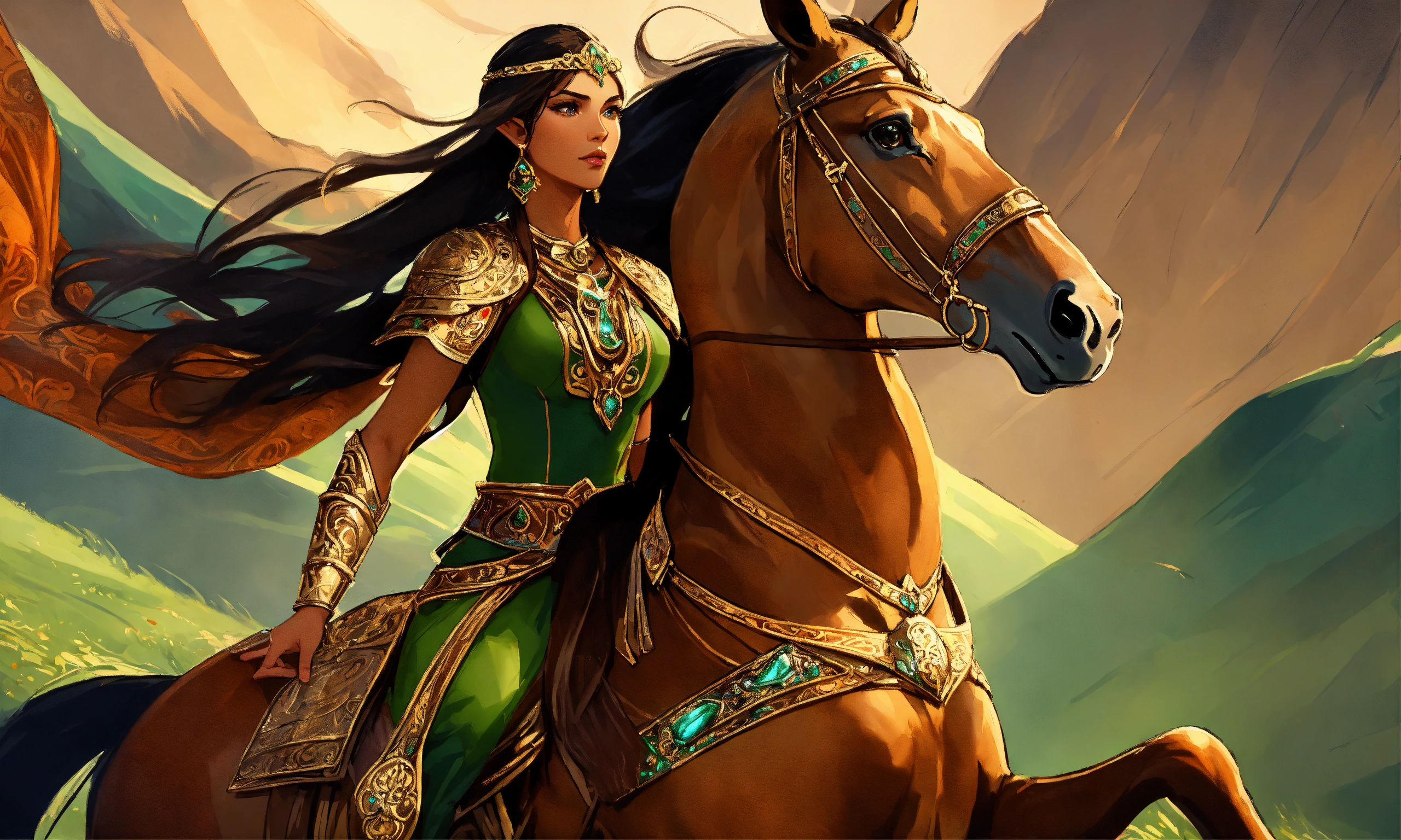 A gorgeous moghul elf female warrior riding large brown horse, high cheekbones, glowing dark tan skin, intricate emerald and gold jewelry, moghul armor, long brown hair blowing in the wind, dressed in jewels tones, long highlighted dark brown hair, hazel green eyes, background mongolian plains, exotic, pretty face, intricate, elegant, highly detailed, digital painting, artstation, concept art, smooth, sharp focus, illustration, art by artgerm and greg rutkowski and alphonse mucha, erte, art deco, filigree and scroll, 8 k, orange clothes