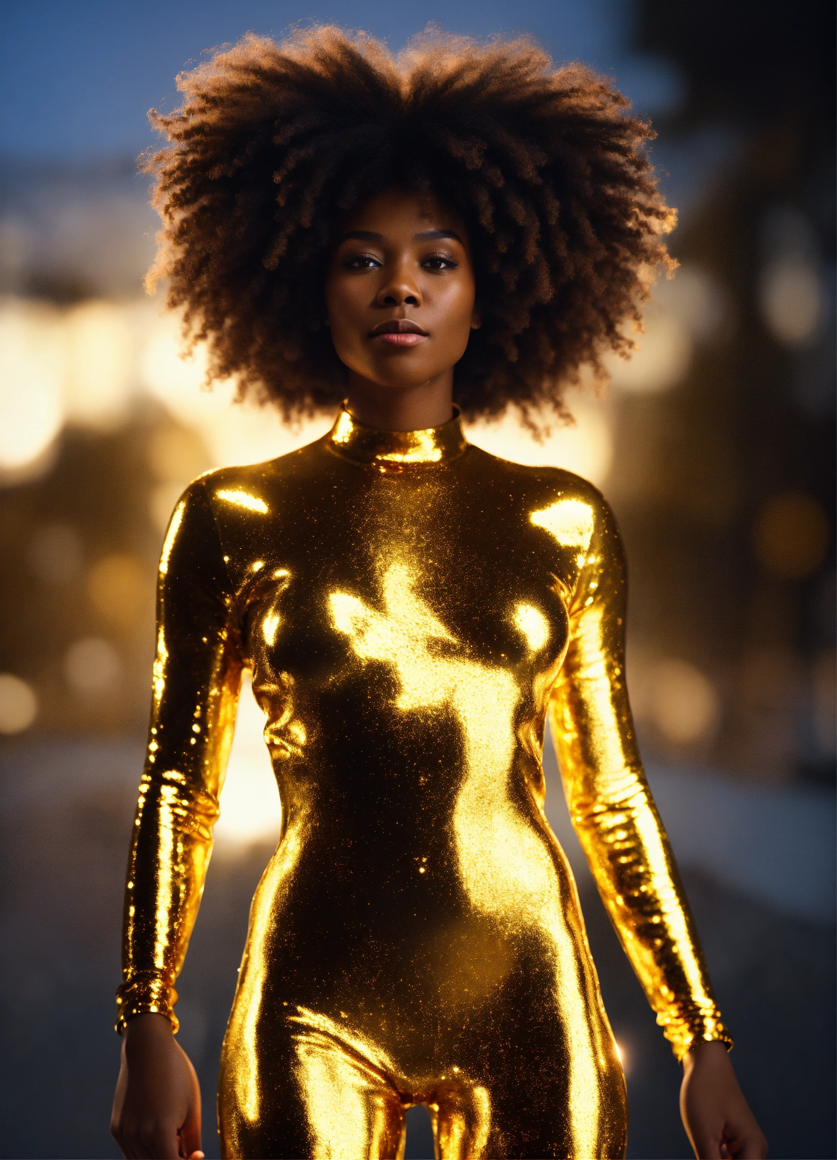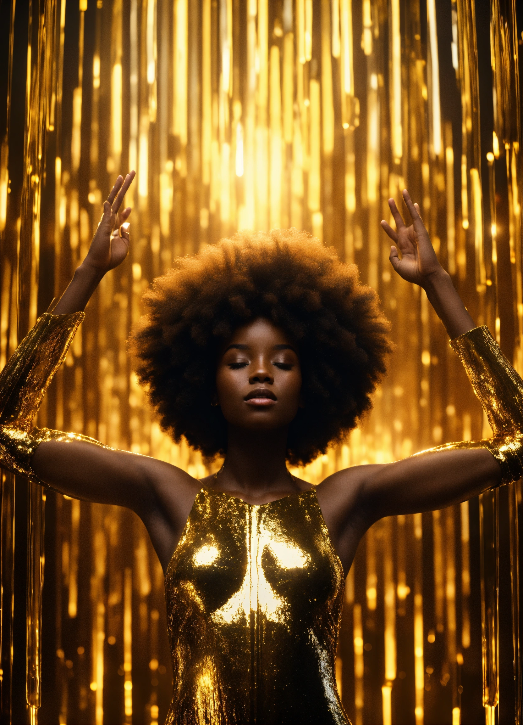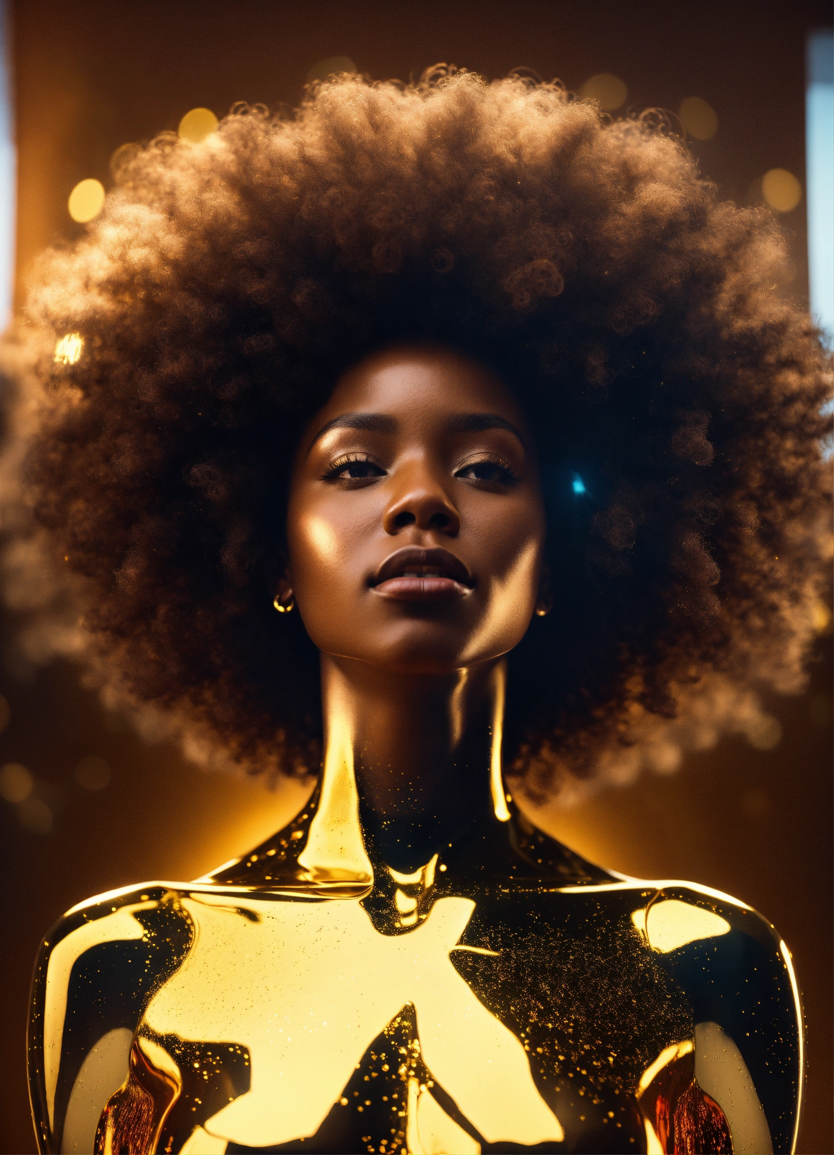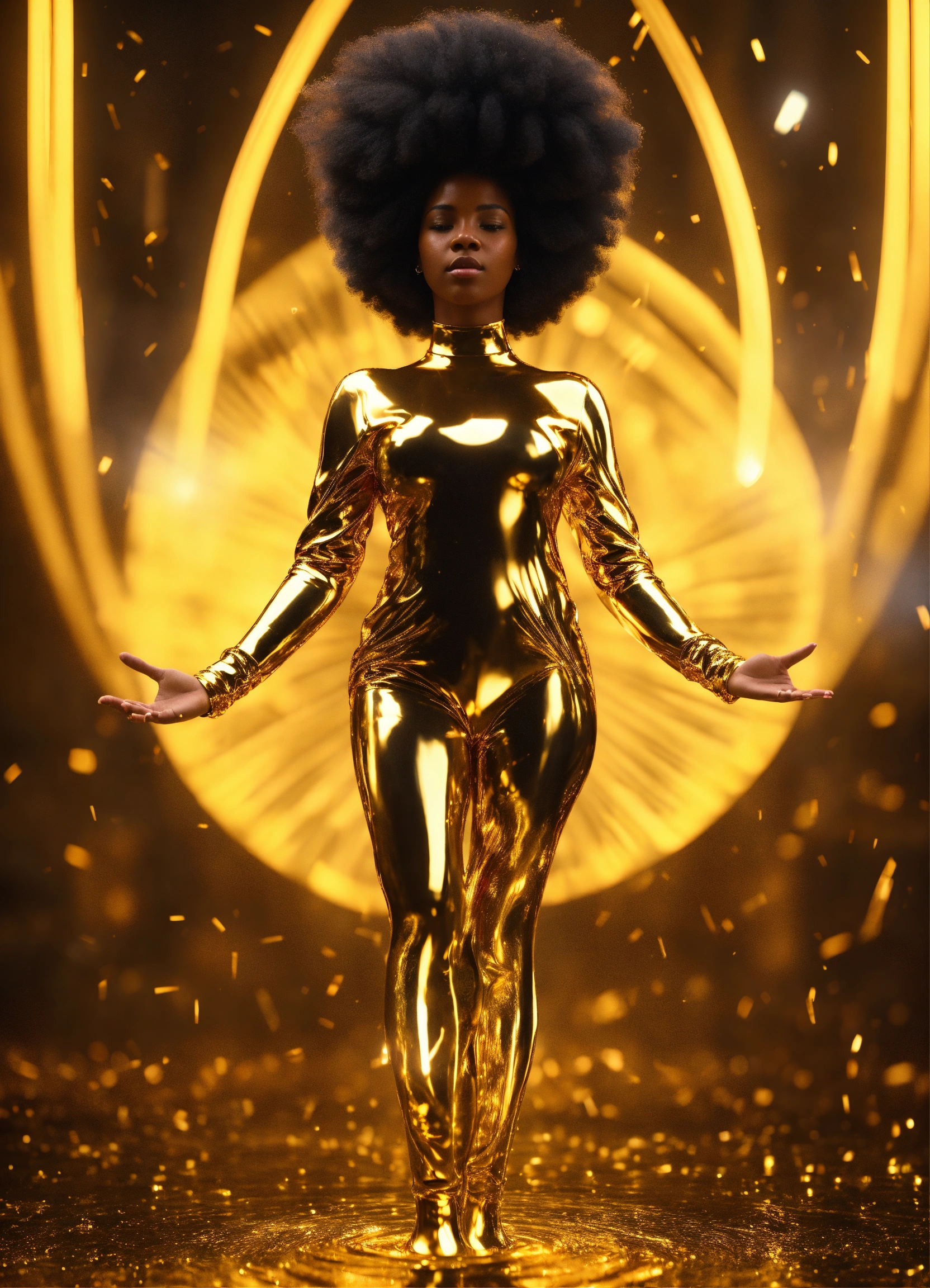 3d render of black woman with afro made entirely of glass, full body shot, standing, arms outstretched to sides in welcoming, palms up, eyes open looking directly into camera, liquid gold flows through her entire face and body, illuminating her form from within. taken on medium format camera, ambient lighting, zeiss distagon t* 50mm lens.