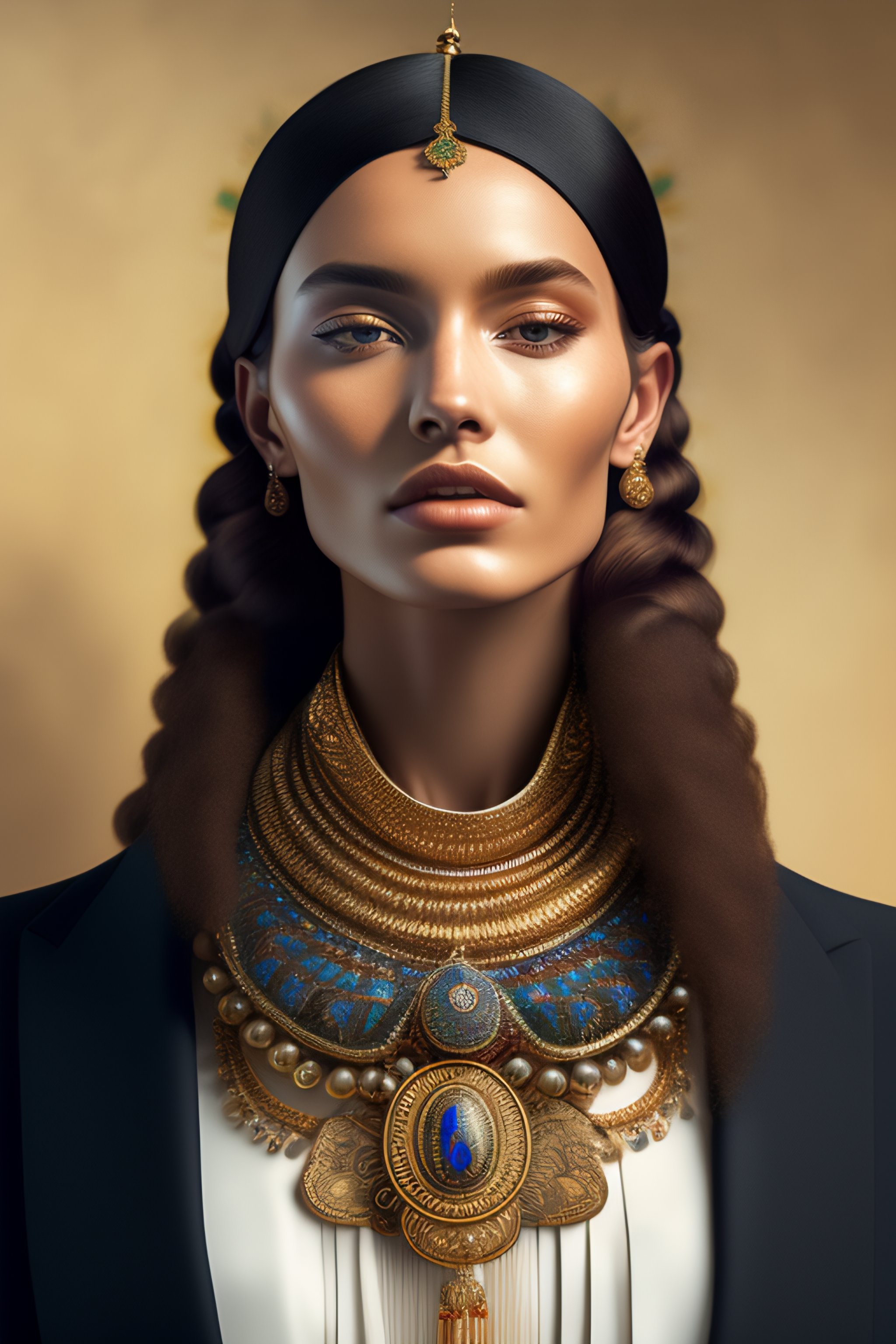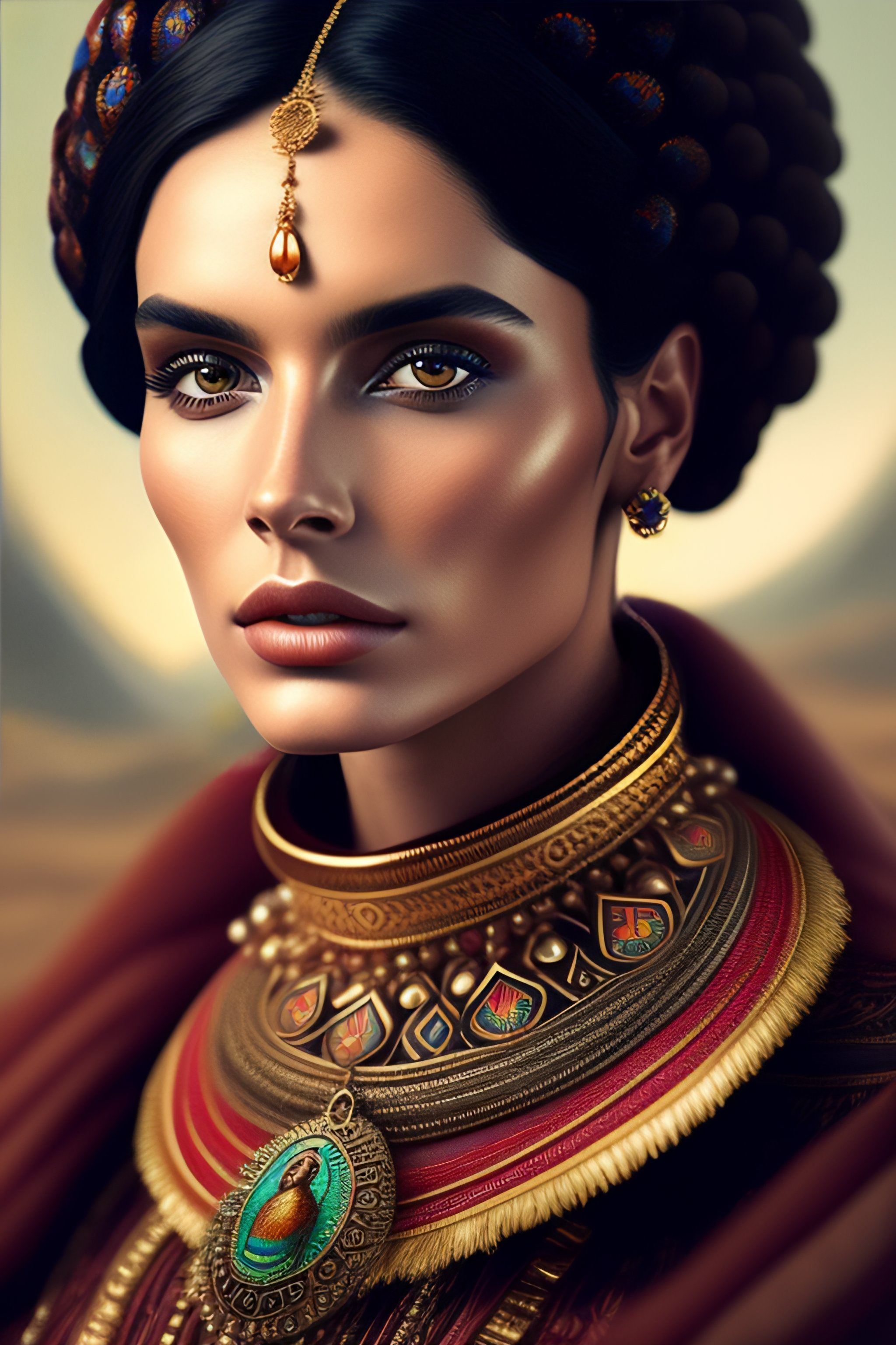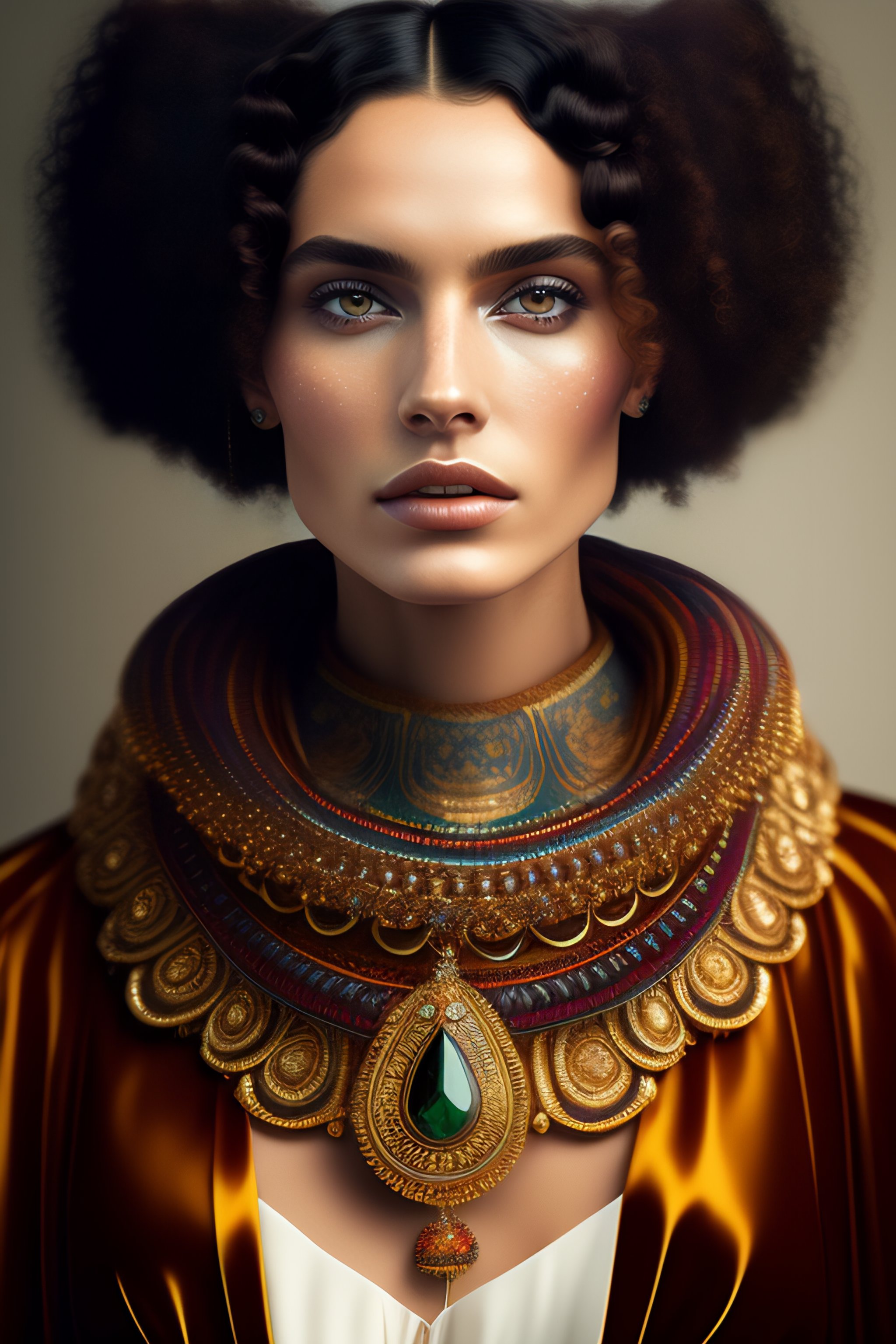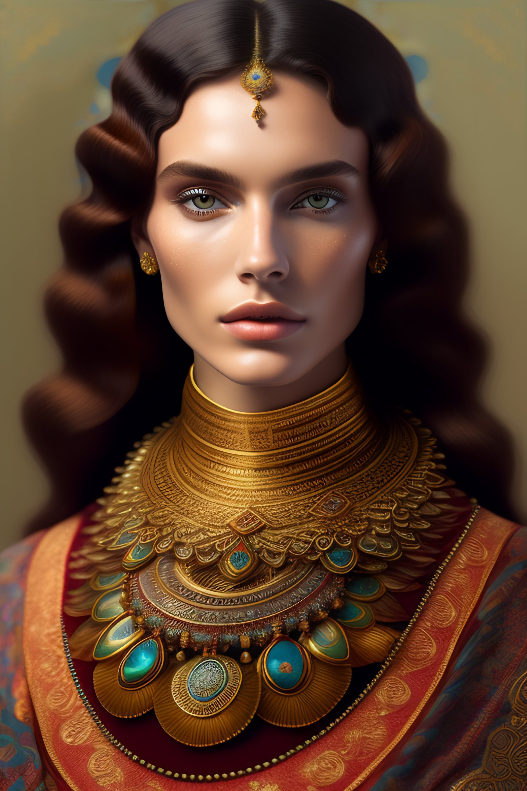 A close up of a woman with a necklace around her neck, a photorealistic painting, by christian w. staudinger, featured on cg society, long brown puffy curly hair, symmetrical portrait rpg avatar, wearing ornate silk clothes, affinity photo, ukrainian national clothes, 2 0 2 1 award winning painting, erwin olaf, peacock, as a tarot card