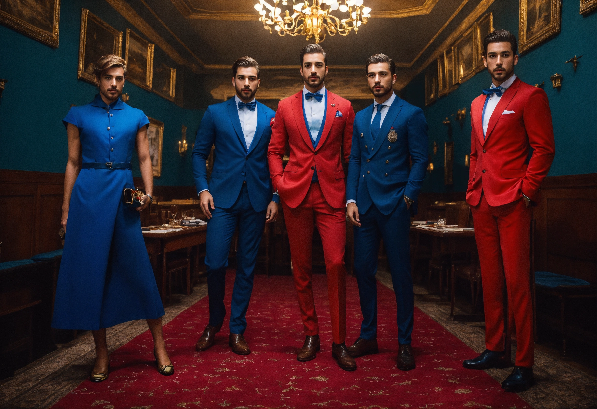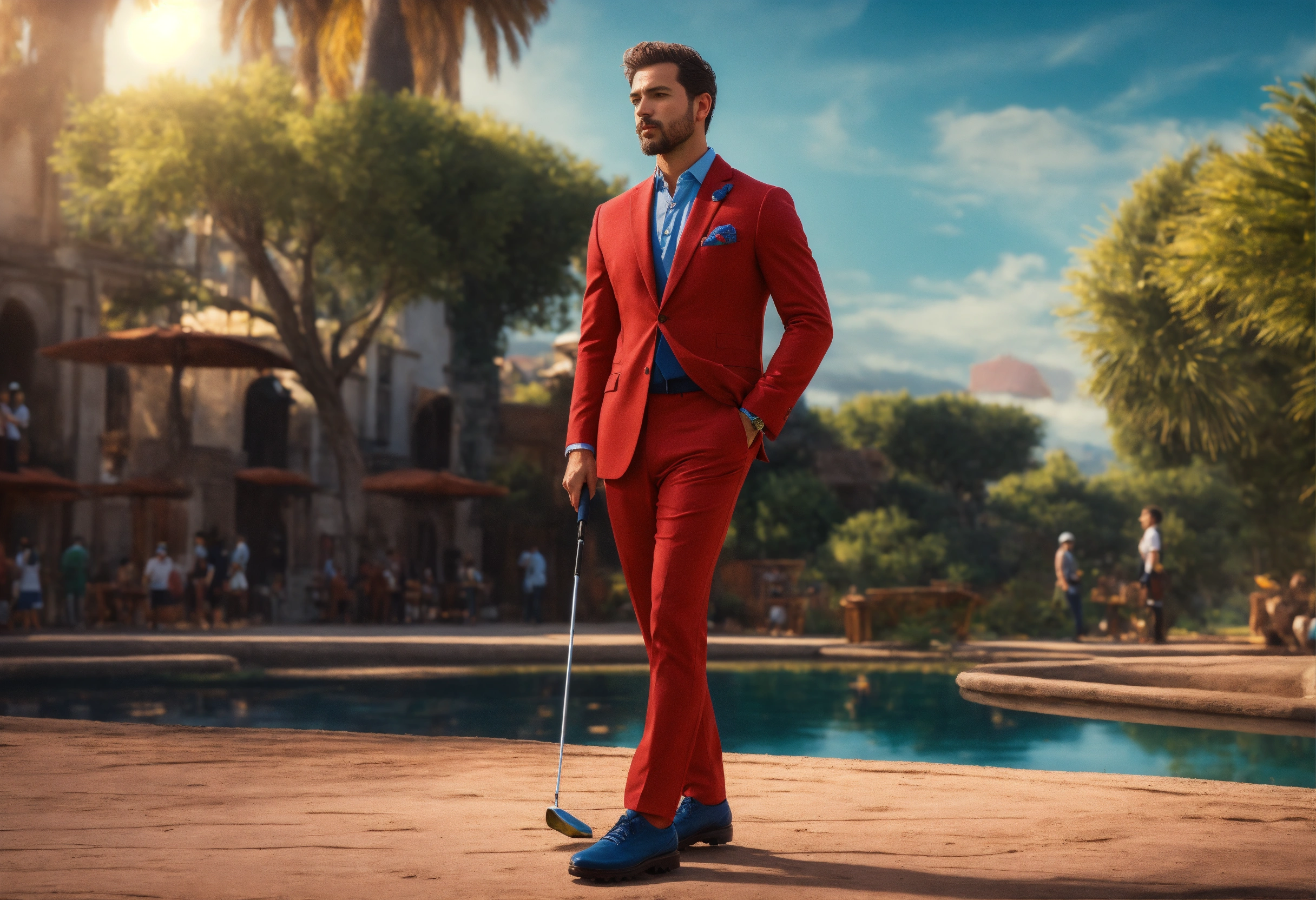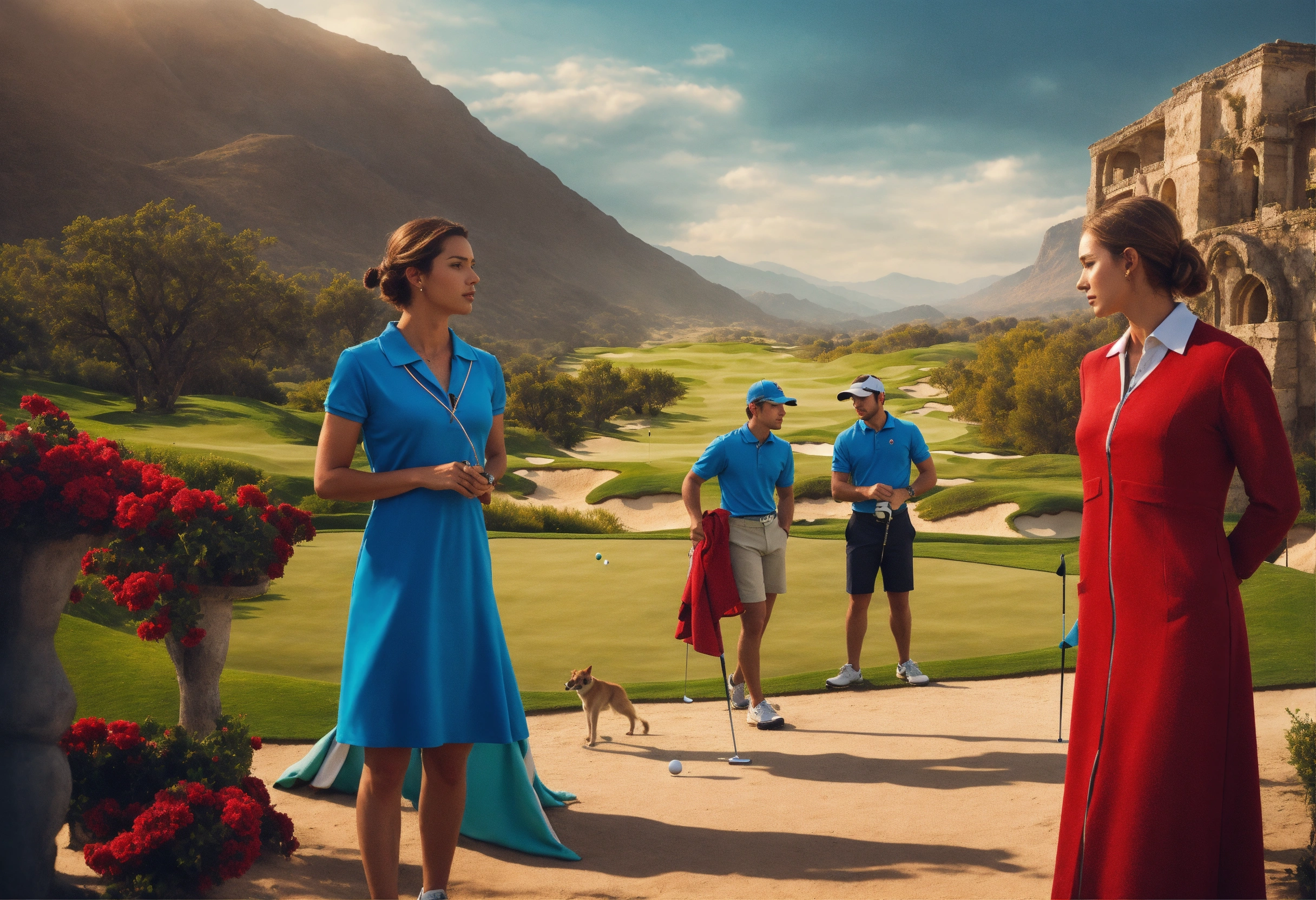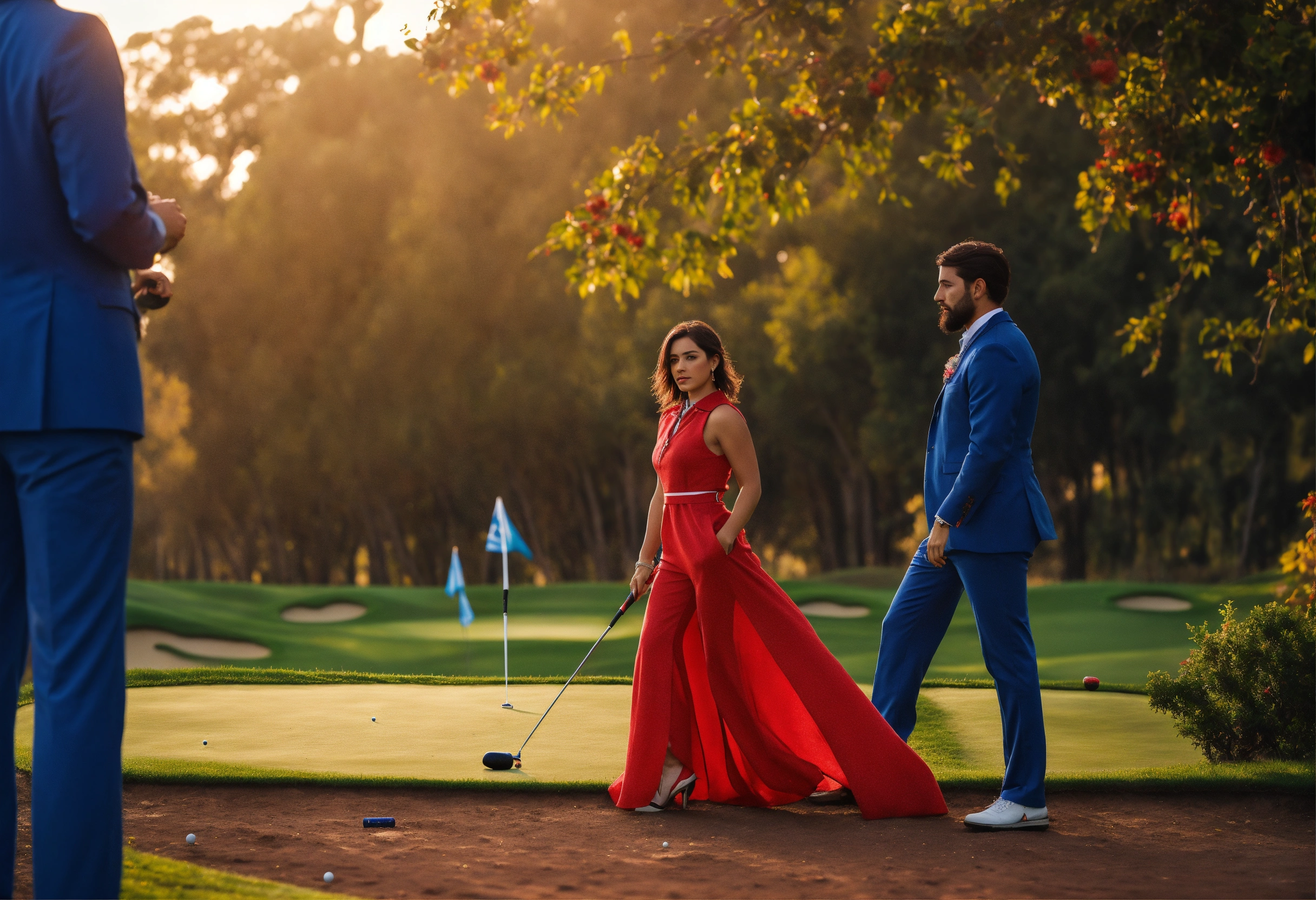 Imagen hiper realista. con fondo de campo de golf. 5 personajes. en el centro uno bien vestido de traje. dos a cada lado del personaje central vestidos con polo rojo y pantalón azul. en el personaje más ala izquierda tiene que haber un símbolo del €, en el siguiente personaje más a la izquierda un símnolo de un tenedor. en el personaje más a la derecha un símbolo de instagram y en el segundo personaje más la derecha un símbolo de aros olímpicos.
