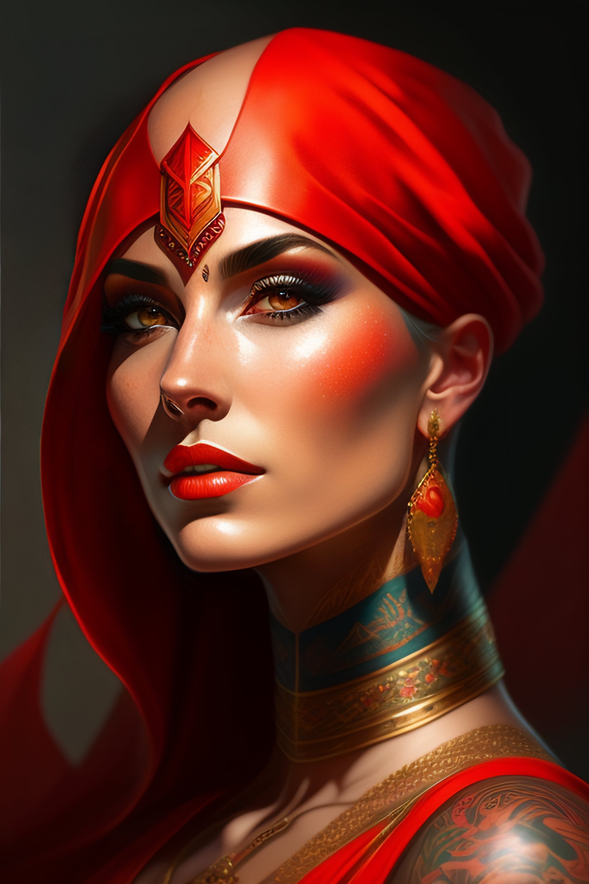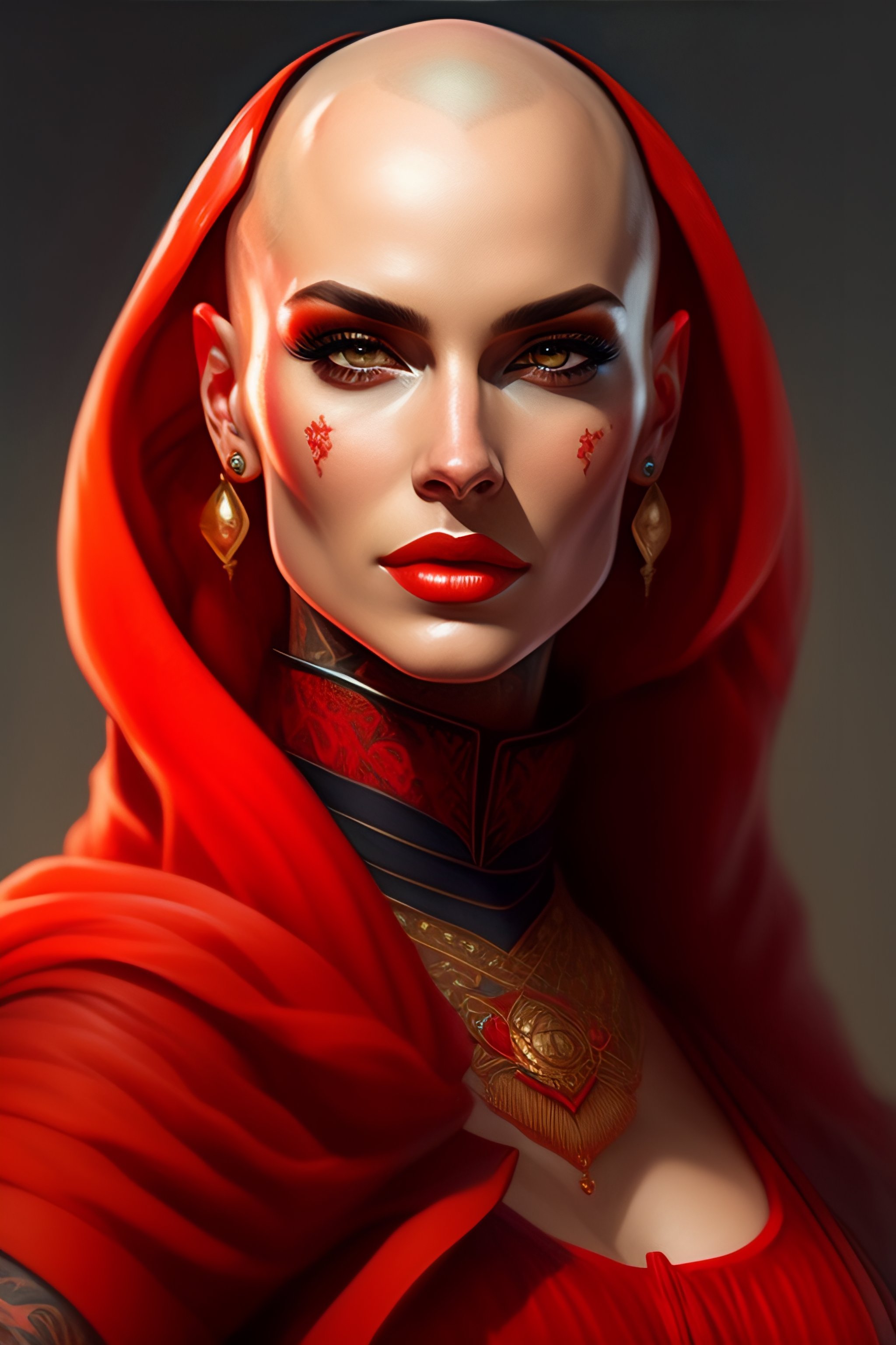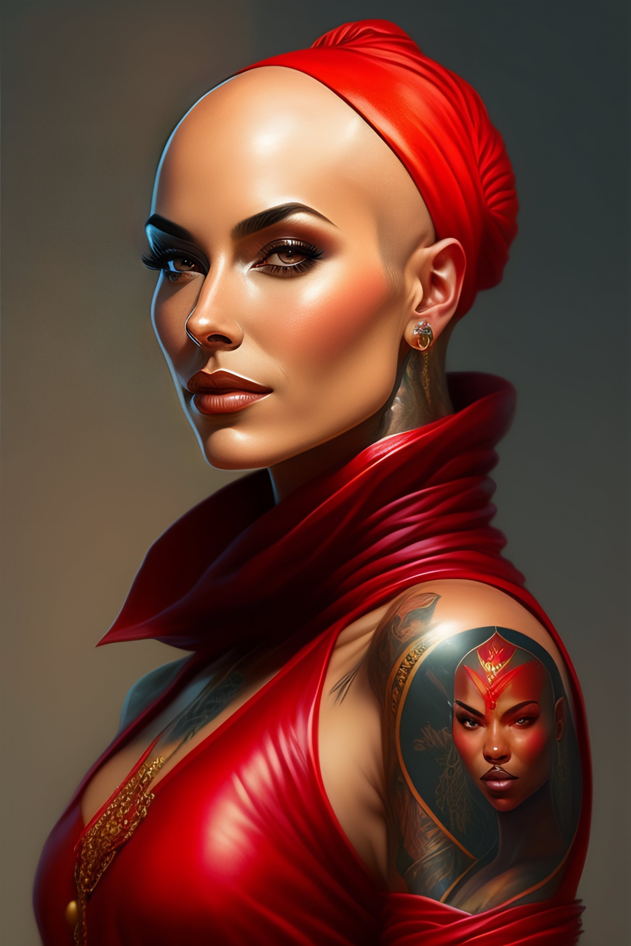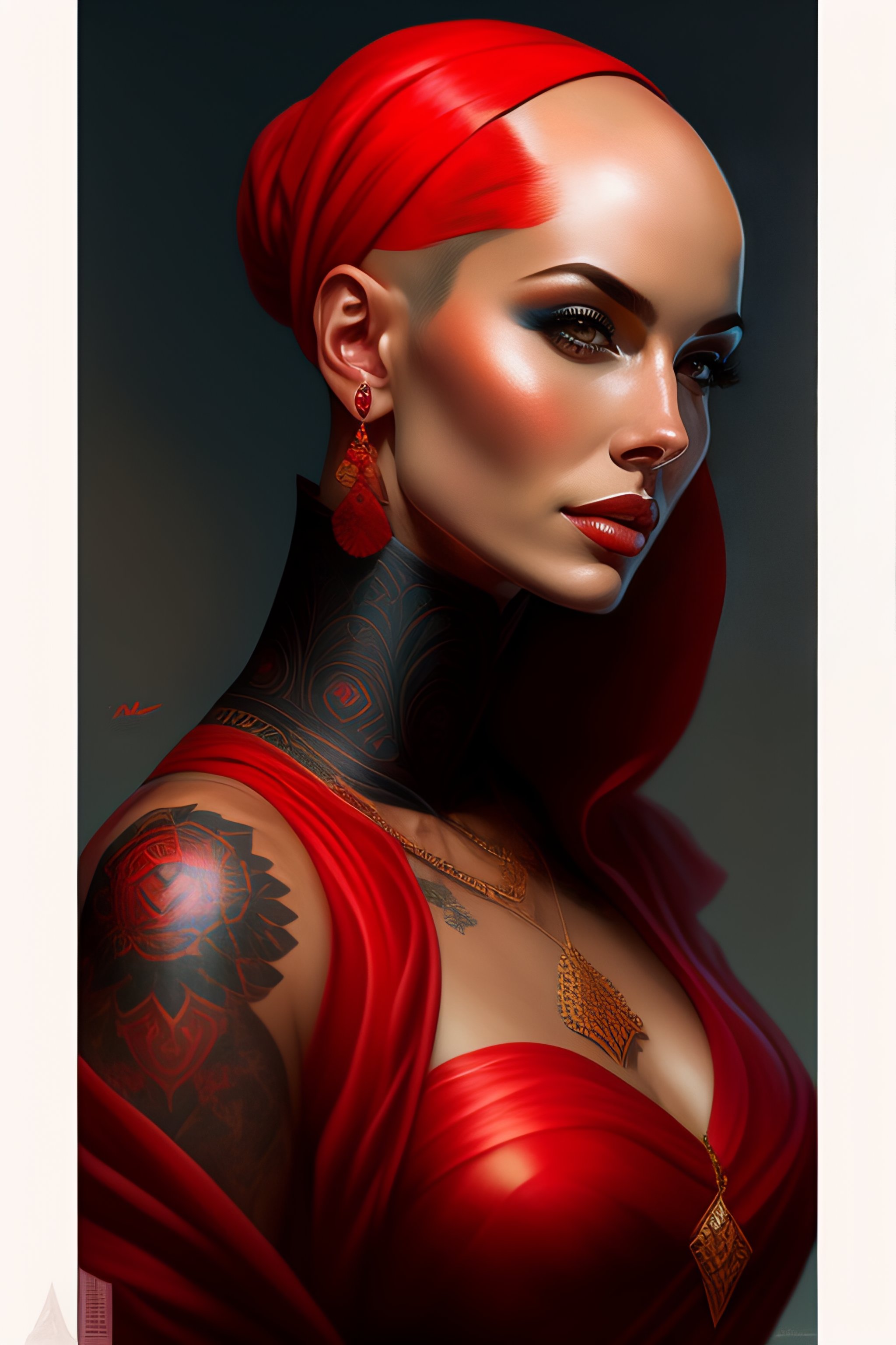 Woman with bald tattooed head, red clothing, wizard, mage, tattoos, highly detailed, digital painting, artstation, concept art, smooth, sharp focus, illustration, art by artgerm and greg rutkowski and alphonse mucha