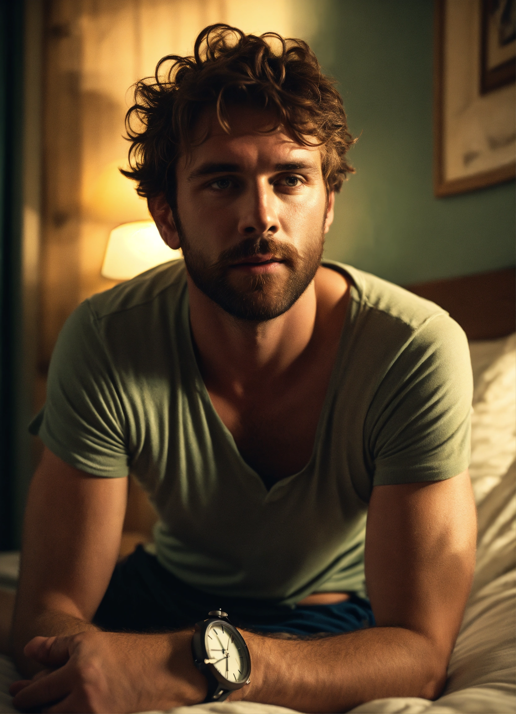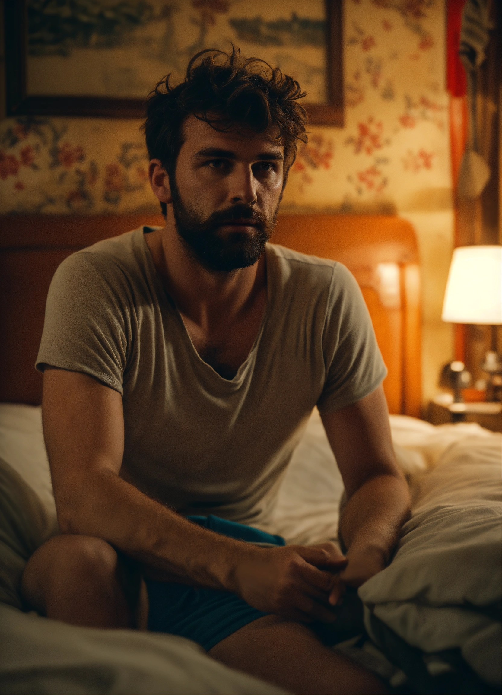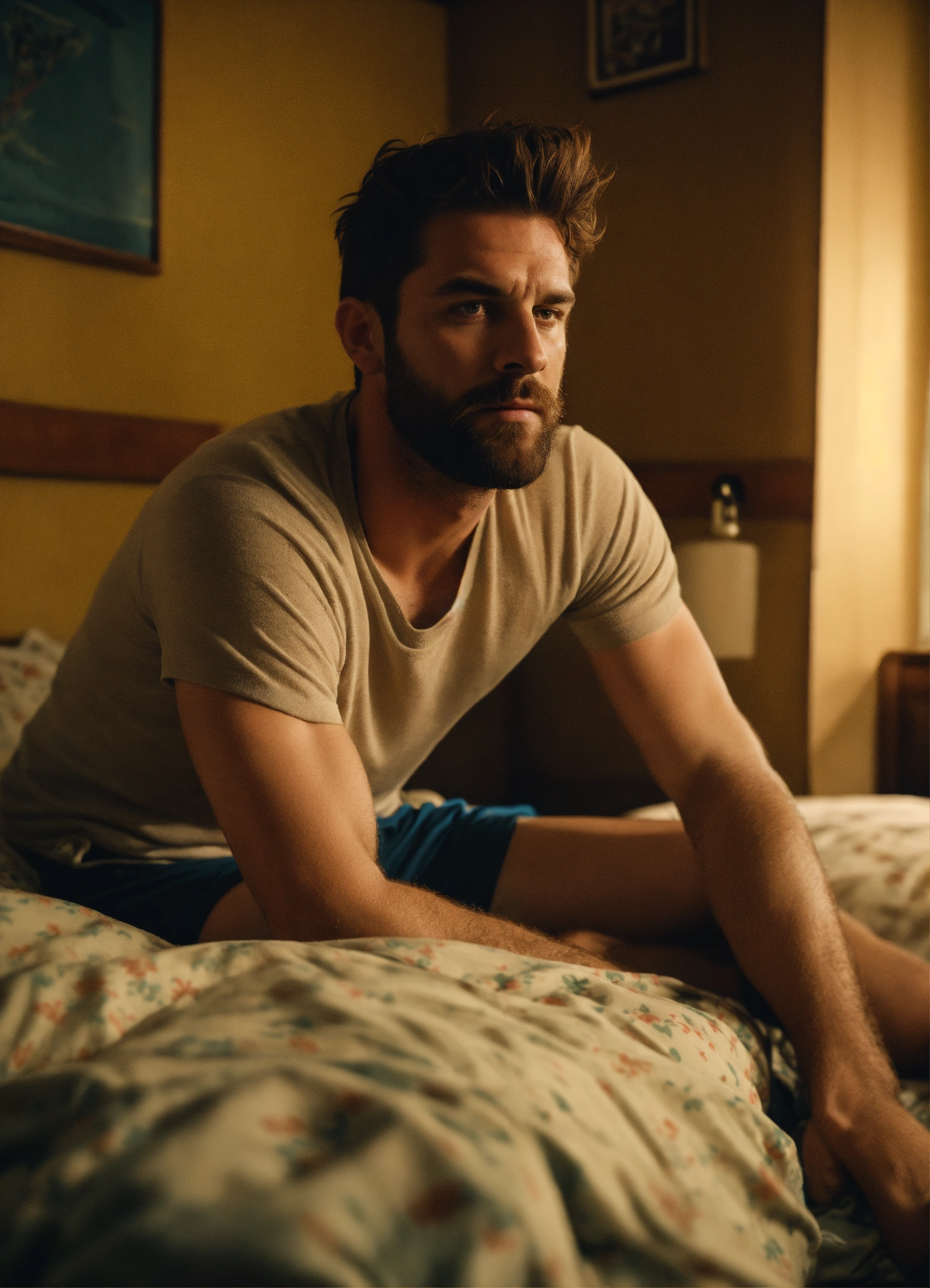 Scruffy british handsome man, wearing shorts and socks, cheap and old and dirty motel bedroom, resting in the bed, showing face, realistic, 4k, cinematic, ultra detailed, forties, no watch