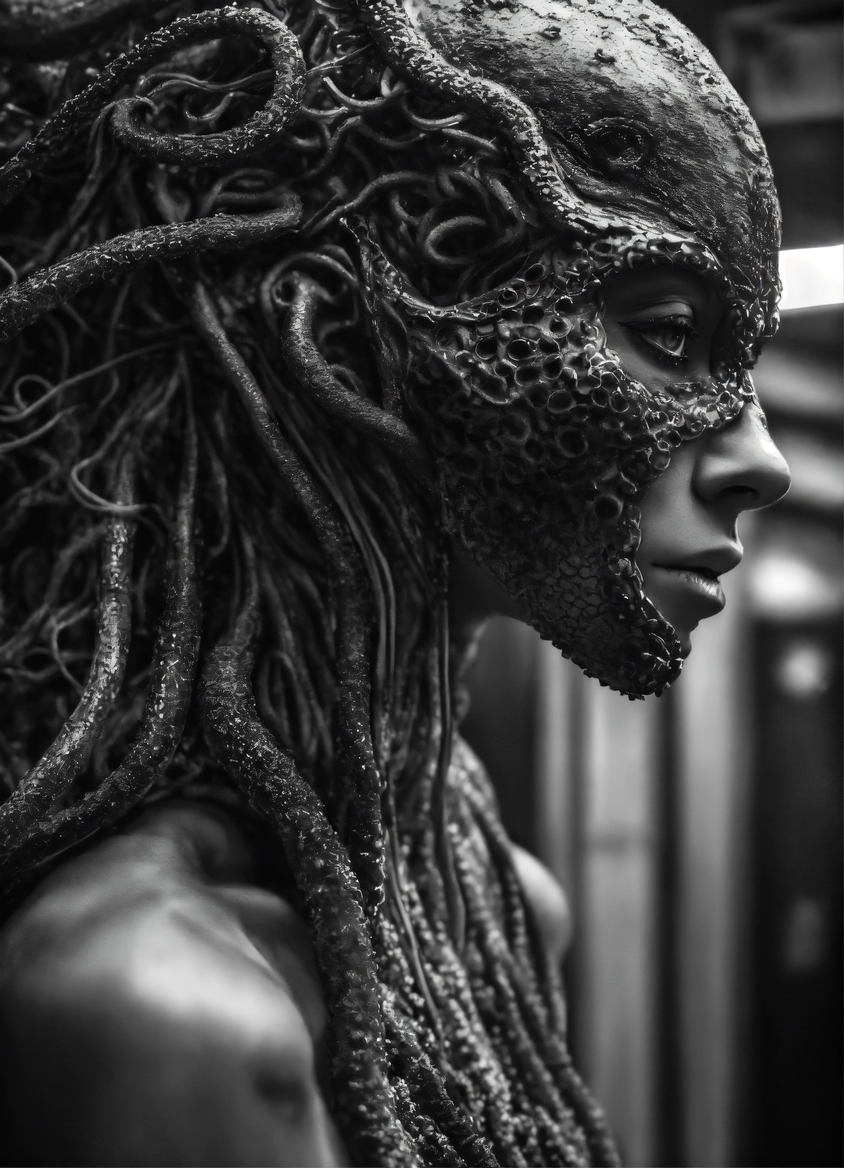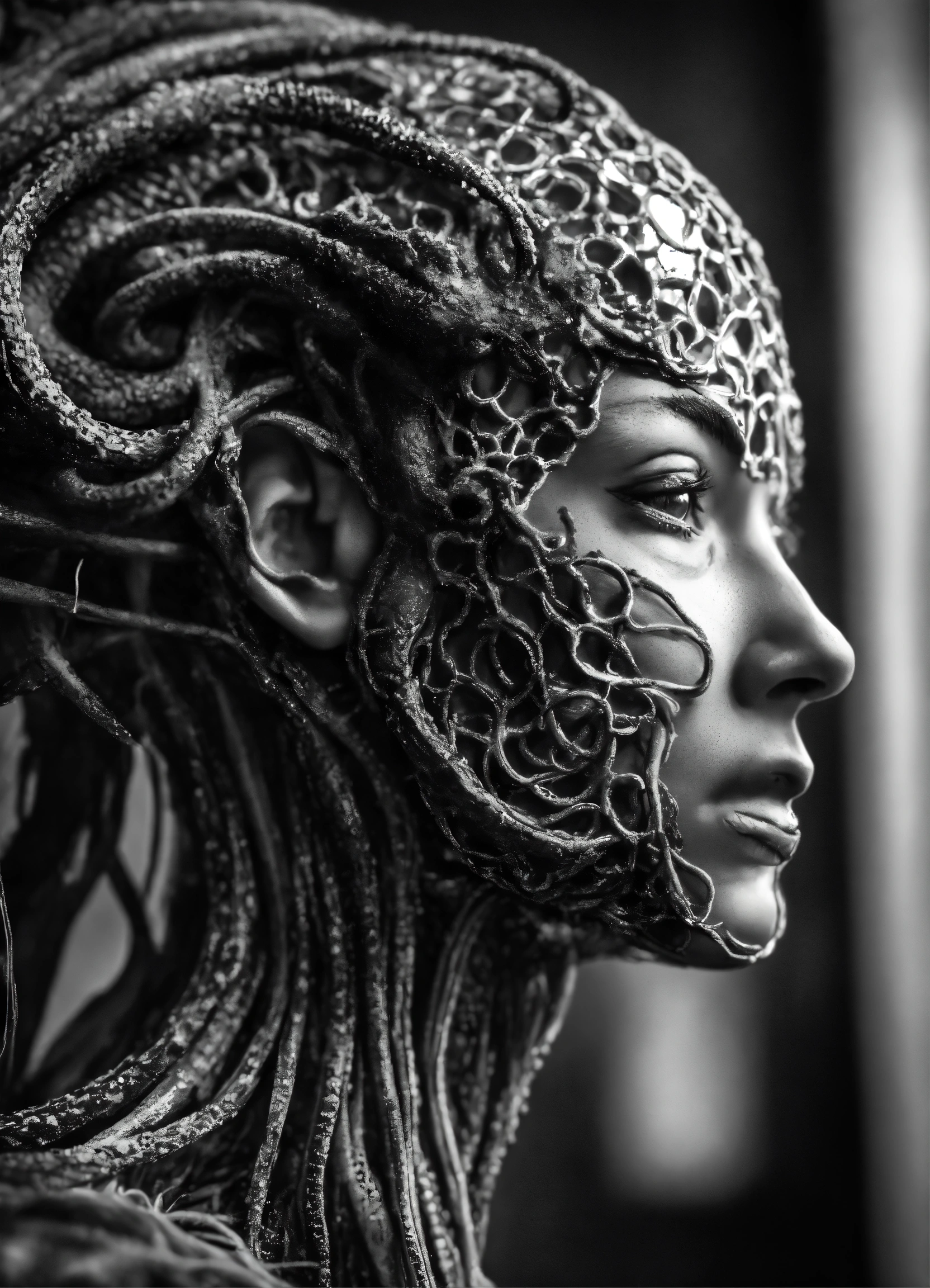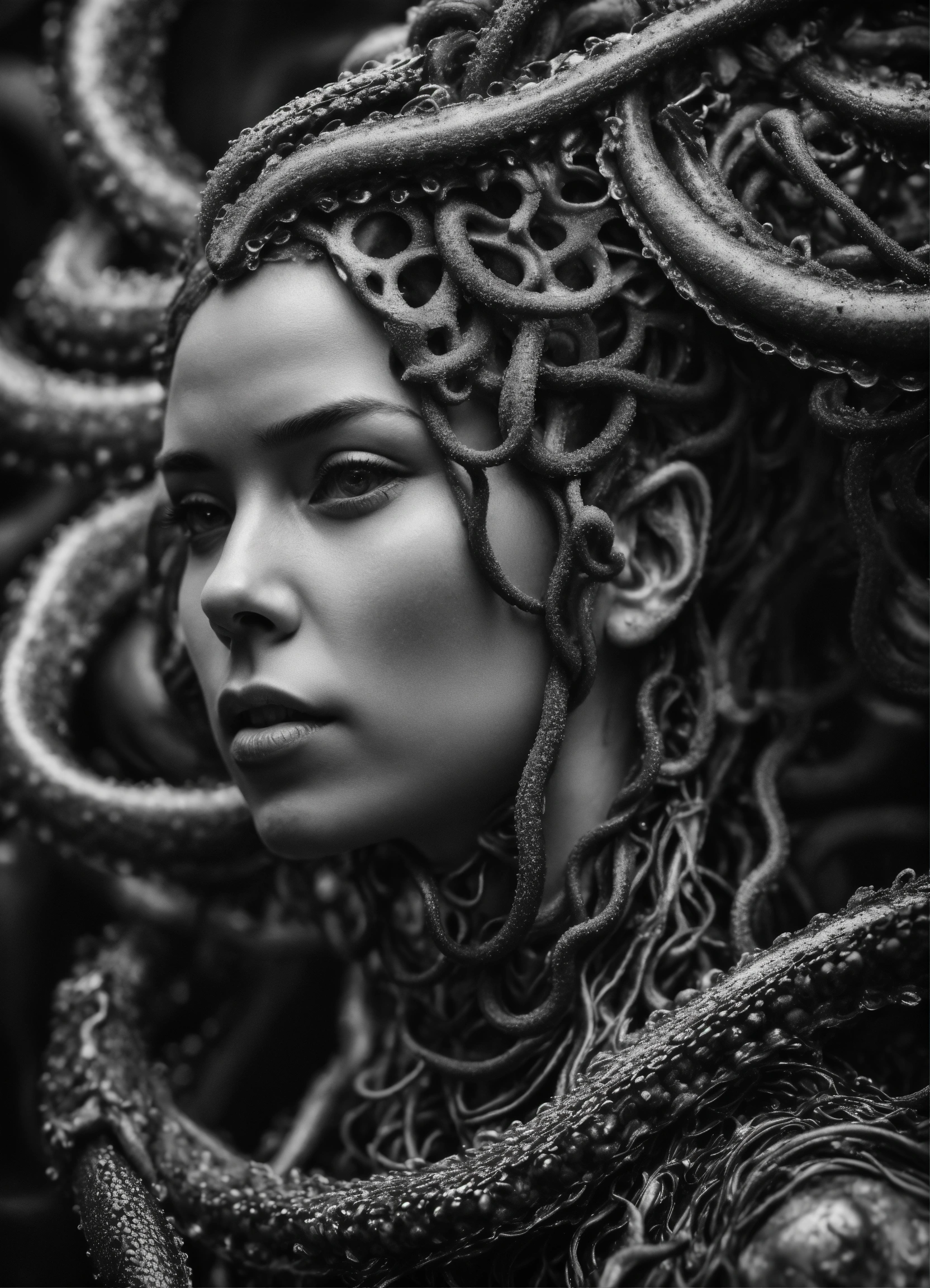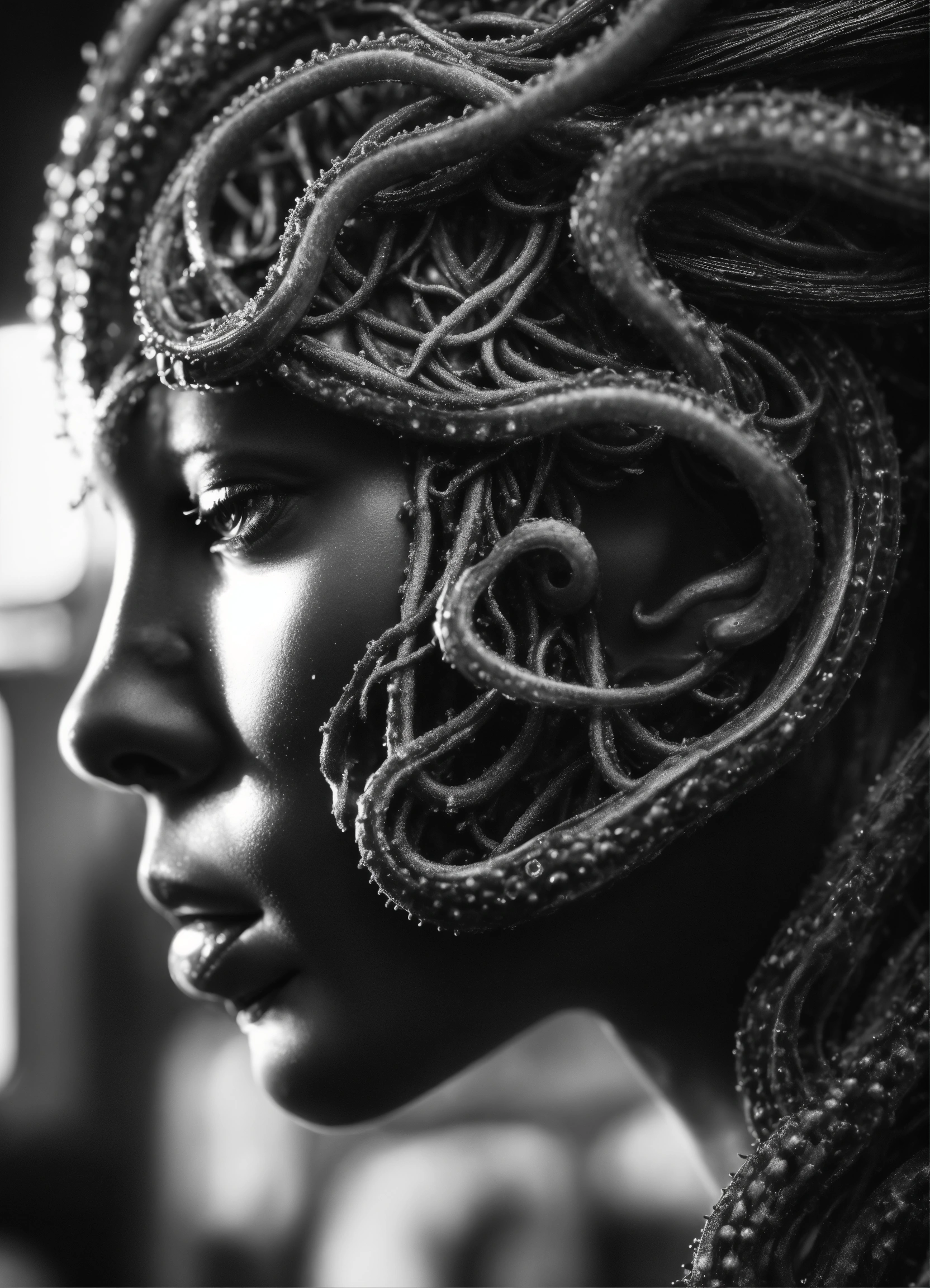 Intricate photorealism, black and white photograph taken on a sony a7riii sideview facial structure of a strange alien lifeform entangled in tentacles, introspective, fluid, and intricate. close-up portrait, portrait photography, photo, poster