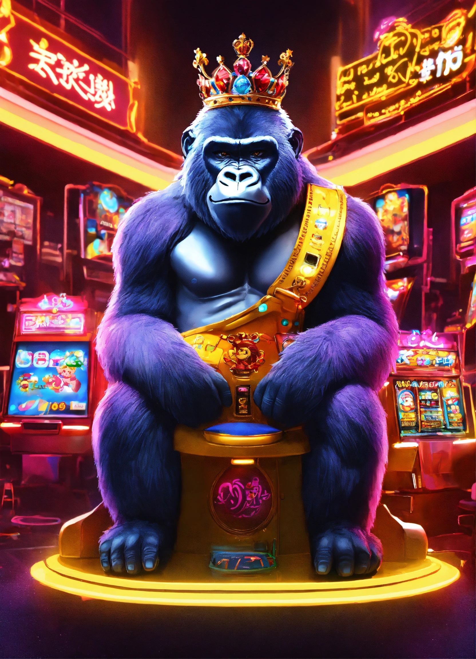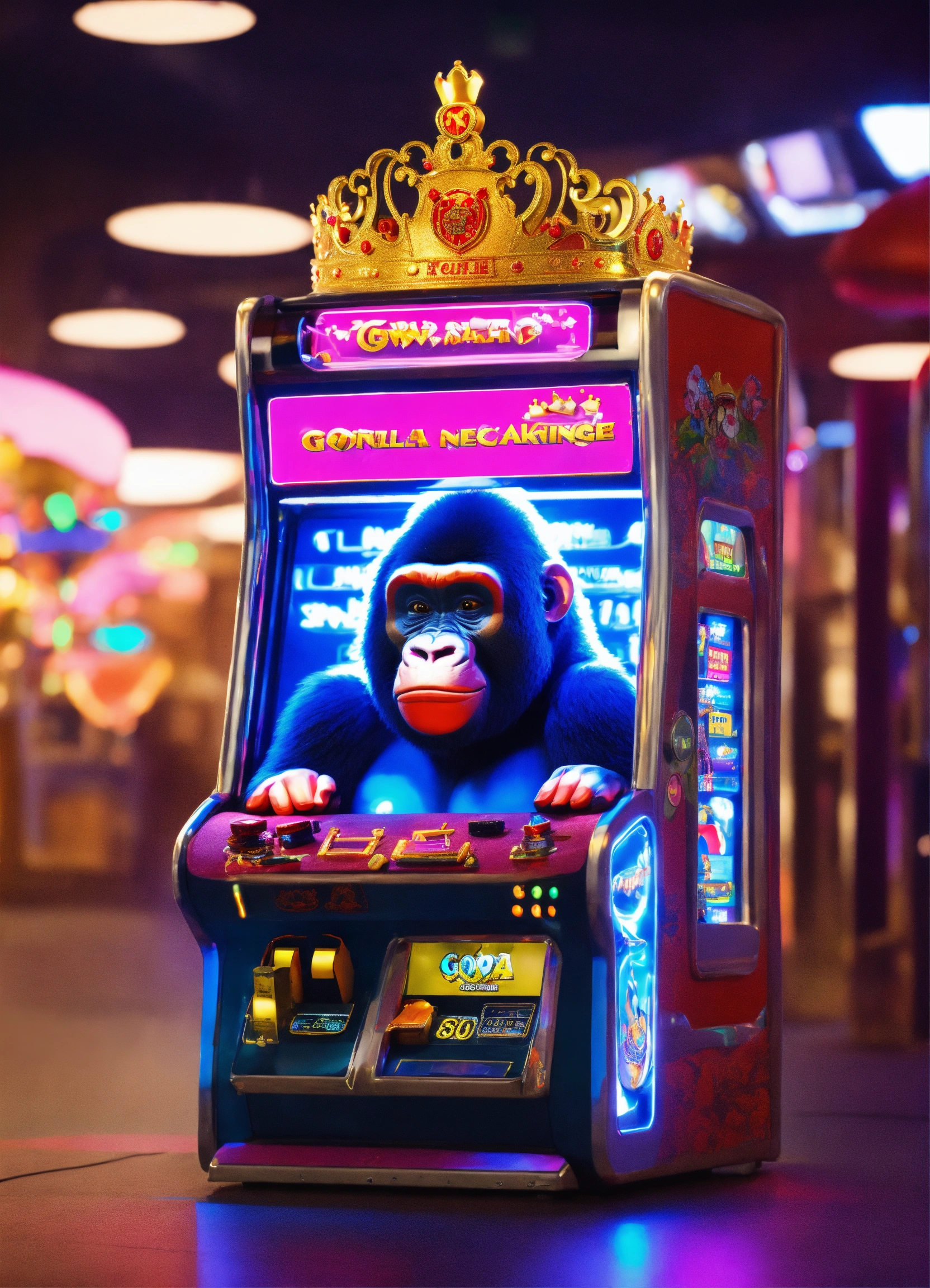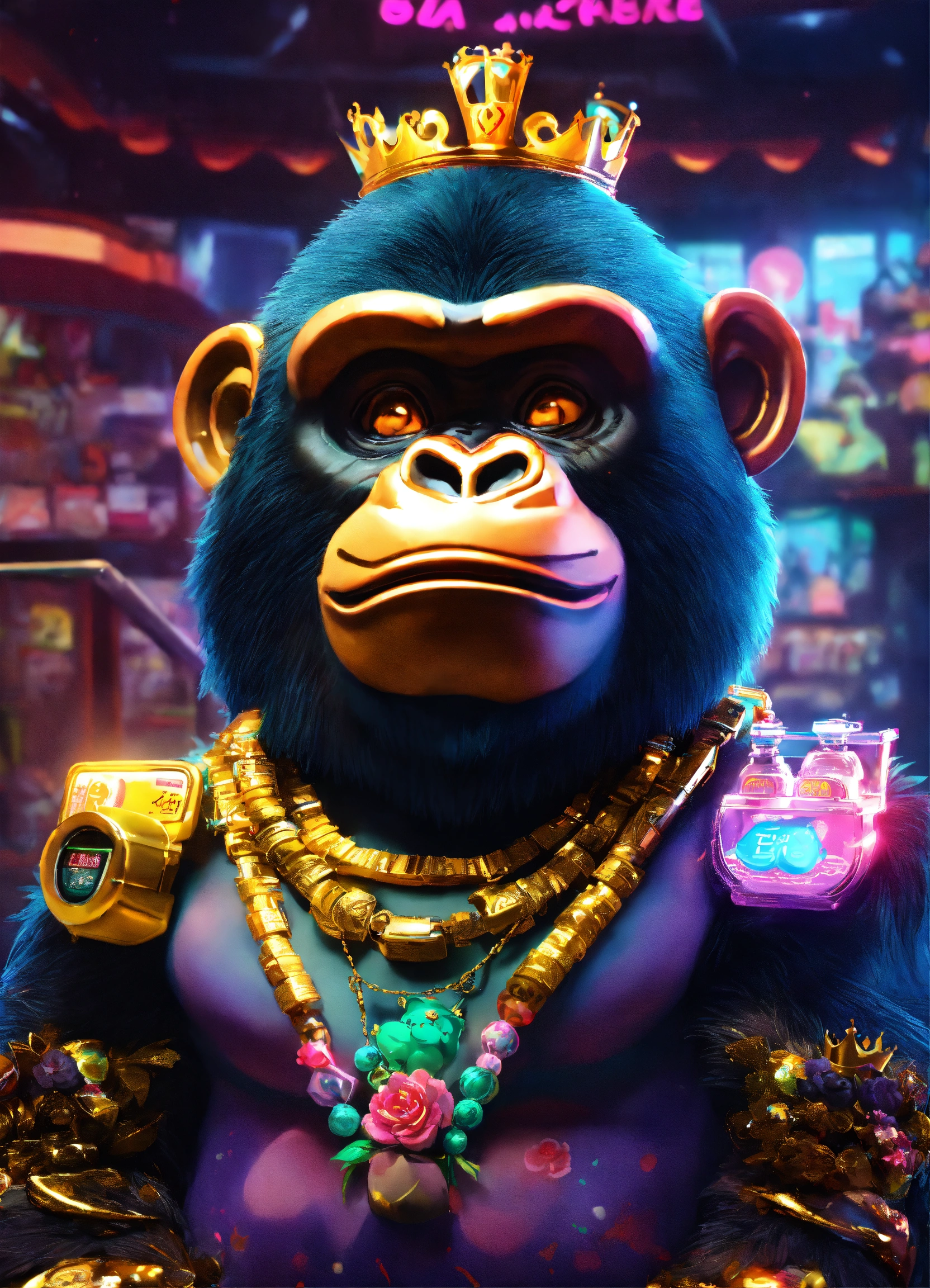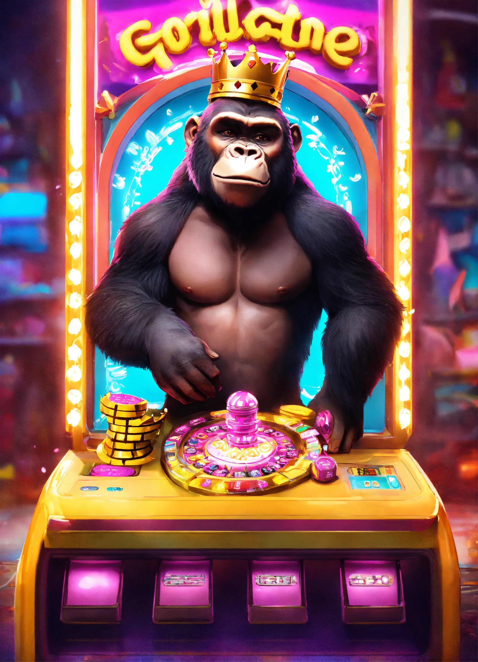 Cutie q version characters gorilla necklane with crown slotmachine location,8k and neonlight