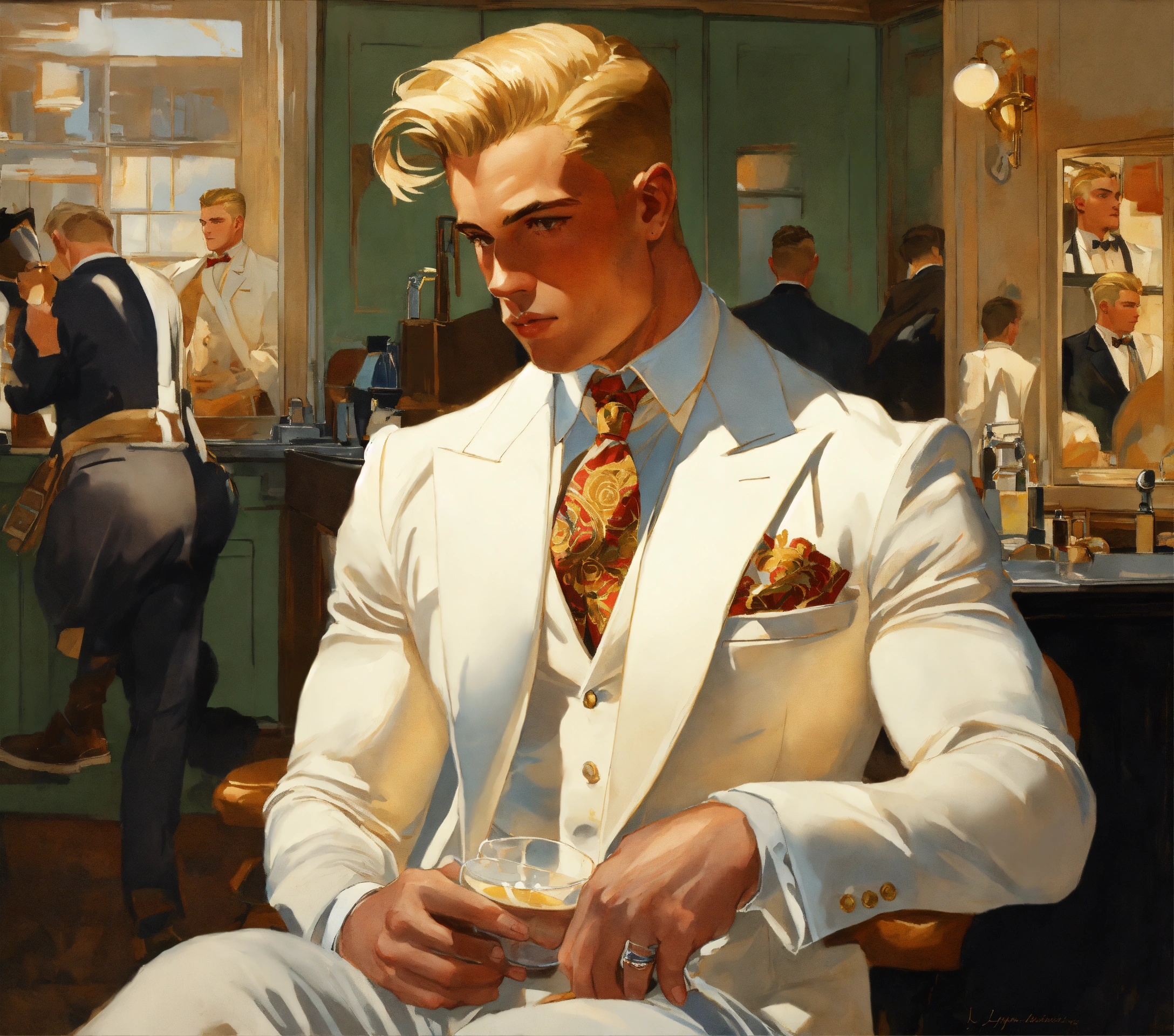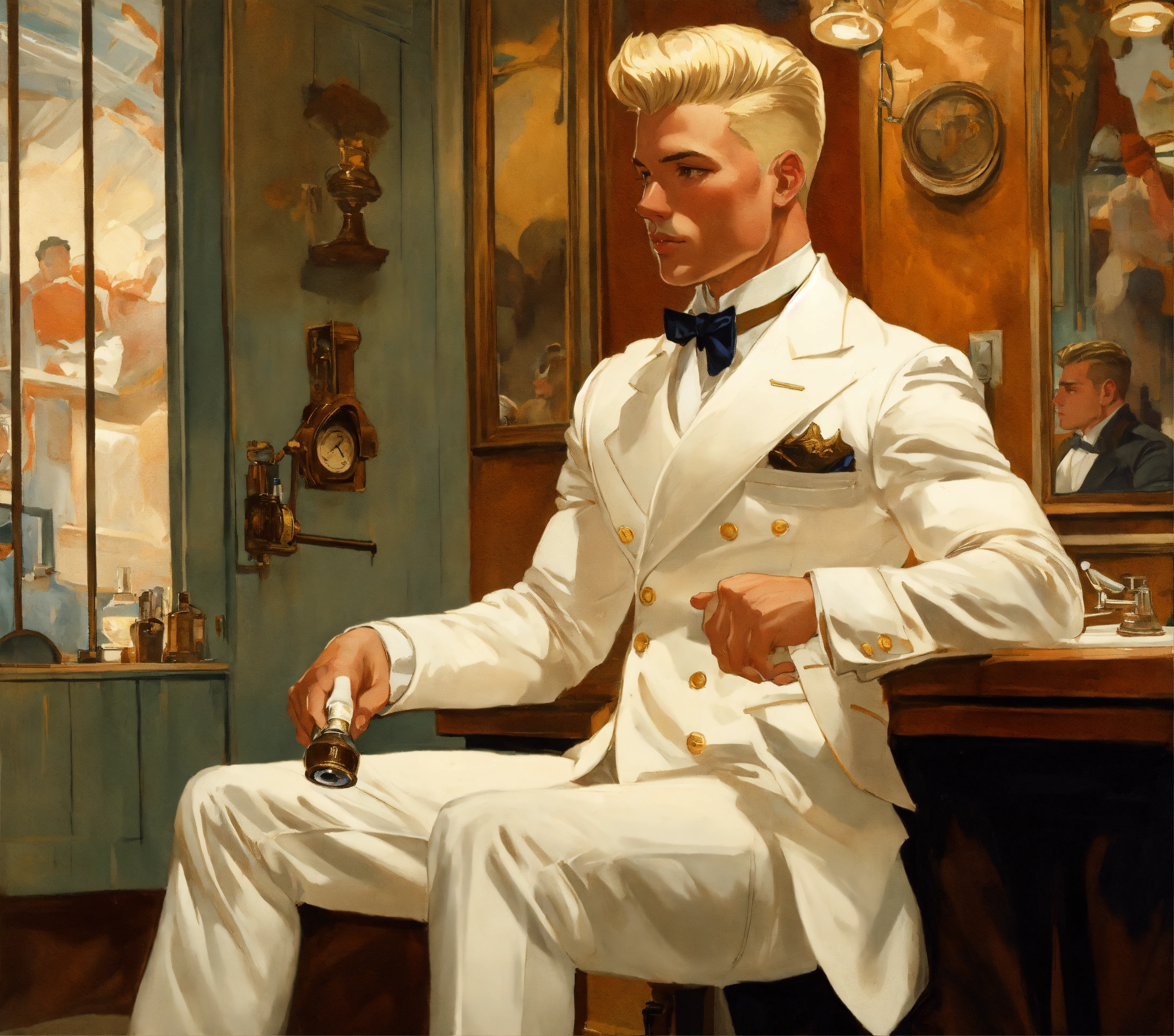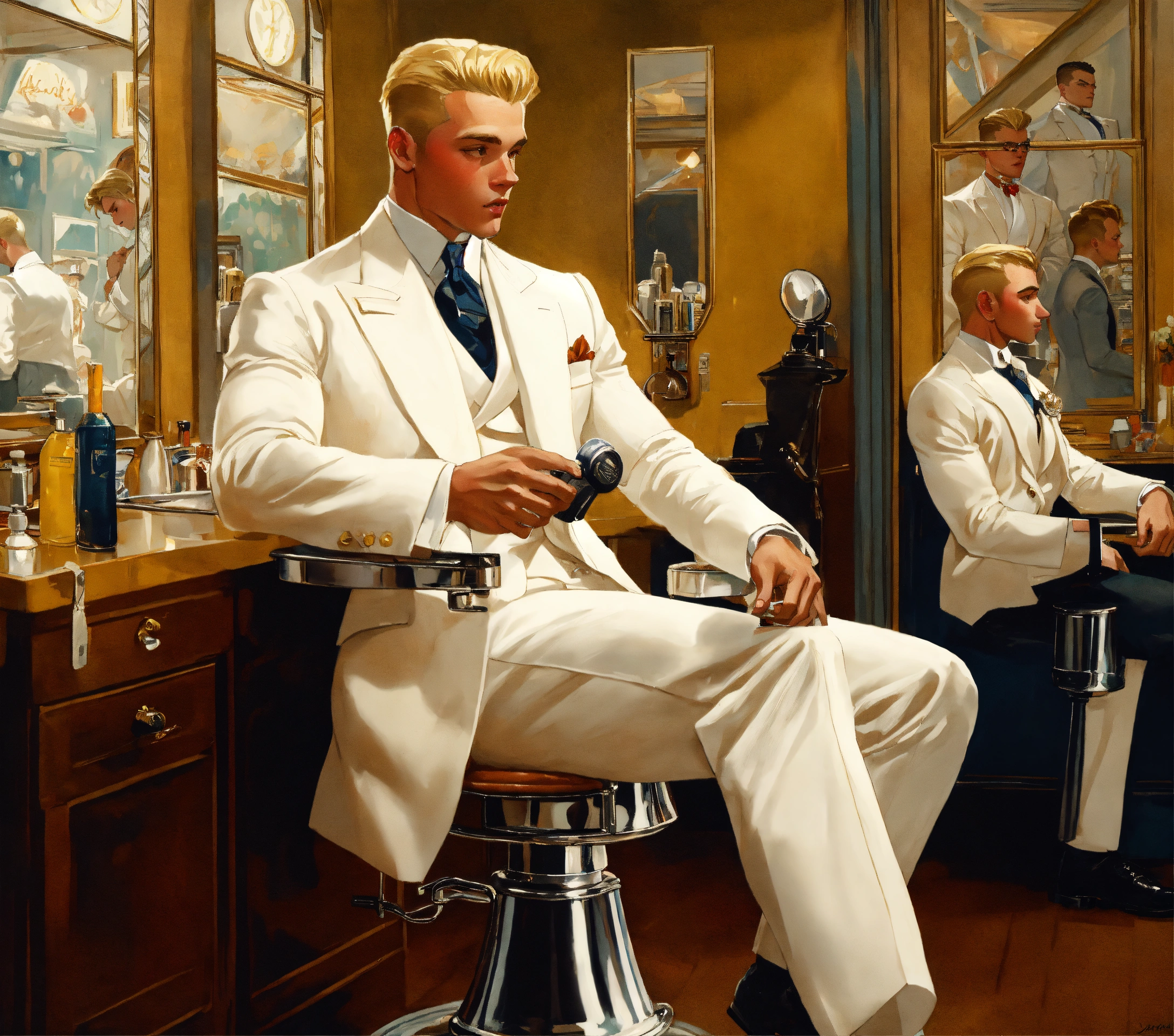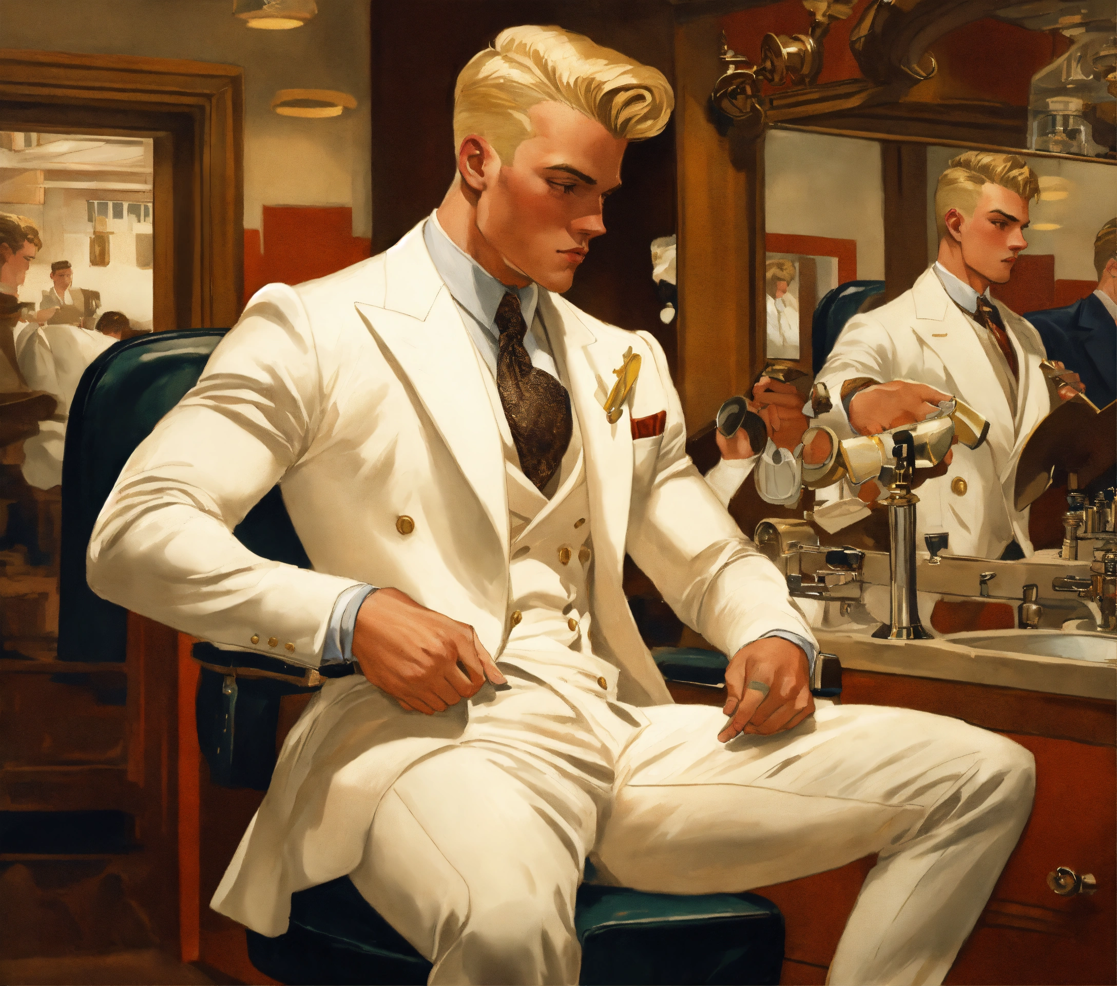 A blonde muscled sportsman in white double breasted suit shaved at the barber's
