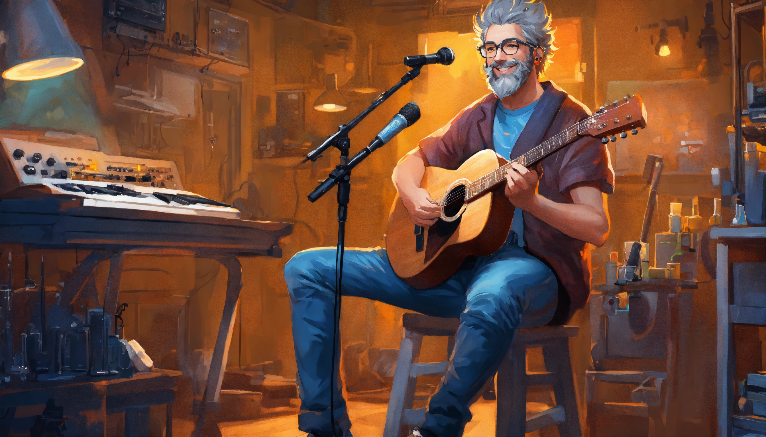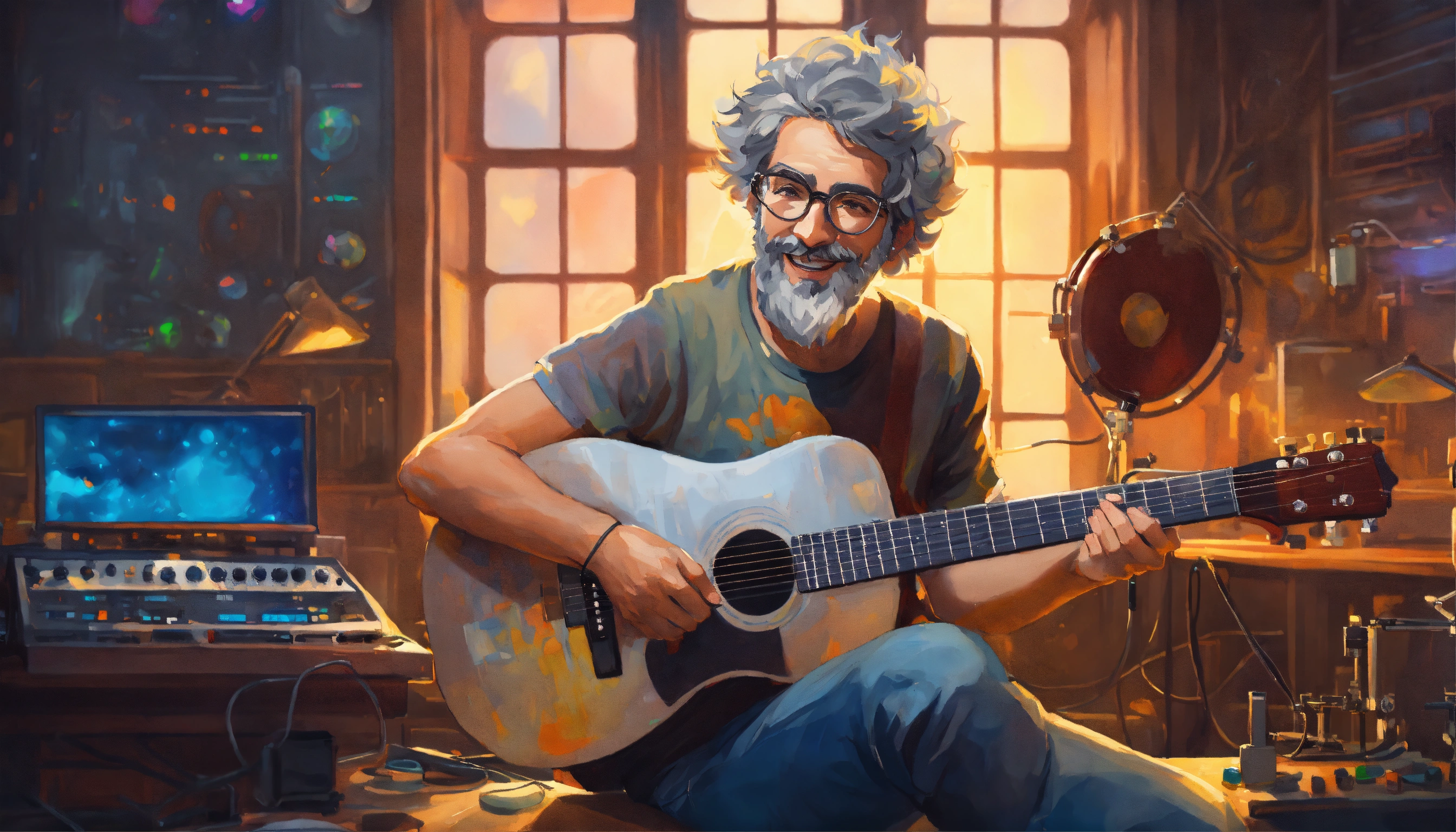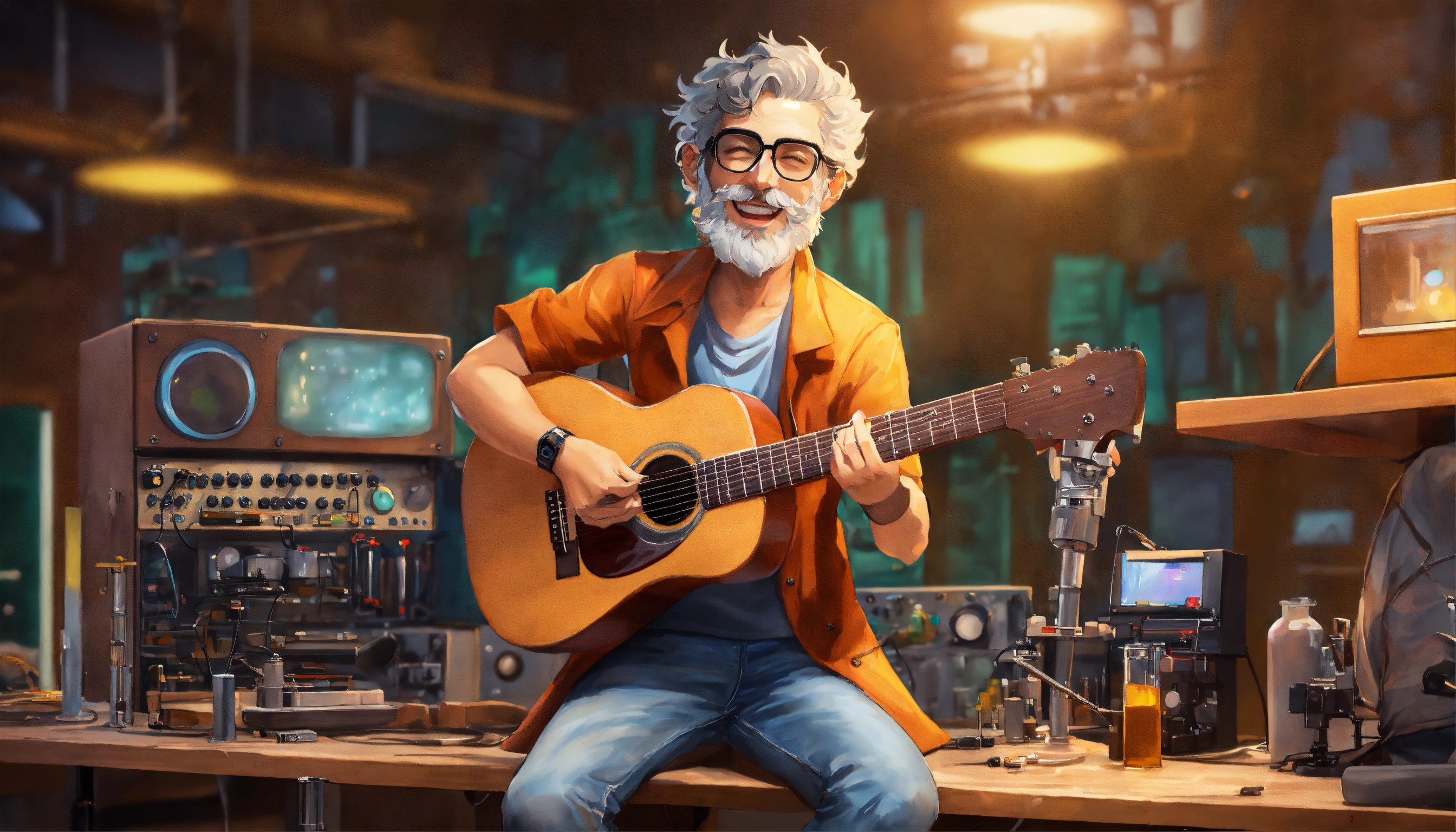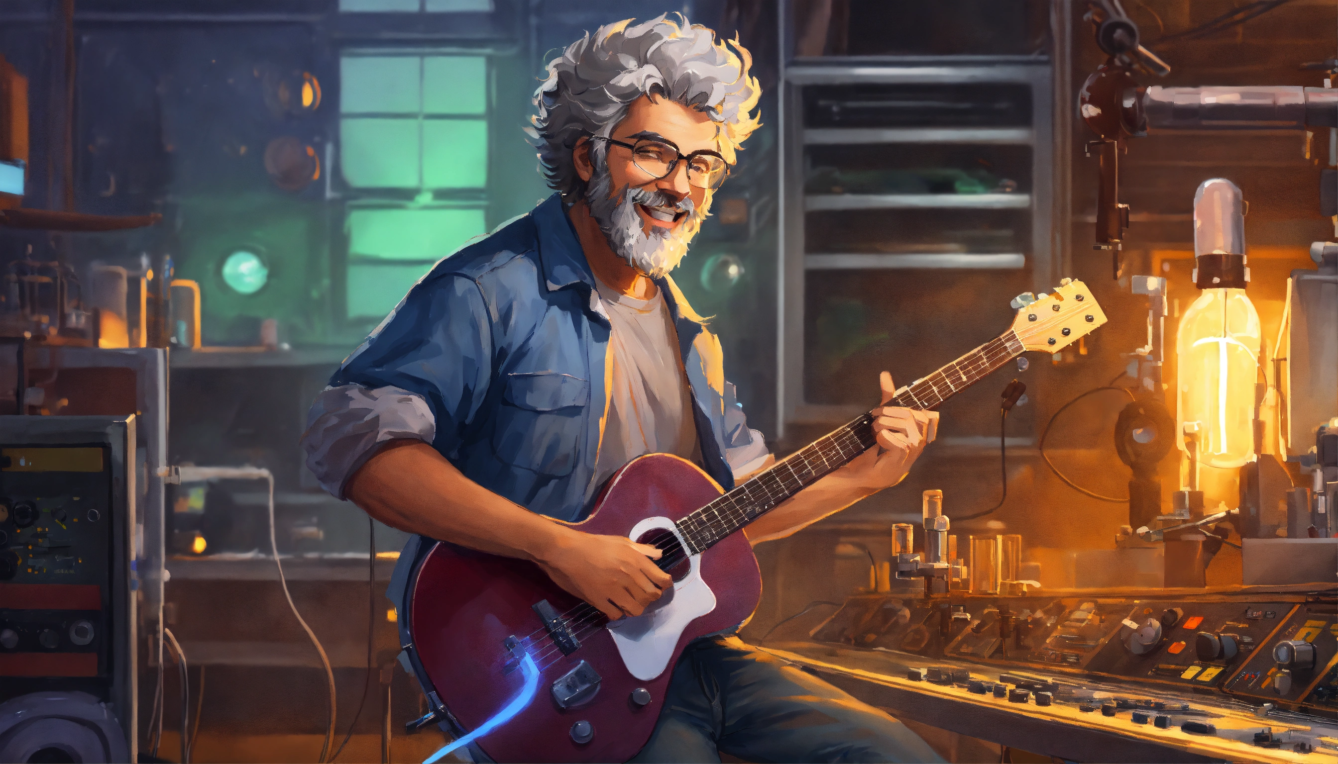 Caucasian mad scientist with gray short hair and beard, holding guitar, wearing concert t-shirt and jeans, in a laboratory with music equipment, working and smiling like a madman oil painting