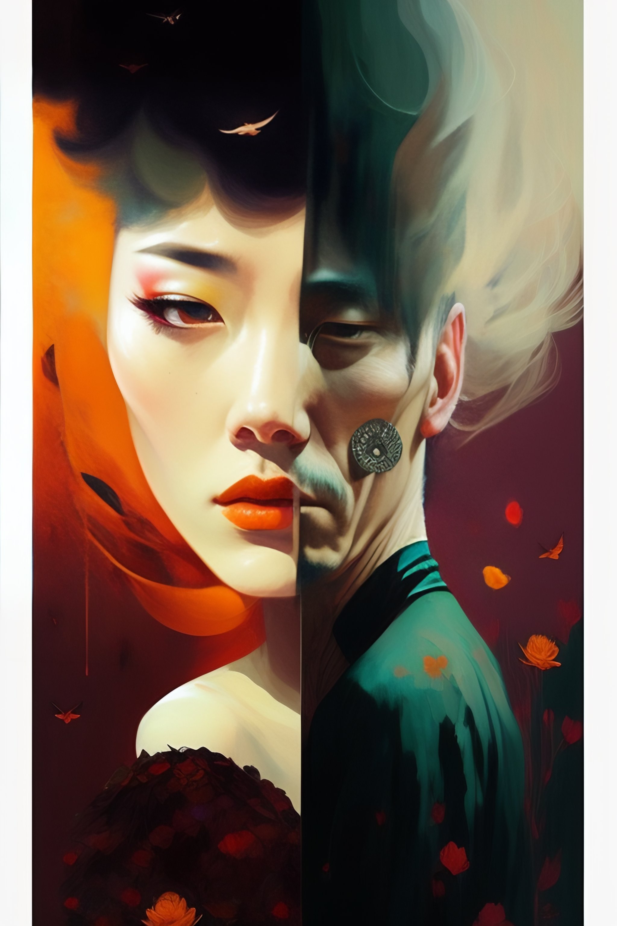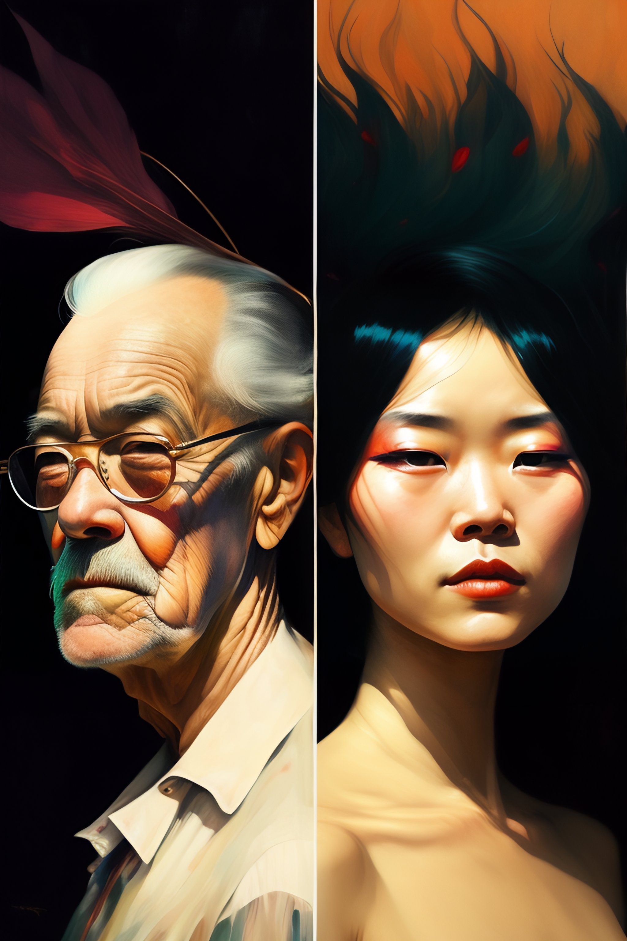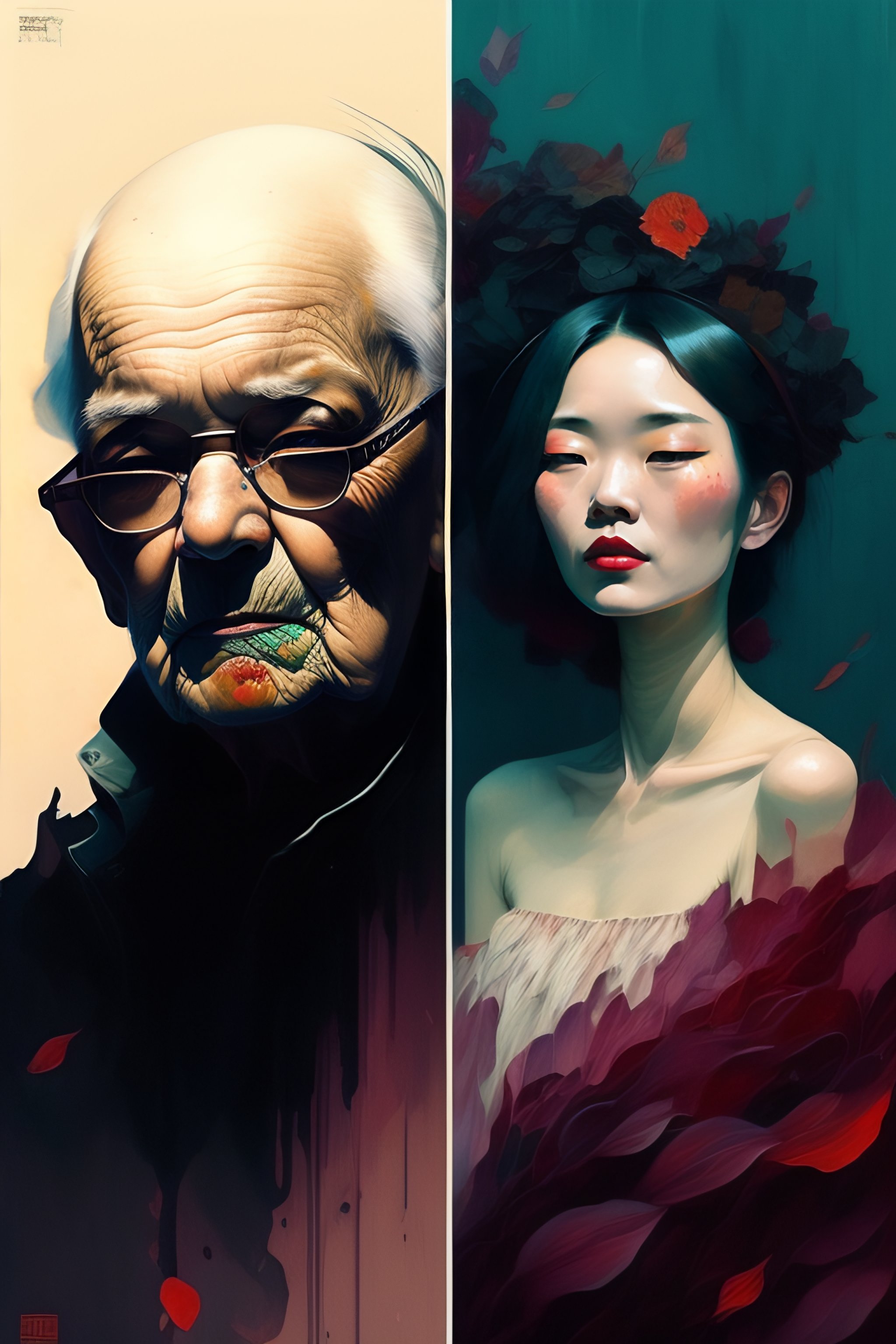 Old men and woman, there is ugliness in beauty, but there is also beauty in ugliness. in the style of adrian ghenie, esao andrews, jenny saville, edward hopper, surrealism, dark art by james jean, takato yamamoto, inkpunk minimalism
