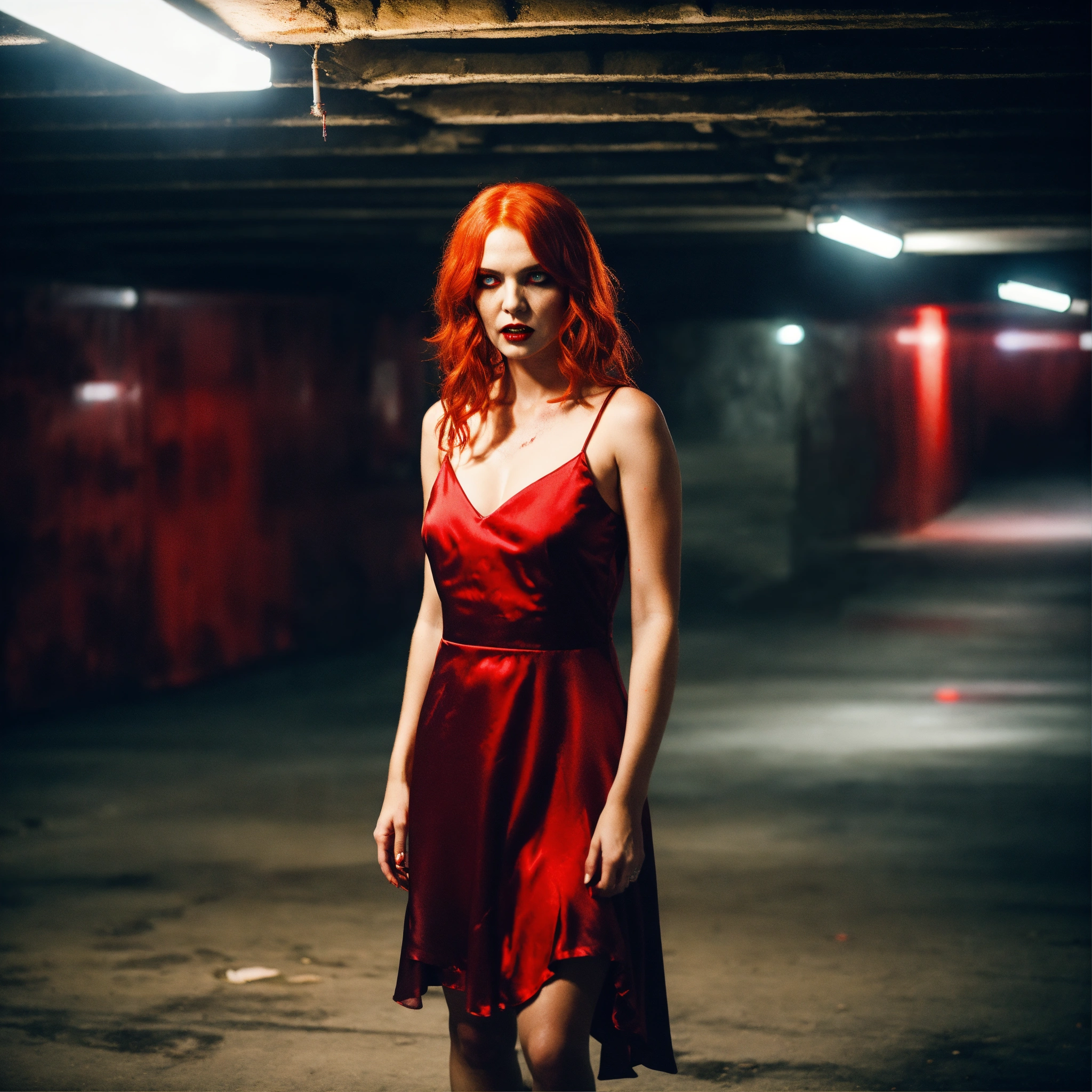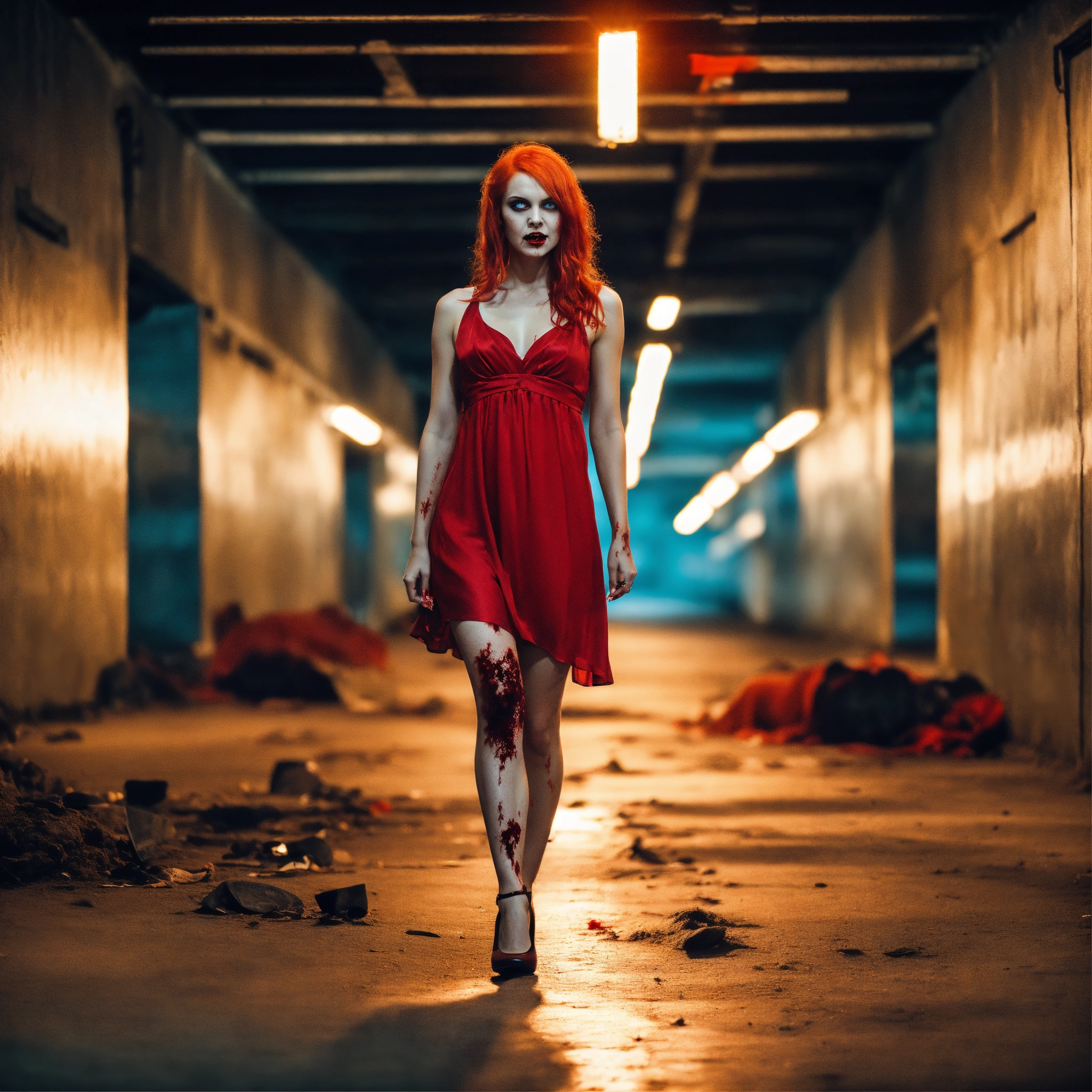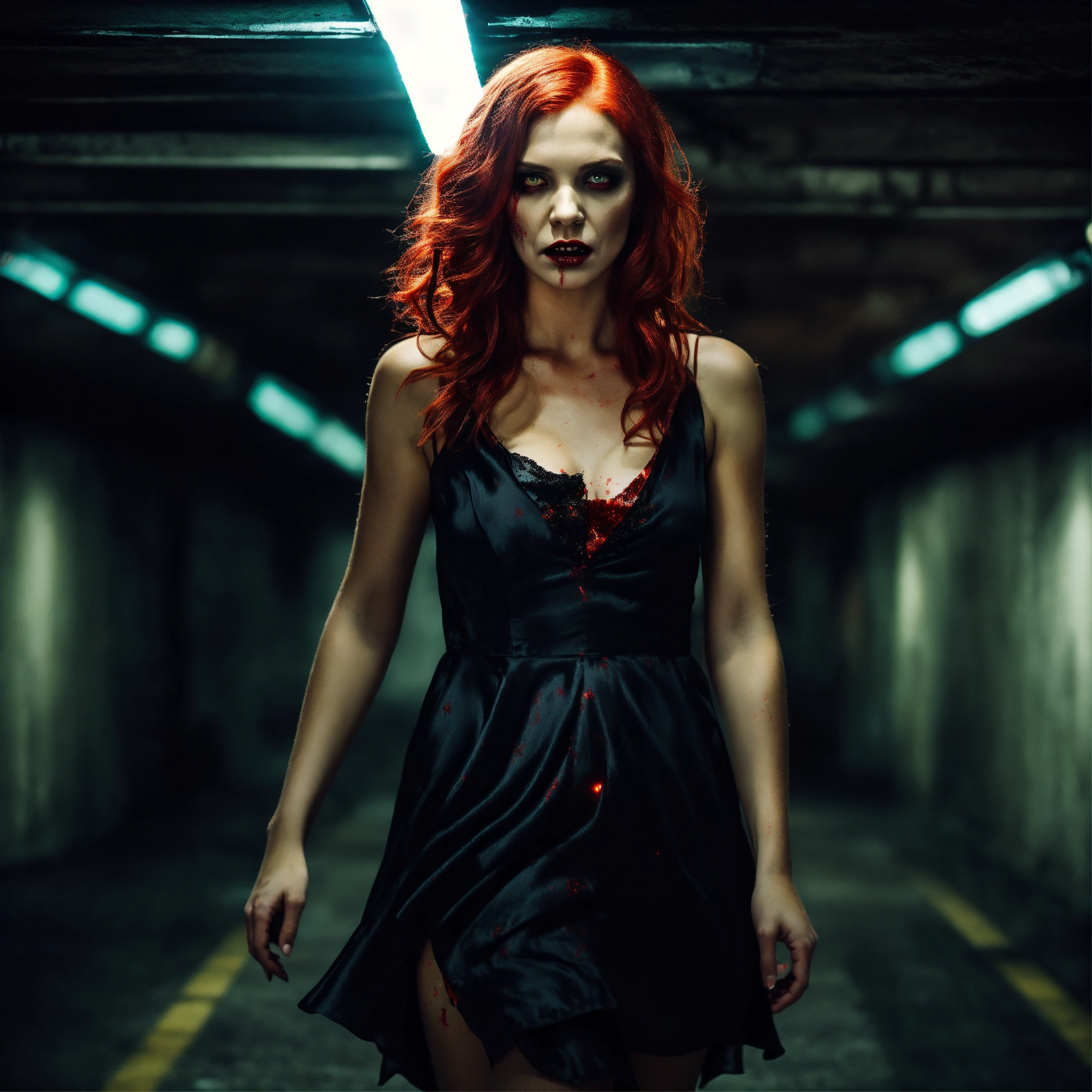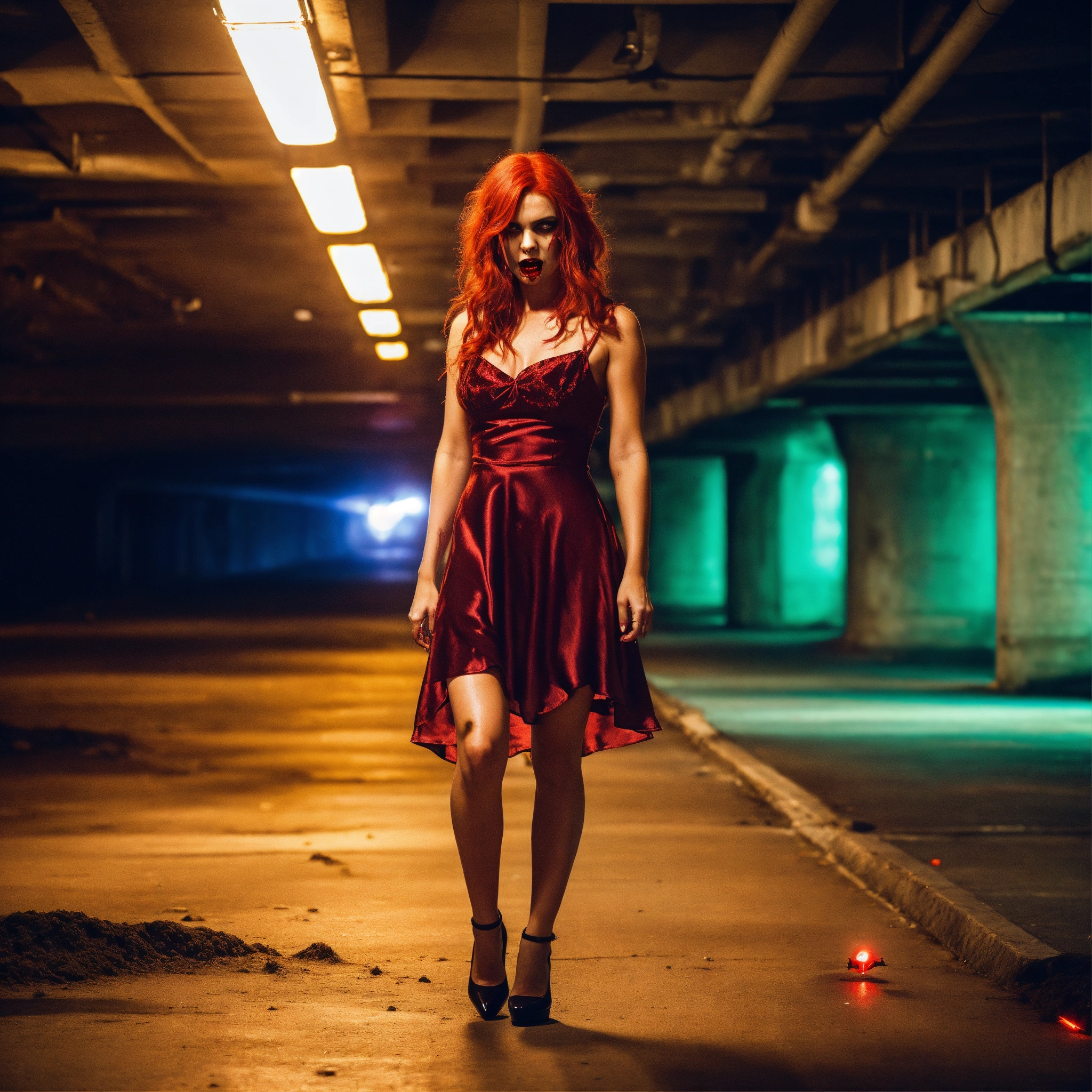 A beautiful red haired vampire in a short silk dress and wearing high heels leading zombie-vampires with red glowing eyes feeding on bodies in an underground parking garage, surrealism, focused, walking dead, asymmetric