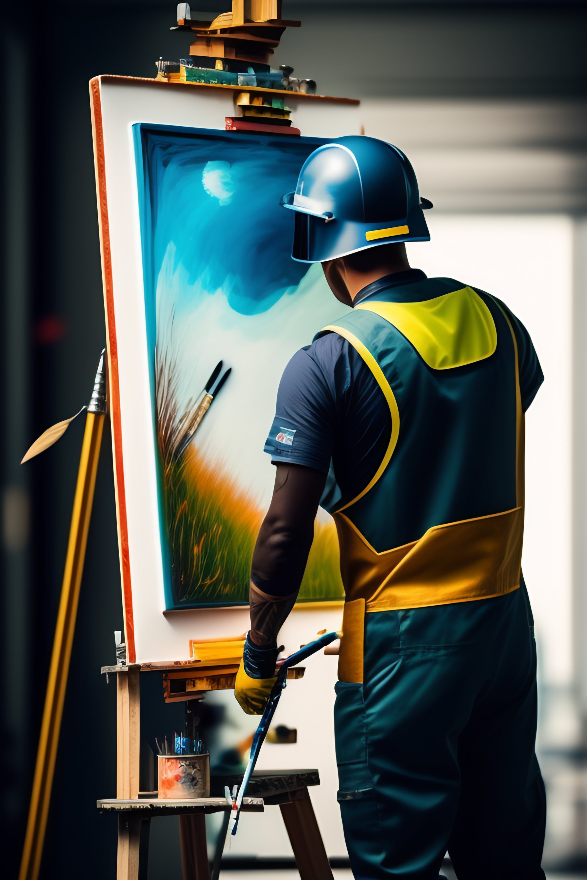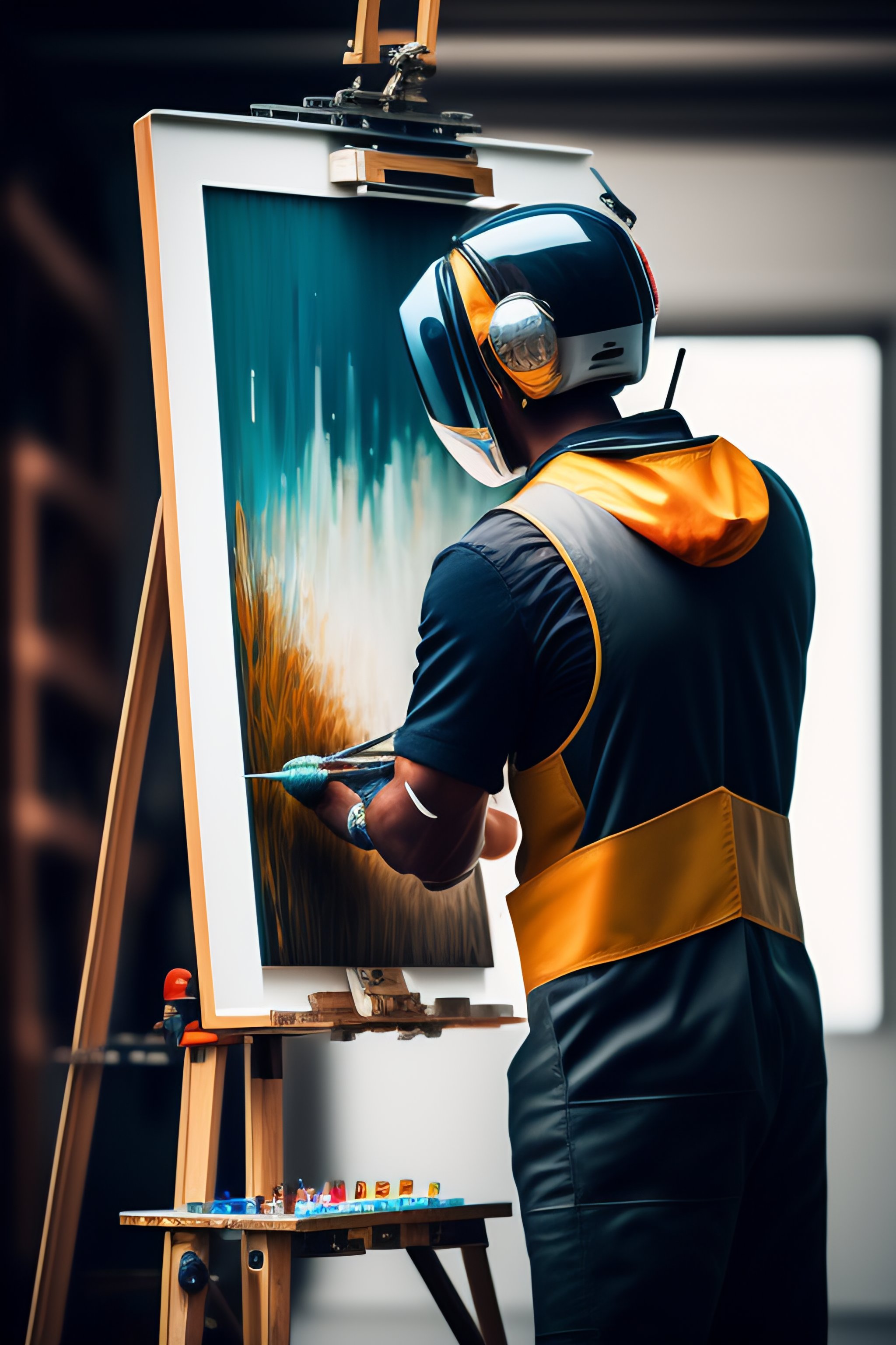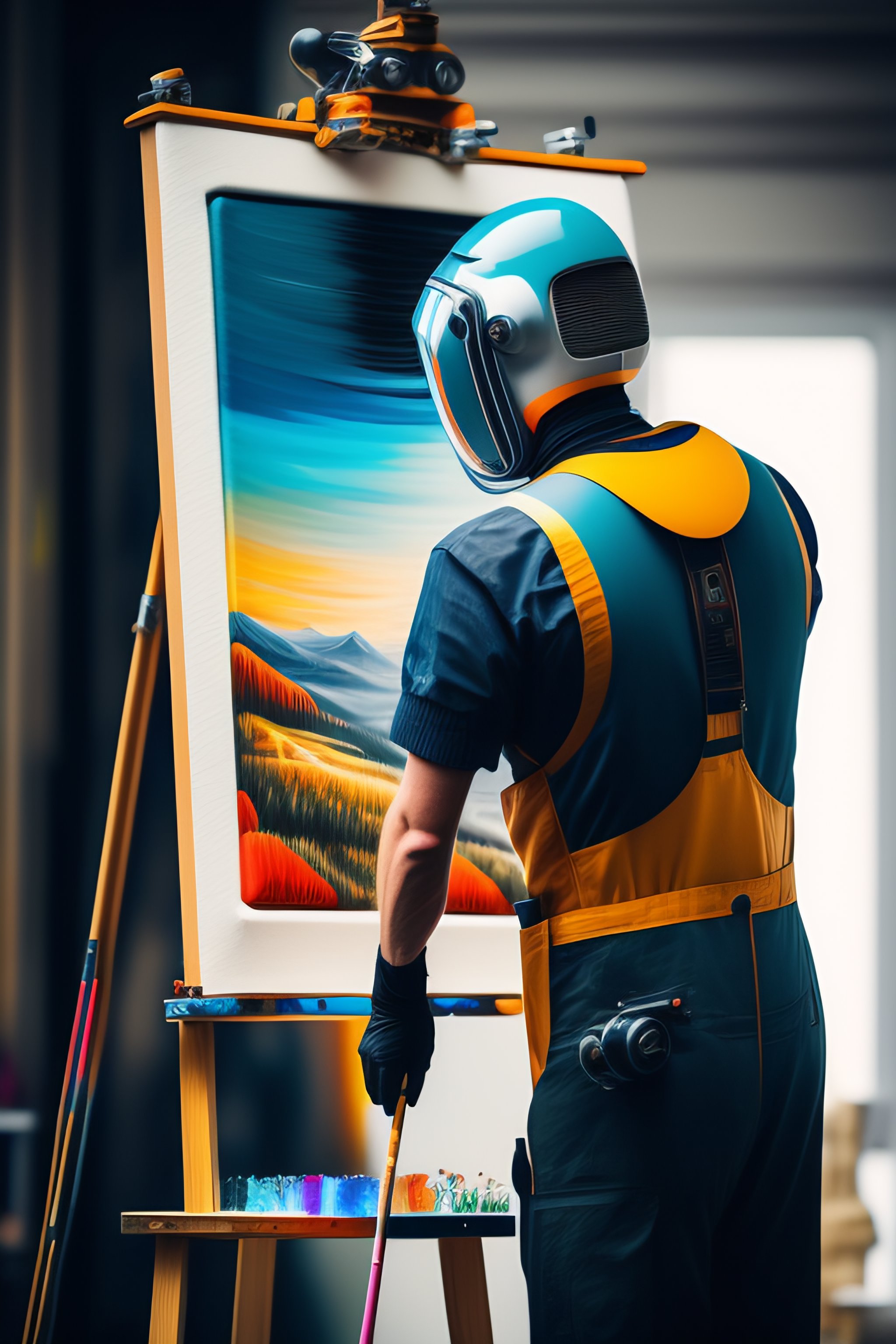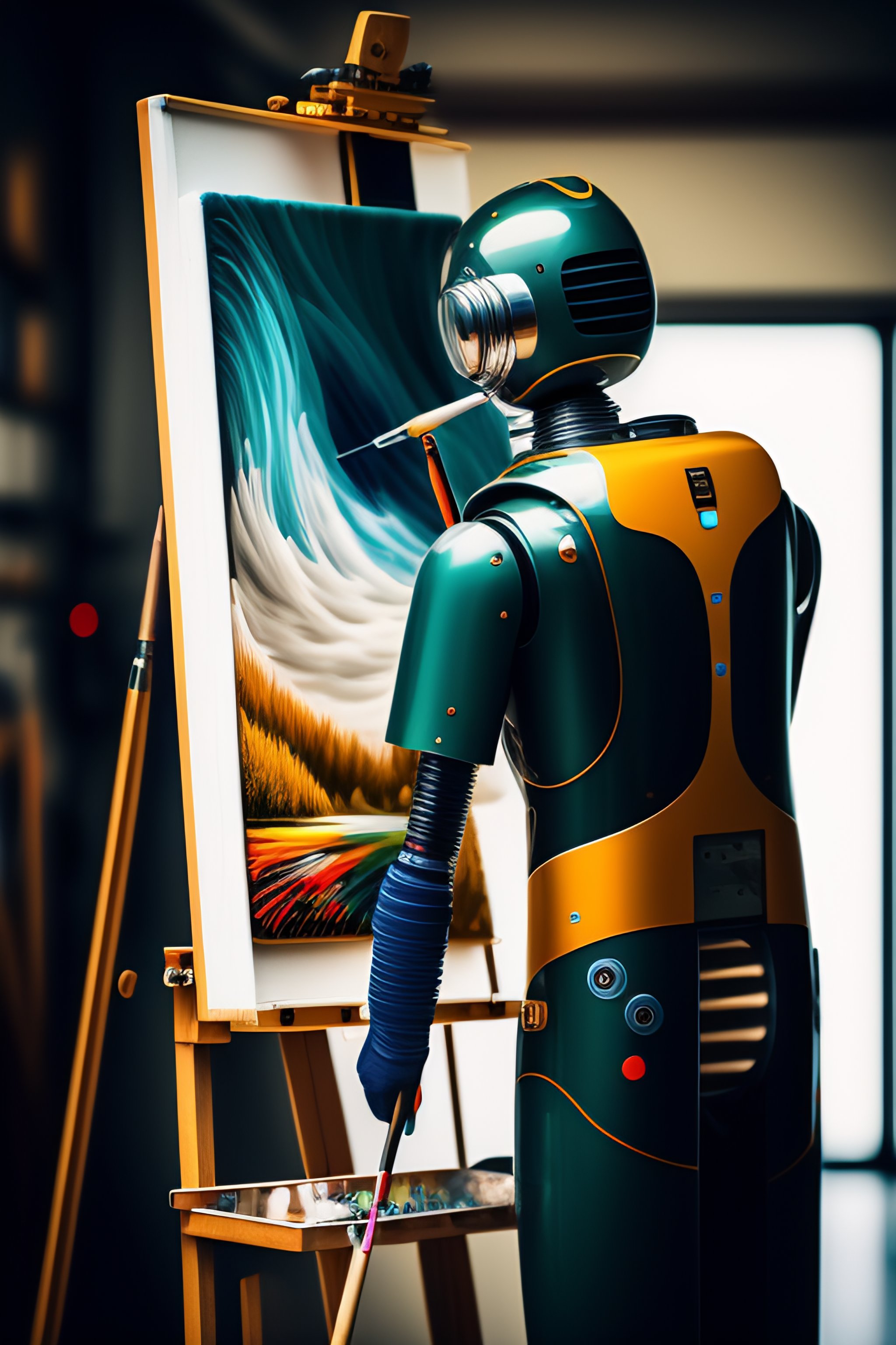 An artist robot holding a paintbrush is painting a masterpiece on a canvas