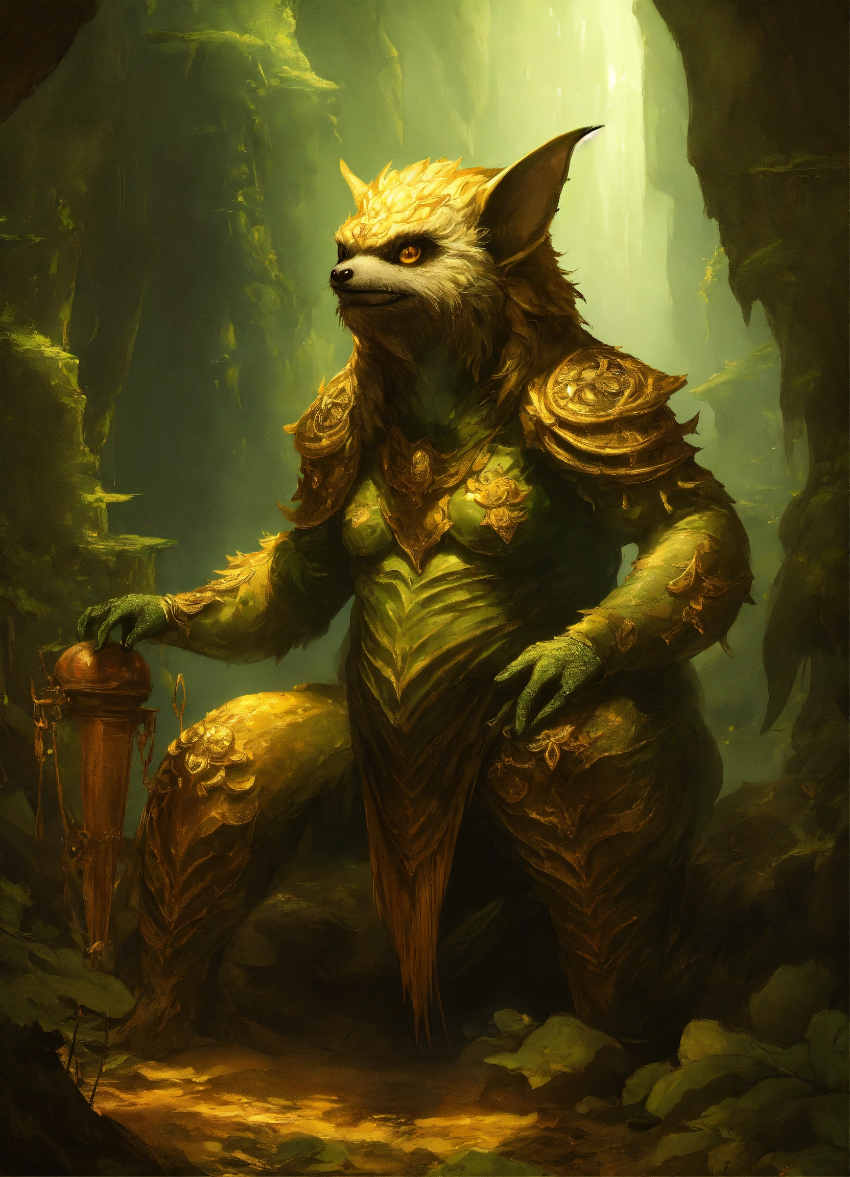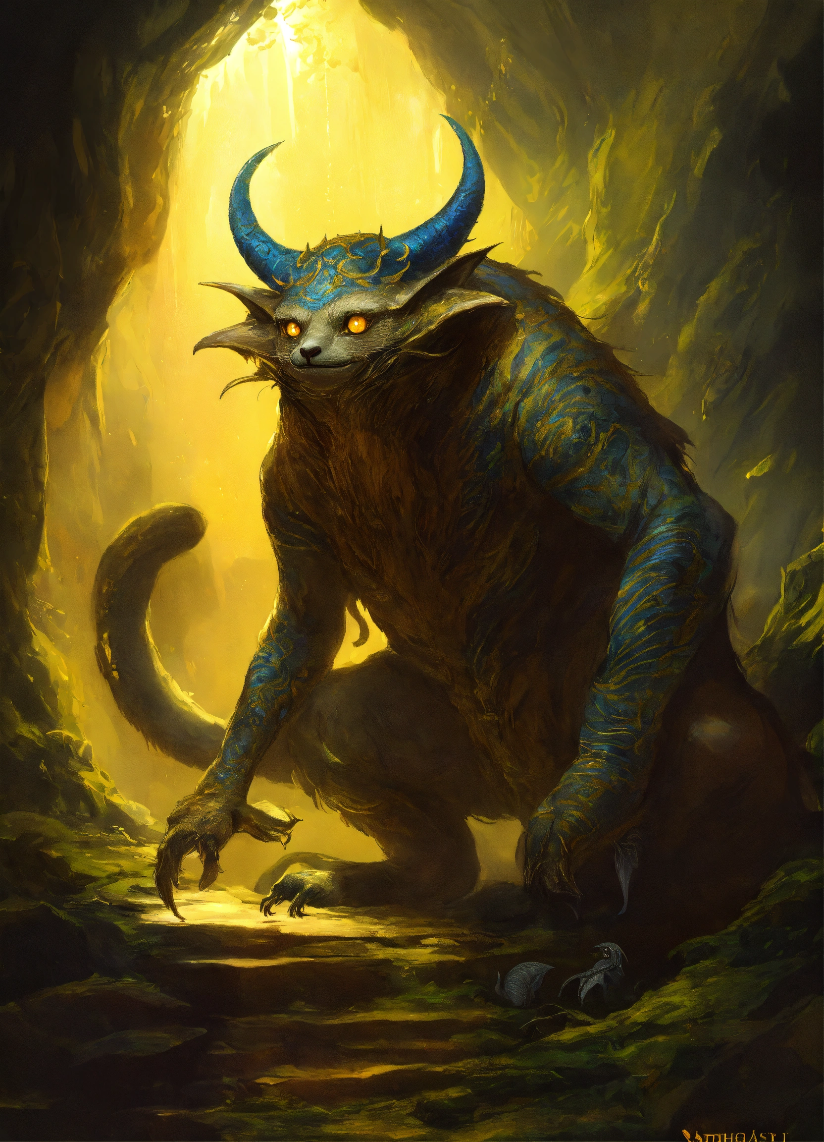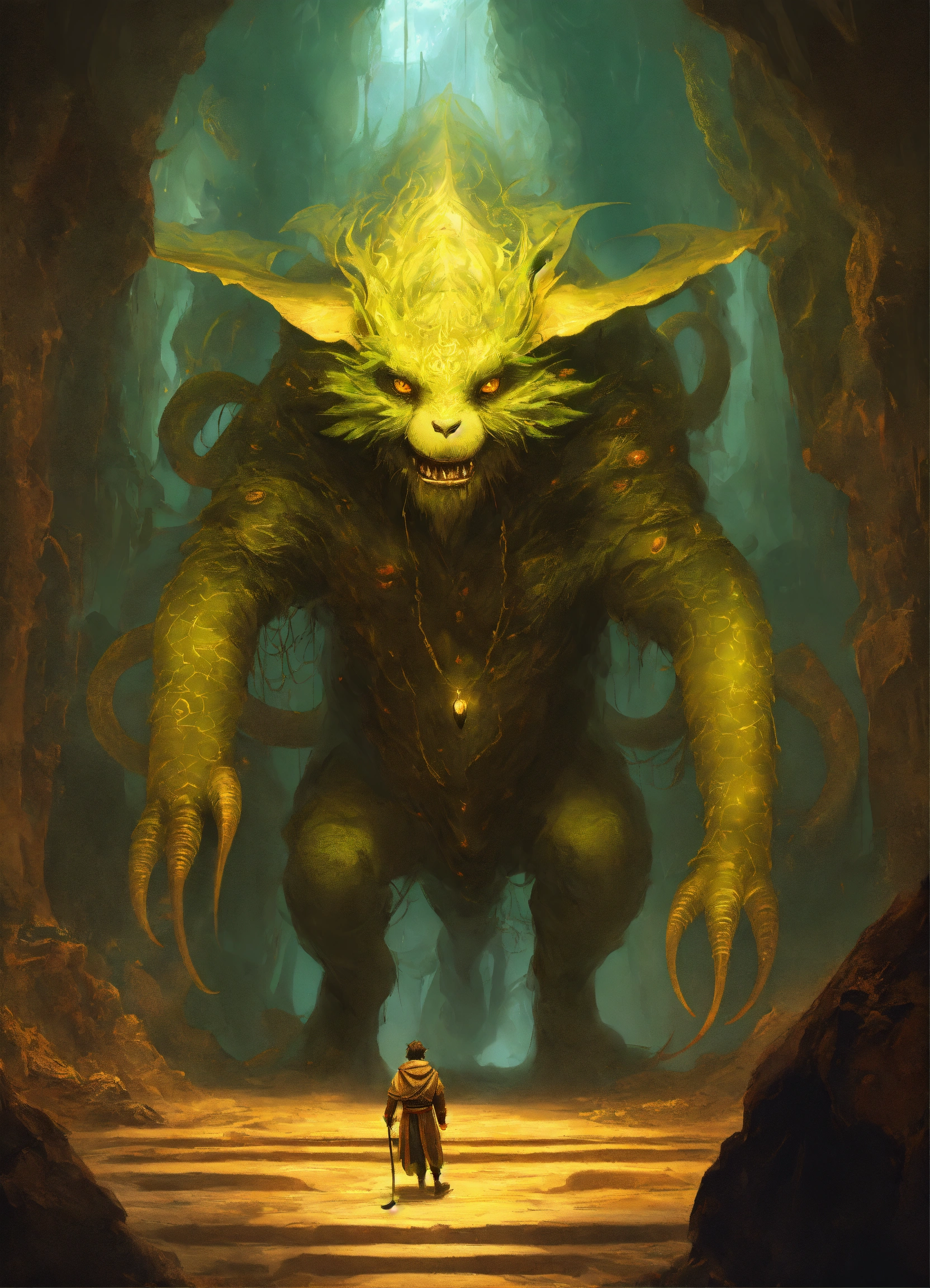 Envision a creature known as zhothaqquah, a grotesque deity from another dimension. it's a massive, squat being with the appearance of a bat and sloth hybrid, with disproportionately elongated limbs. its face resembles that of a leech, complete with small, hidden yellow eyes. it sits heavily on the ground, consuming smaller beings whole. the setting is the cavernous depths of mount vorash kedai, where reality distorts and the fabric of existence thins. zhothaqquah's skin is like the void of space, its fur a shifting shadow. it exudes a powerful stillness, yet its eyes suggest a lurking intelligence. occasionally, it transforms into a serpentine shadow with many legs, moving with an unsettling grace. this ancient god's presence fills the caverns, an eternal sentinel guarding forbidden knowledge."