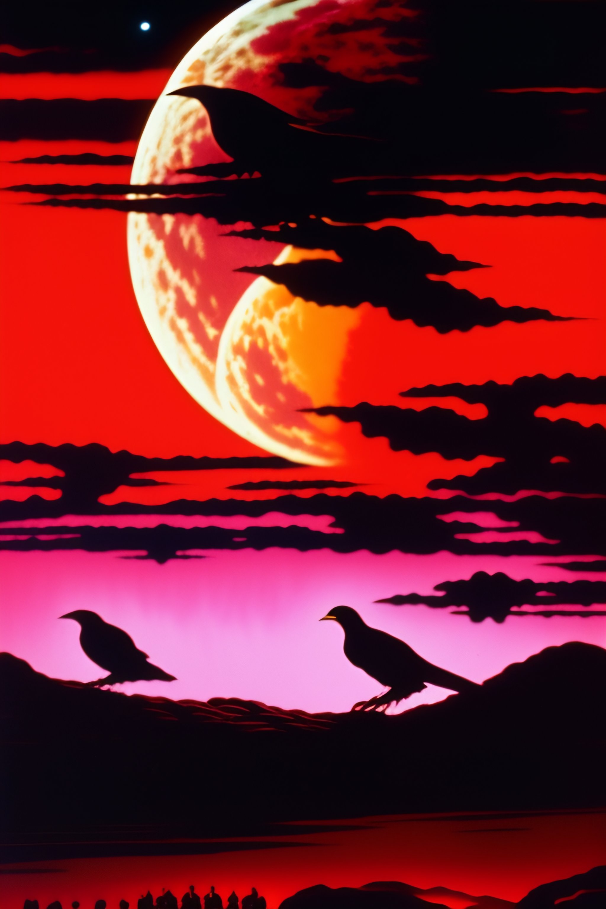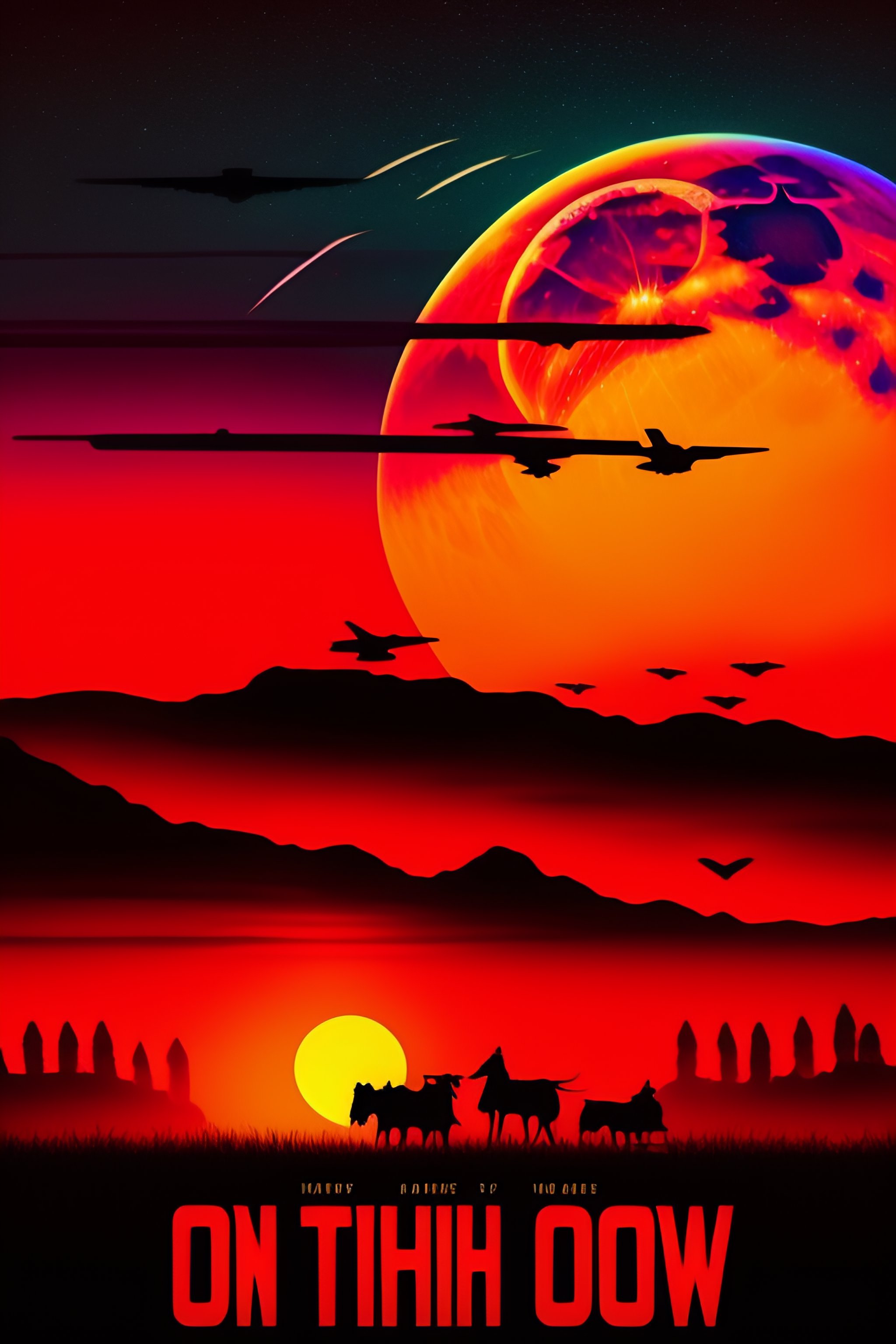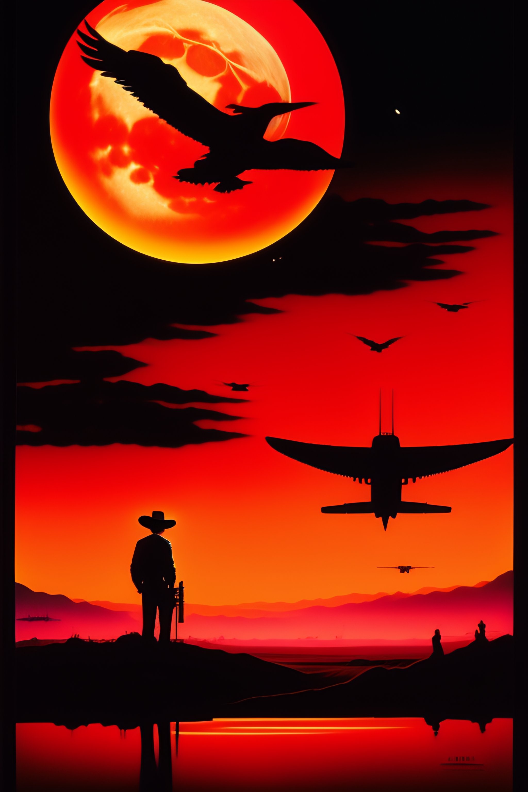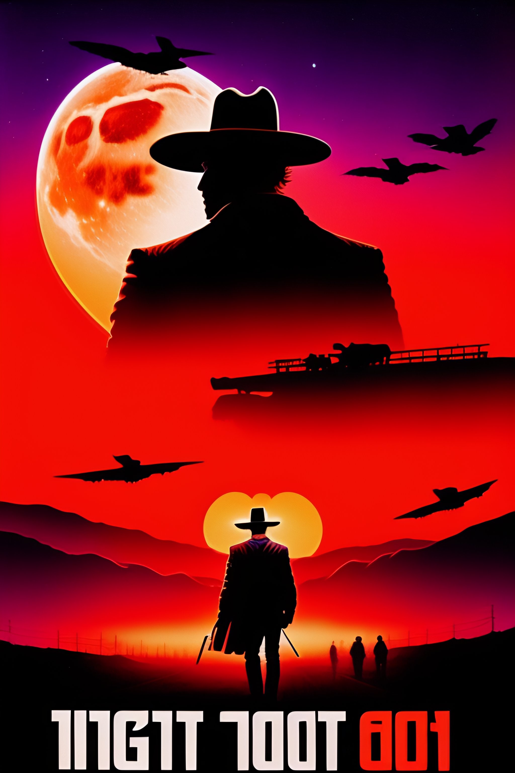 1980s action movie poster, high contrast, nighttime, red sky, full moon, crows flying, a creepy atmosphere, cowboys hunting at night, holding rifles
