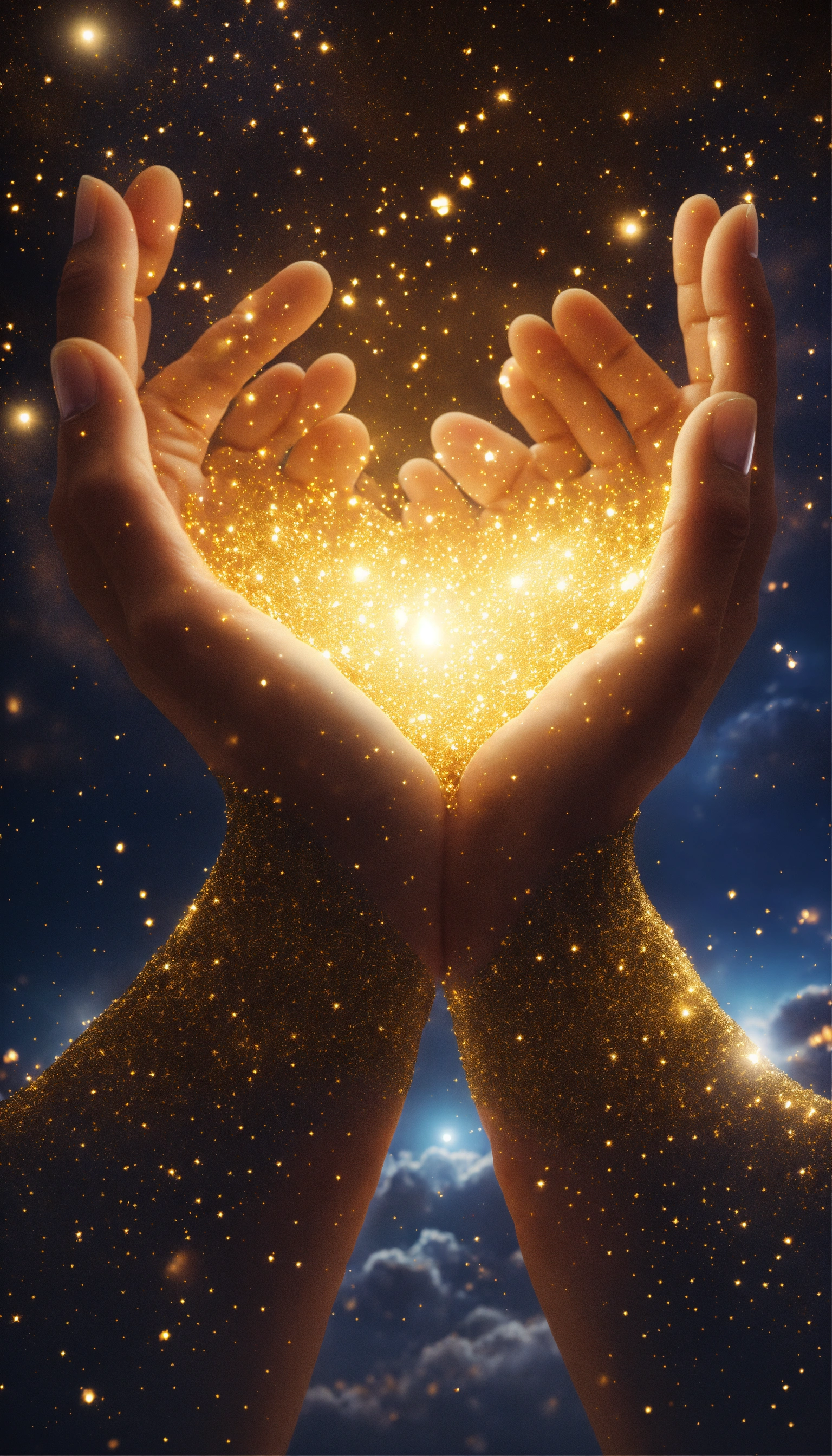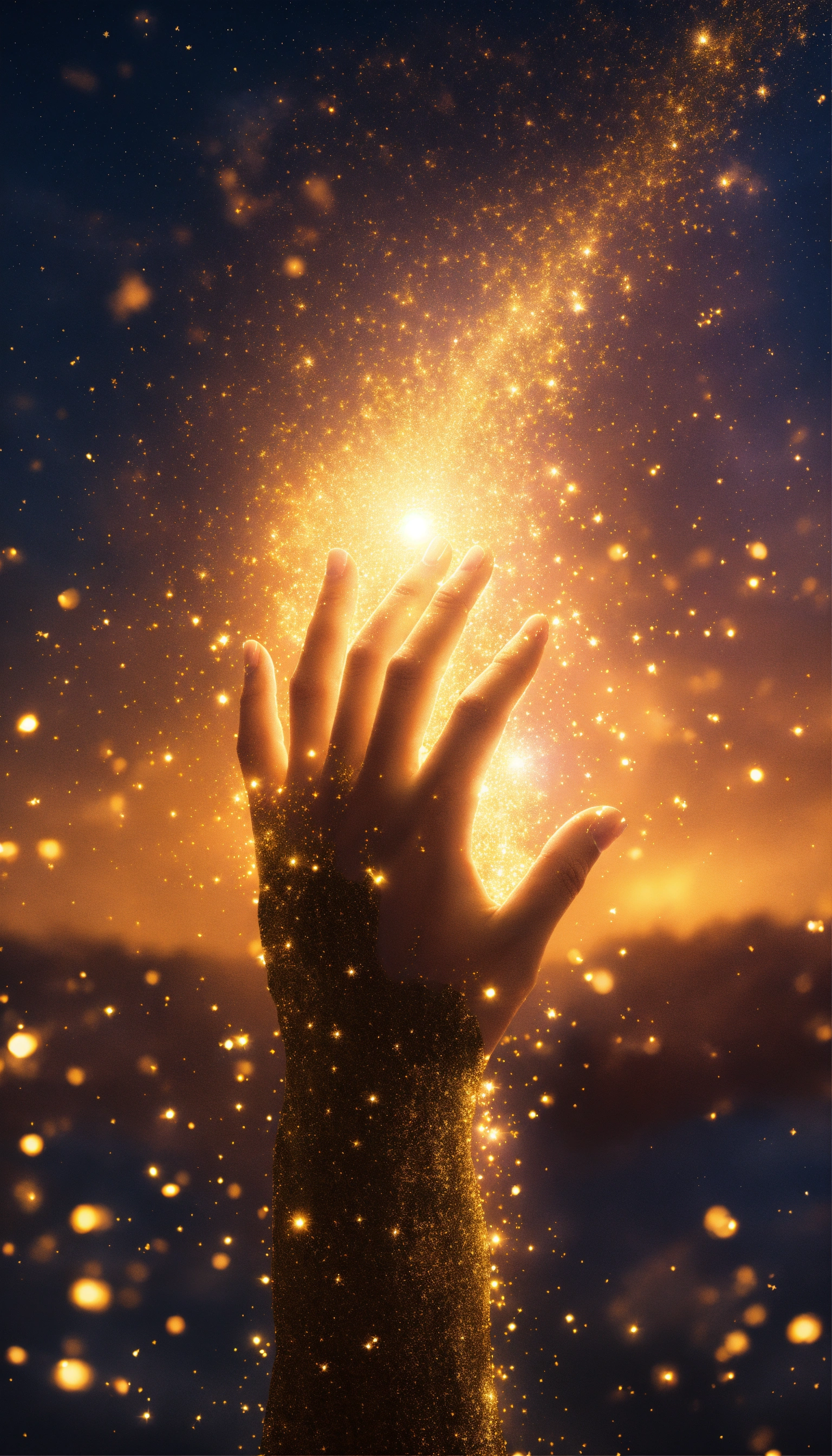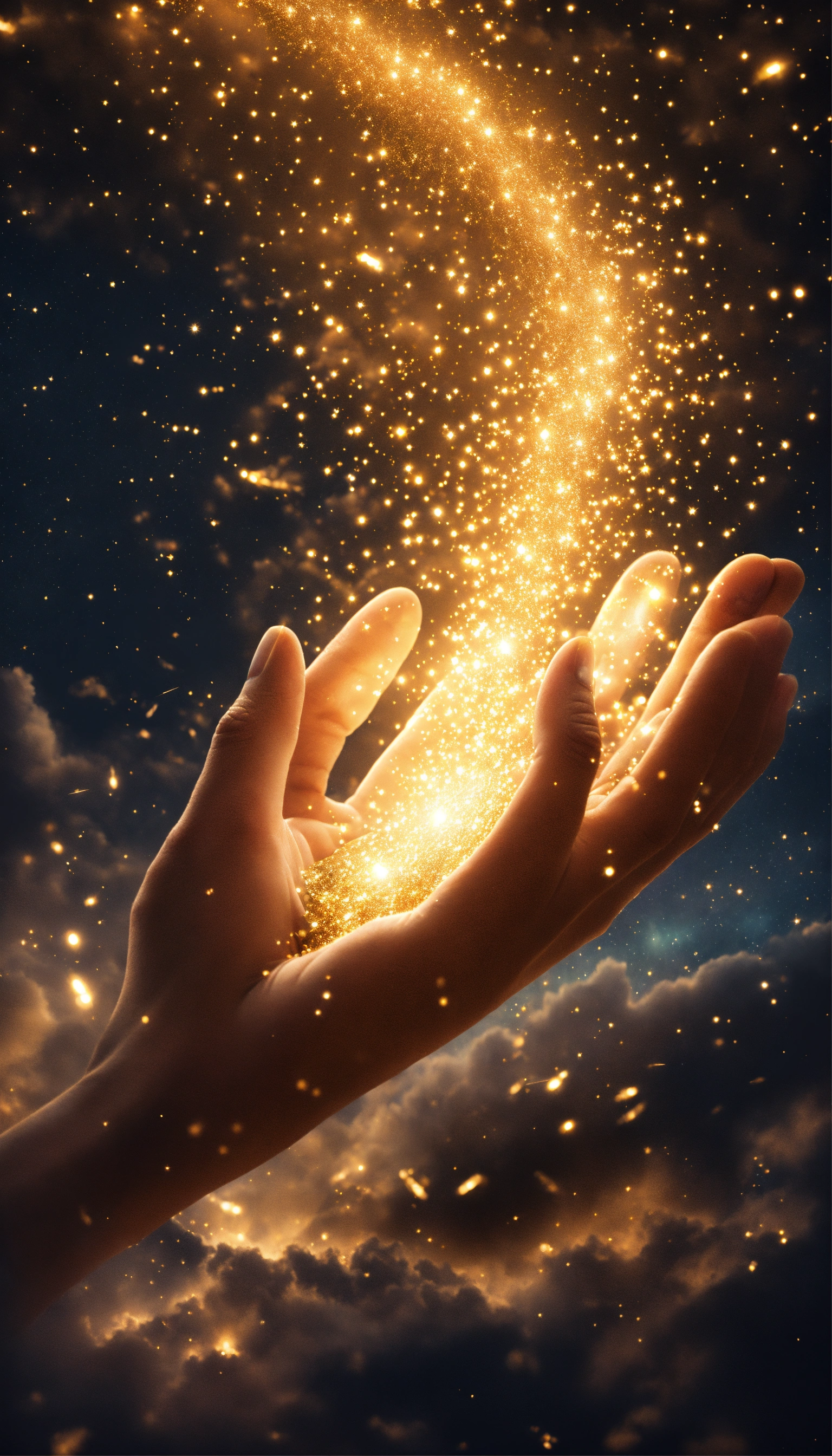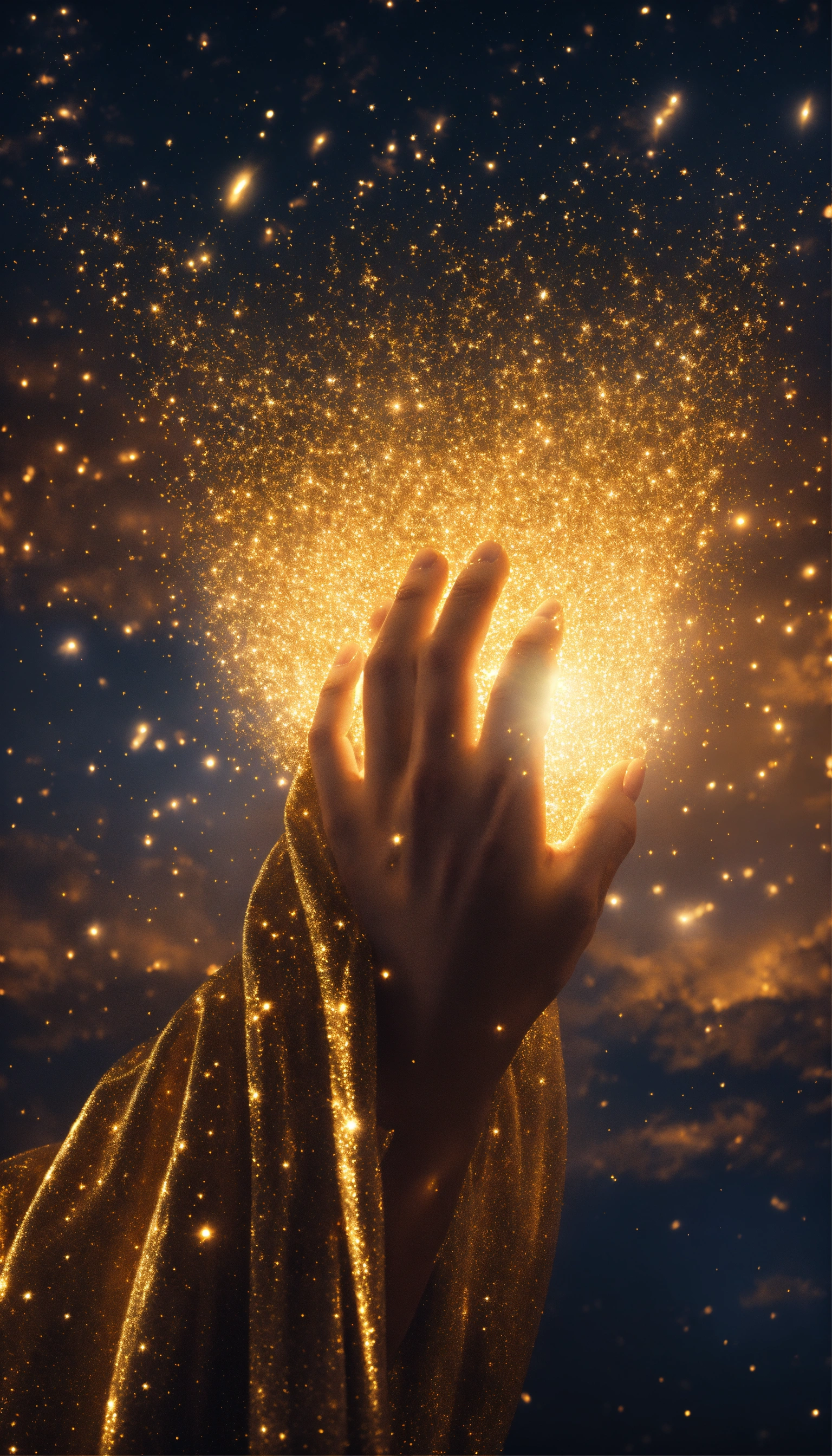 Large, detailed and luminous hands of god emerging from a beautiful and perfect night sky, golden dust falls from the luminous hands like very fine glitter digital illustration, realism, 3d, sharp focus, cinematic illustration, 8k, hyperrealistic digital painting, hd, high quality and resolution