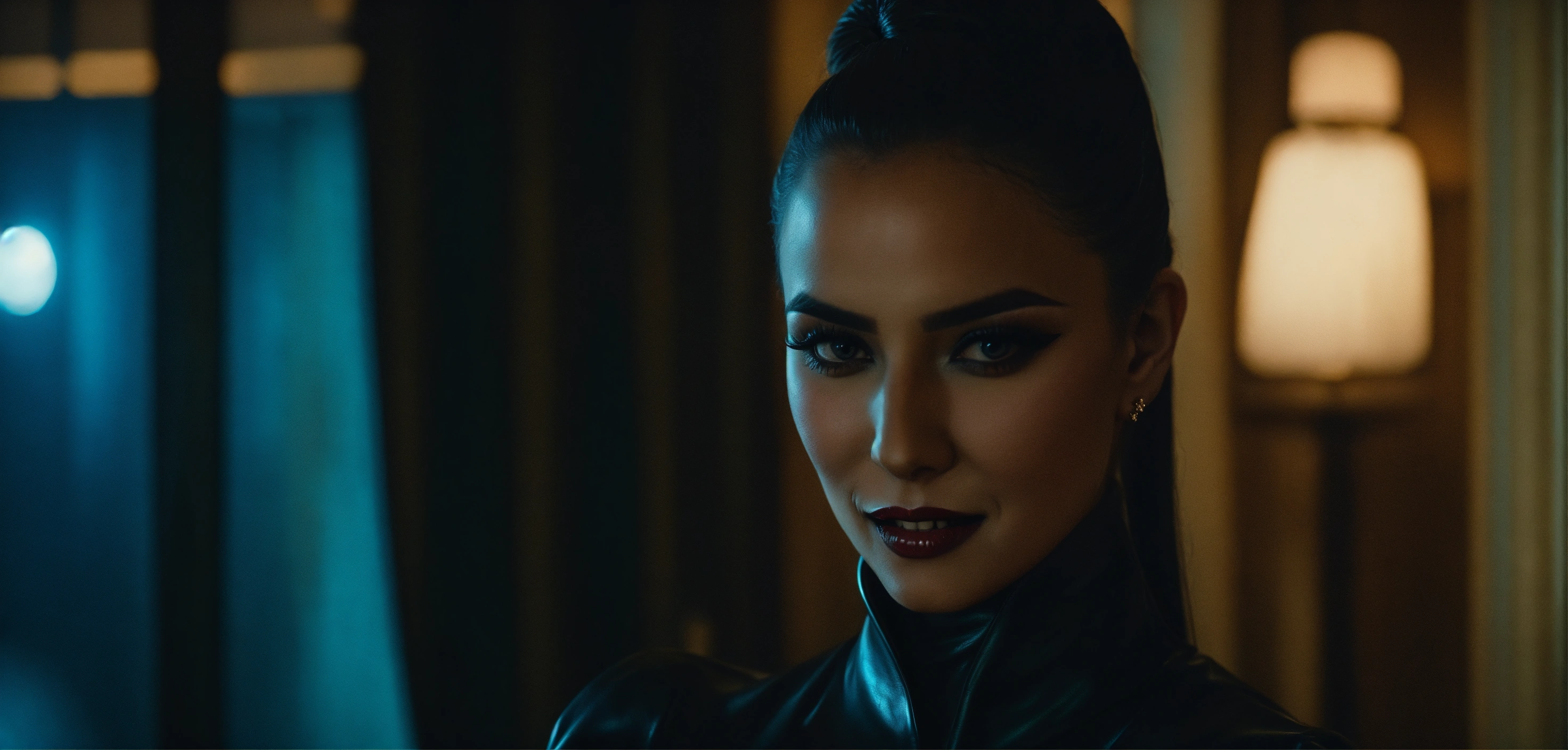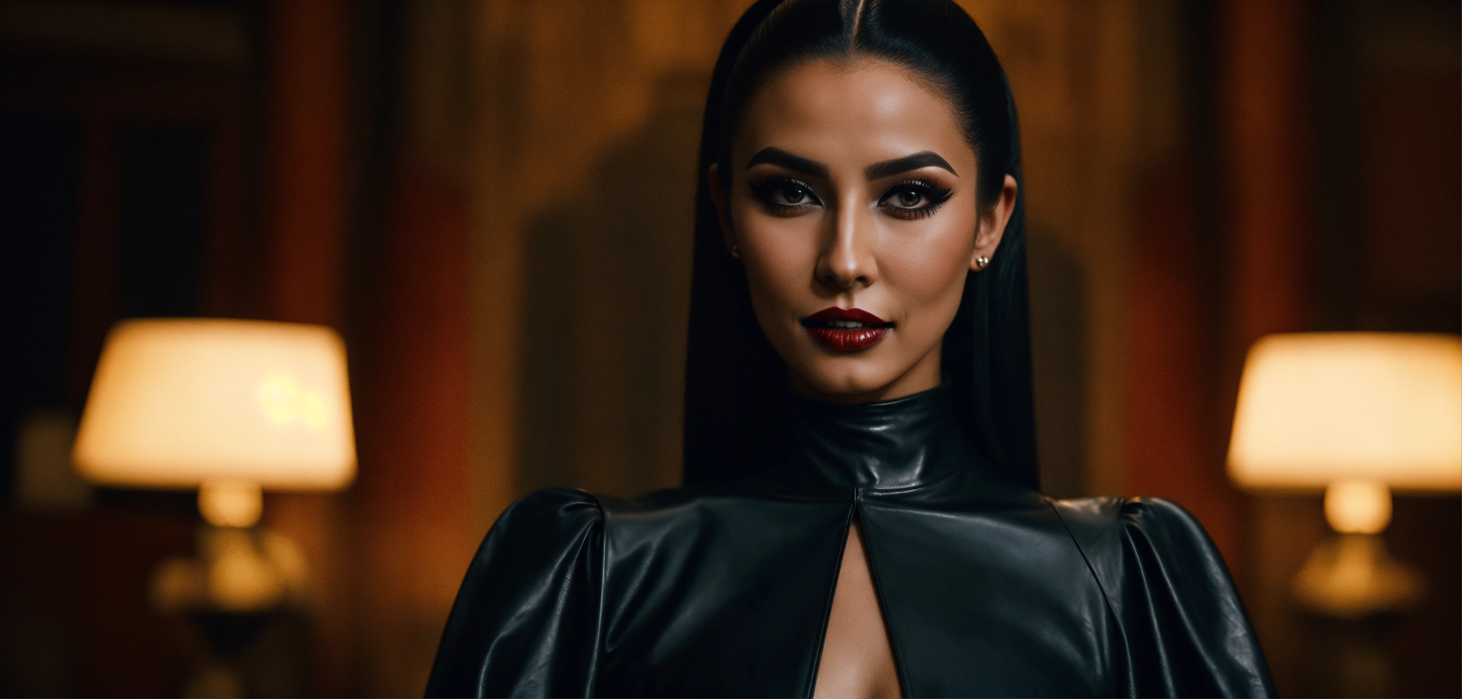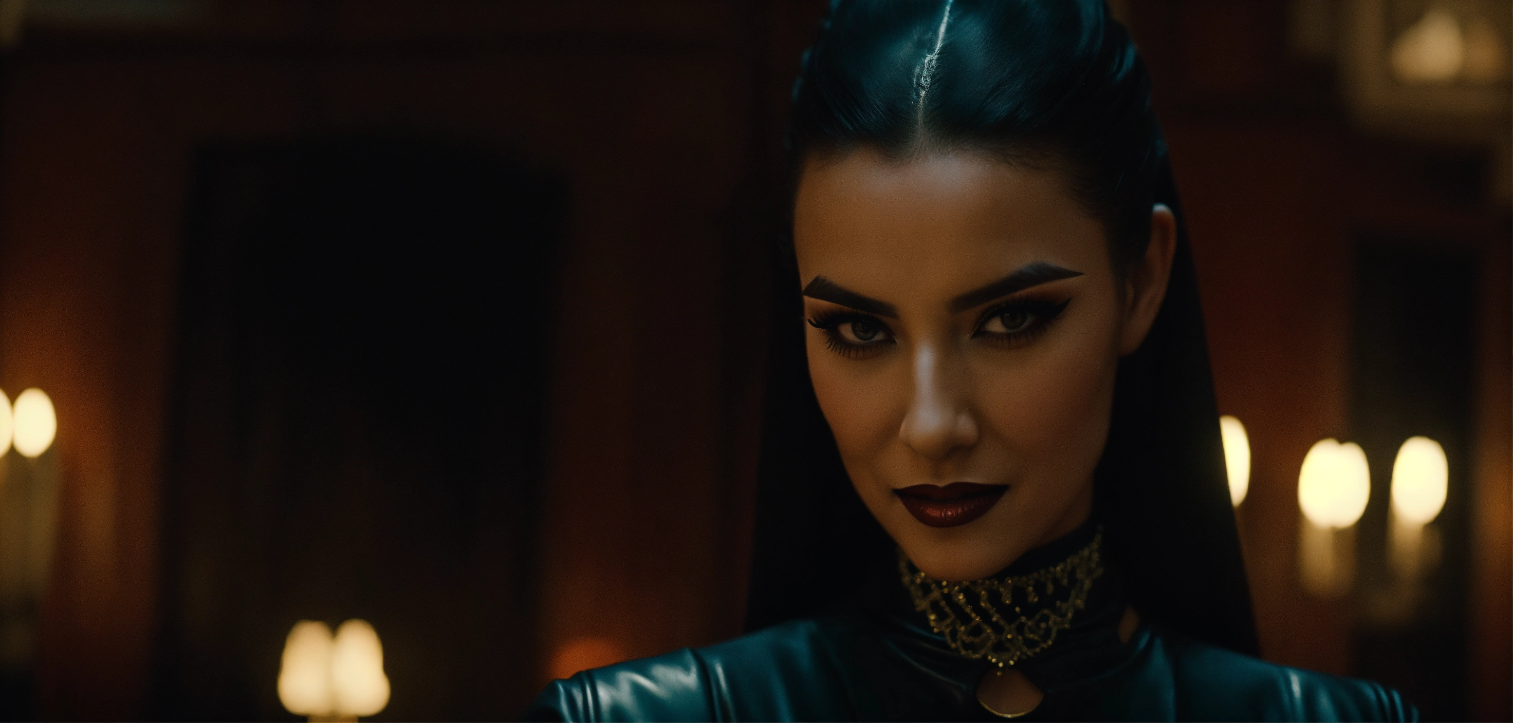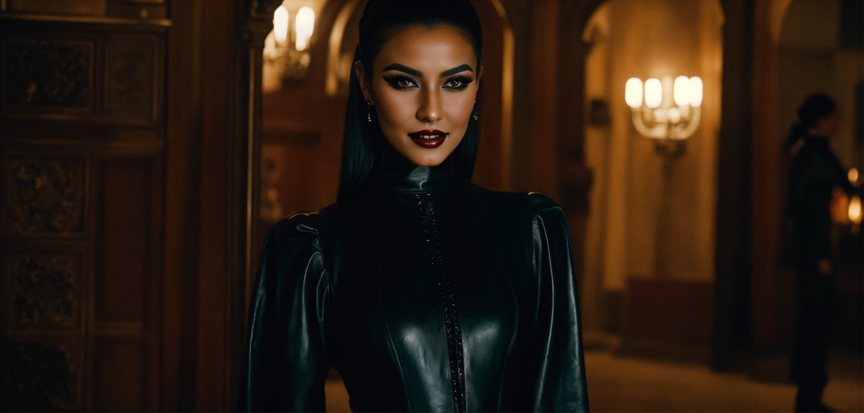 Cinematic vampire underworld movie look, stunning arab woman fashion model, head slightly tilted, looking arrogant evil smile, straight black high ponytail hair, eyeliner makeup, strict black leather dress with big long puff sleeves, mansion room by night, haze