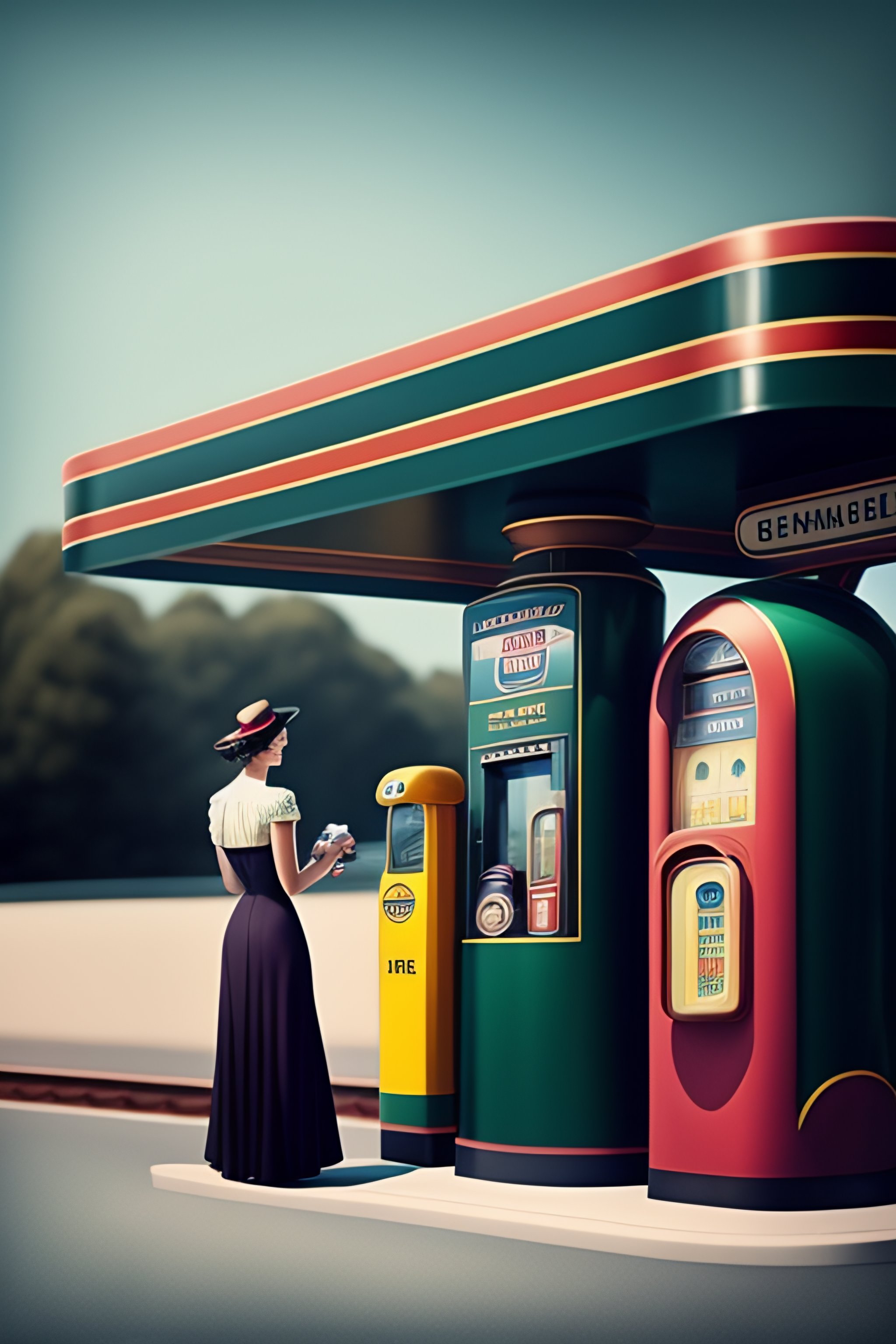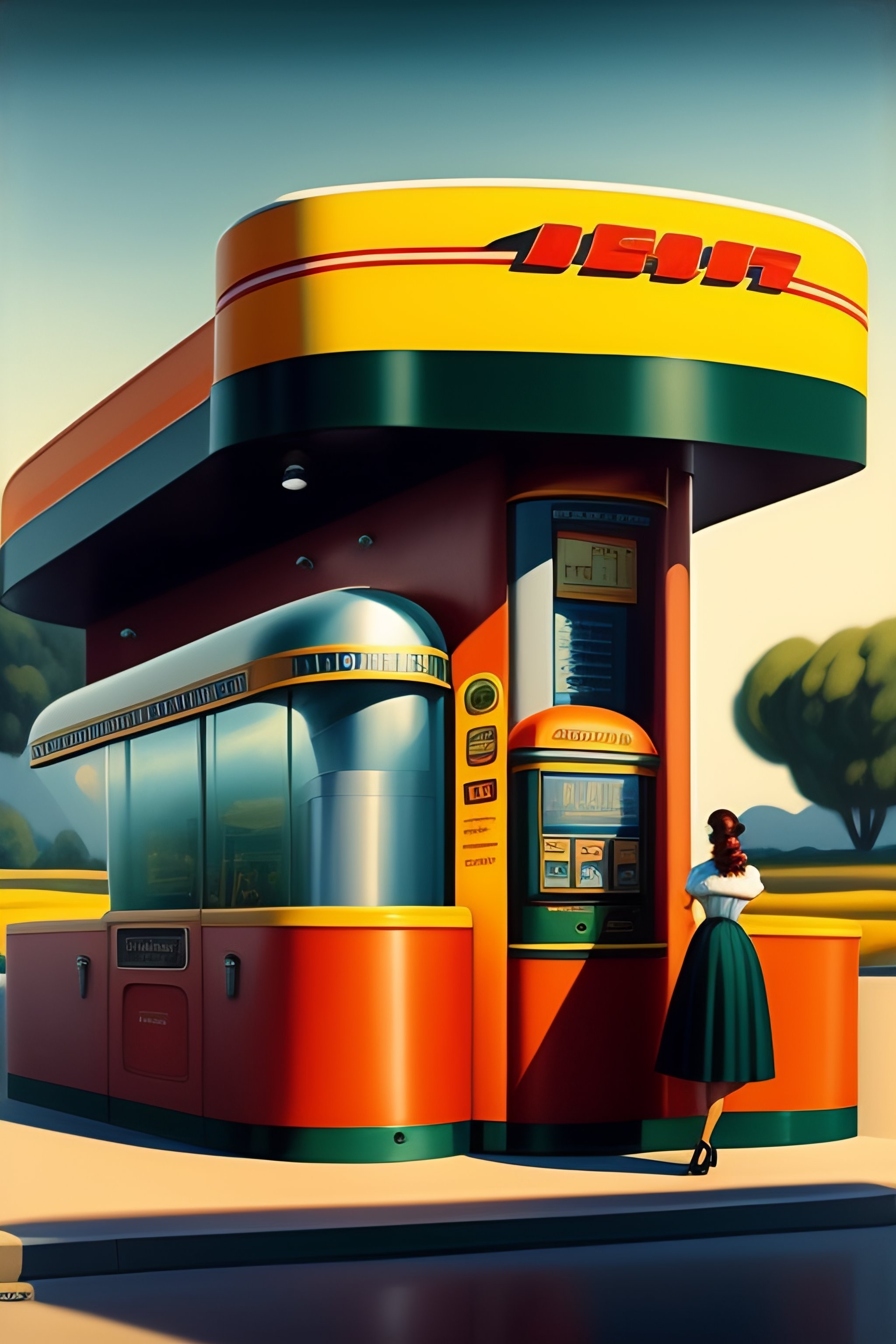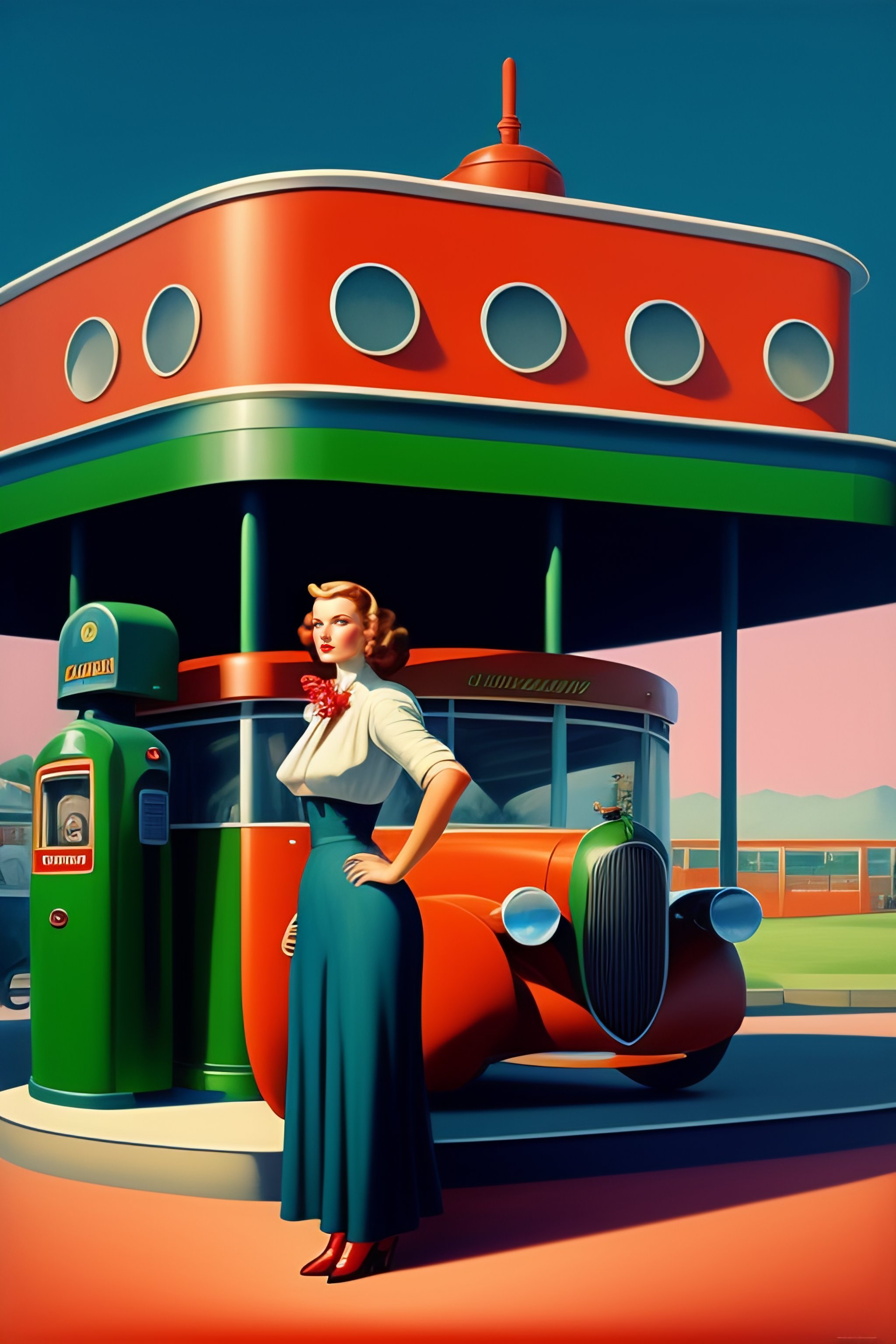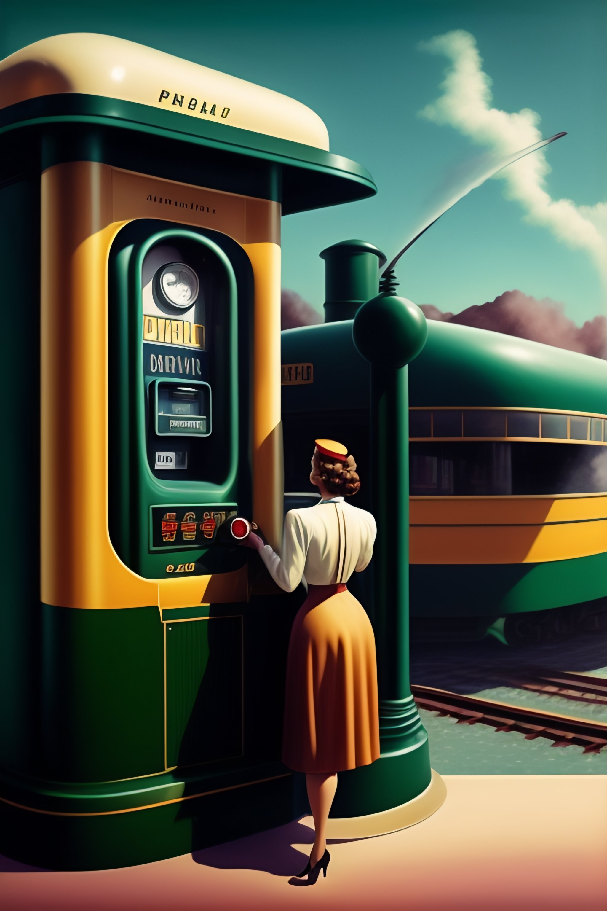 1 9 4 0, s beautiful woman, embrassing petrol pump, at a petrol station, by edward hopper, de chirico, flat paint, art deco style, 1 9 4 0, steam train in landscape, highly detailed, minimalist, sharp focus, 4k uhd image