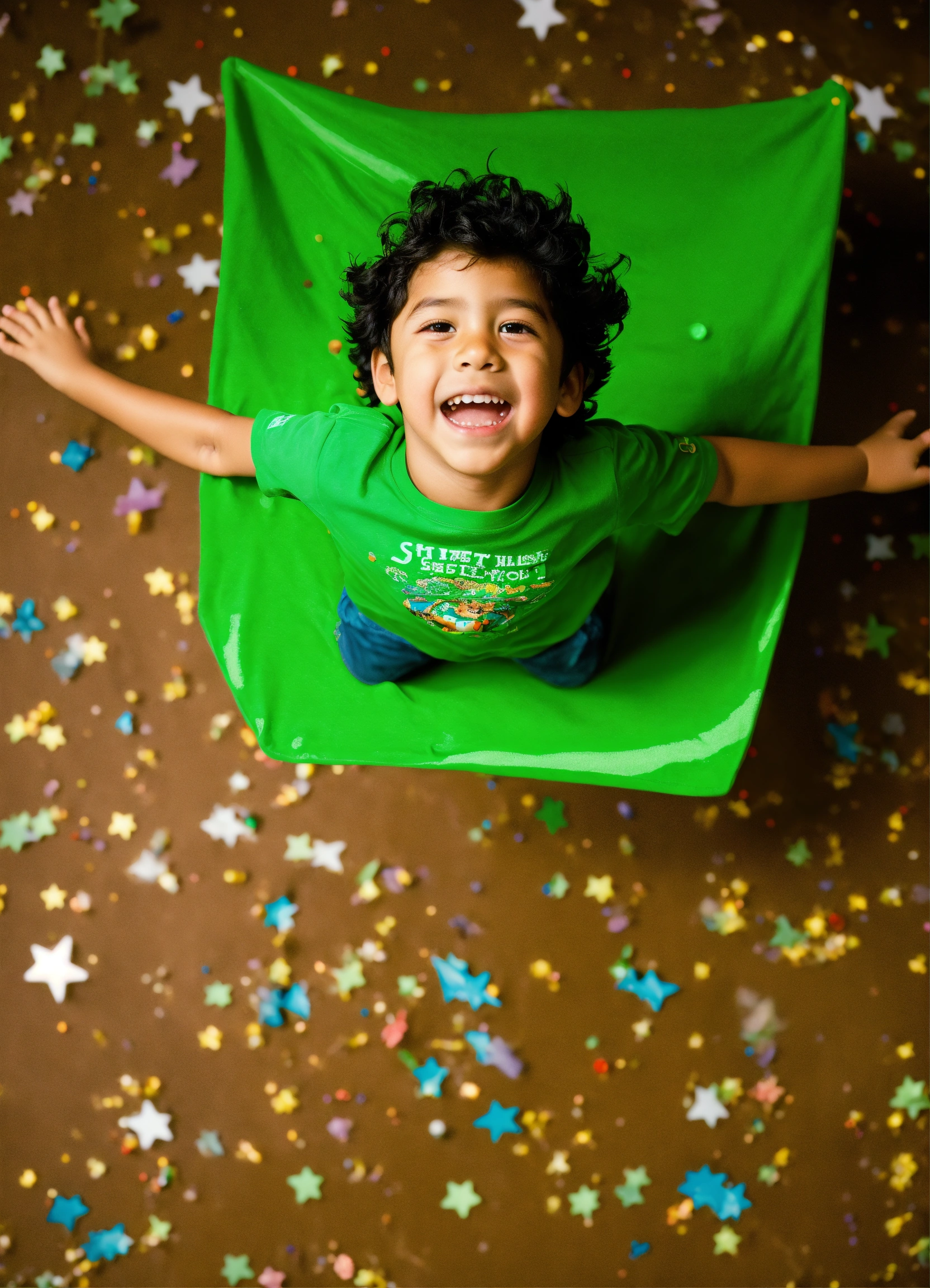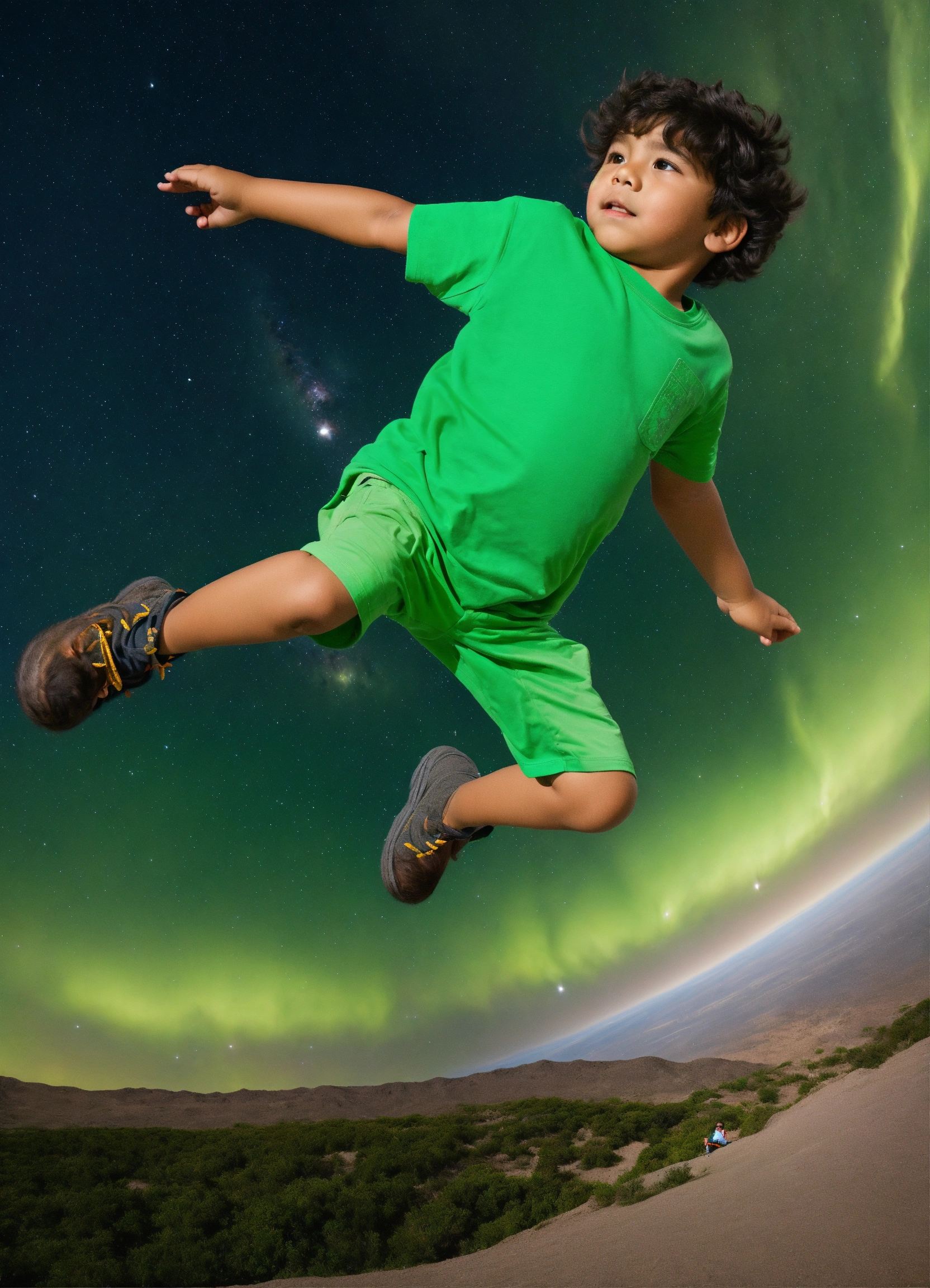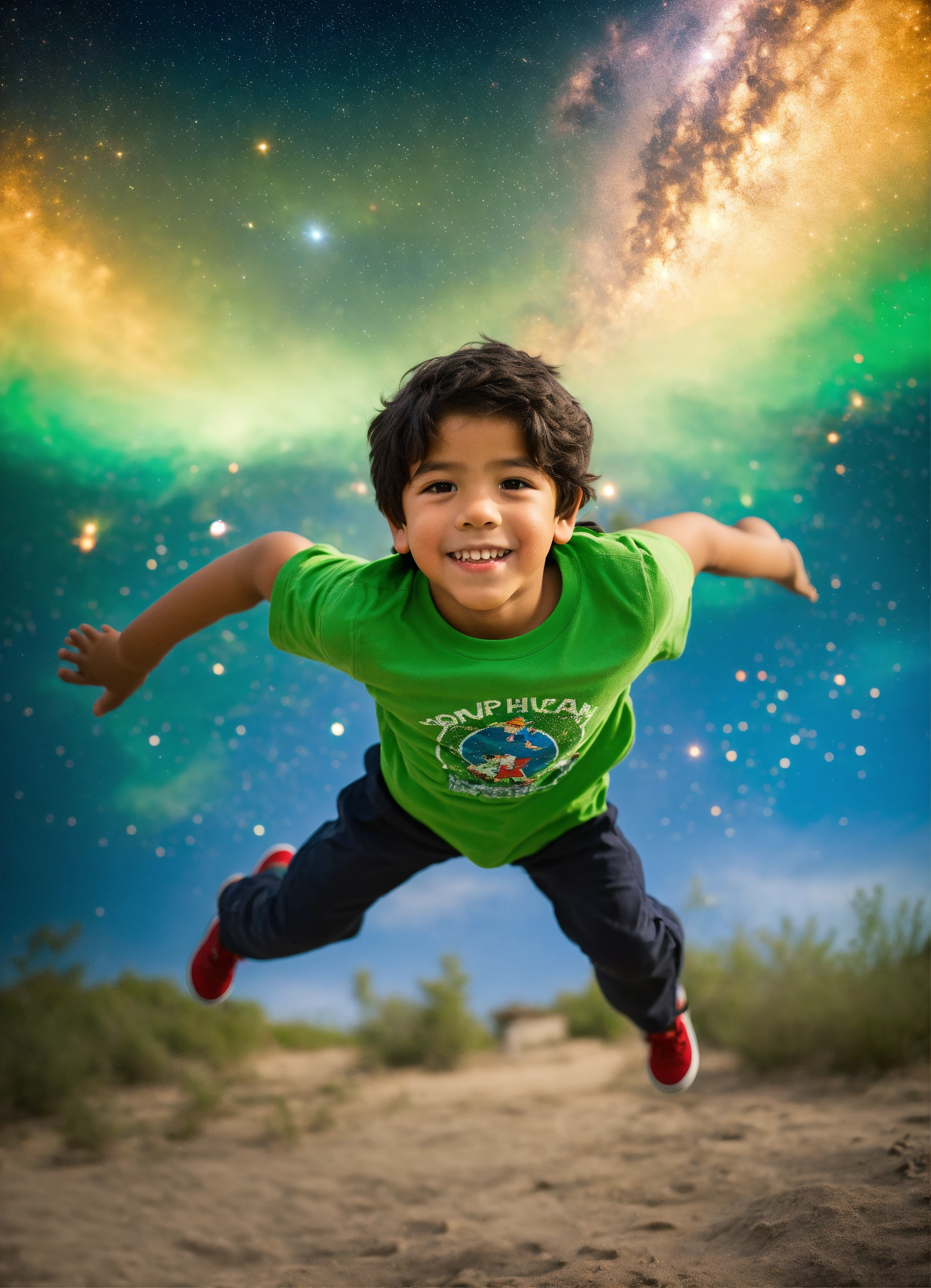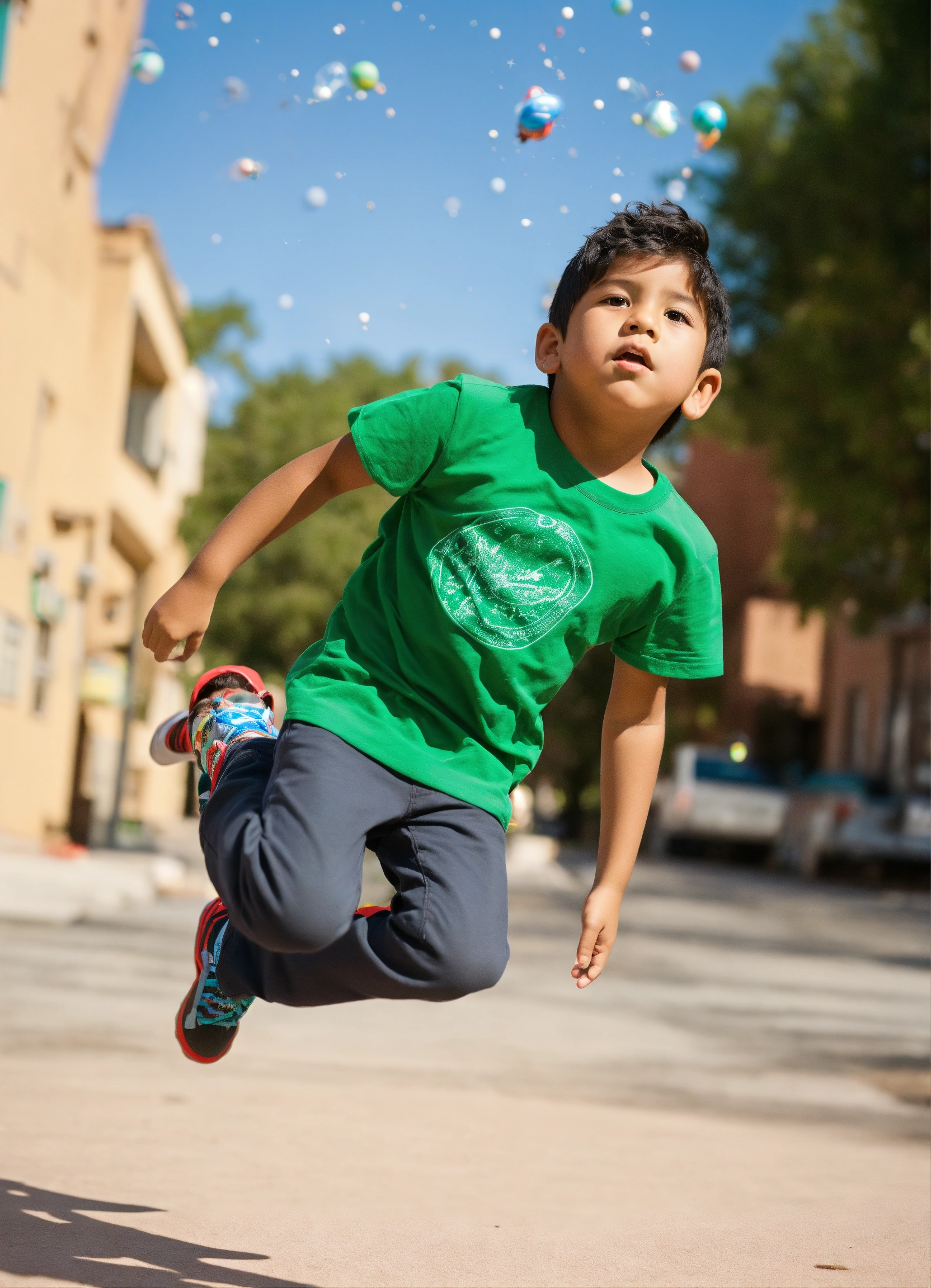 5 year old hispanic boy in a green tee shirt whole body falling backwards into space