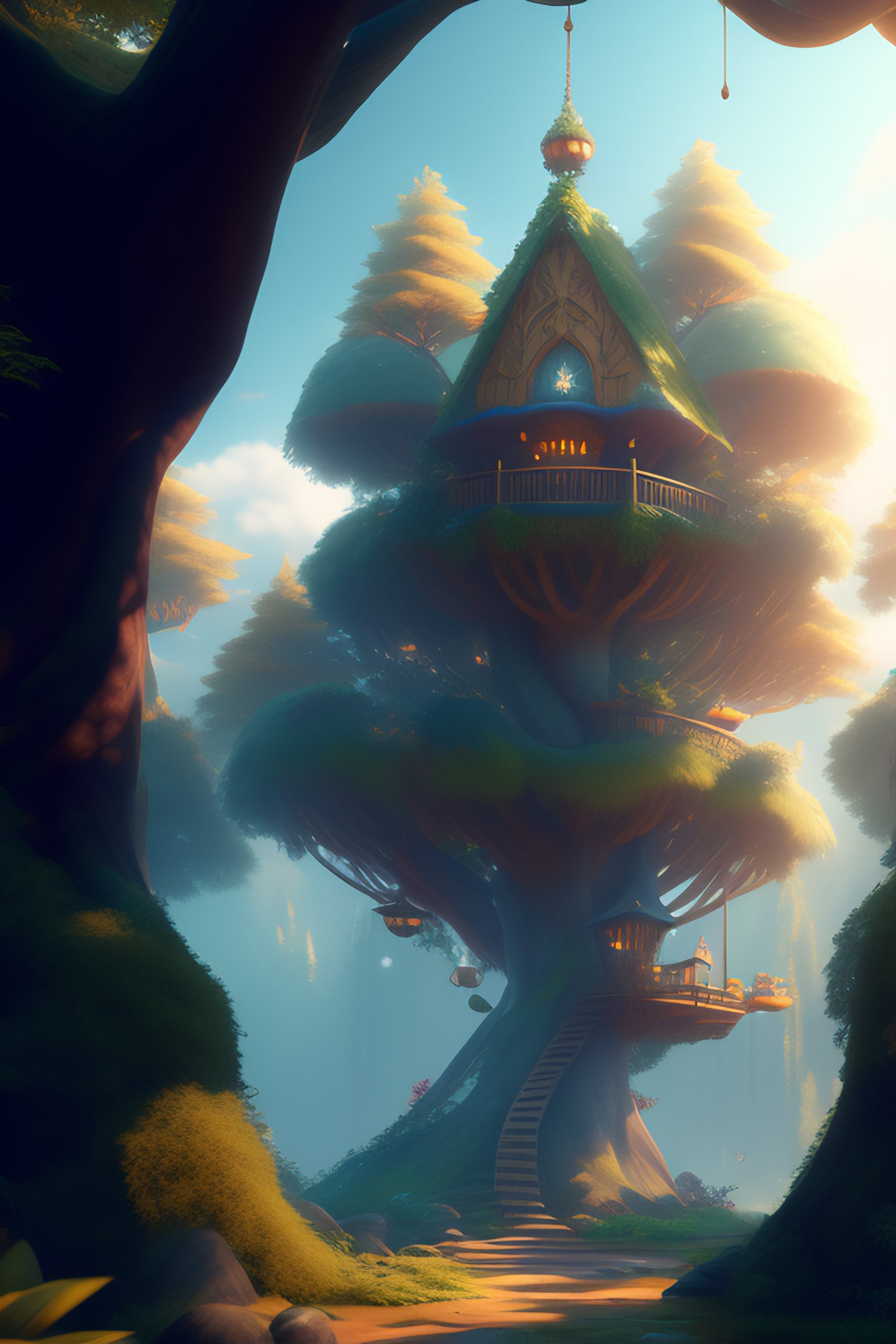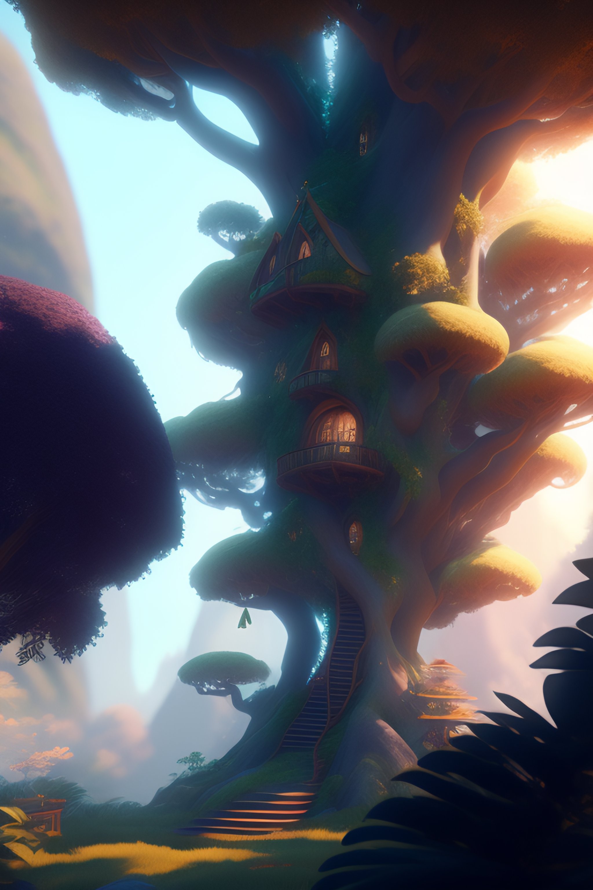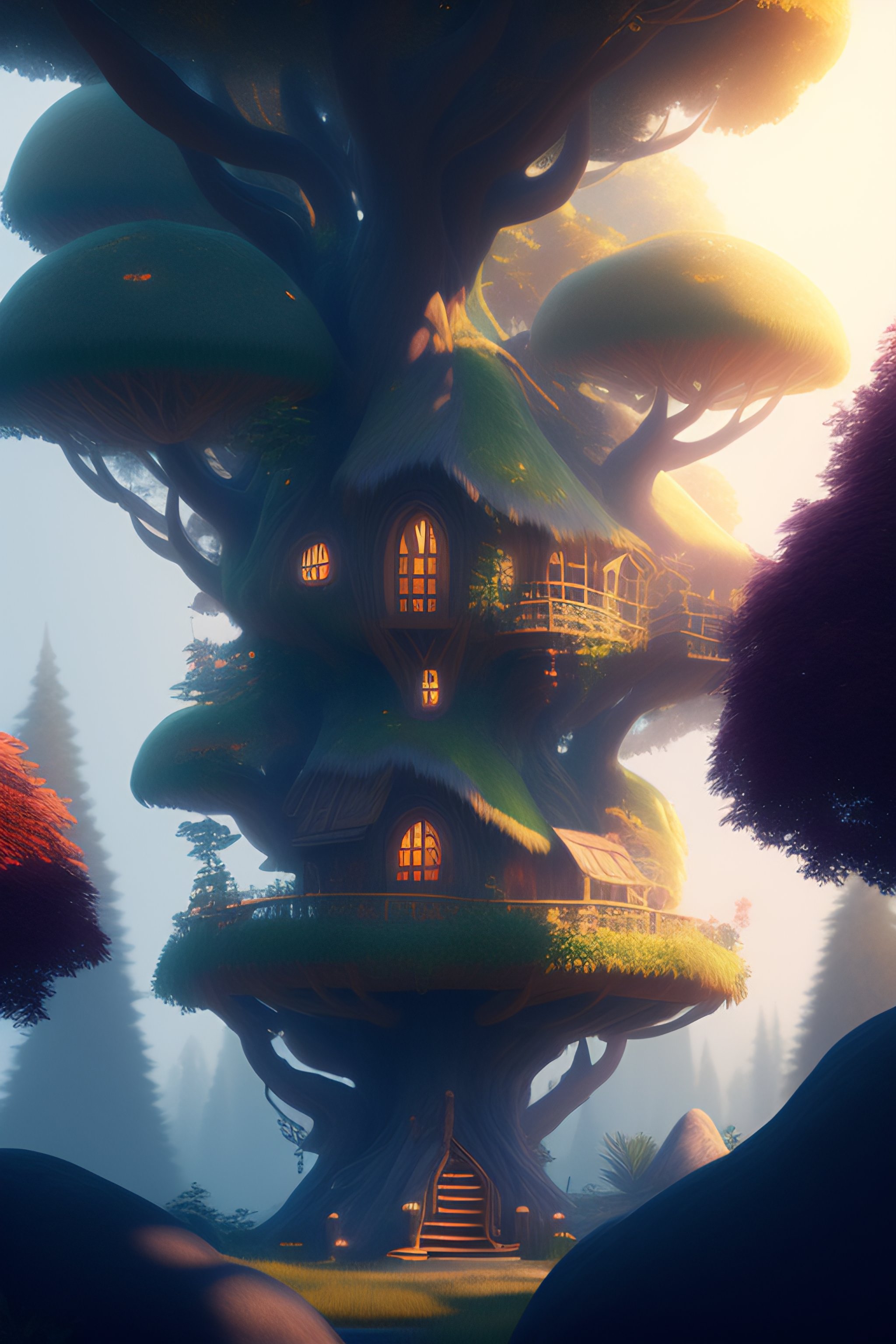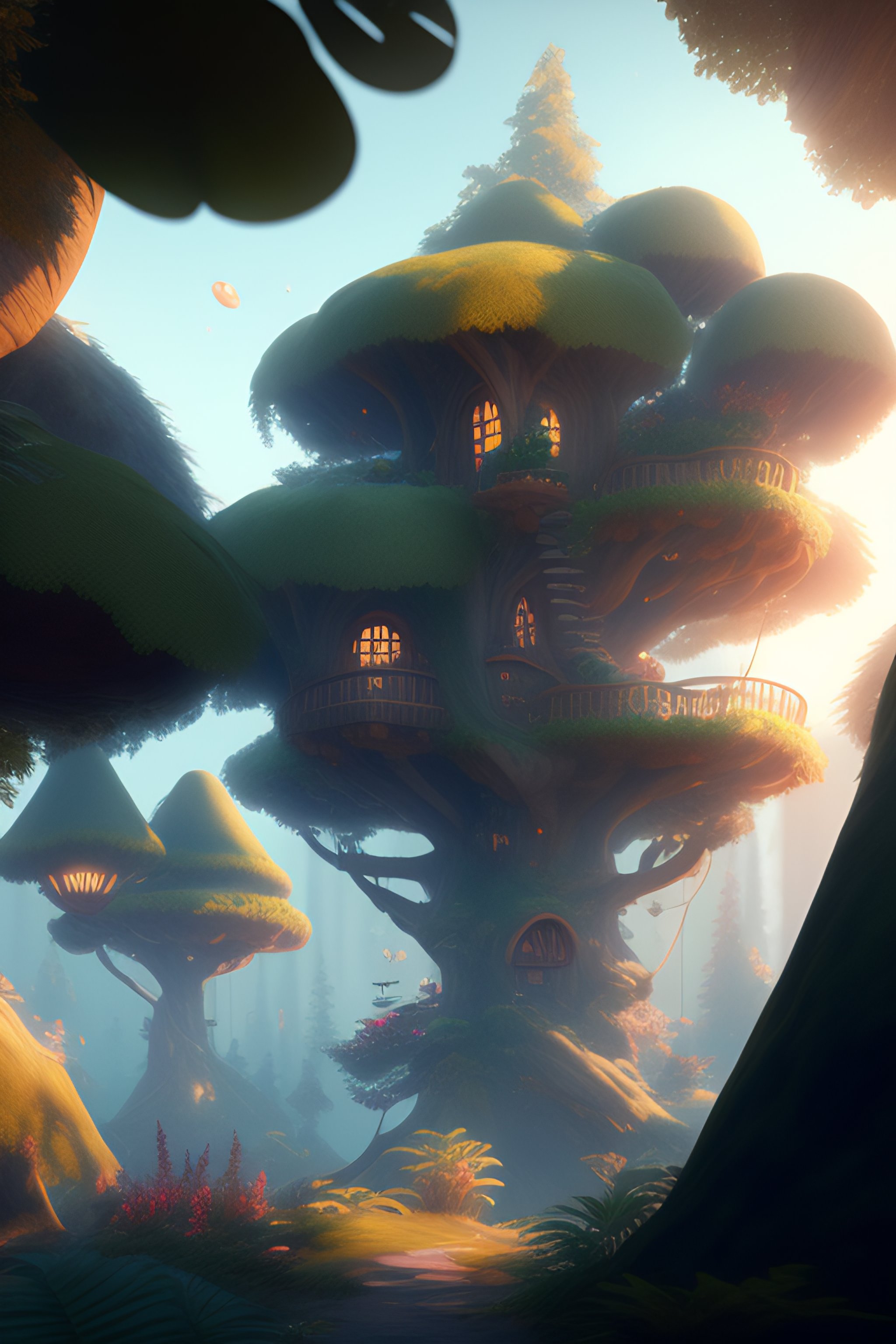 Mystical treehouse surrounded by exotic plants, style of peter mohrbacher, dylan cole & sergey kolesov, cinematic lighting, ultra realistic, unreal engine 5, realistic cg realistic octane render volumetric light, hd, 8k