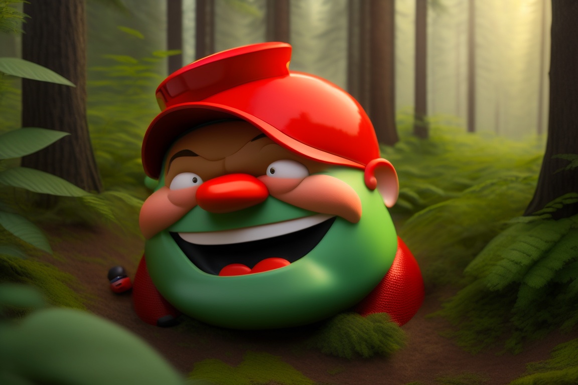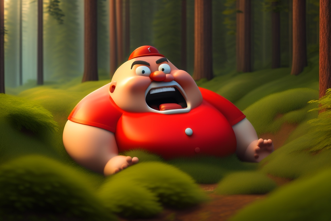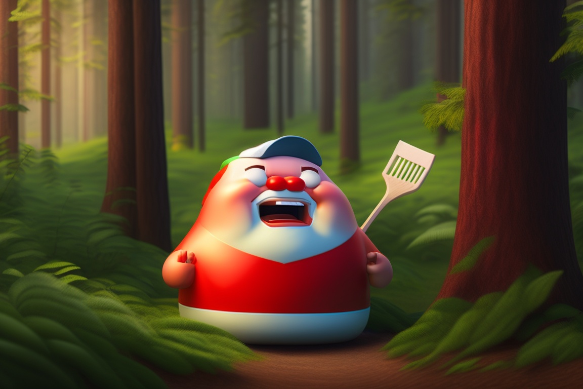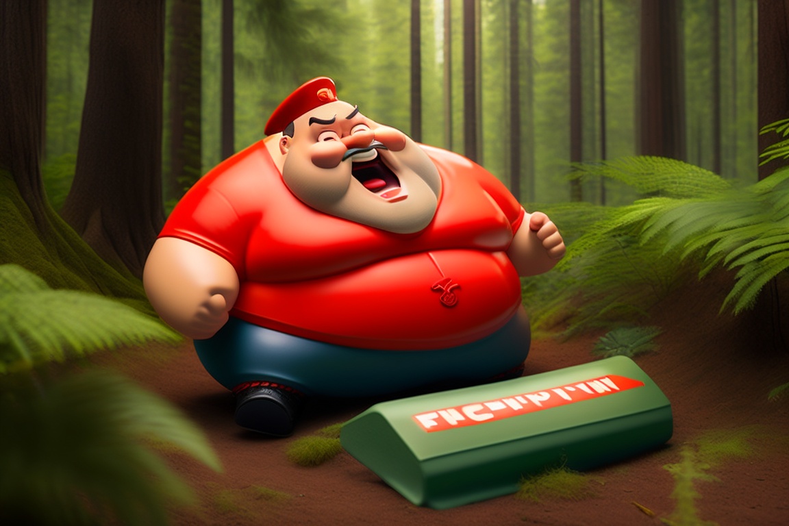 An animatronic. he is a fat man wearing a red t-shirt and a red cap. he has a goofy plastic smile on his face and a spatula in his hand. he is laying down, crumpled in pieces, he is in the middle of a foggy green forest.
