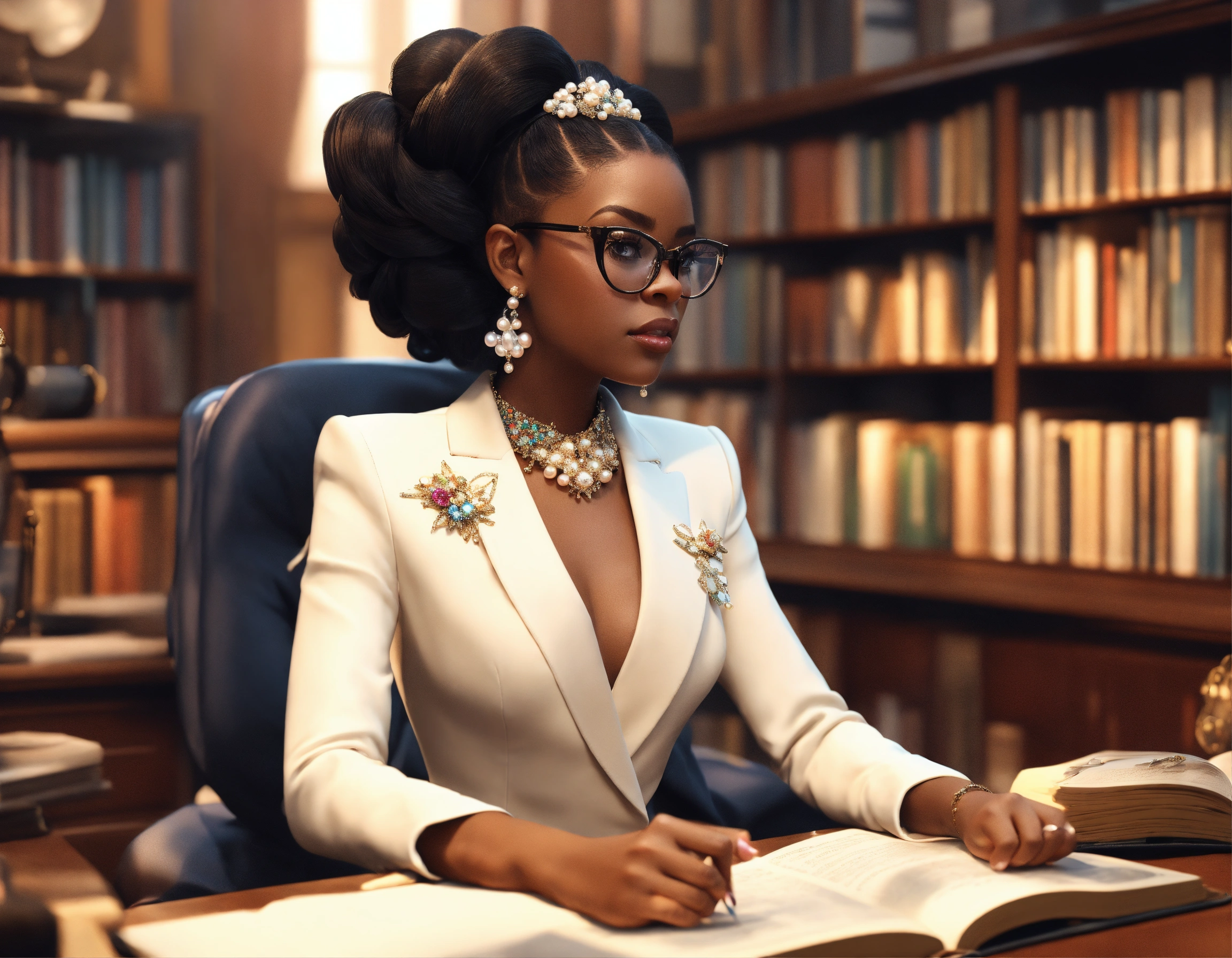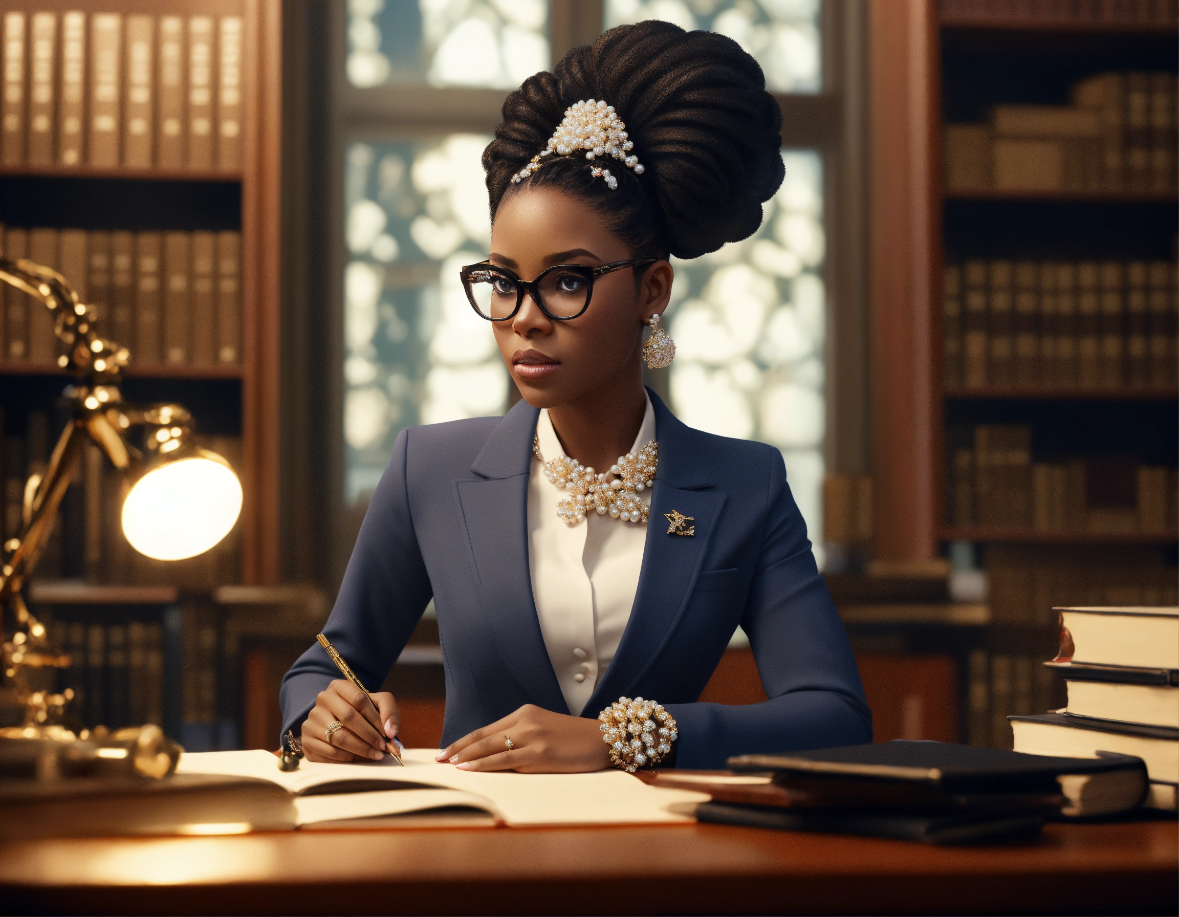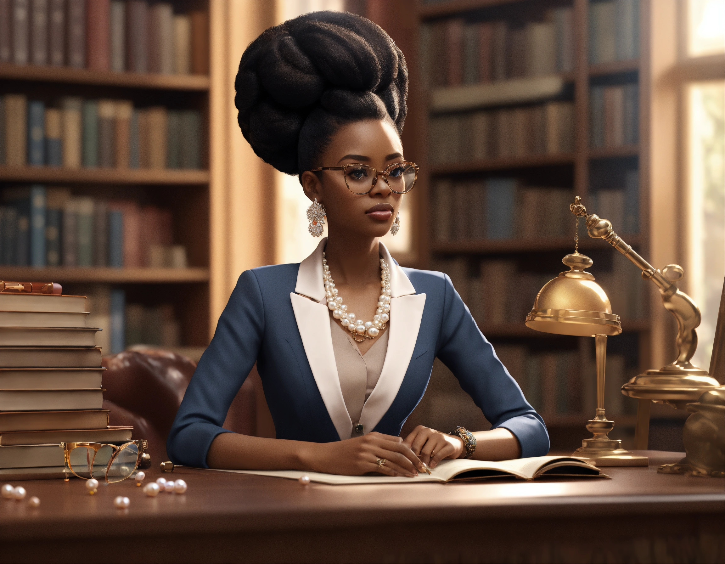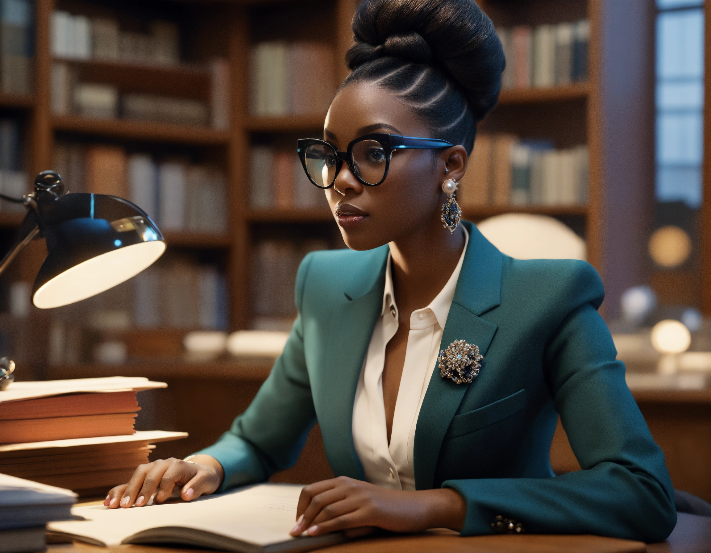 Hd 3d render of an alluring stunning and studious black woman, pearl and gems decorated reverse chignon hair style with oversized cat-eye designer glasses, at the work office, funky oversized lapel detailing in a monotone pants suit, sitting at a desk in a law school library. moe ghibli anime pixar storybook inspired