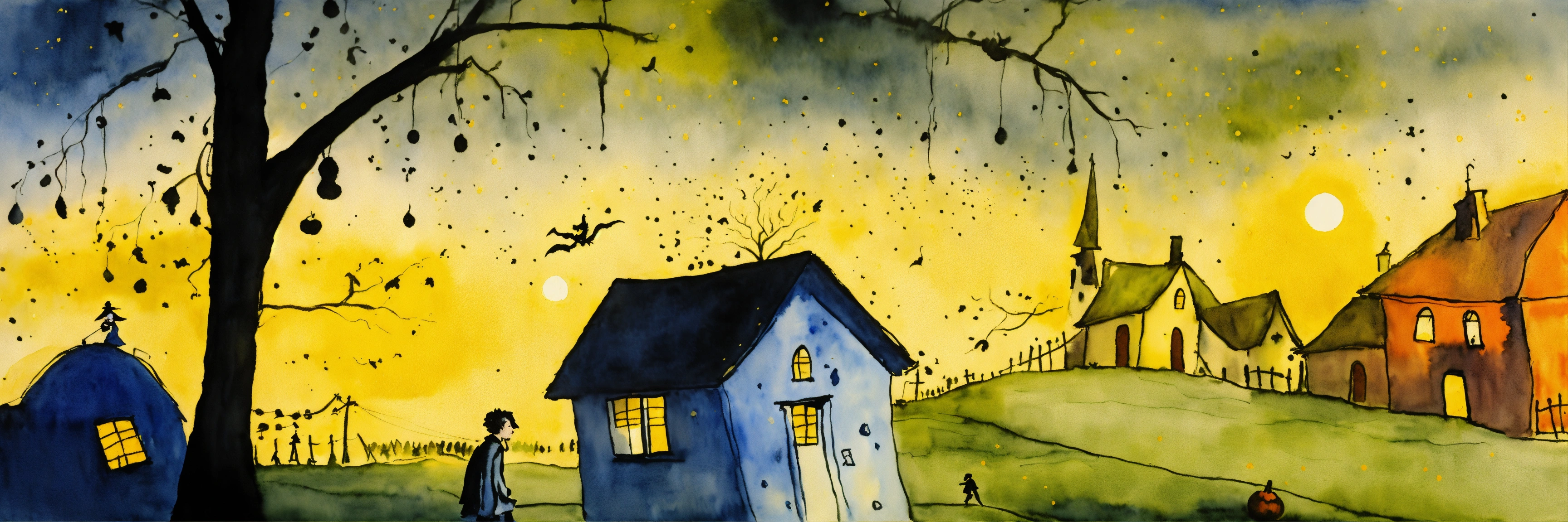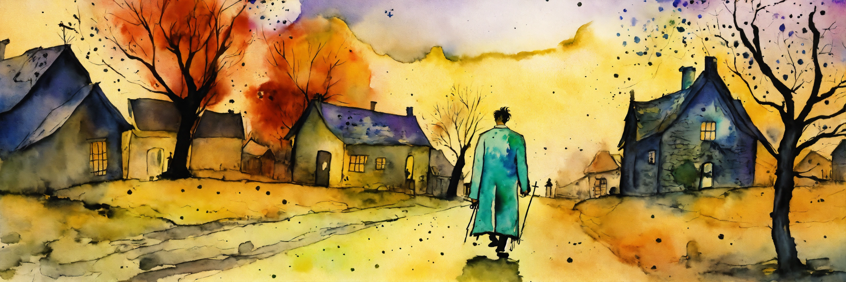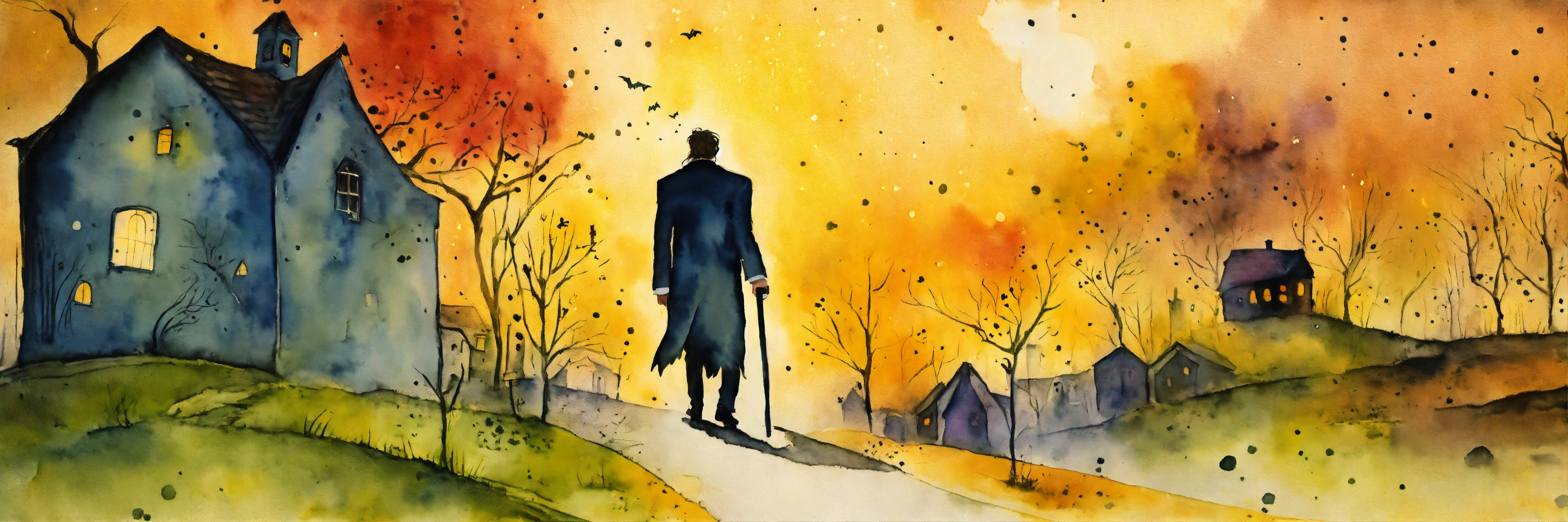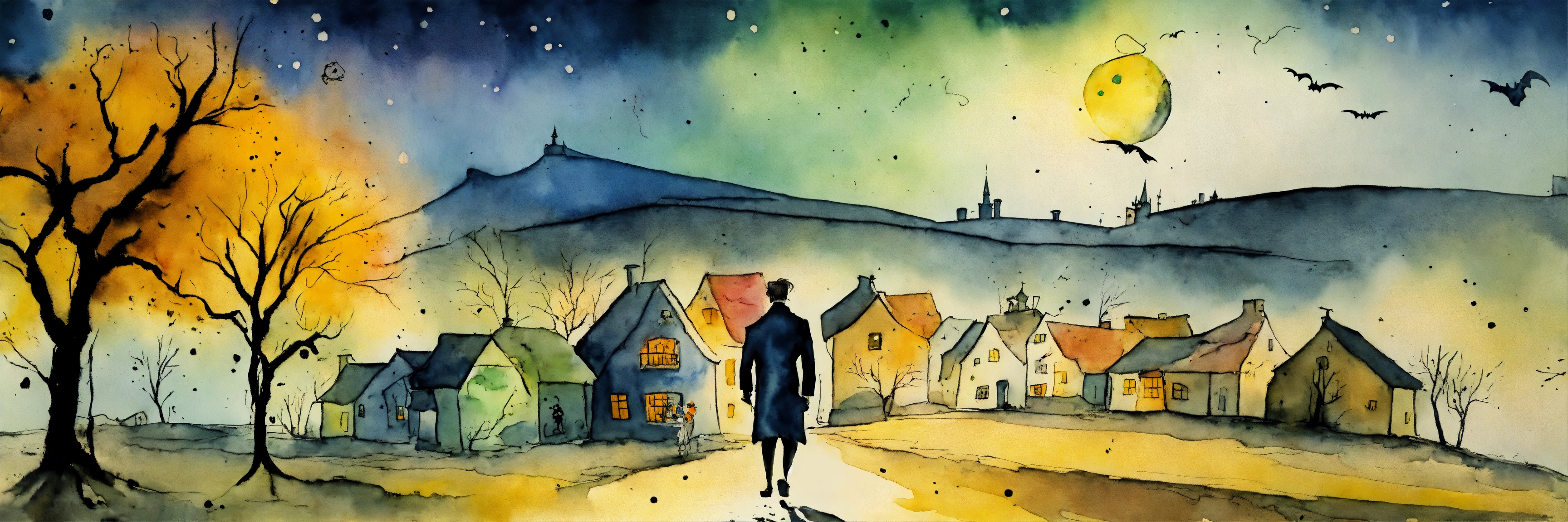 Frankenstein walks through the village on halloween in the style of "long lost tume, by marc chagall and tim burton, watercolour, ink splash art, minimalist, emotional, dynamic, golden speckles, "