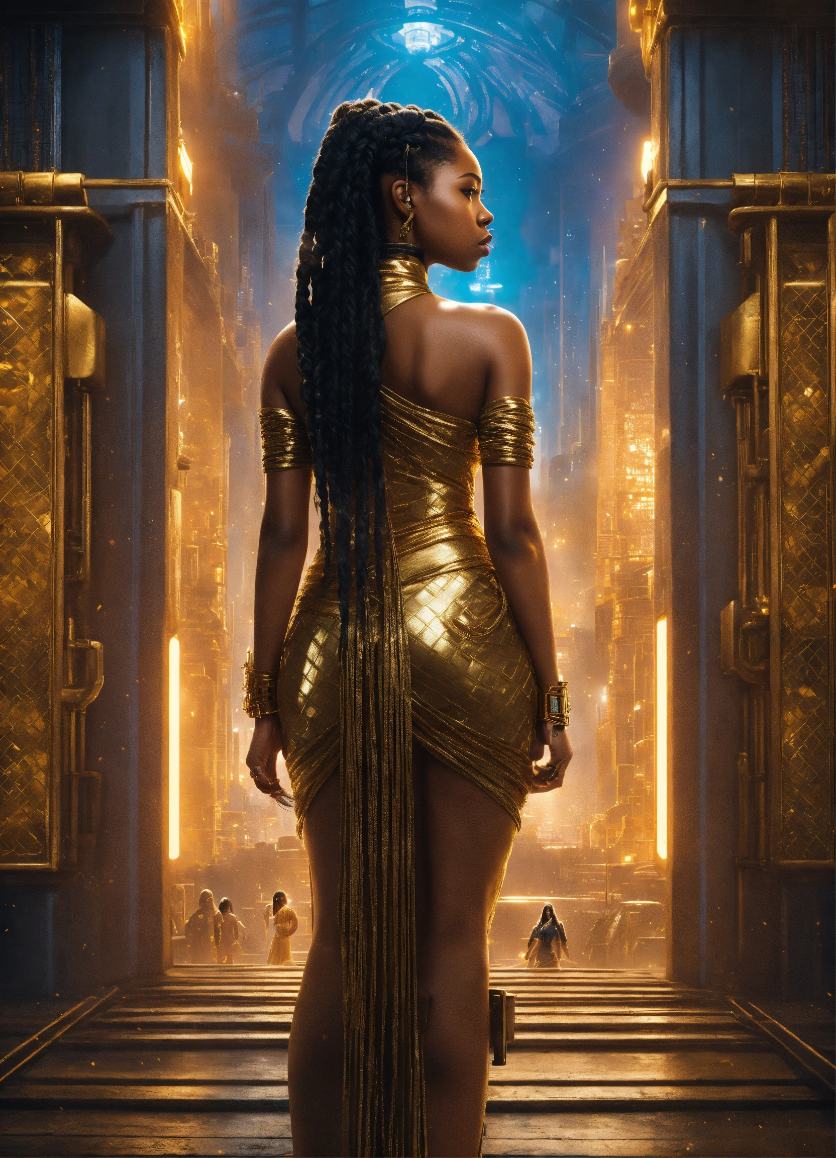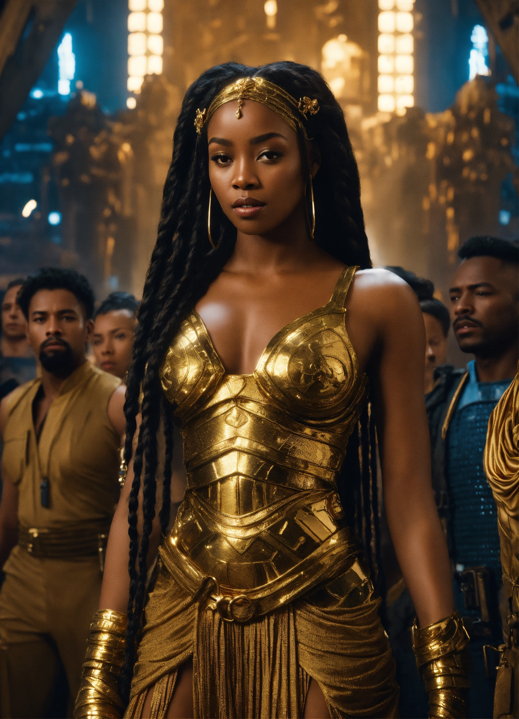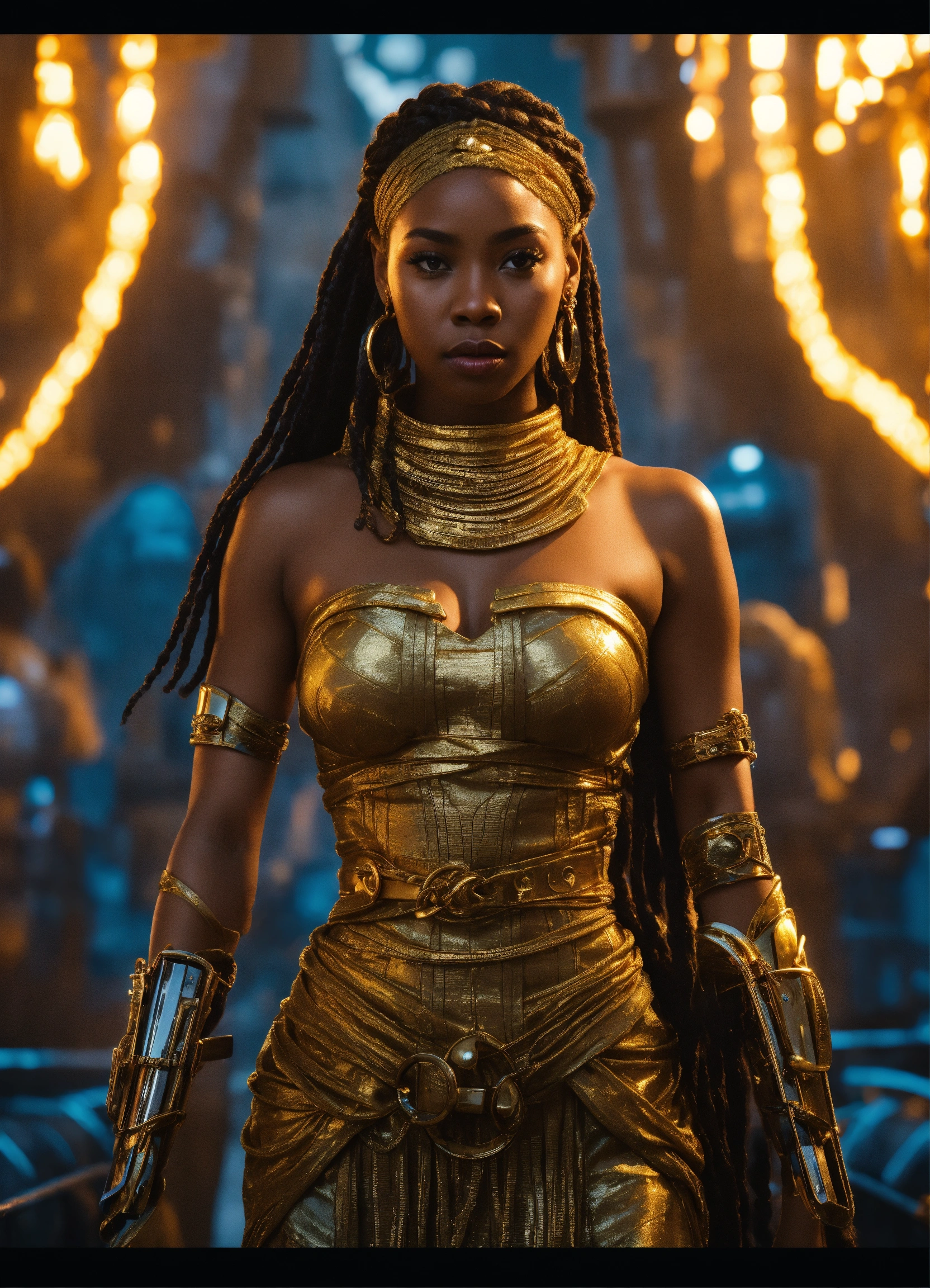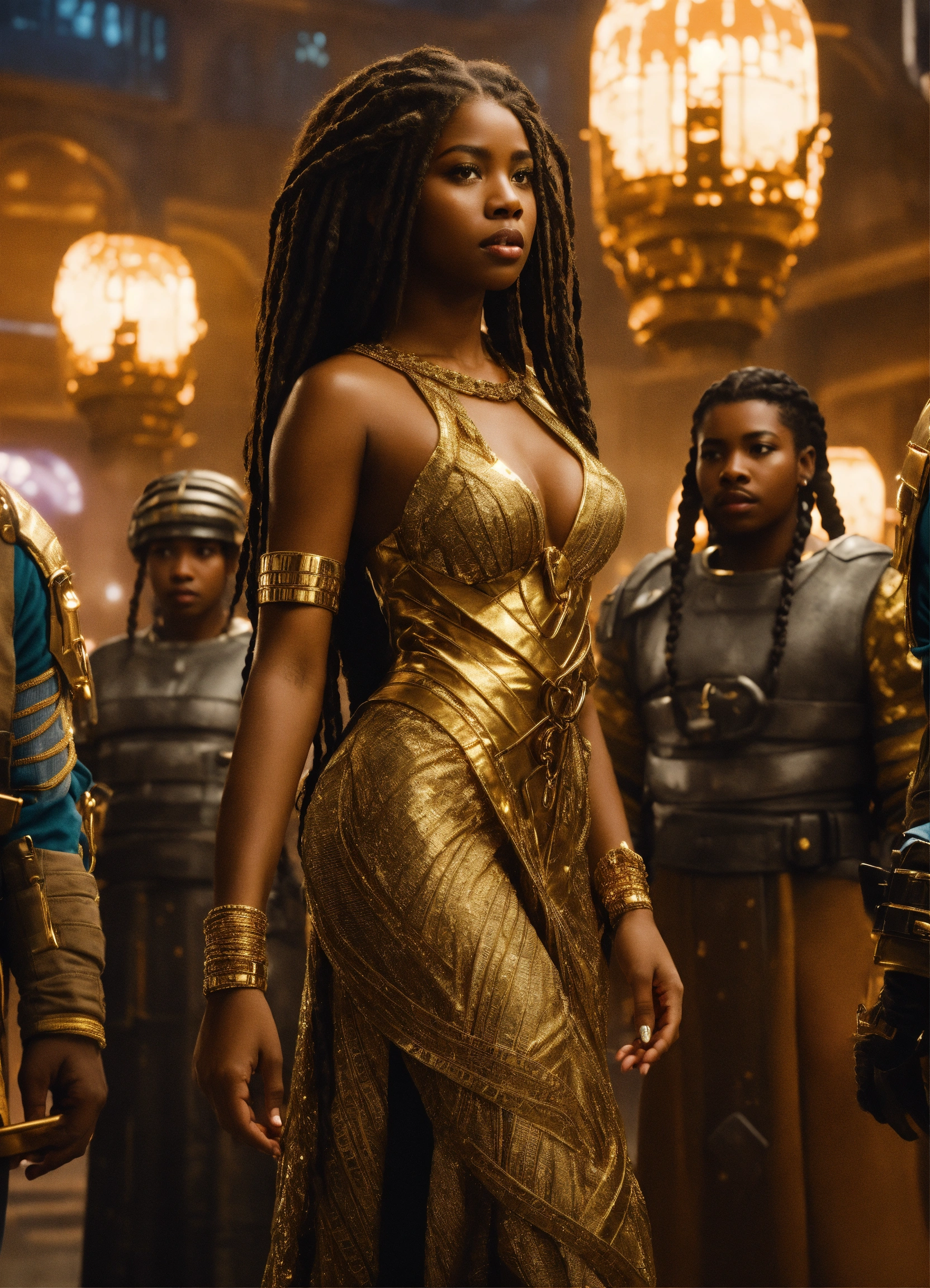 Handcuffed, a beautiful black girl goddess, a beautiful prisoner with long braided hair wearing a gold dress, held captive in on tower in the city of alph from valerian and the thousand planets with monstrous prison guards and alpha in the background, resolution 8k, insanely detailed