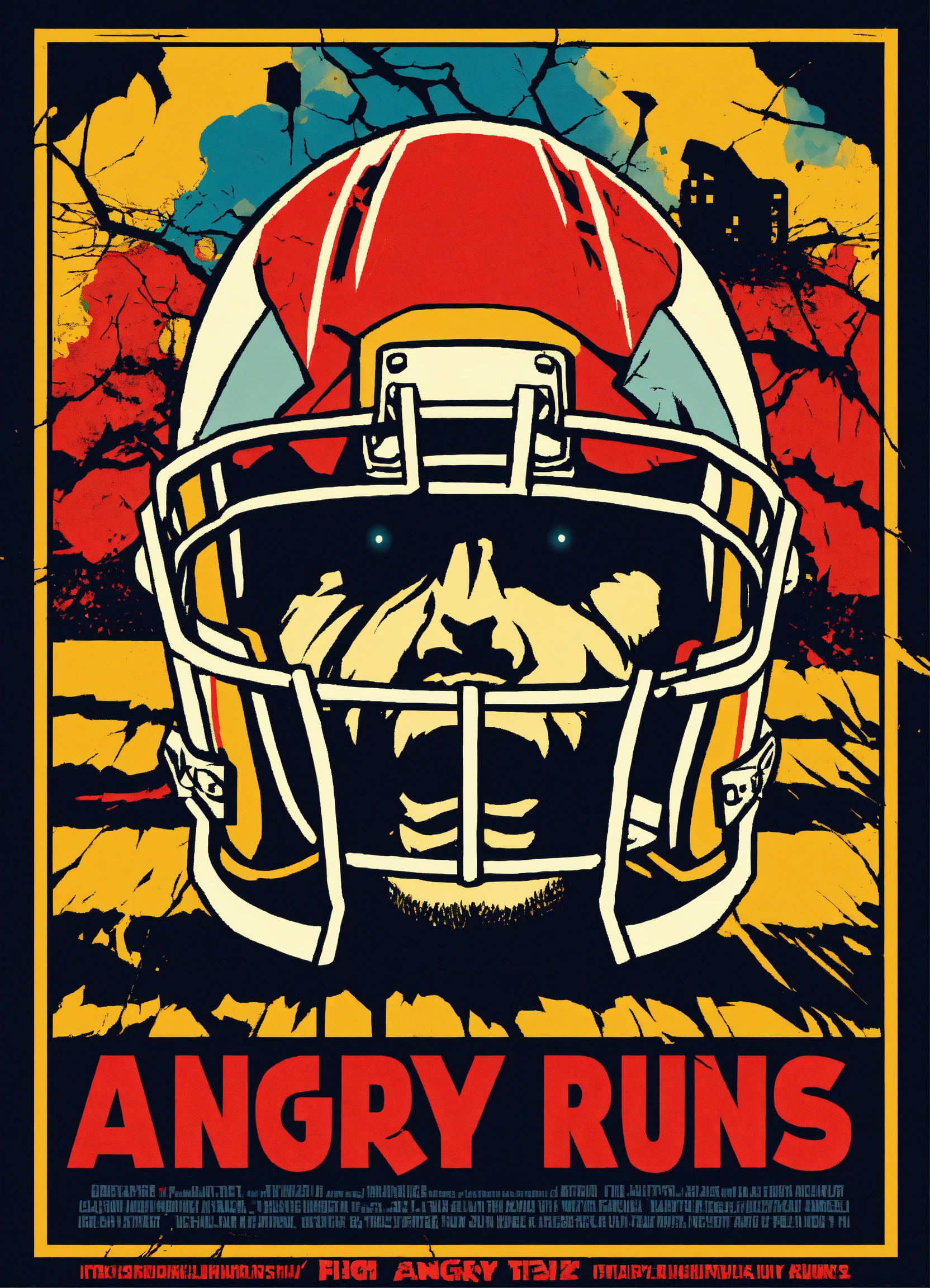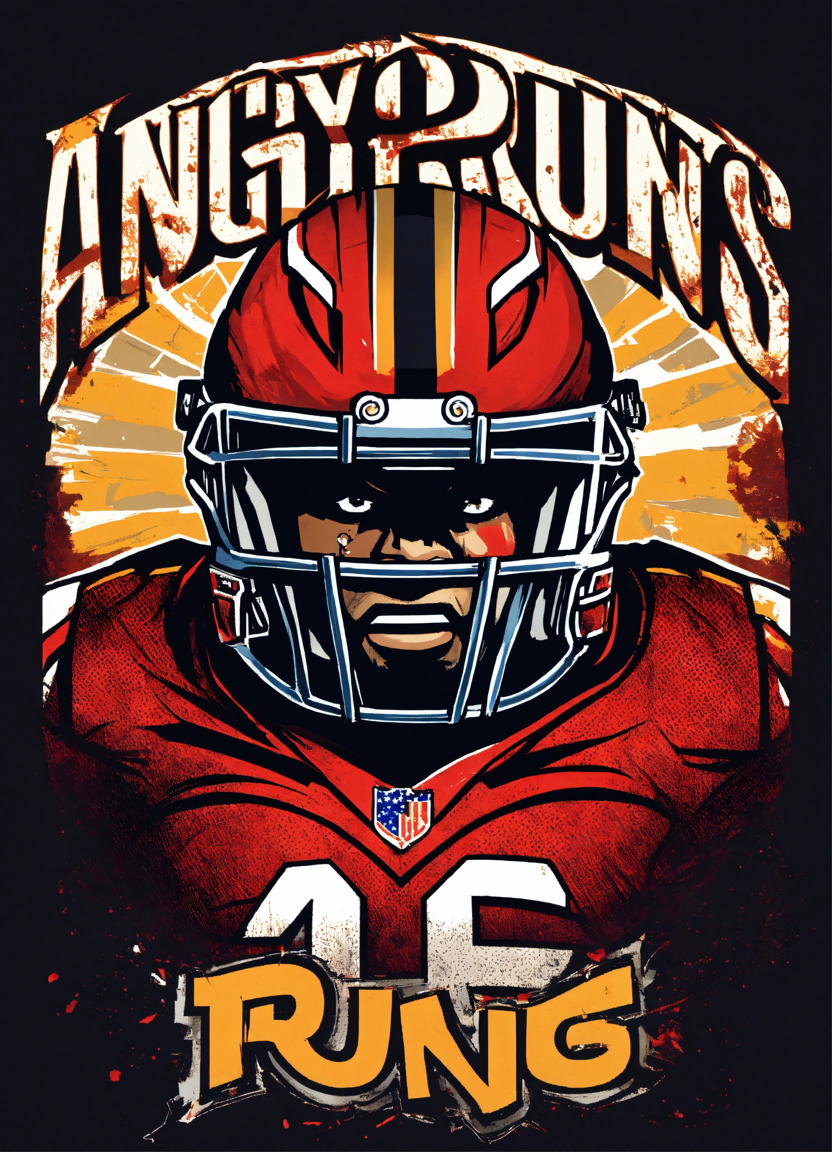 Distressed design for a black t-shirt with the text "angry runs" in a colorful font. the design should be eye-catching and visually appealing, and it should convey the meaning of the term "angry runs, " which is a football term used to describe a determined and aggressive ball carrier who refuses to go down easily. us flag in background here are some specific ideas for the design the text "angry runs" could be written in a large, bold font in the center of the shirt. the text could be surrounded by a distressed effect, such as cracks or tears in the fabric. the text could be colored in a variety of bright colors, such as red, orange, and yellow. the design could also include other football-related elements, such as a football helmet, cleats, or a yard line. overall, the design should be eye-catching and visually appealing, and it should convey the meaning of the term "angry runs."