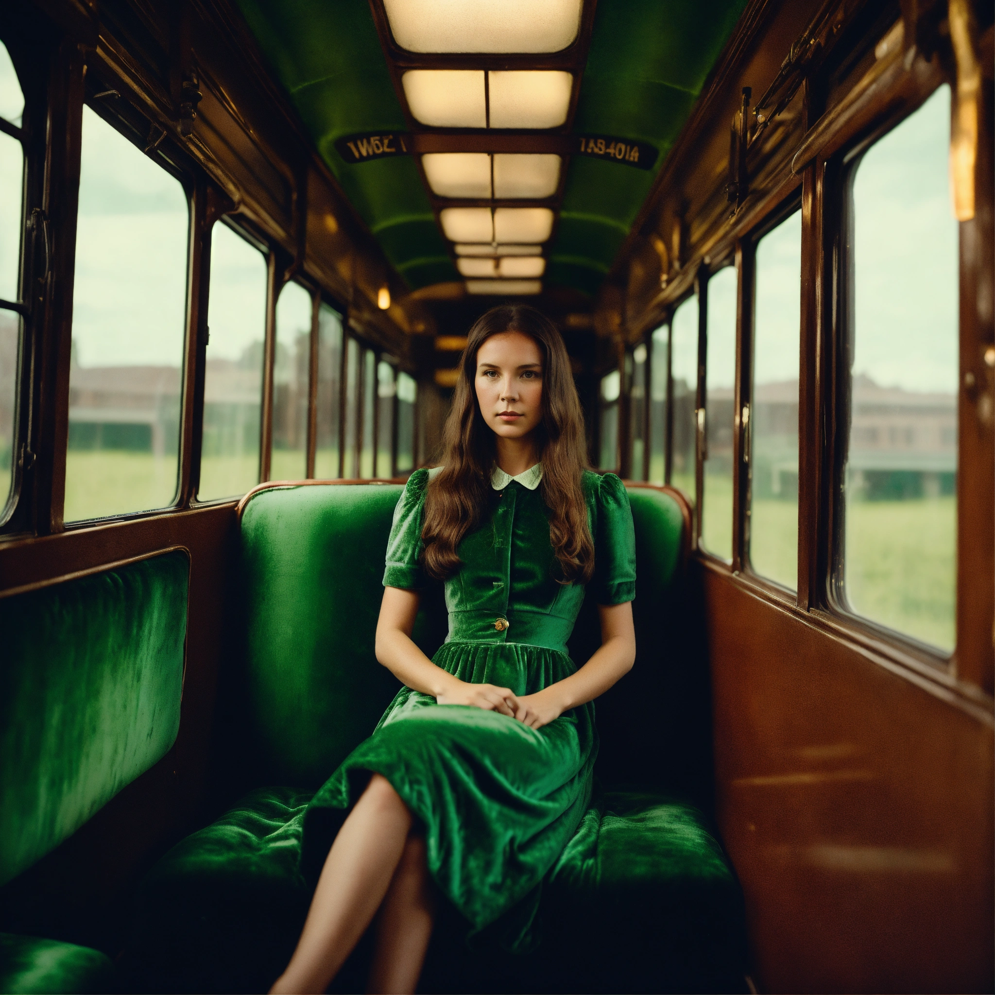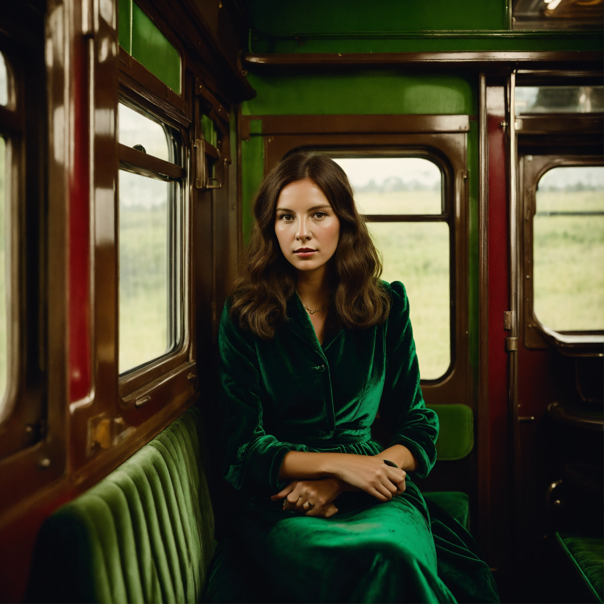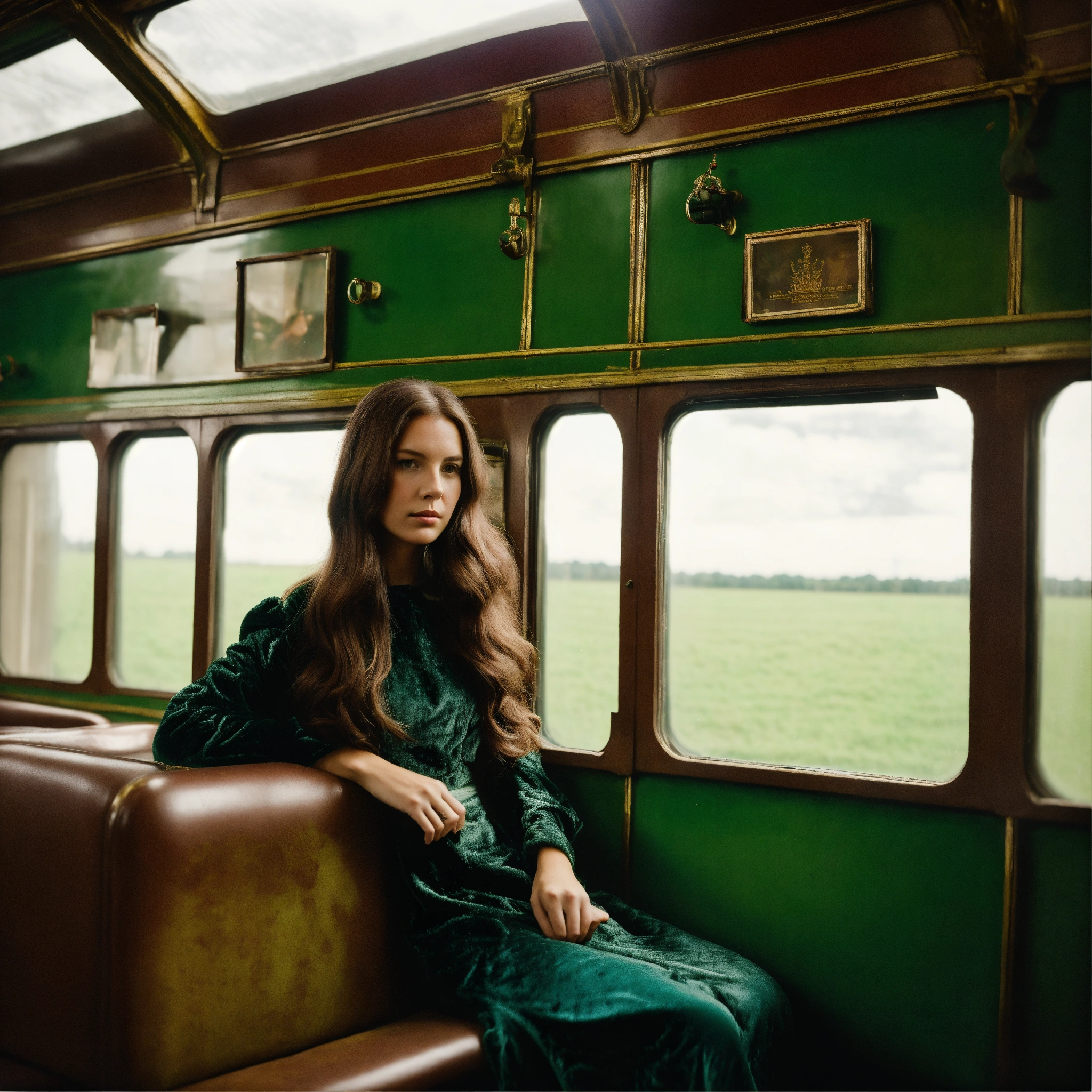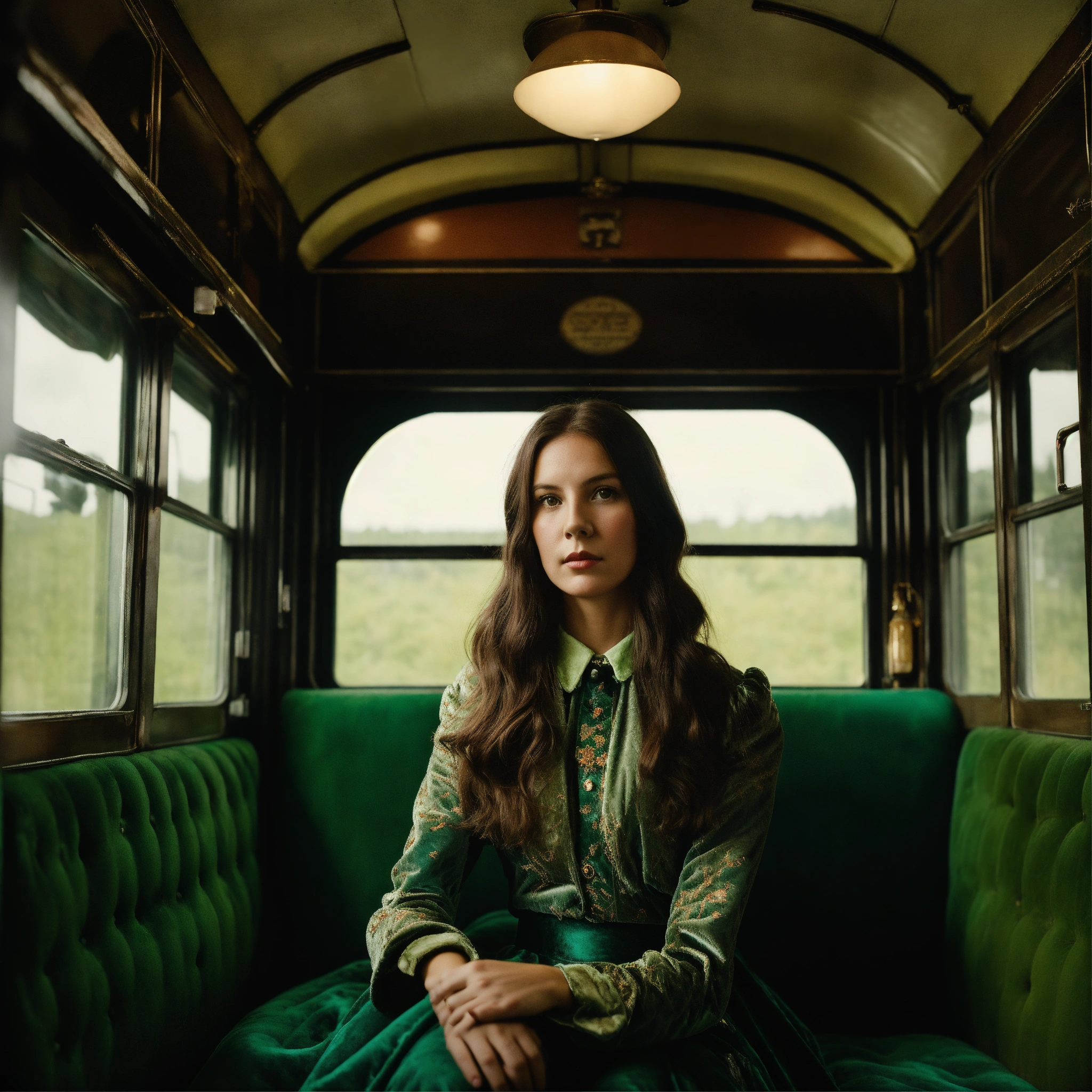 A tintype photograph of a woman with long brown hair sitting in a vintage train carriage with green velvet seats on either side of the window, wes anderson colour grading
