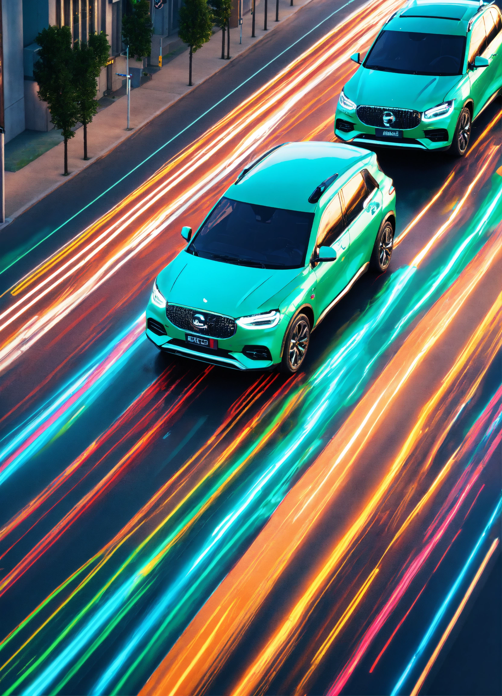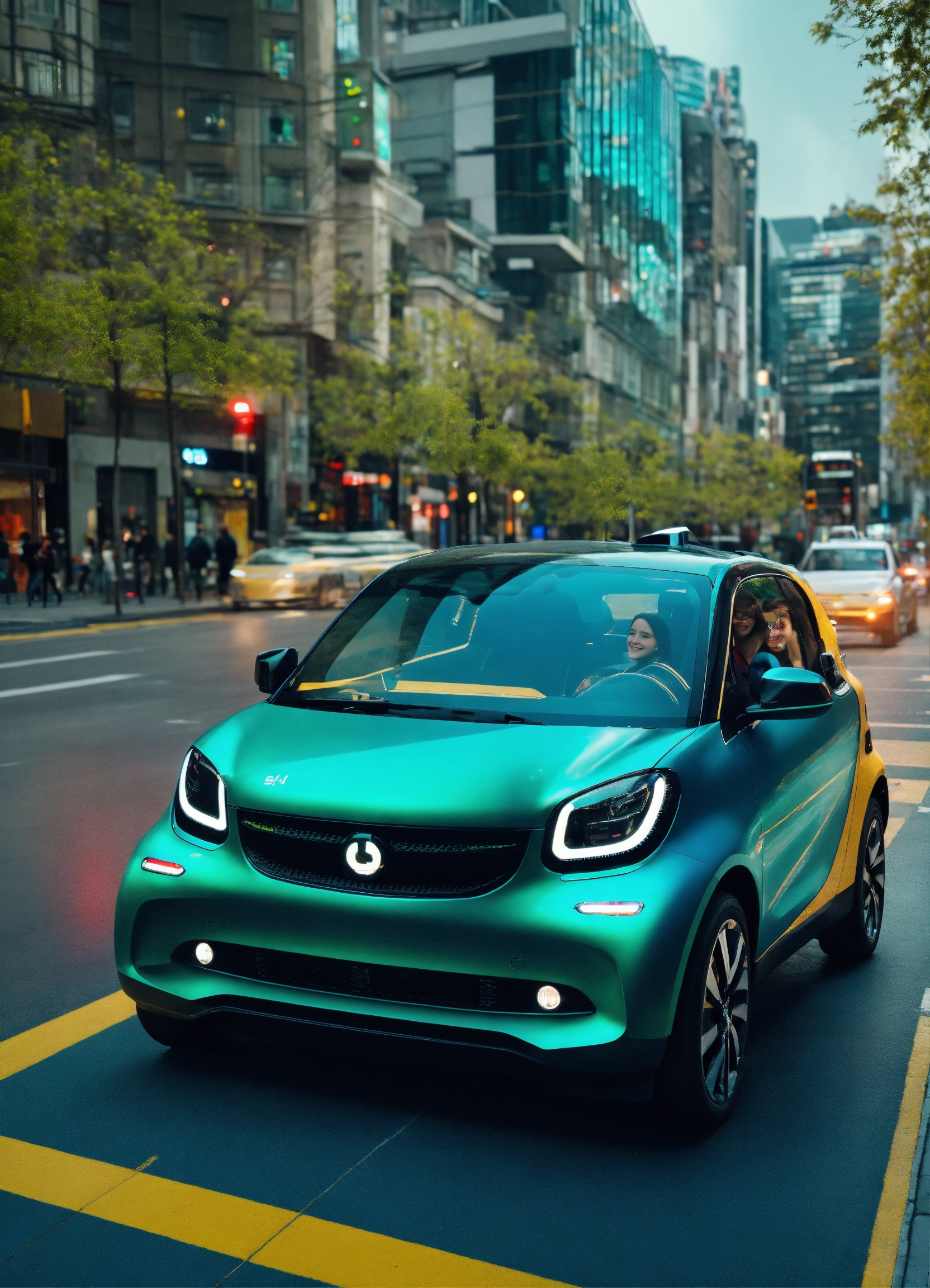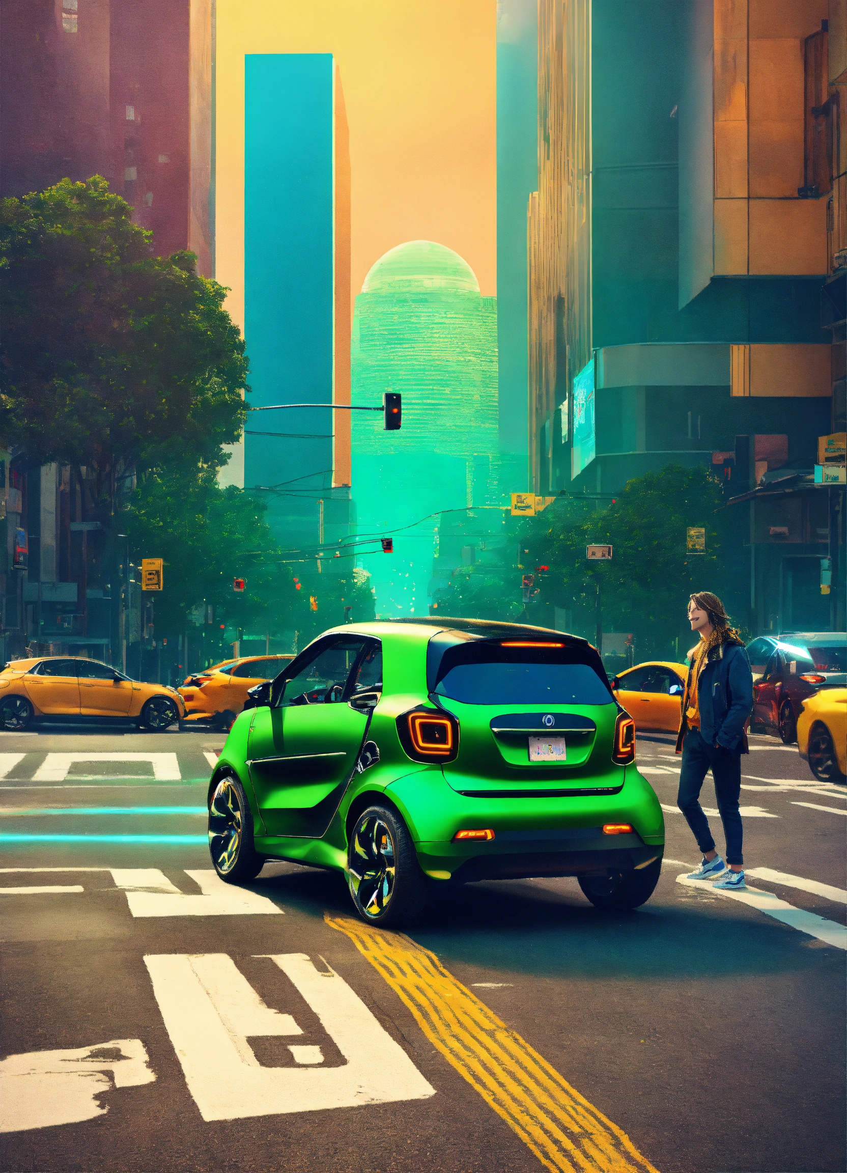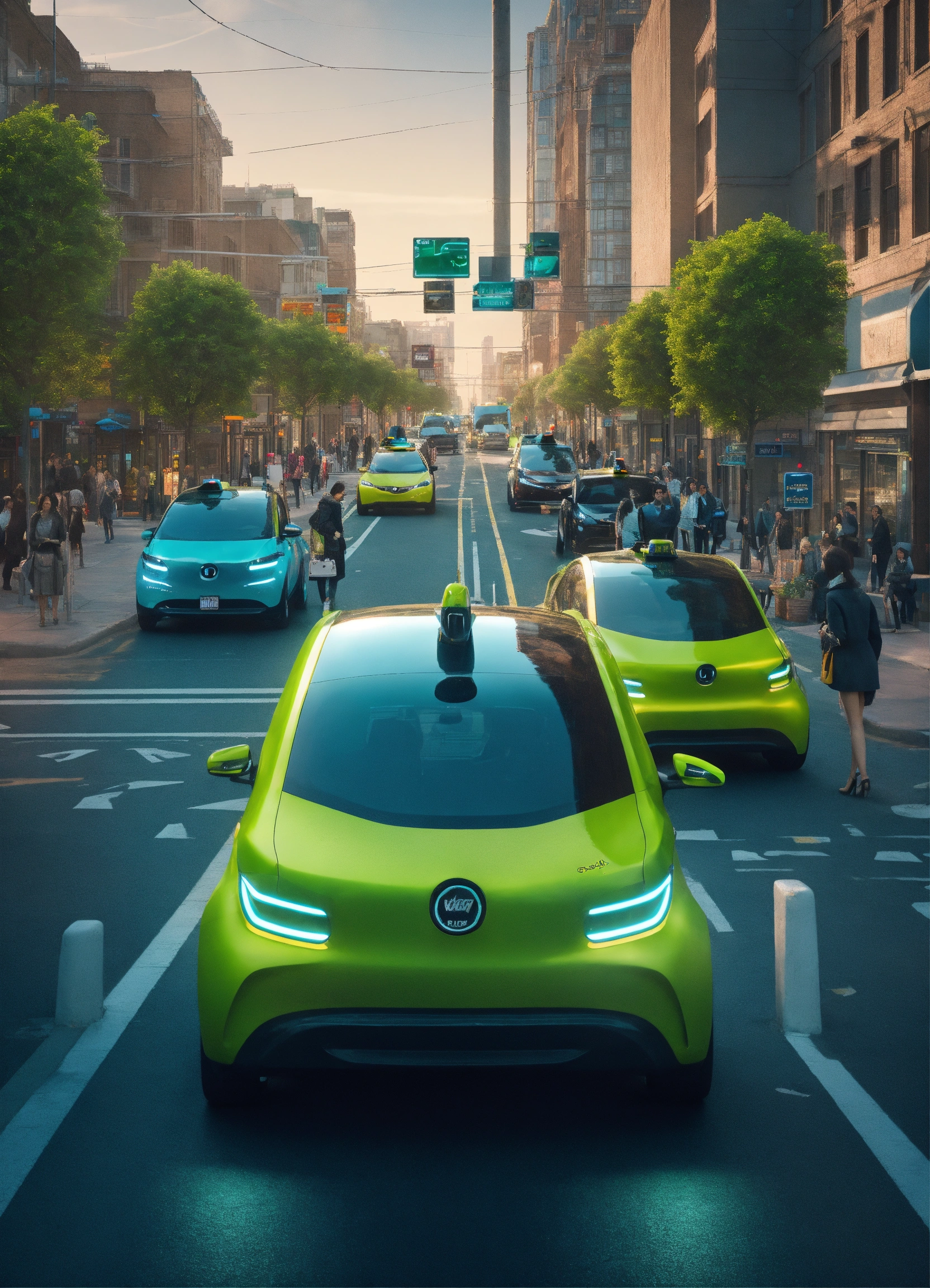 Smart city, self driving cars, robo taxis, electrical cars, clean city, people crossing streets, ideal future city, new technology, smiling, street in the car viewer, photo, colors, green, blue, cyan, medium shot fashion, award winning photography, arty pose, fashion, high definition, high resolution, muted colors, volumetric lighting, 8k, 3d render