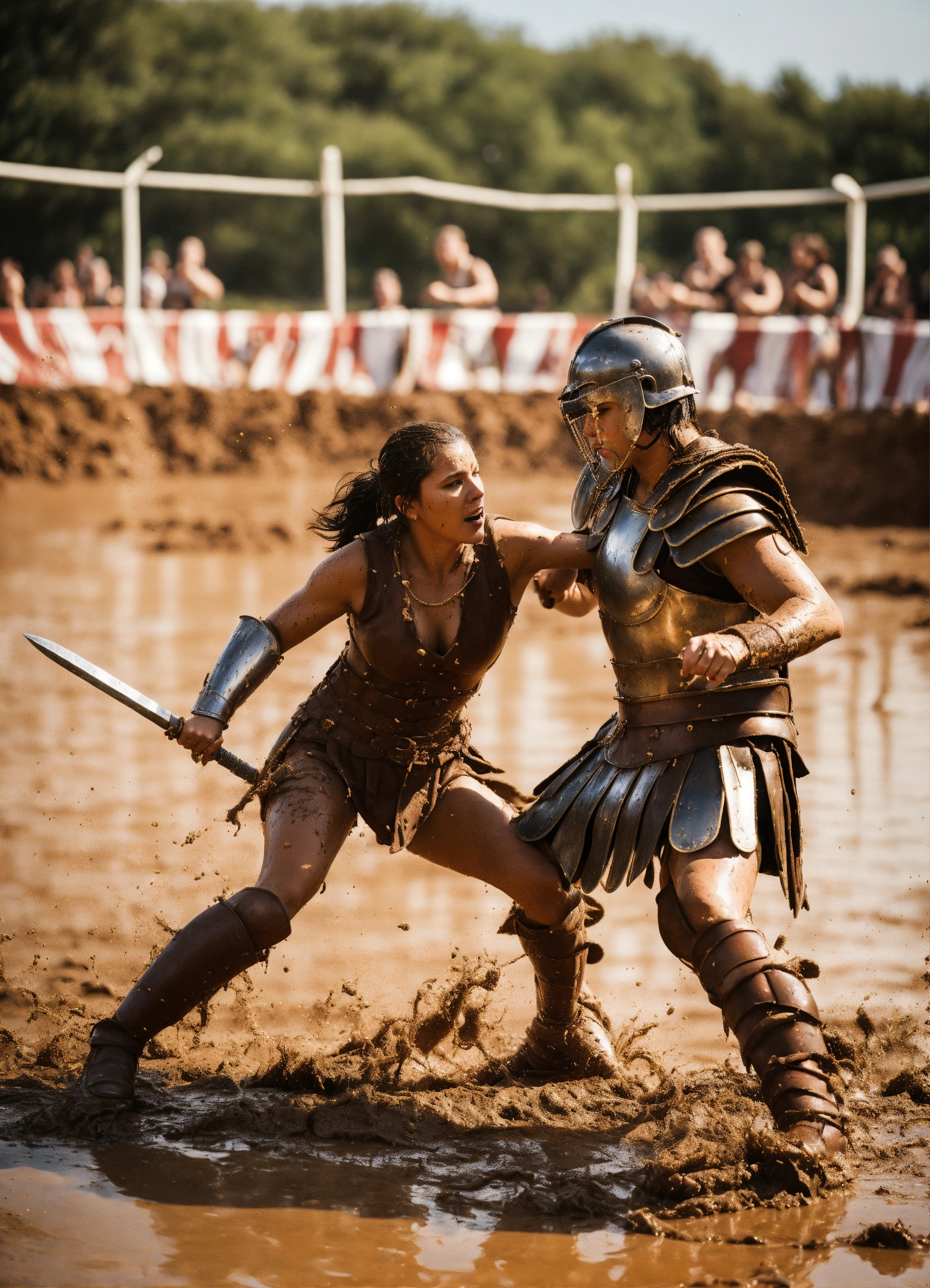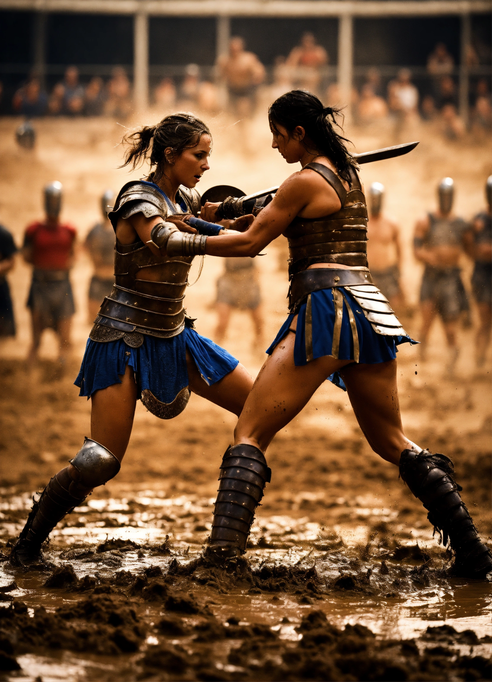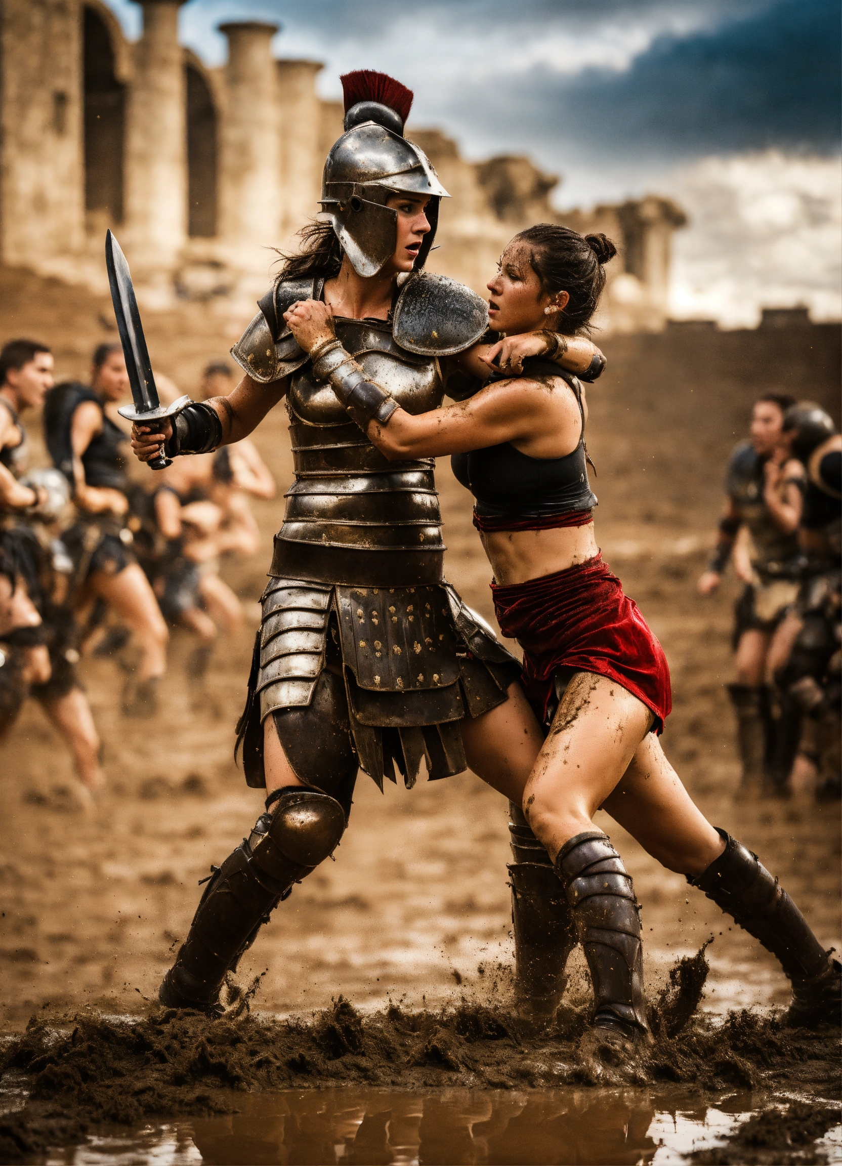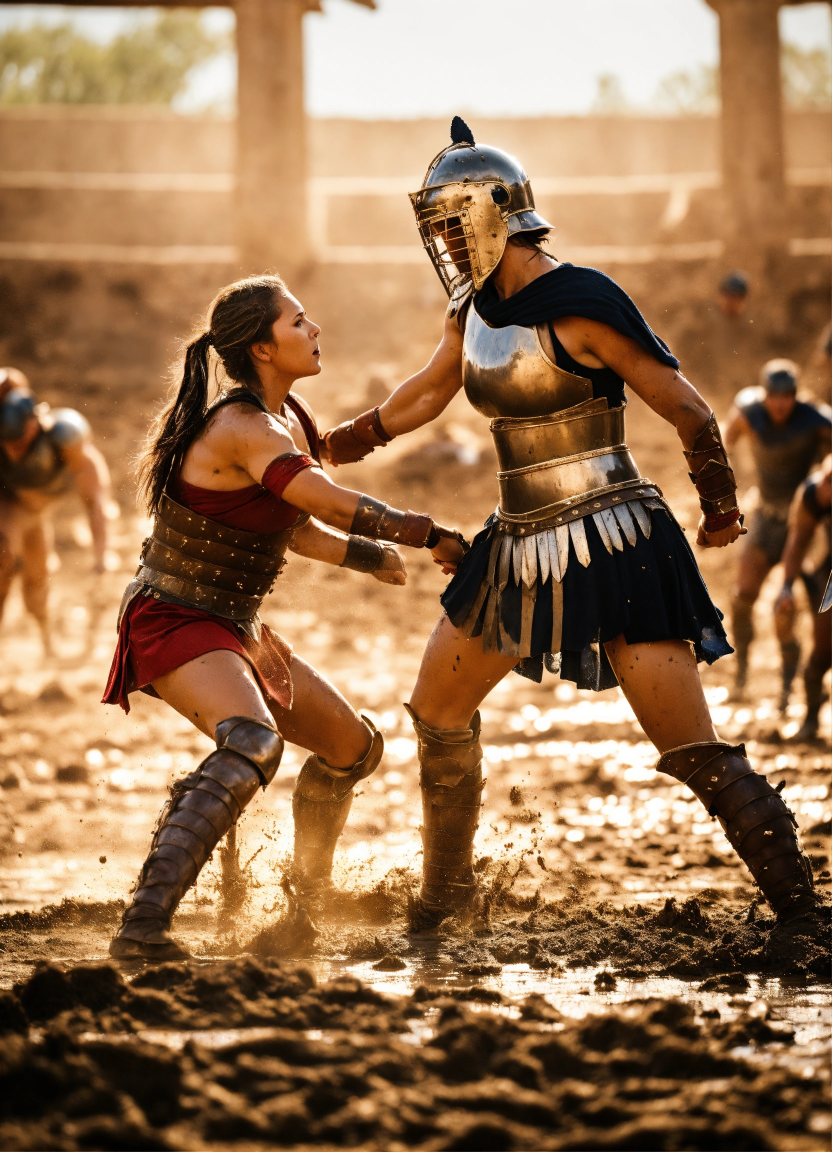 Athletic female wearing gladiator armor fighting another roman gladiator in the mud in an arena in hand-to-hand combat