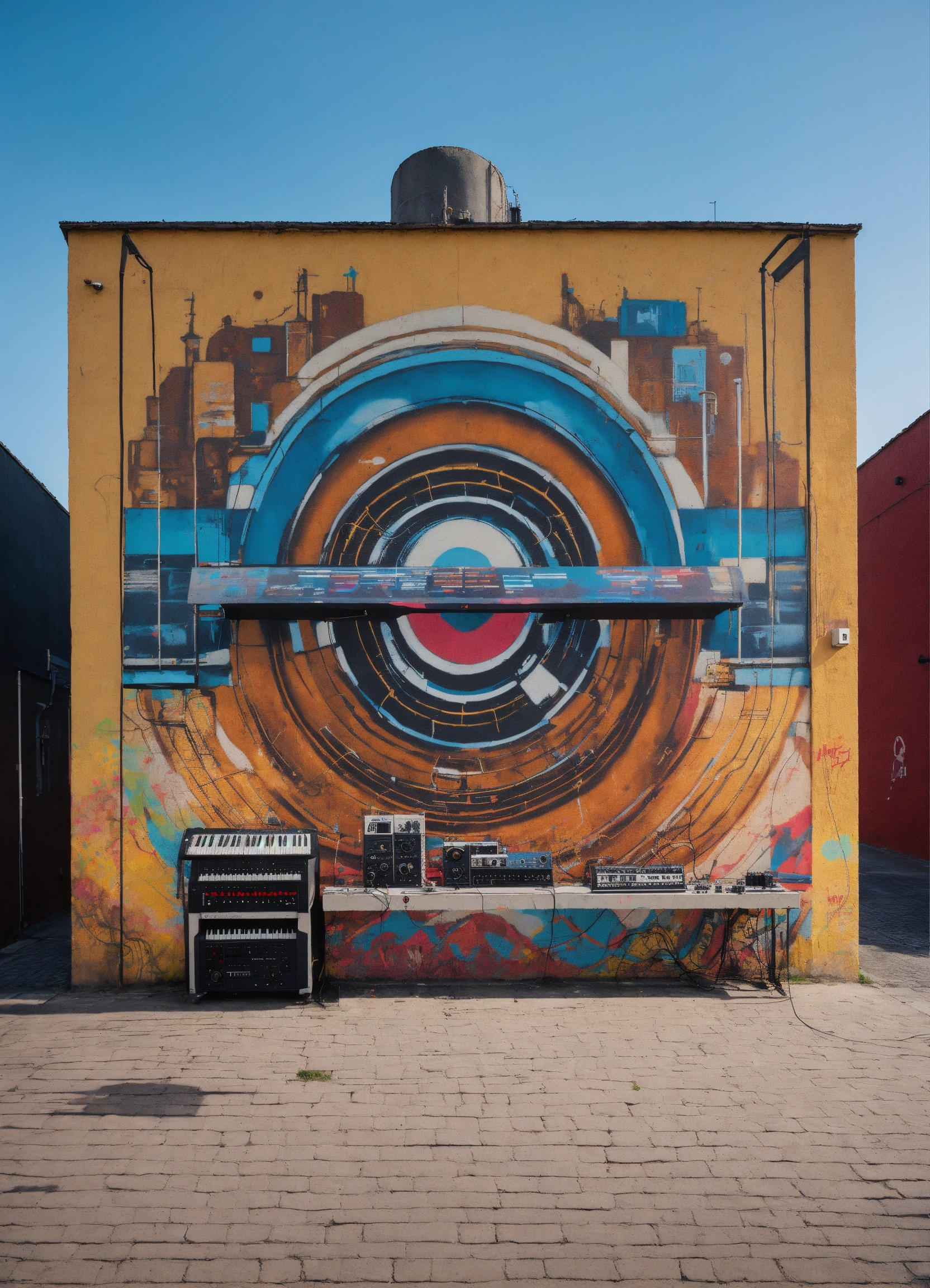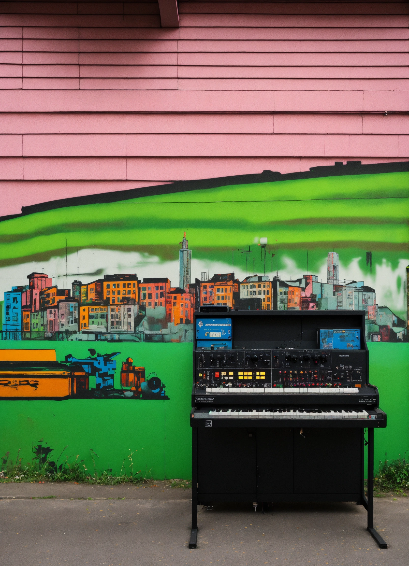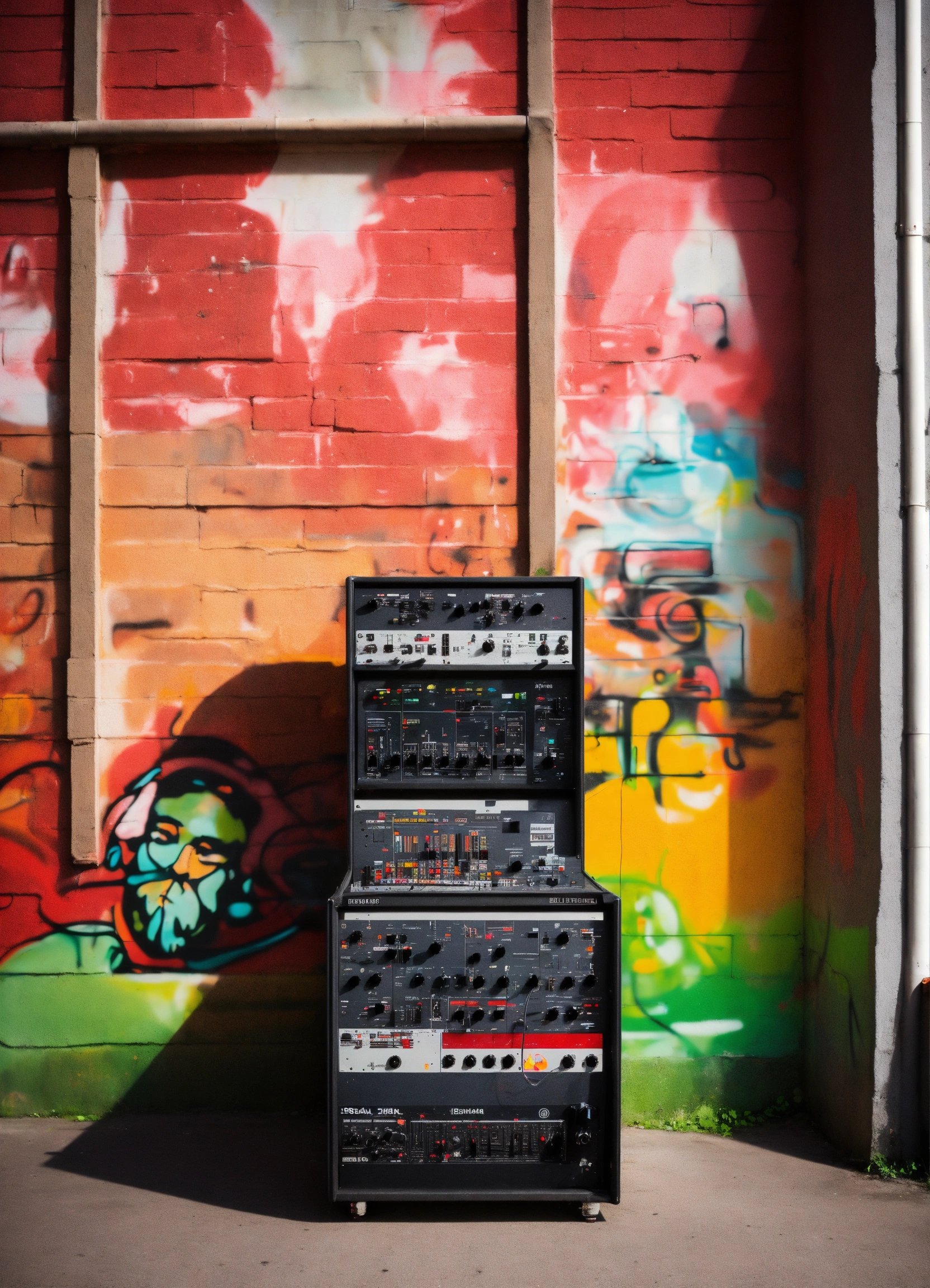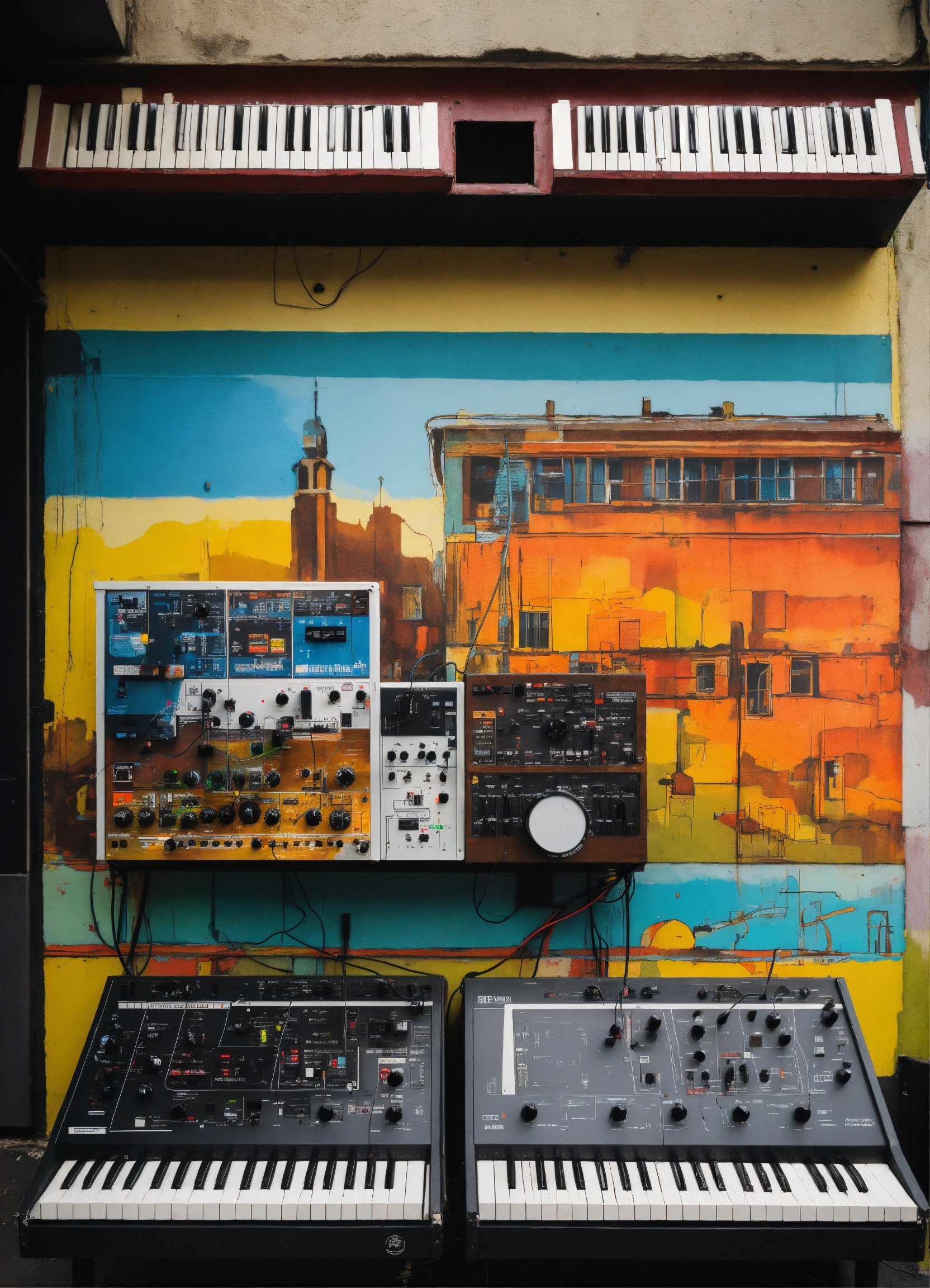 Analog synthesizers for vintage minimal techno music producer with street art mural