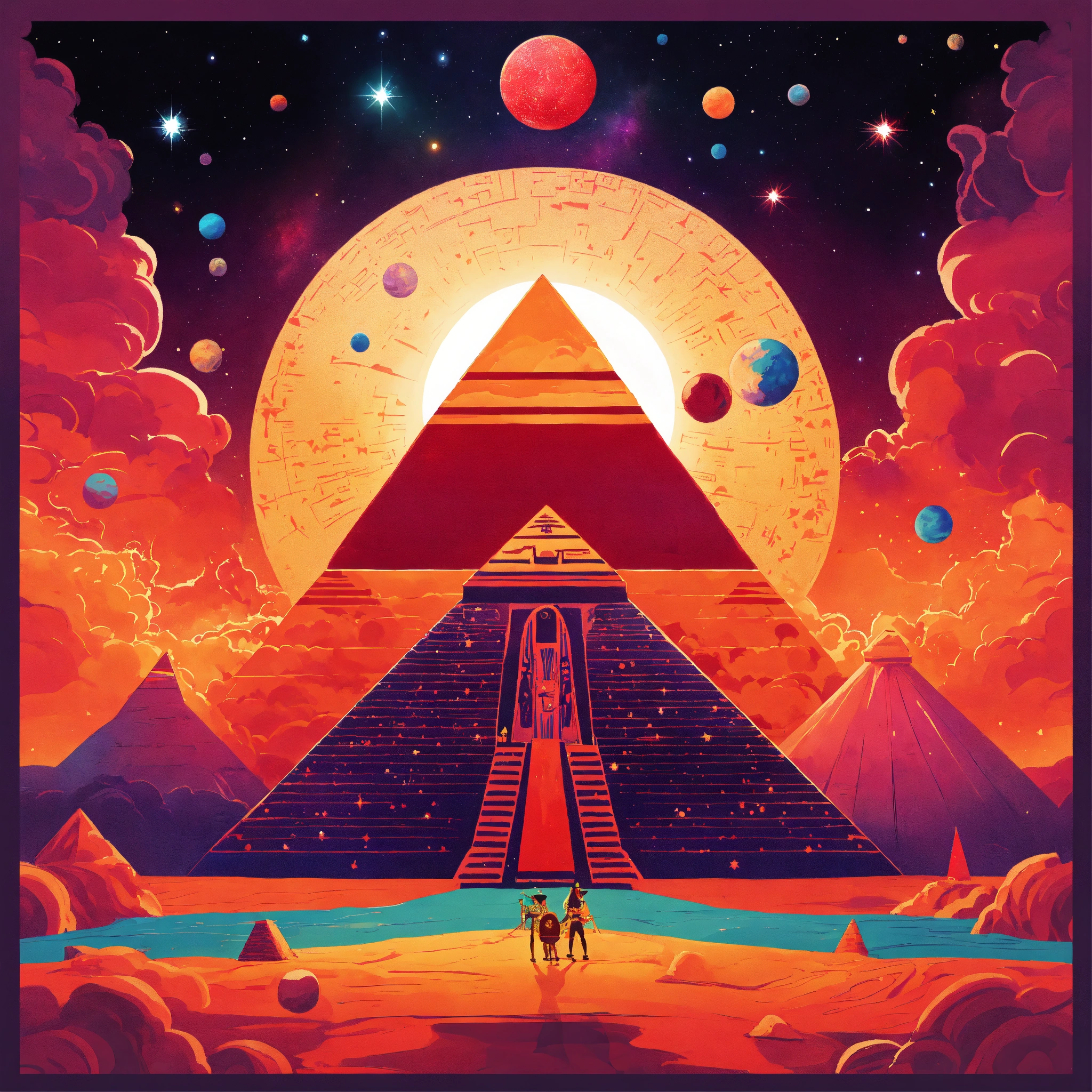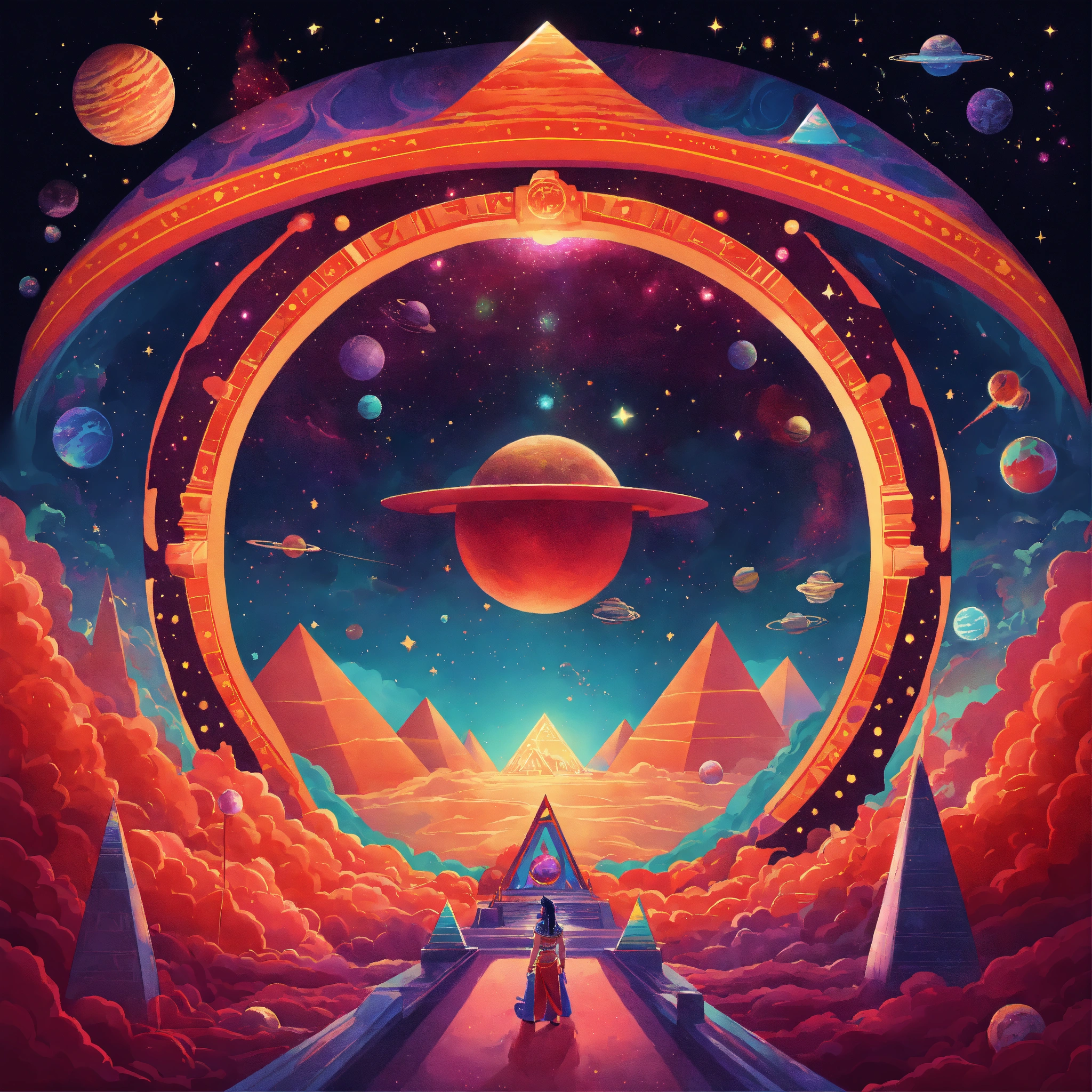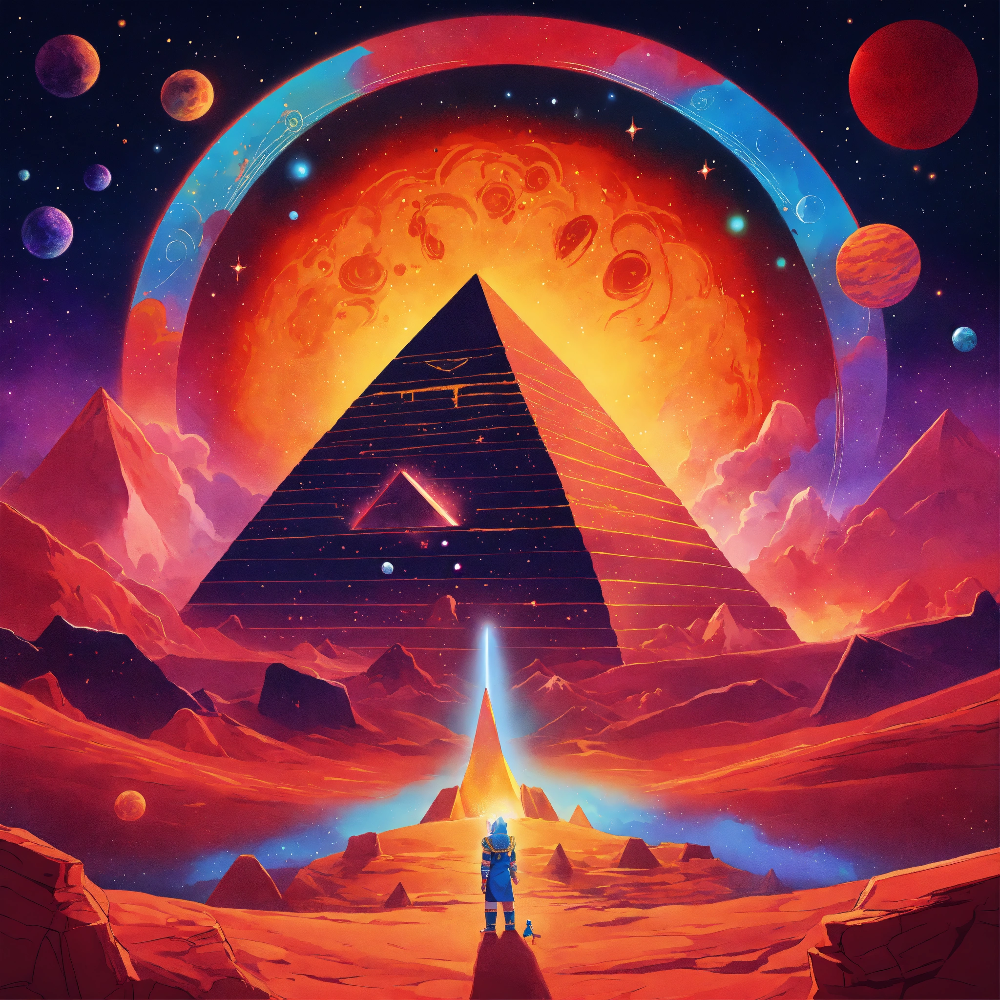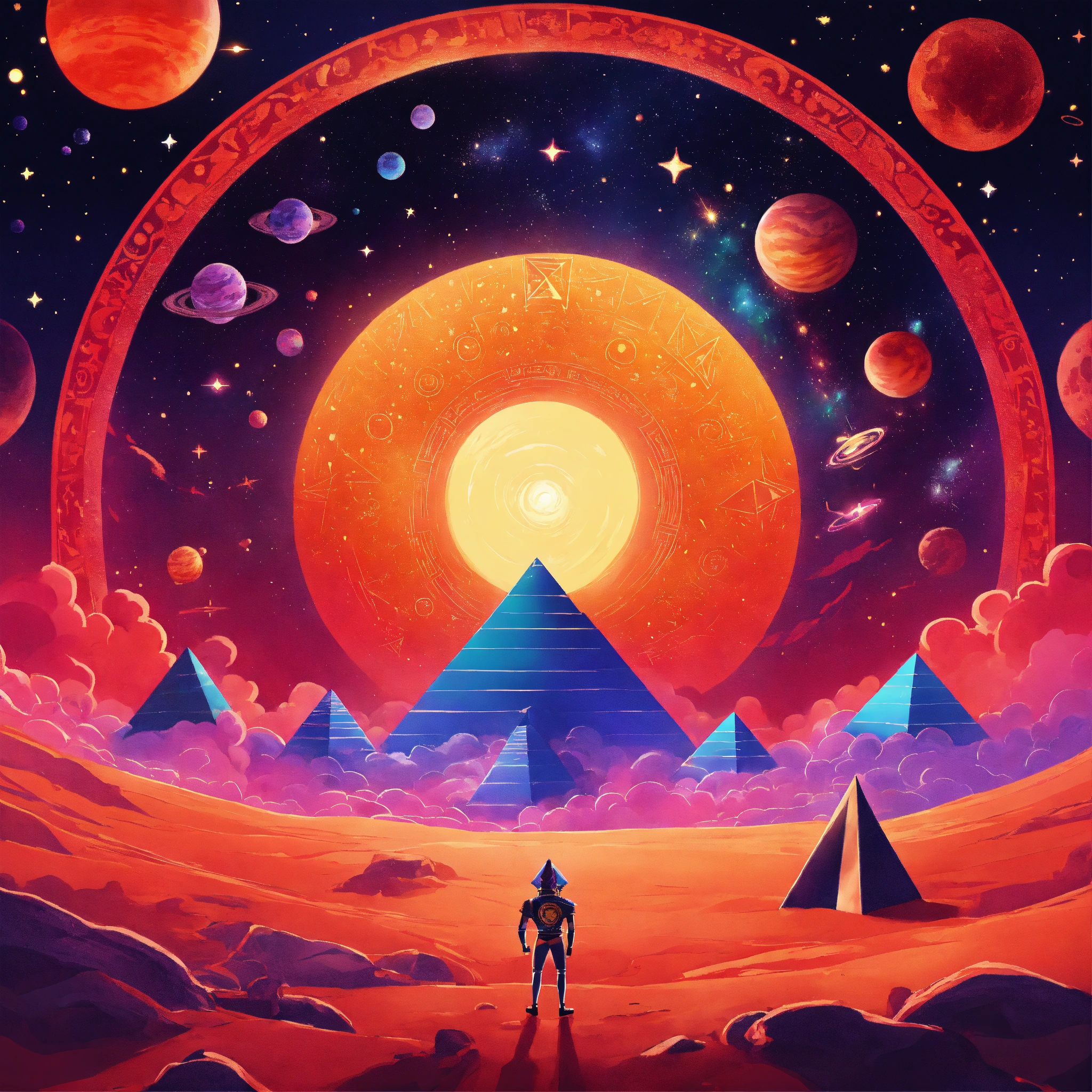Create a vibrant, cartoon-style poster depicting a whimsical, vast cosmic void brimming with red and black nebulous mists and twinkling cartoonish stars. in the center, a pharaoh lost in space. around him, several stylized pyramids with bright colors and whimsical patterns, each acting as a portal to a different, fantastical cartoon dimension.