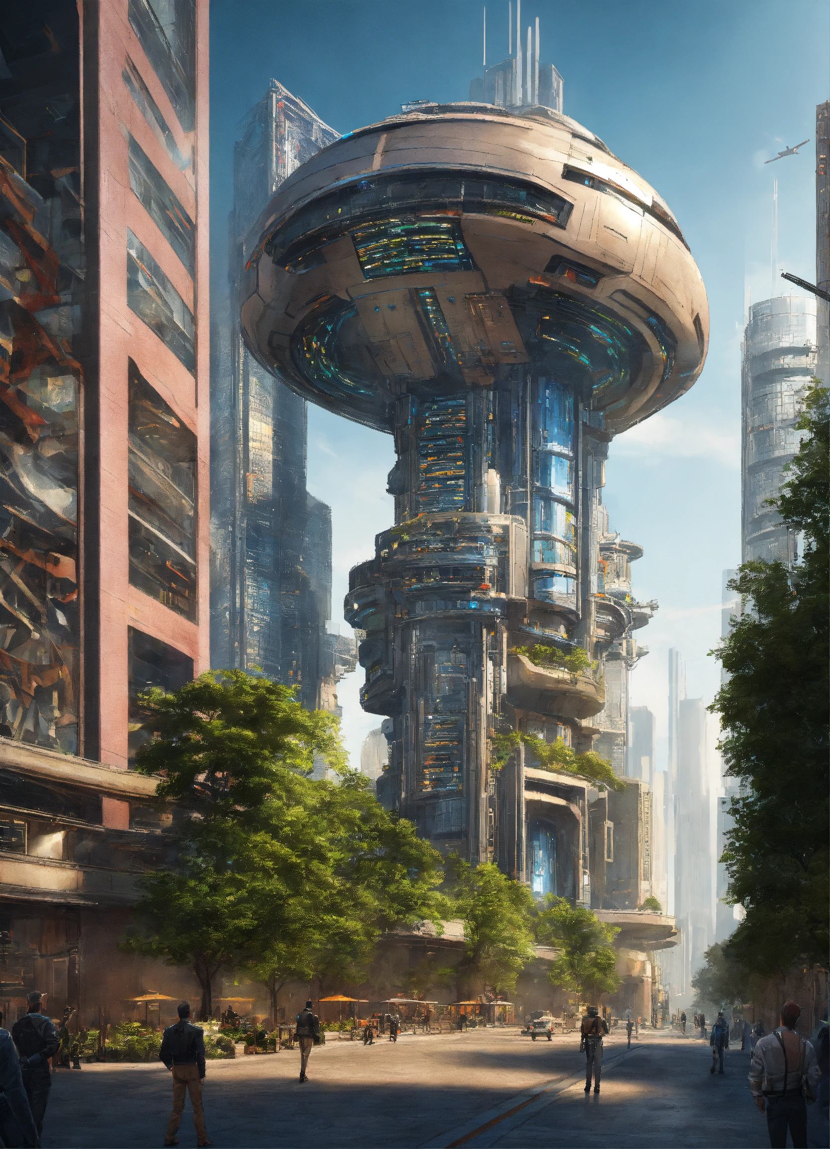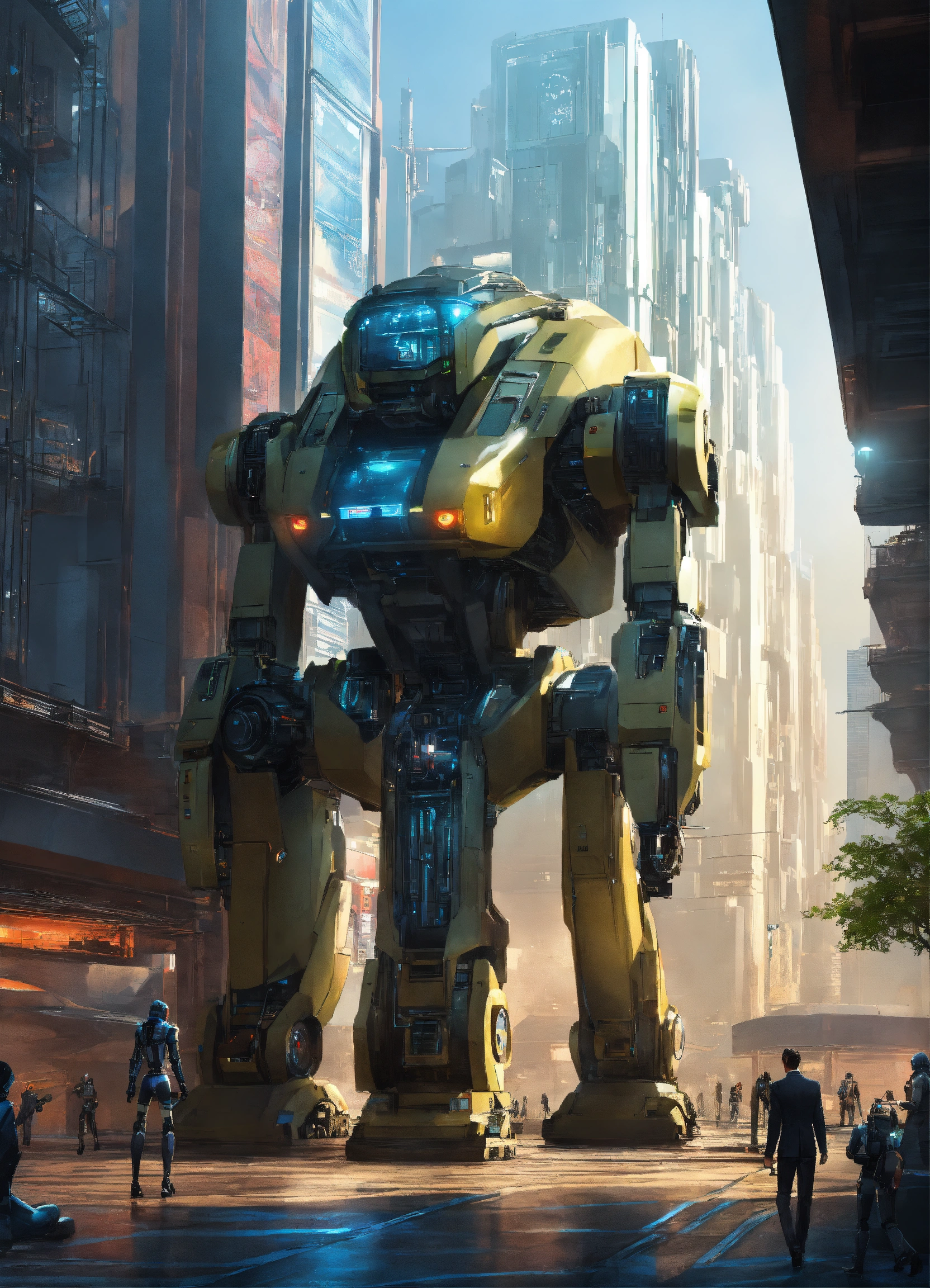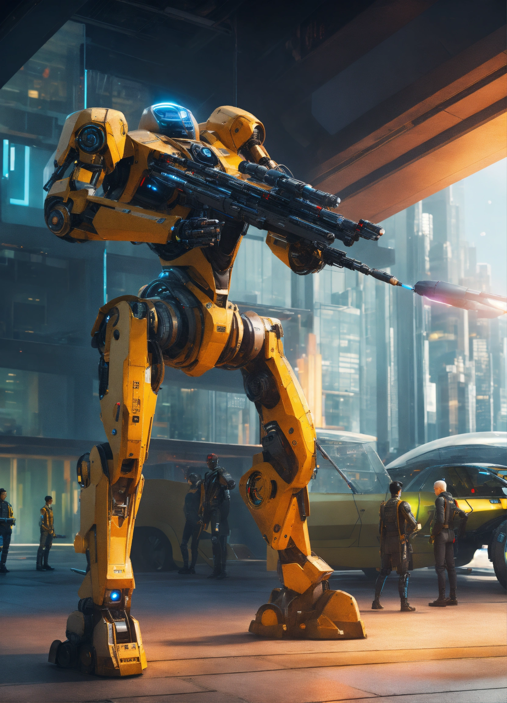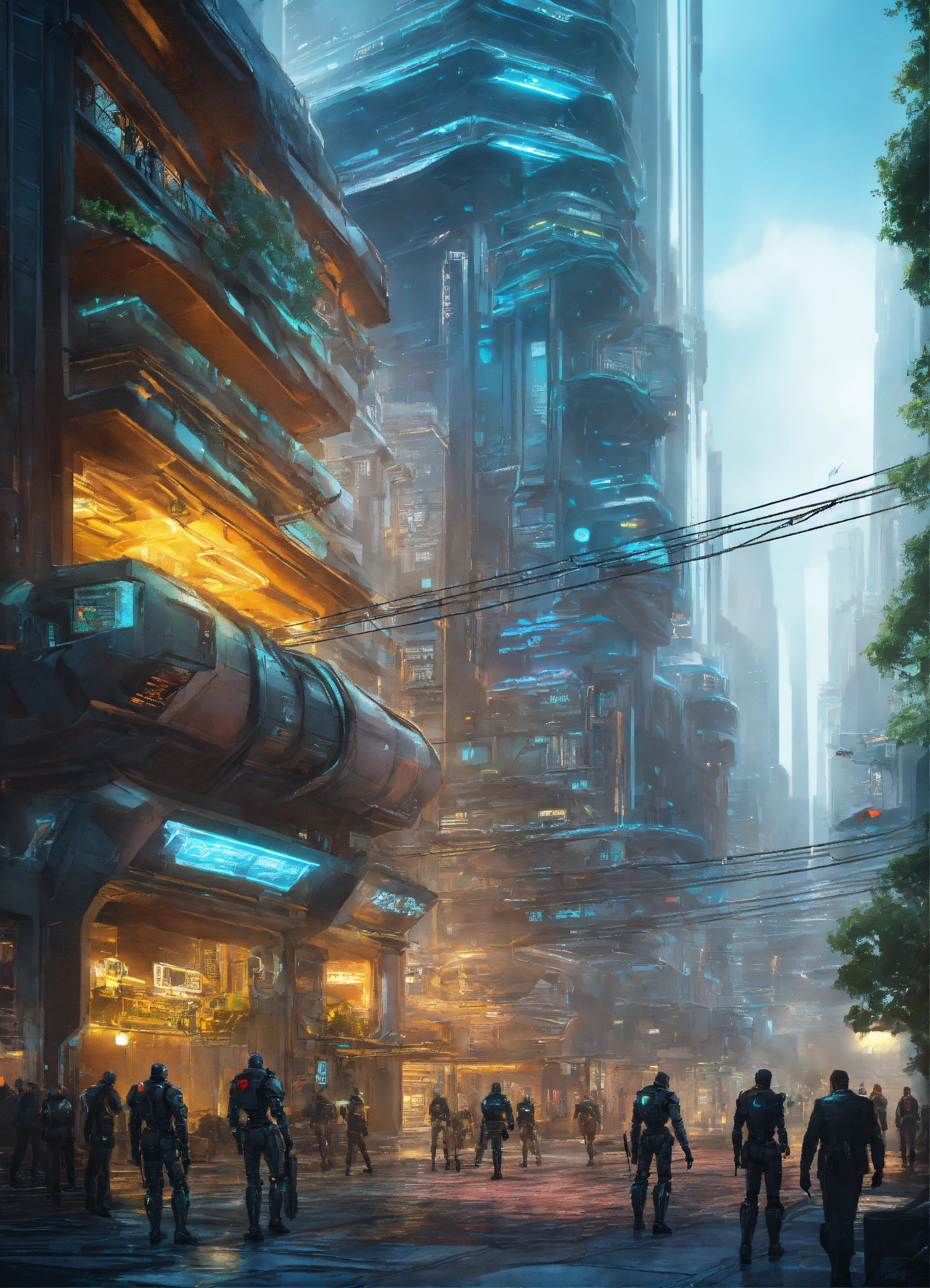 Sci-fi high-tech urban center with robot bodyguards