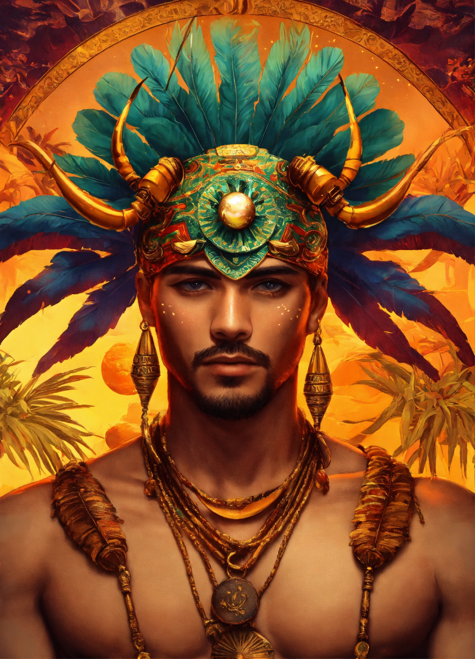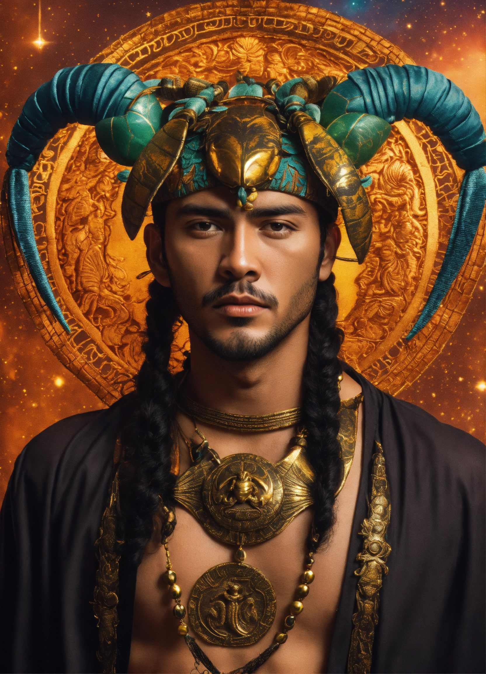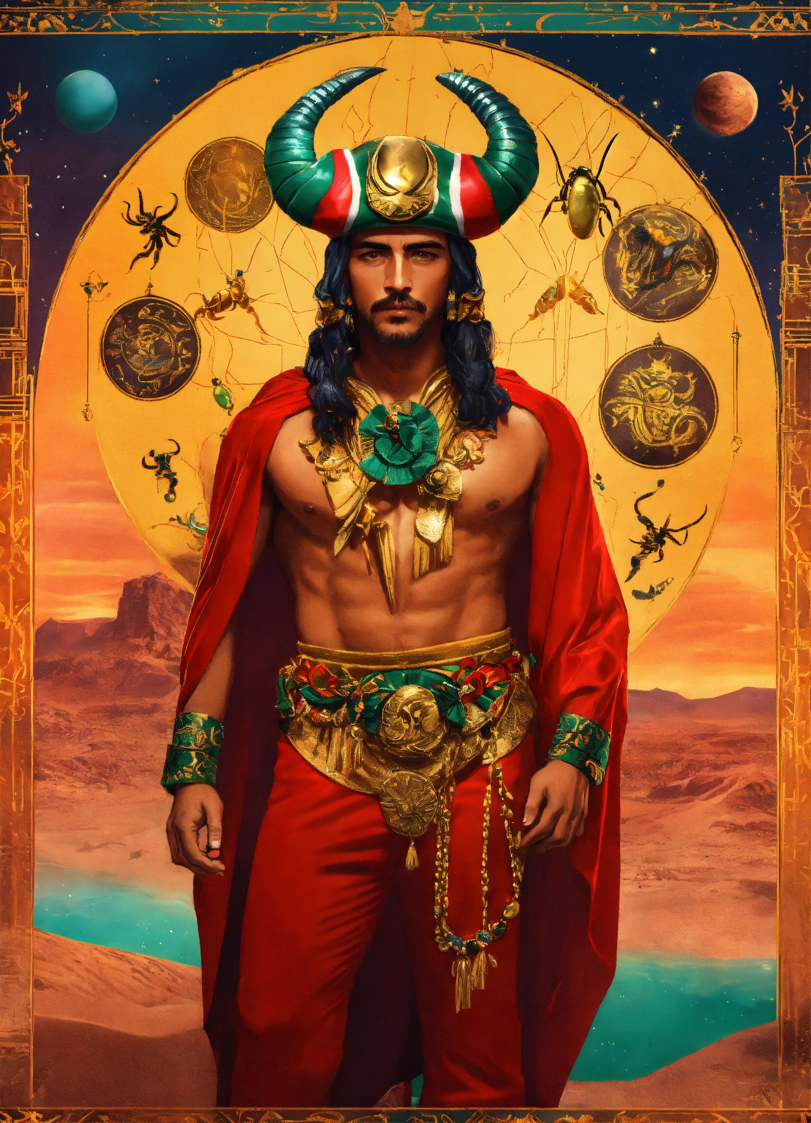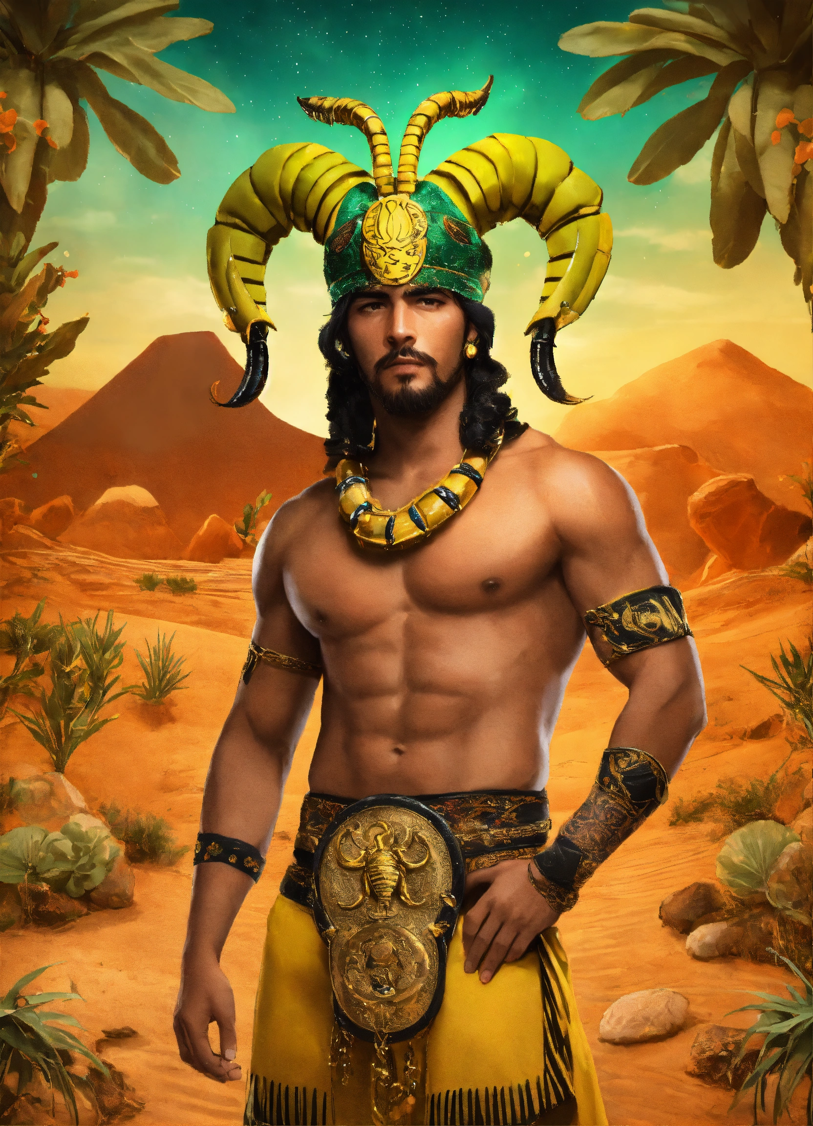 Scorpio zodiac pluto theme with mexican man wearing scorpion stingers headdress in oasis background