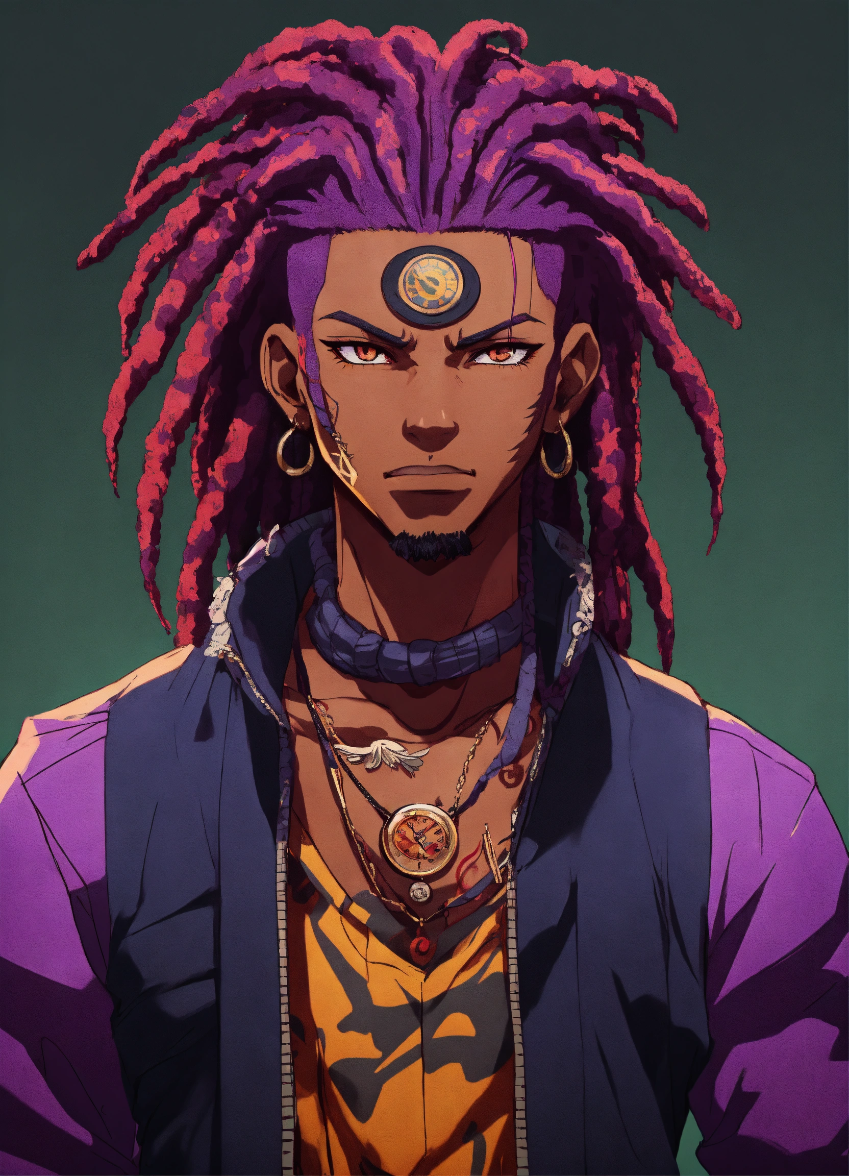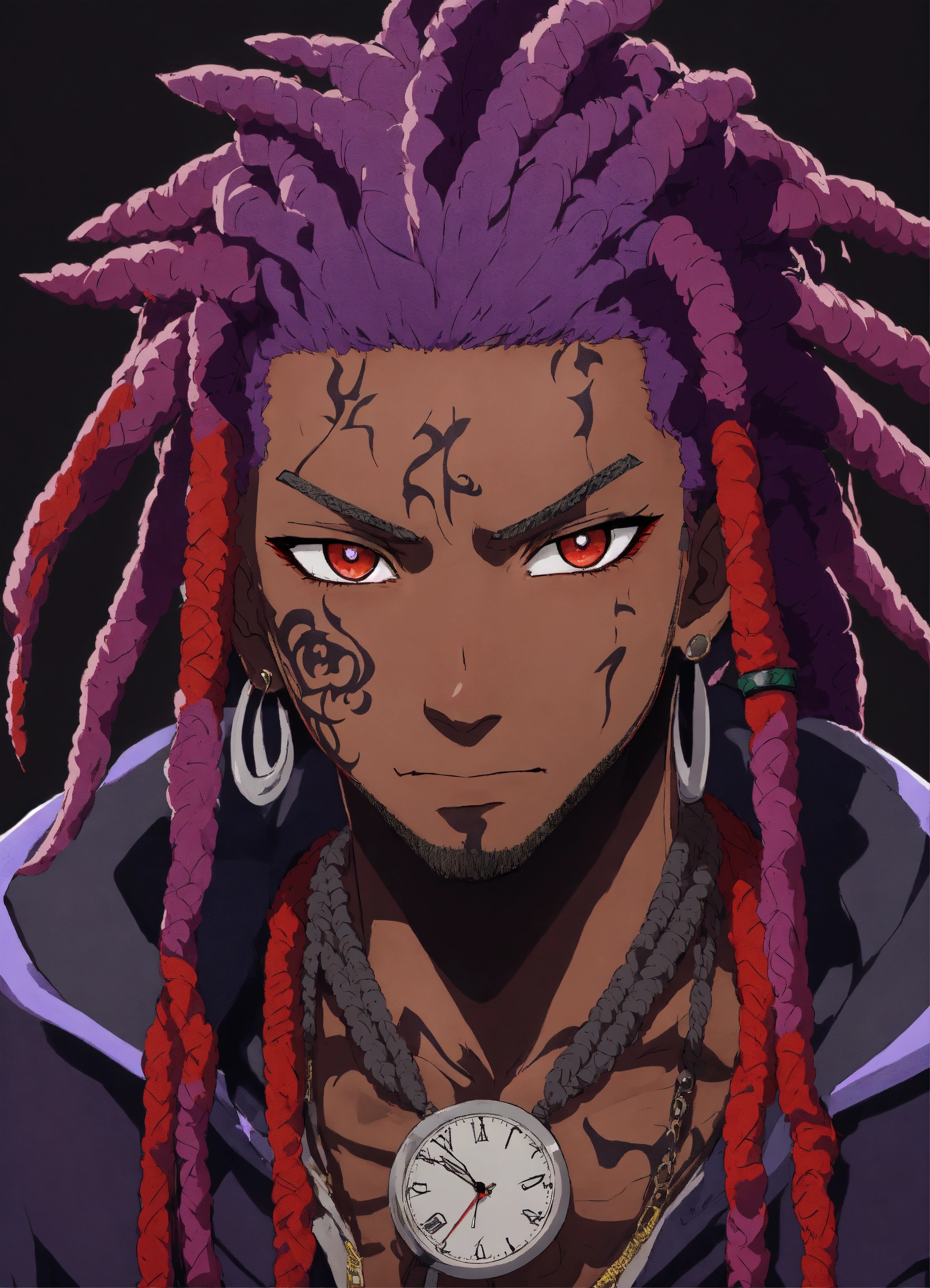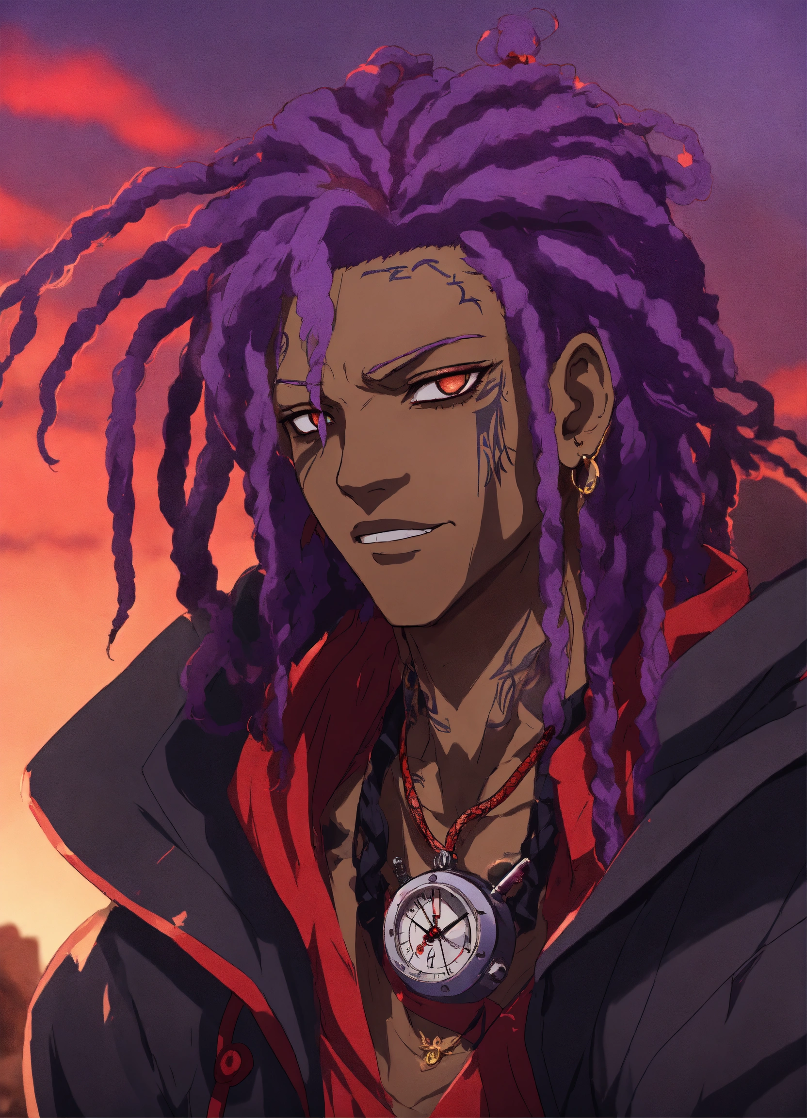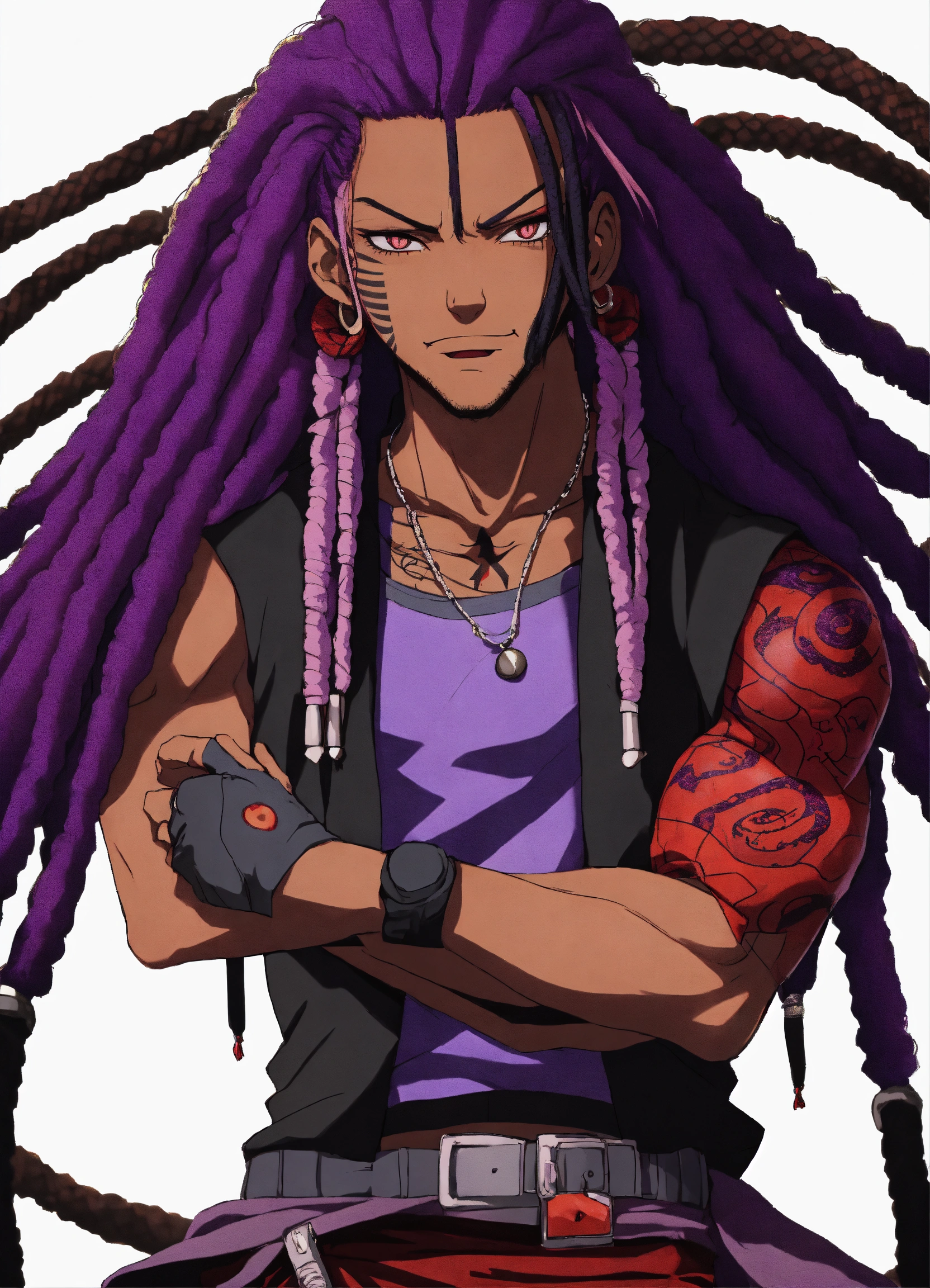 African naruto anime character, fit build, long purple hair, which is styled in a wild dreads and untamed manner, red snake pupils, he wears a black and purple clock, anime style, male, expresses a sly smirk, has tattoos