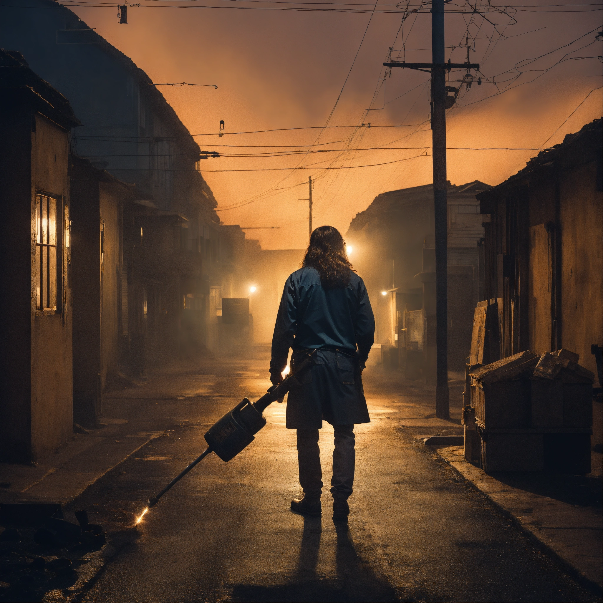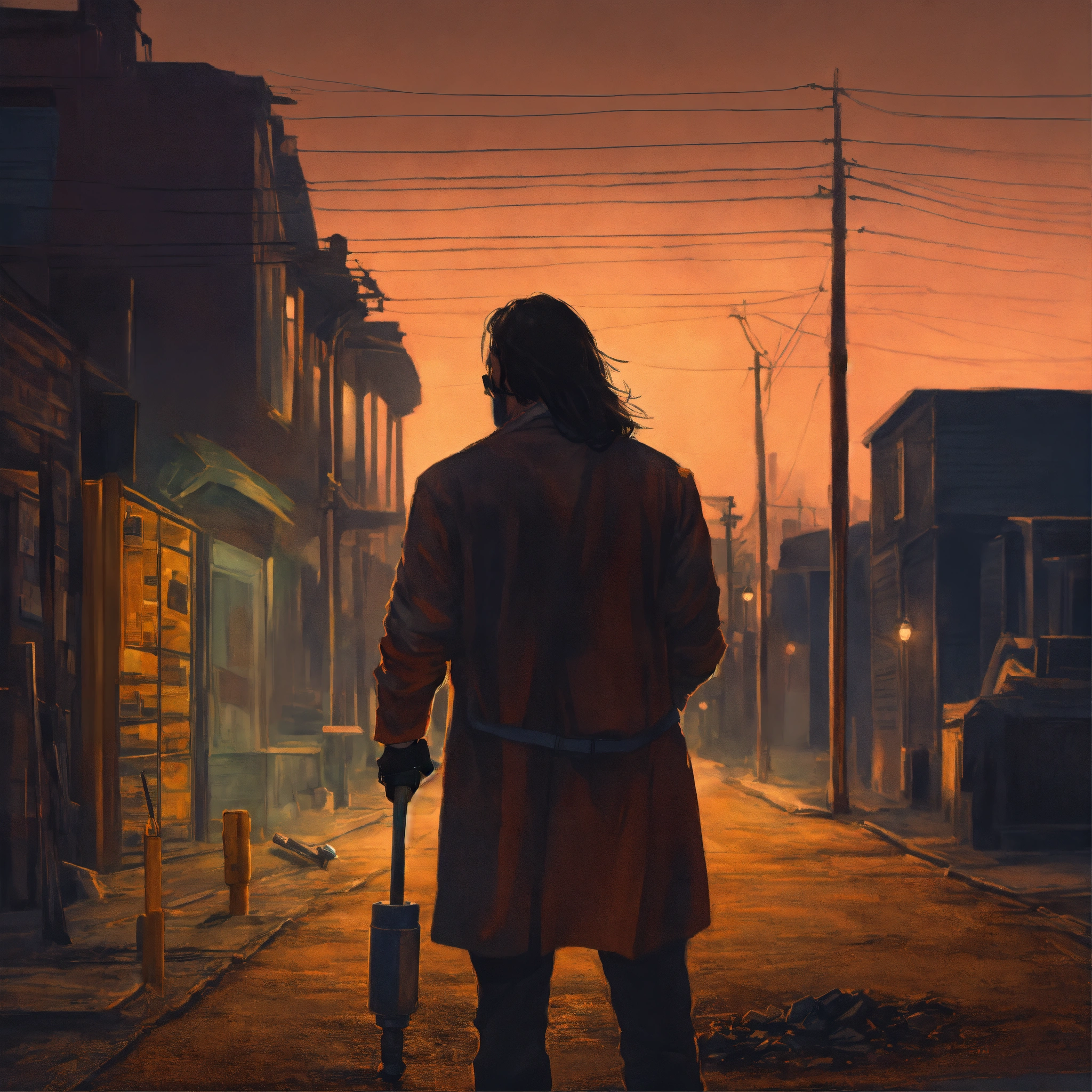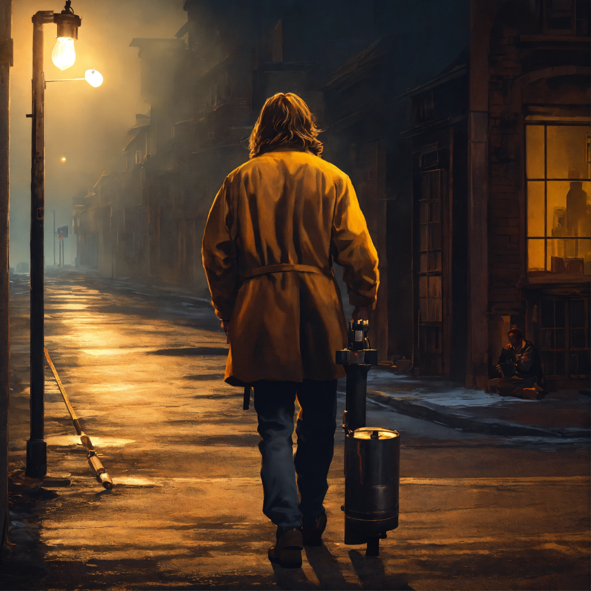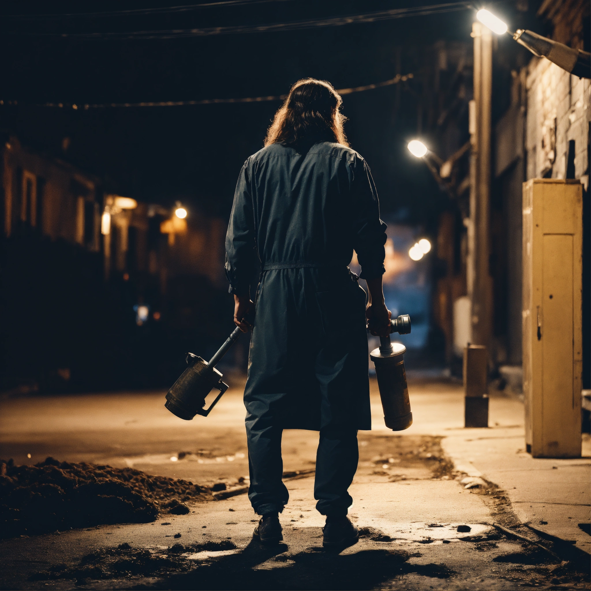 A man with long hair from behind with work clothes; he has a drill hammer in the hand; at a lonely street with a light in the background; in the style of dark hues