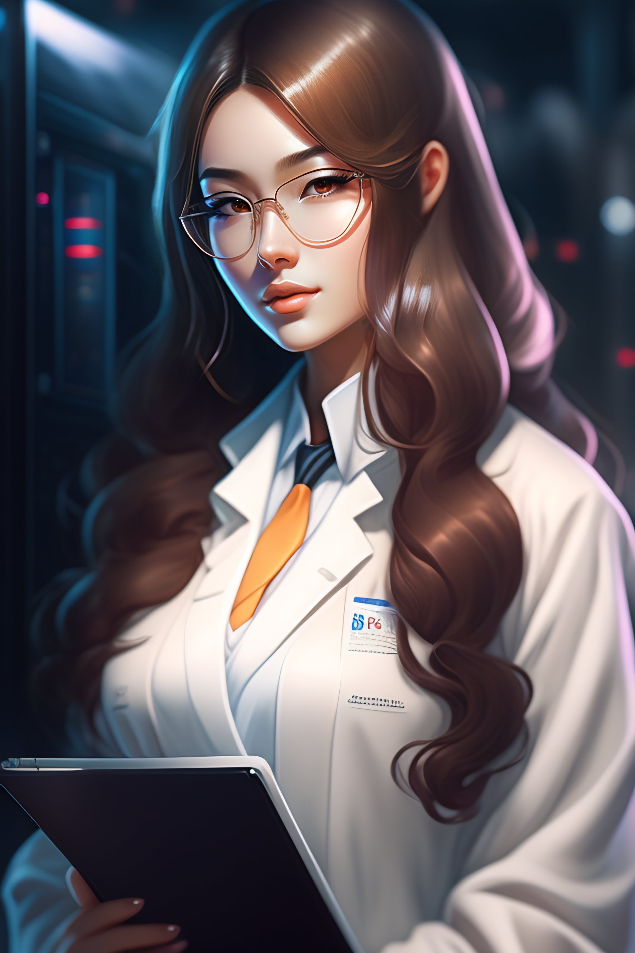 Beautiful anime girl with long hair, wearing lab coat and glasses, holding a clipboard, standing inside a research facility, character portrait, long hair, intricate, elegant, highly detailed, digital painting, artstation, concept art, smooth, sharp focus, illustration, art by wlop, charlie bowater and alexandra fomina